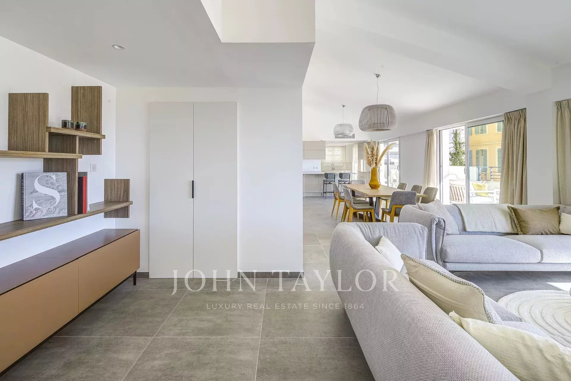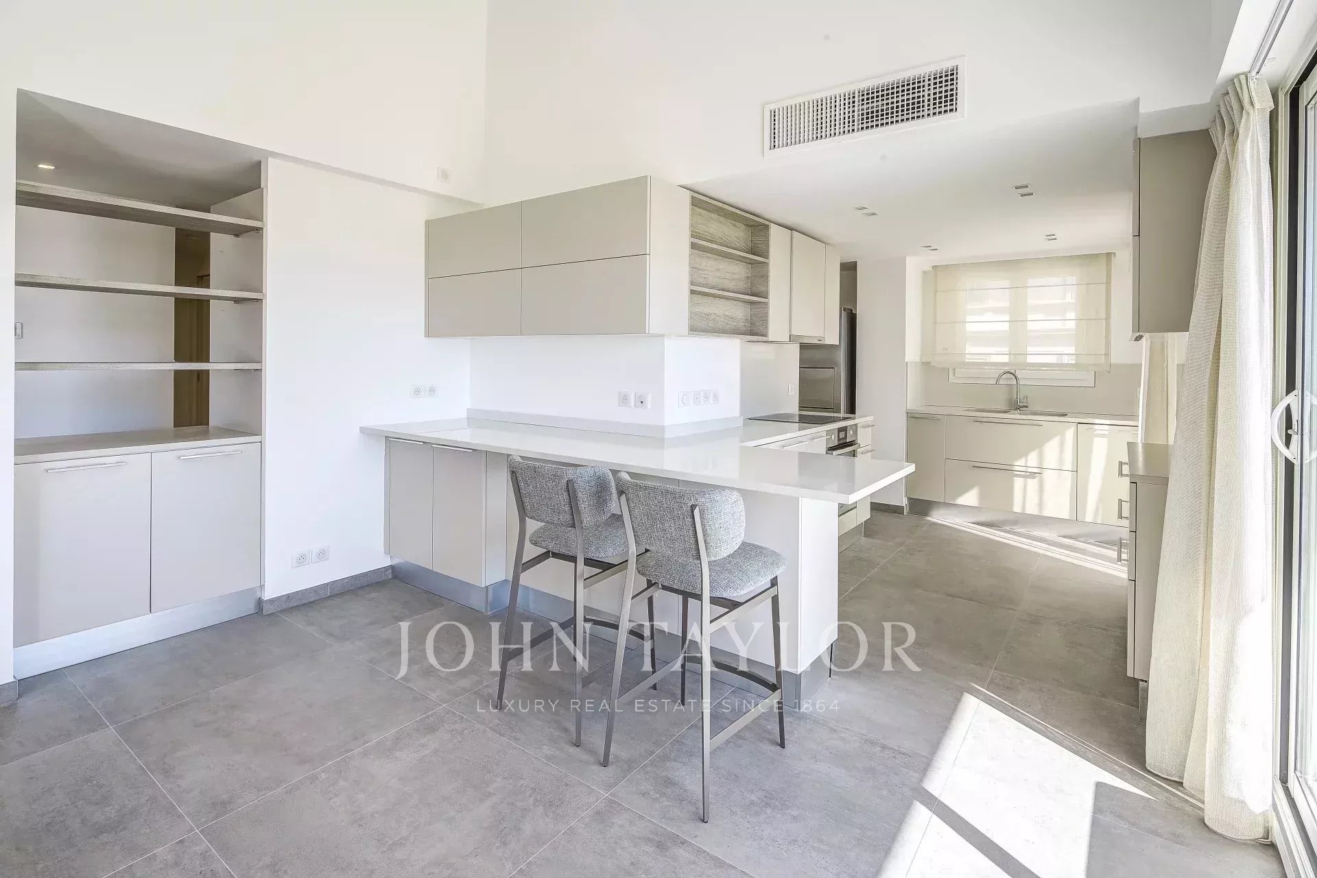 Entirely renovated with taste, the apartment boasts generous volumes and high ceilings. It comprises a vast, light-filled living/dining room, extended by a large, fully-equipped open kitchen, with a utility room.