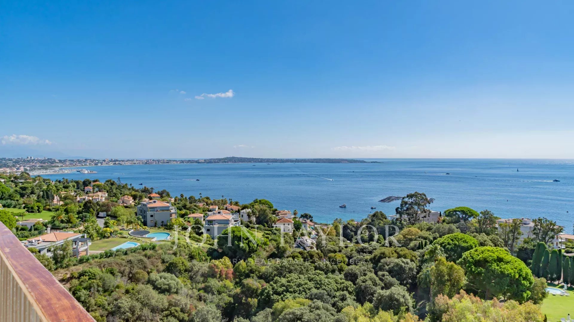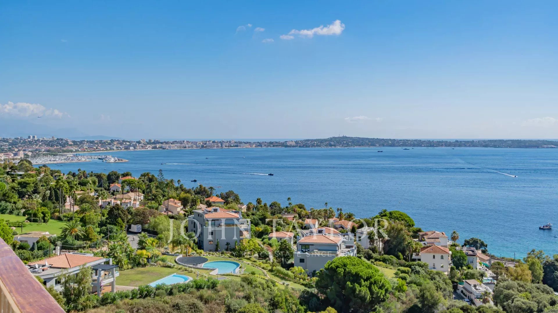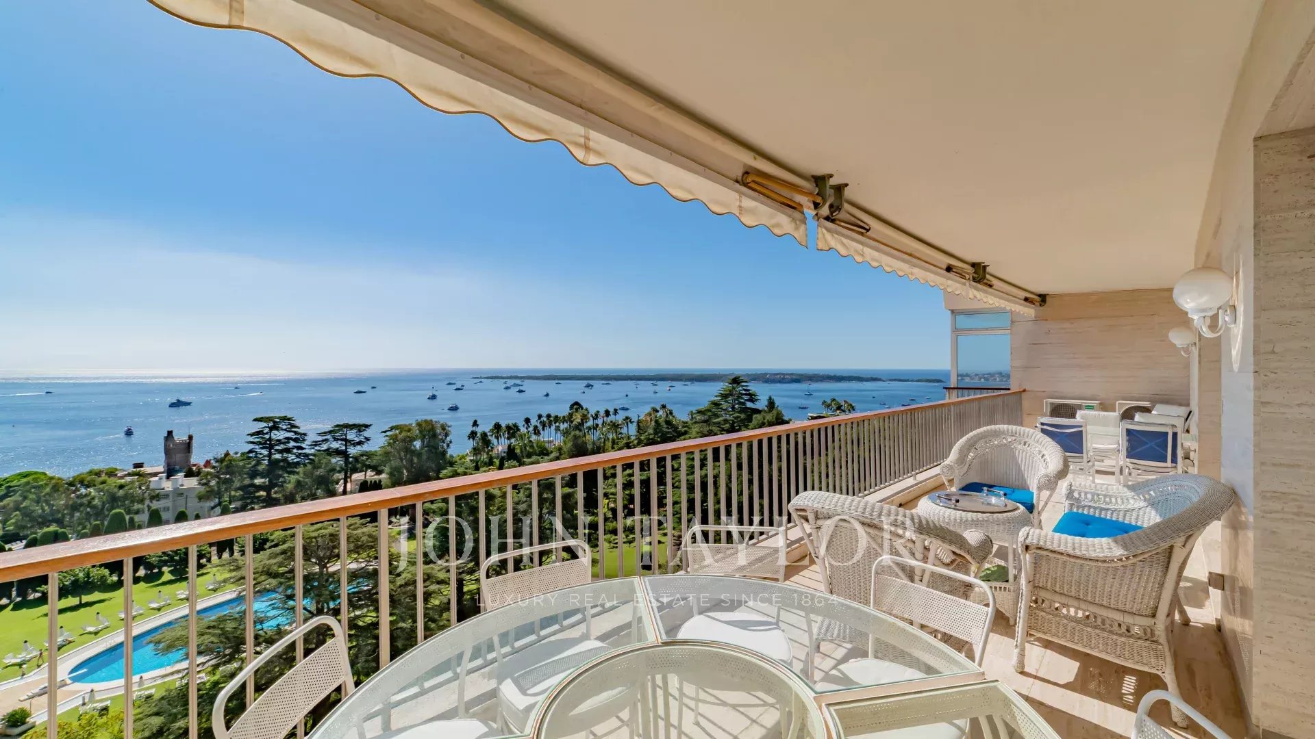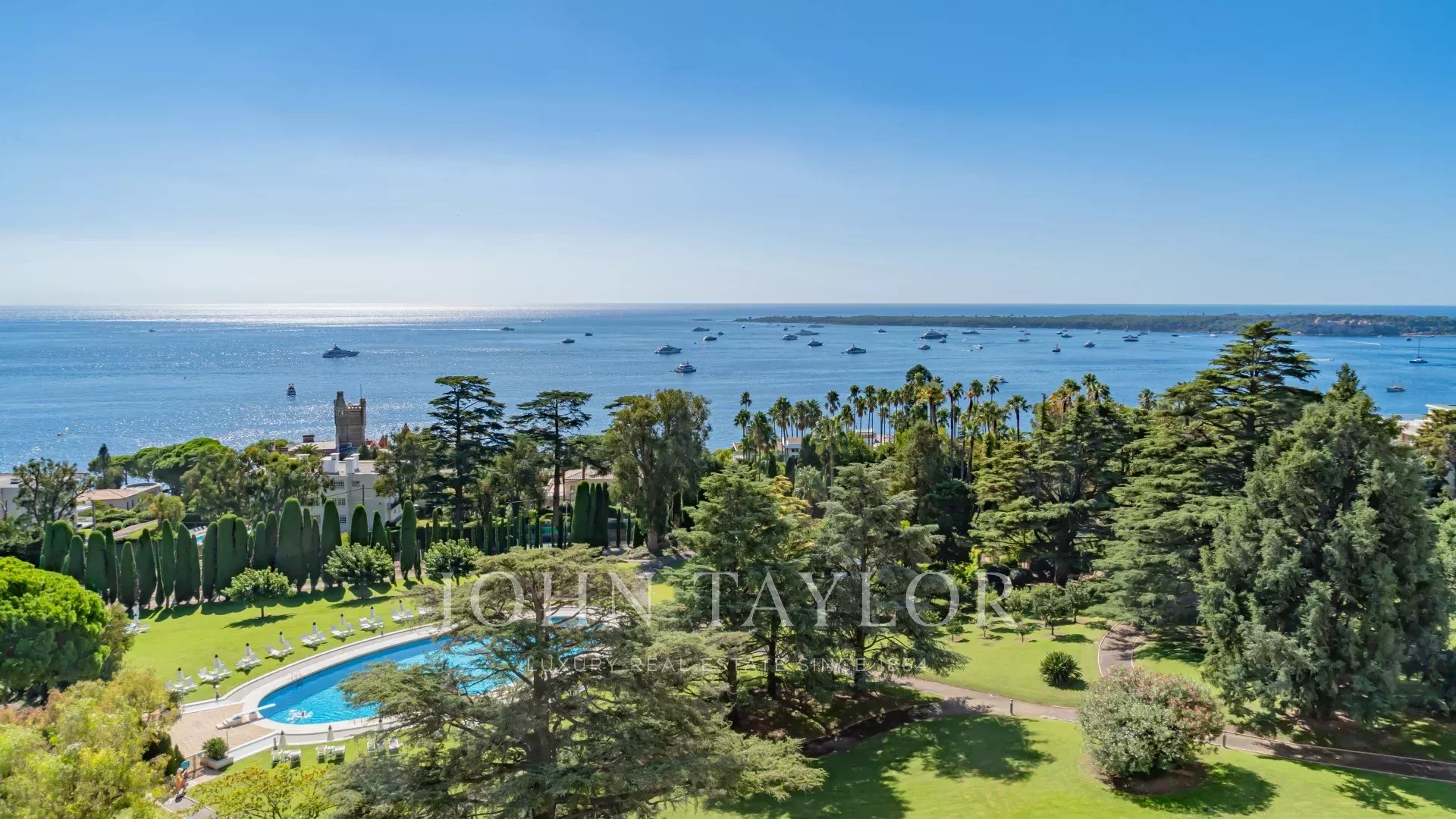 In a luxury residence with 24/7 security, set in a 12-hectare park with swimming pool, tennis court, fitness, golf practice range and shuttle service, this beautiful apartment on a high floor offers exceptional panoramic views of Cap d'Antibes, the Lérins islands and the sea.