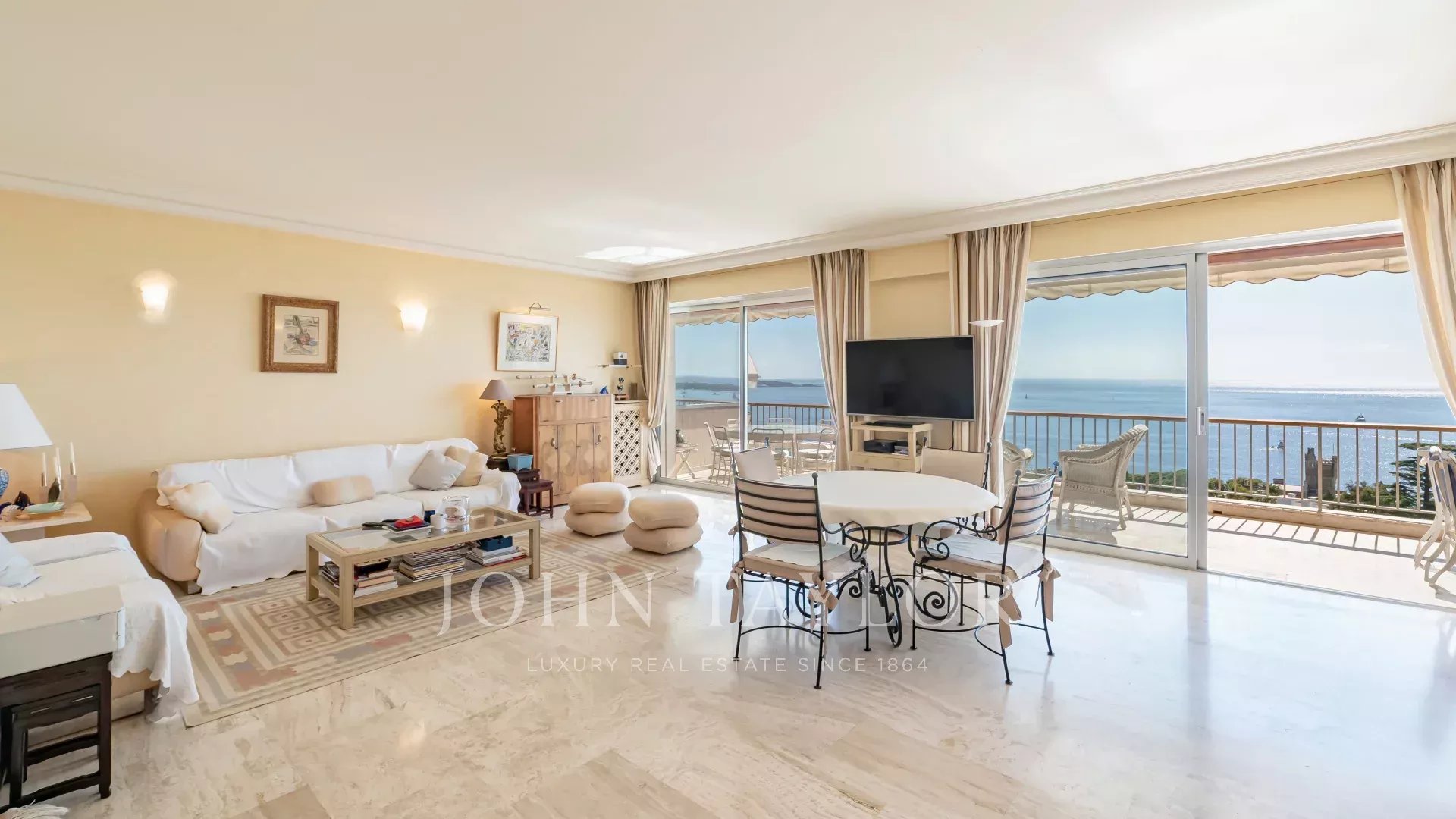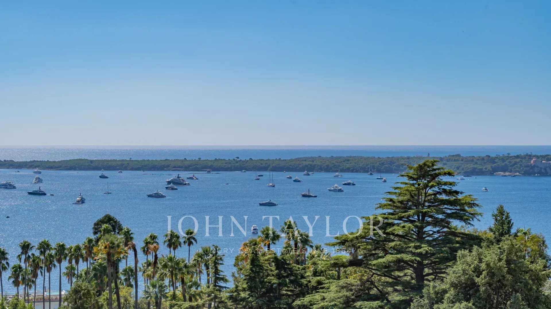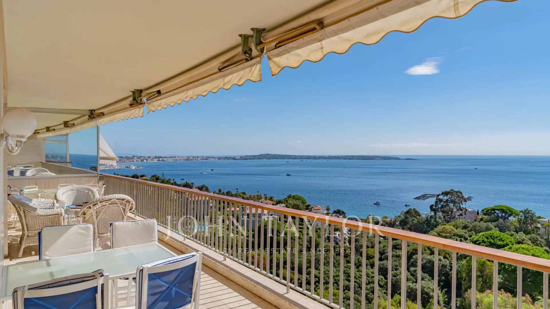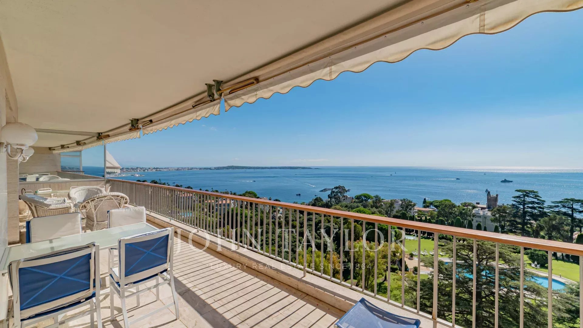 In a luxury residence with 24/7 security, set in a 12-hectare park with swimming pool, tennis court, fitness, golf practice range and shuttle service, this beautiful apartment on a high floor offers exceptional panoramic views of Cap d'Antibes, the Lérins islands and the sea.