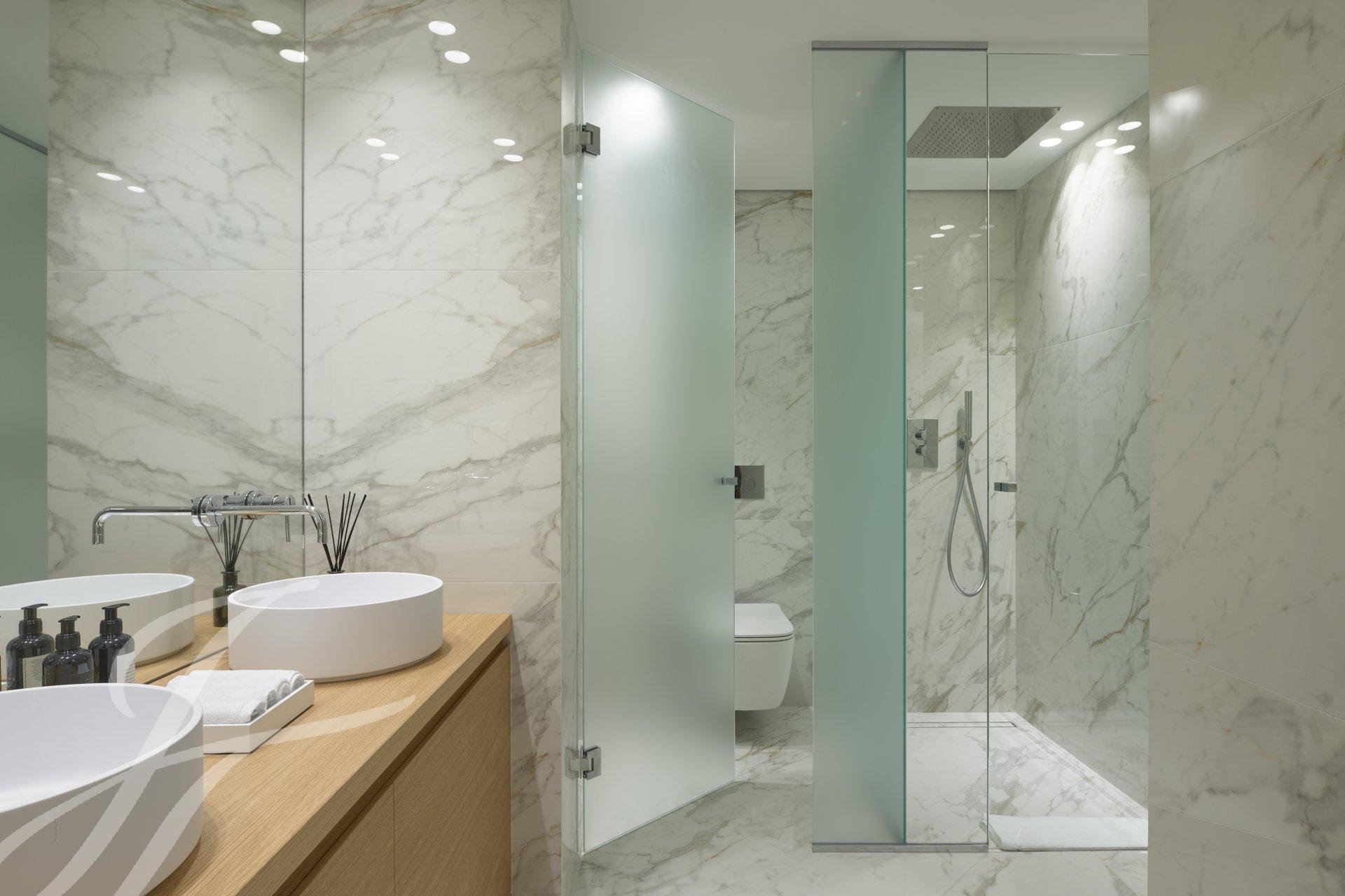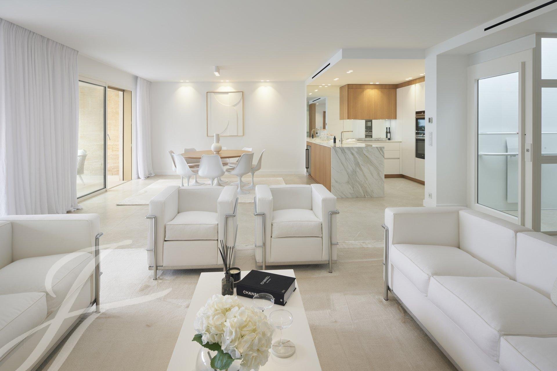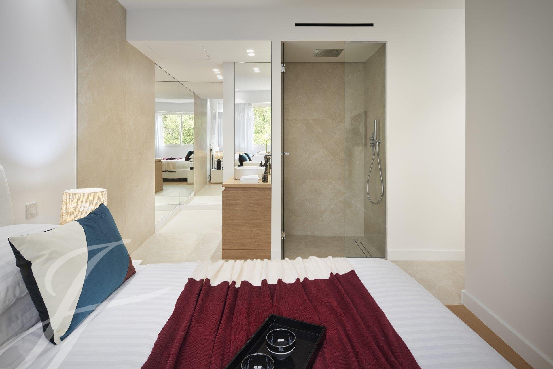 It consists of a large living room with kitchen all opening onto a terrace of approximately 23 sq.m , master bedroom with dressing room and bathroom en suite , two other bedroom with shower room ensuite.
