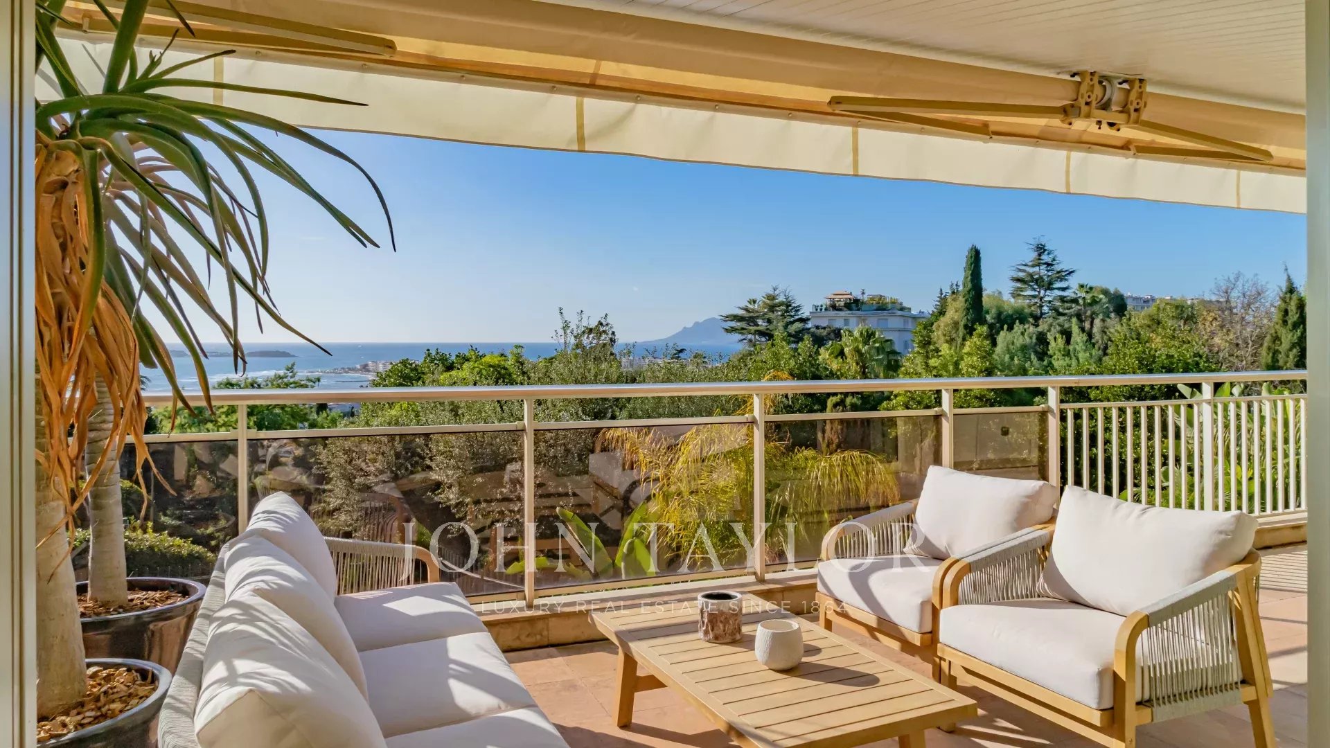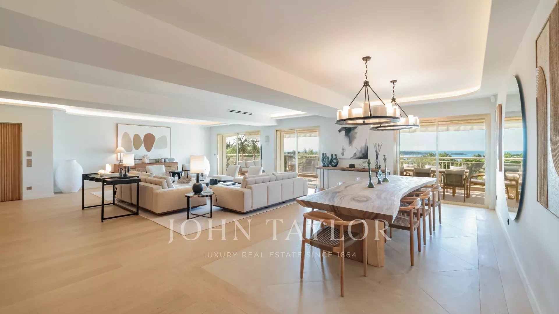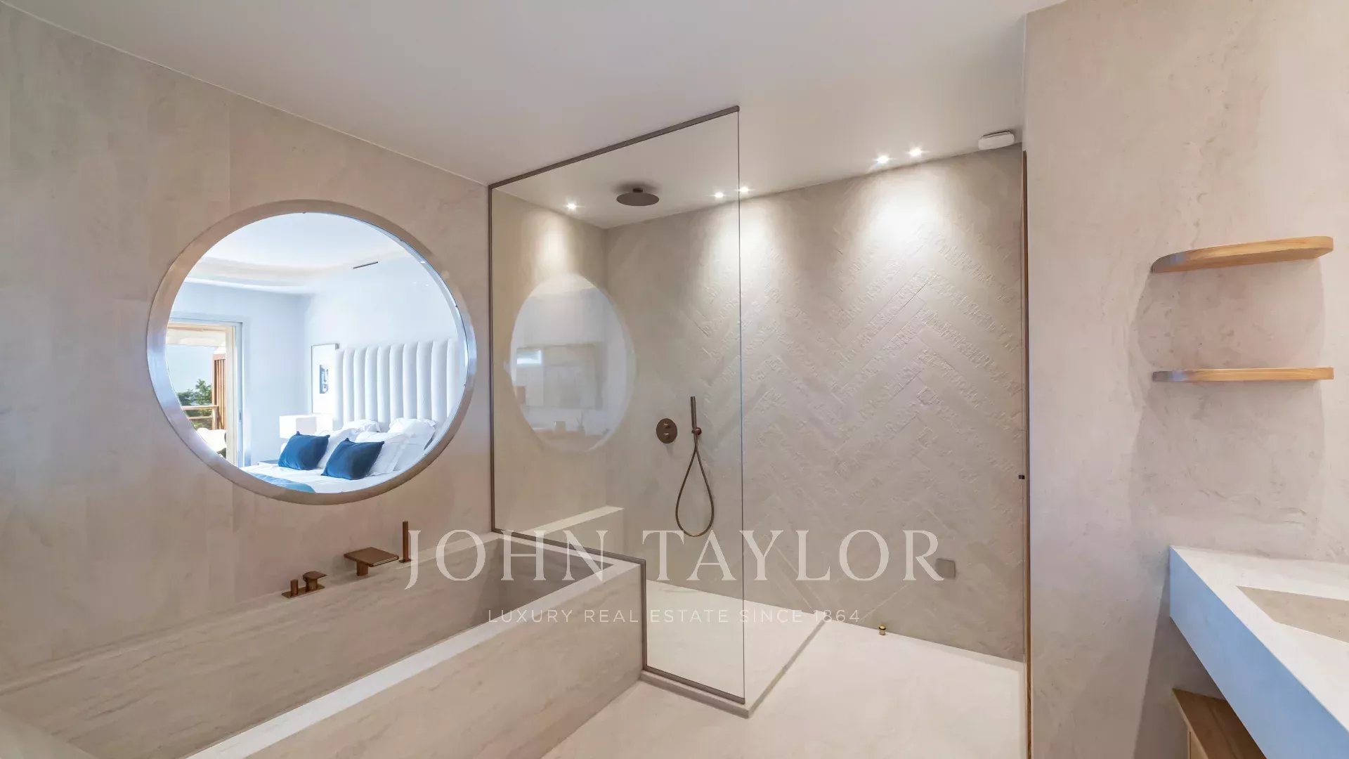 It boasts generous interiors that open out onto large terraces on each level, 4 en suite bedrooms and a private garden overlooking the sea, the Lérins islands and Palm Beach.