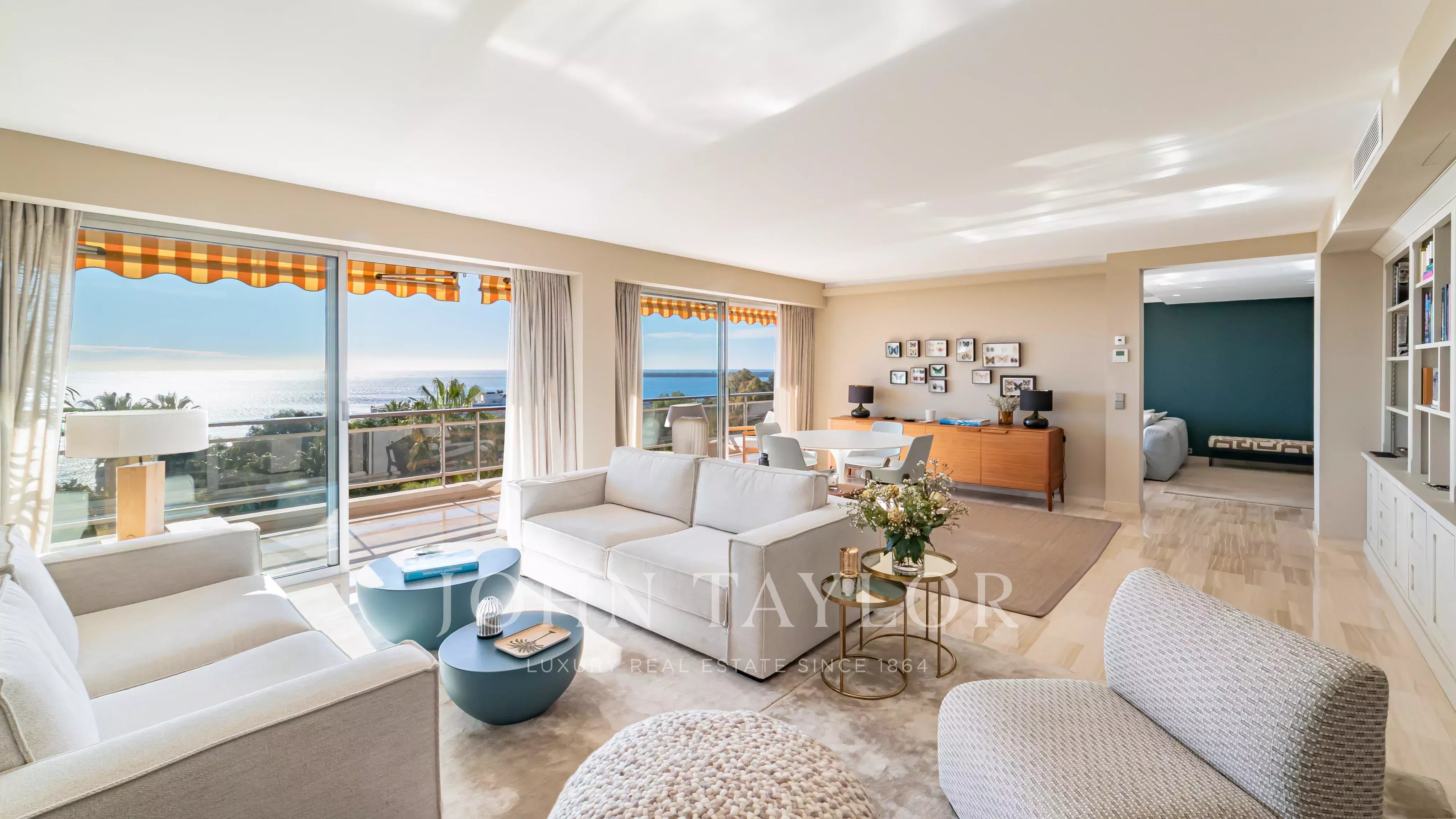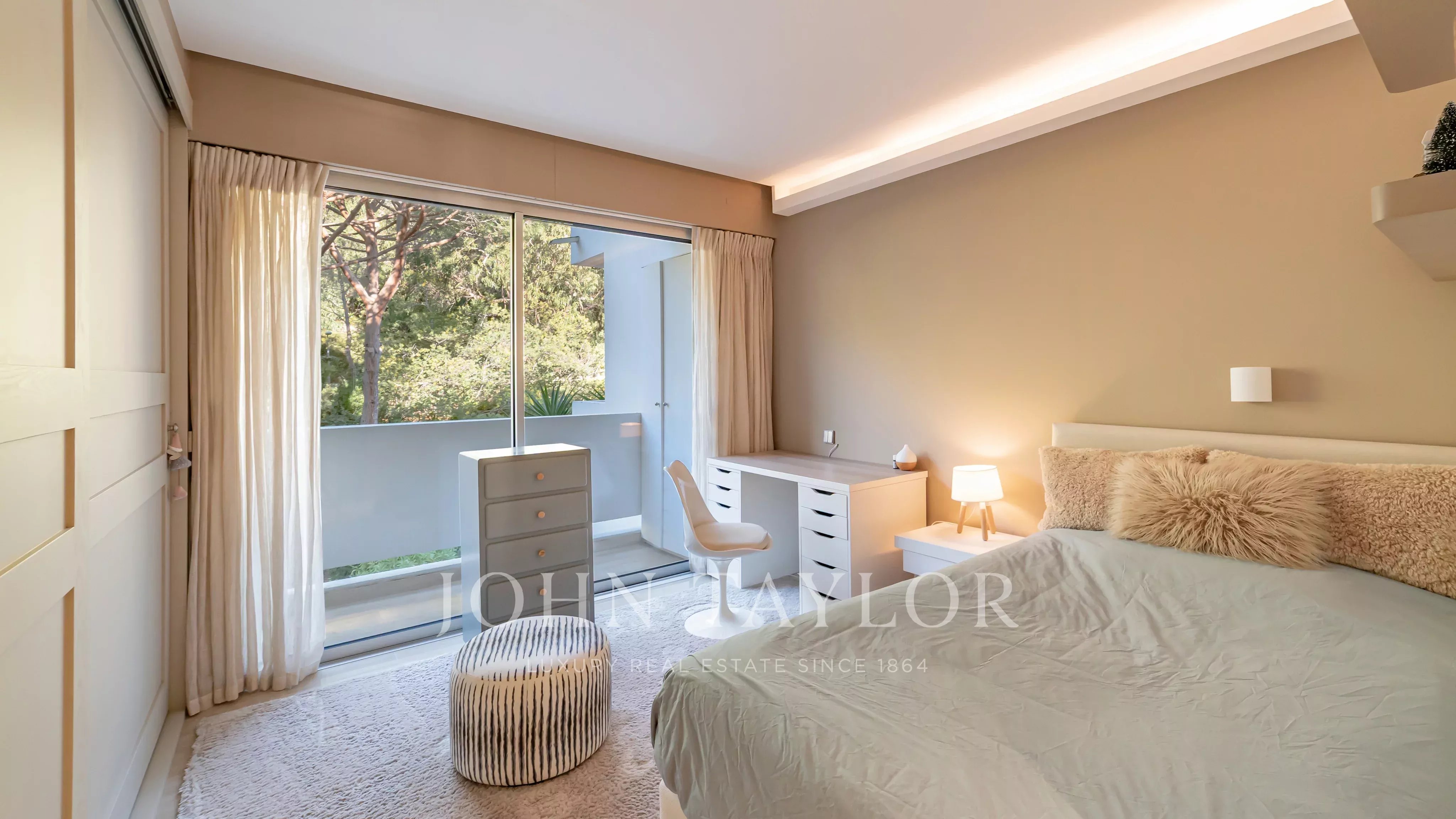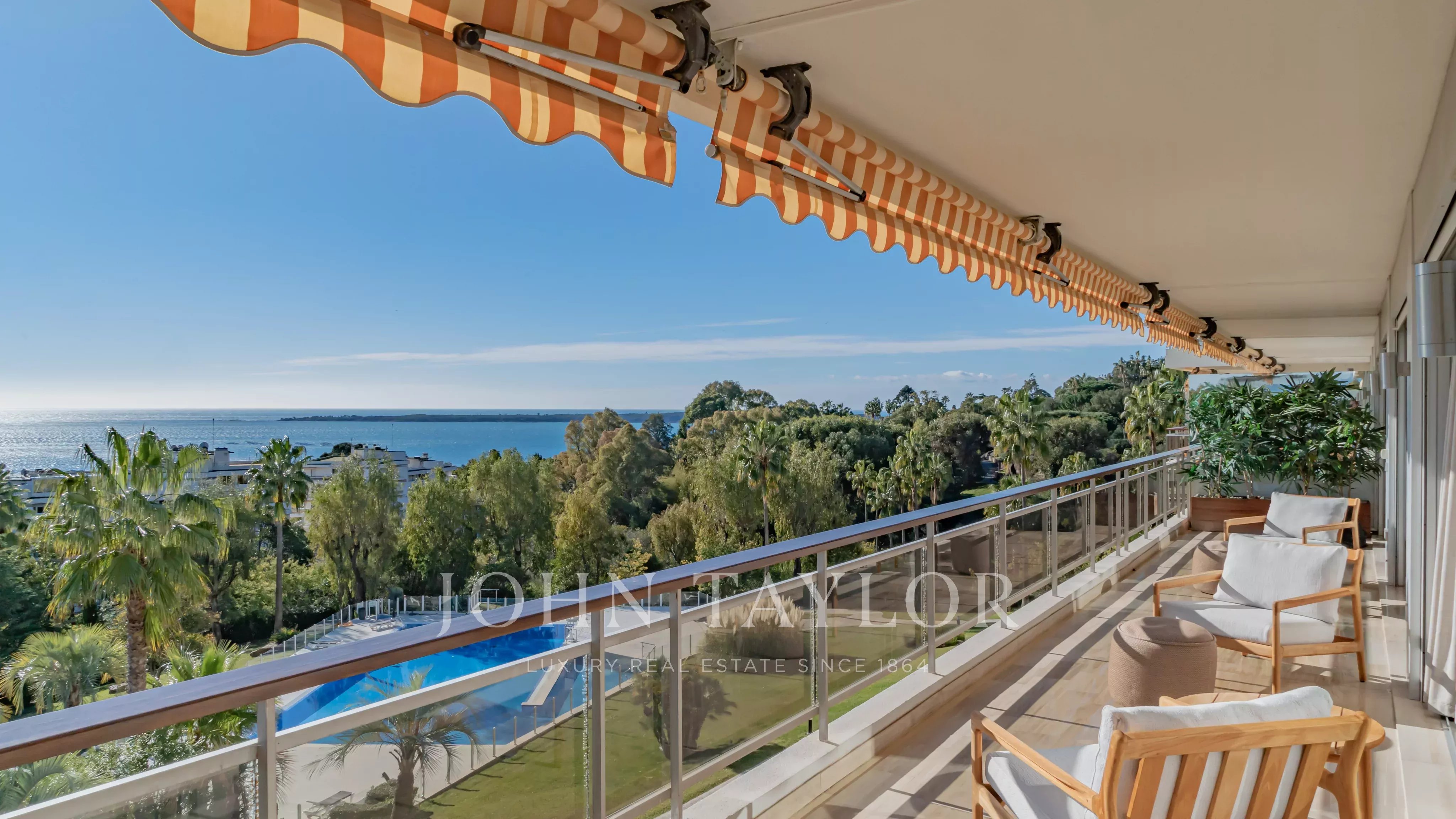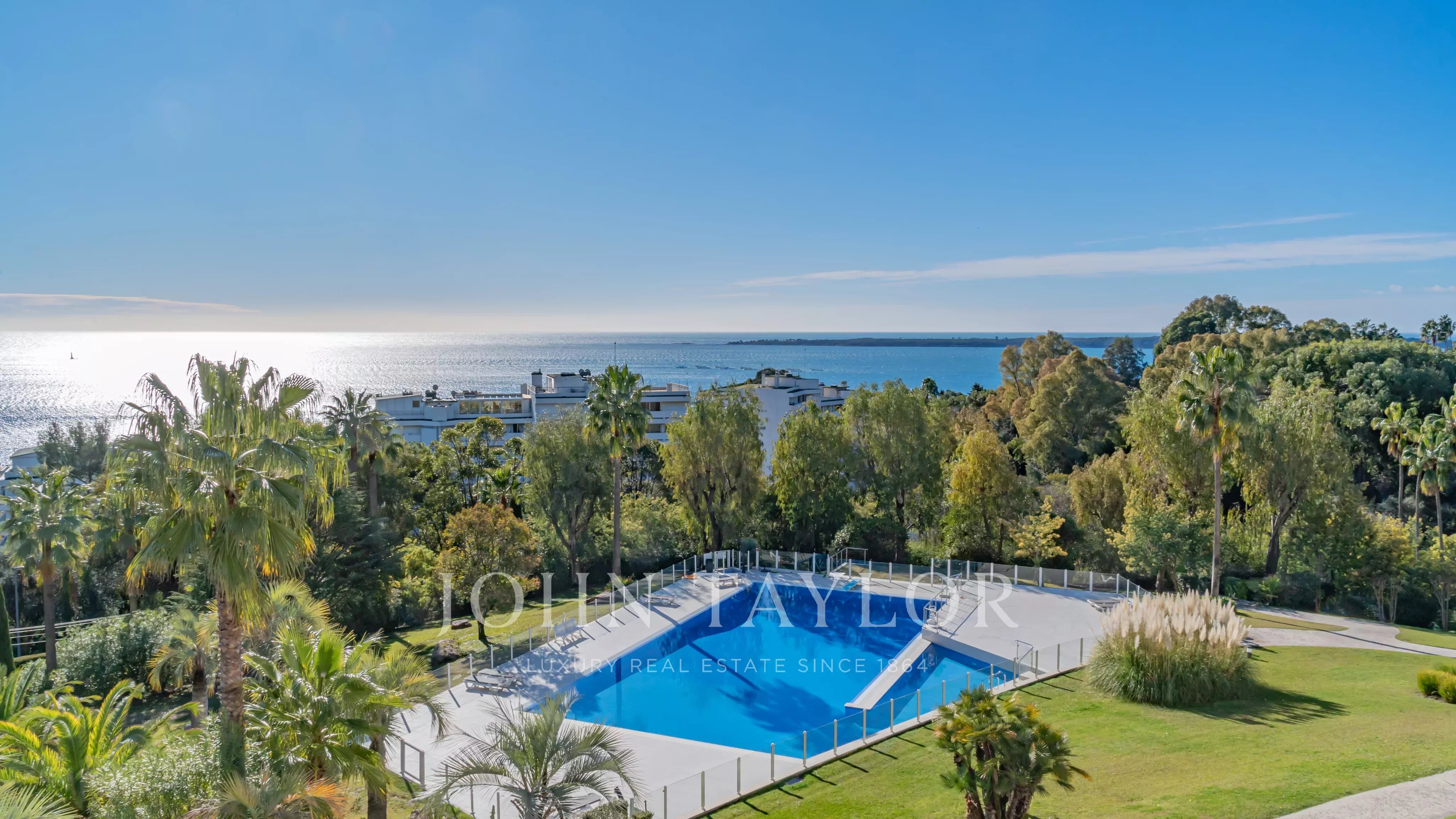 The apartment comprises a living room, a master bedroom with en suite shower room and dressing room, all opening onto a 32 m2 terrace with panoramic views of the sea and the Lérins islands, a fully equipped kitchen, two further bedrooms, each with its own shower room, and a laundry room.
