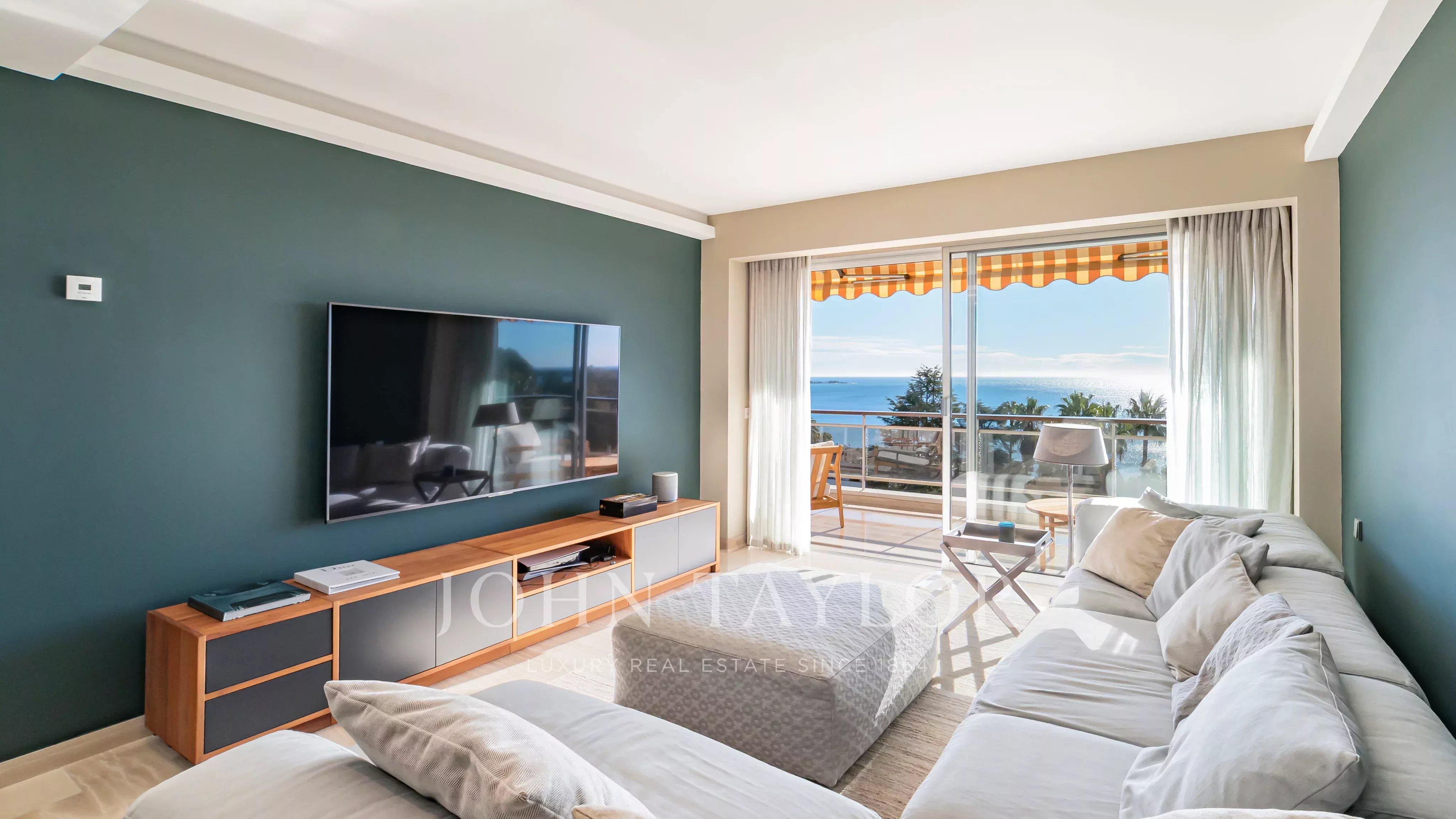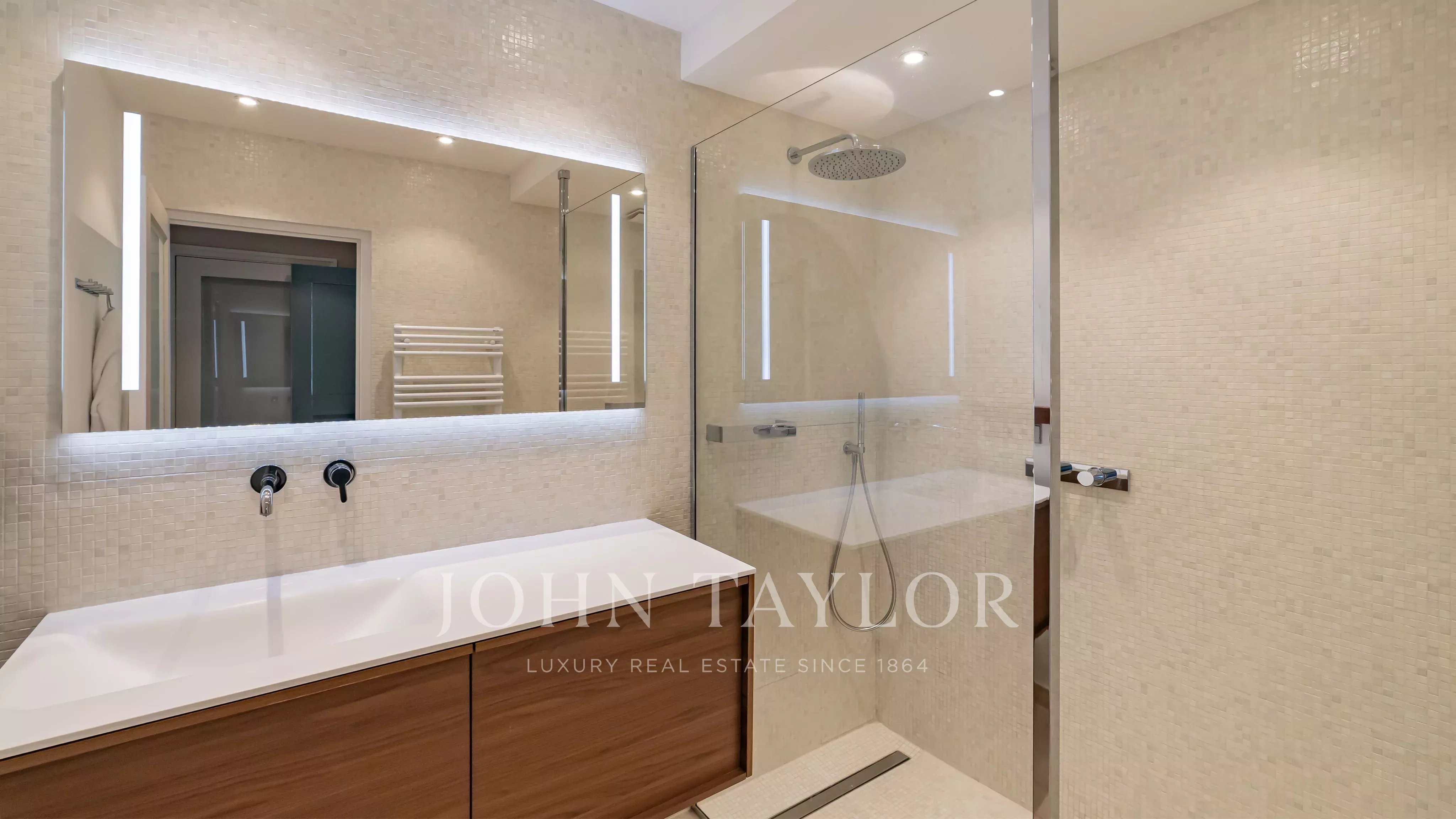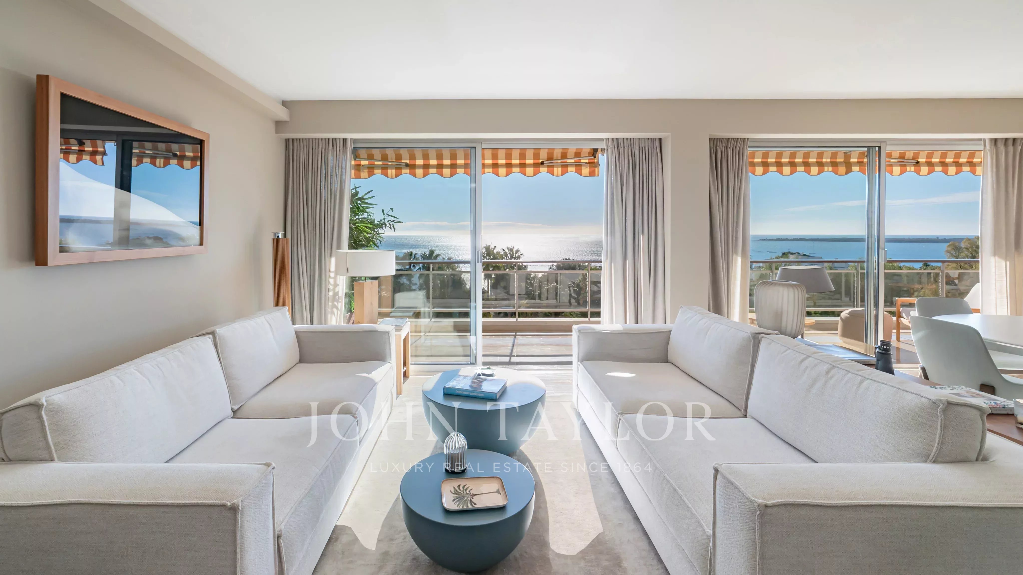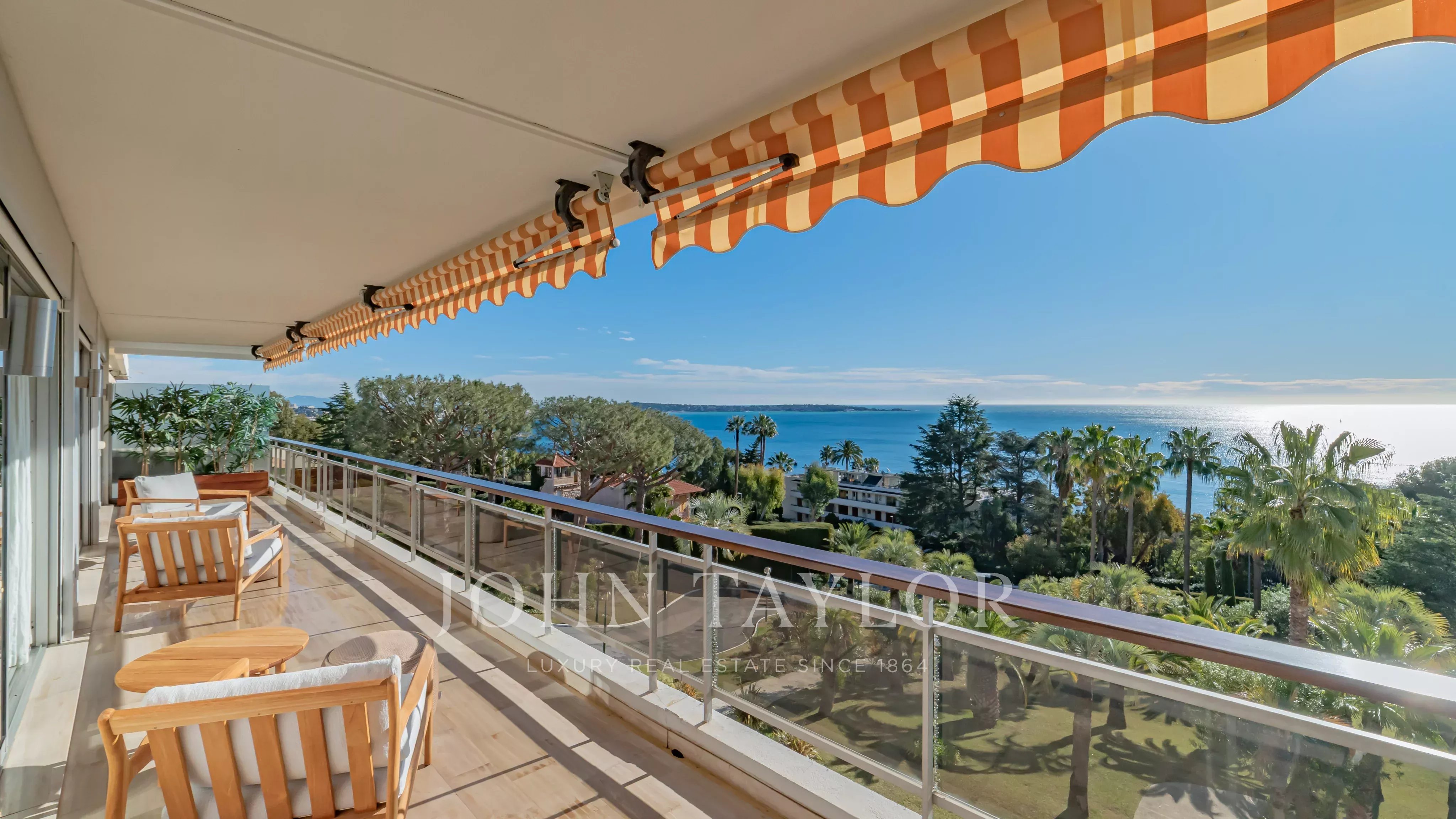 The apartment comprises a living room, a master bedroom with en suite shower room and dressing room, all opening onto a 32 m2 terrace with panoramic views of the sea and the Lérins islands, a fully equipped kitchen, two further bedrooms, each with its own shower room, and a laundry room.