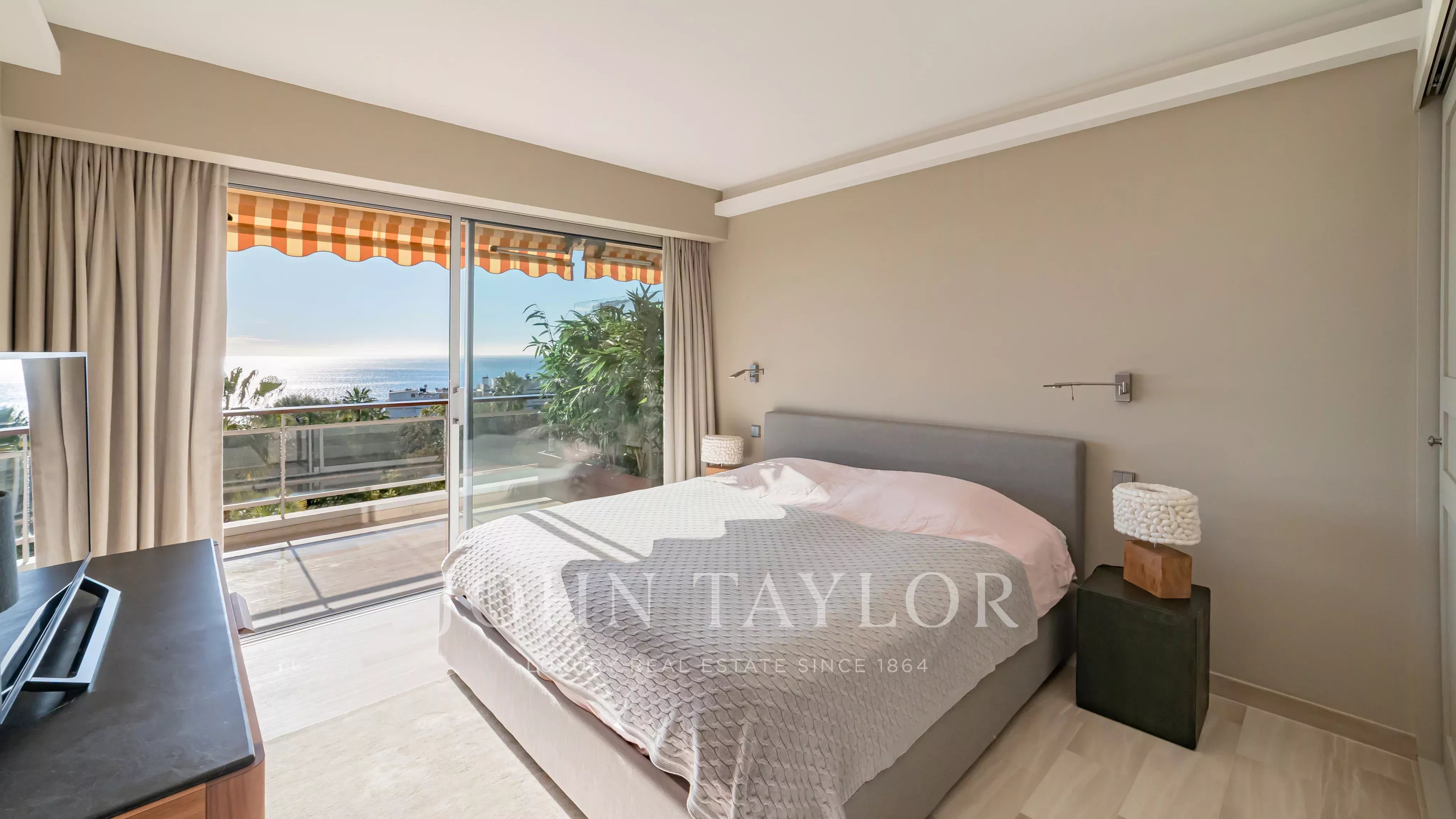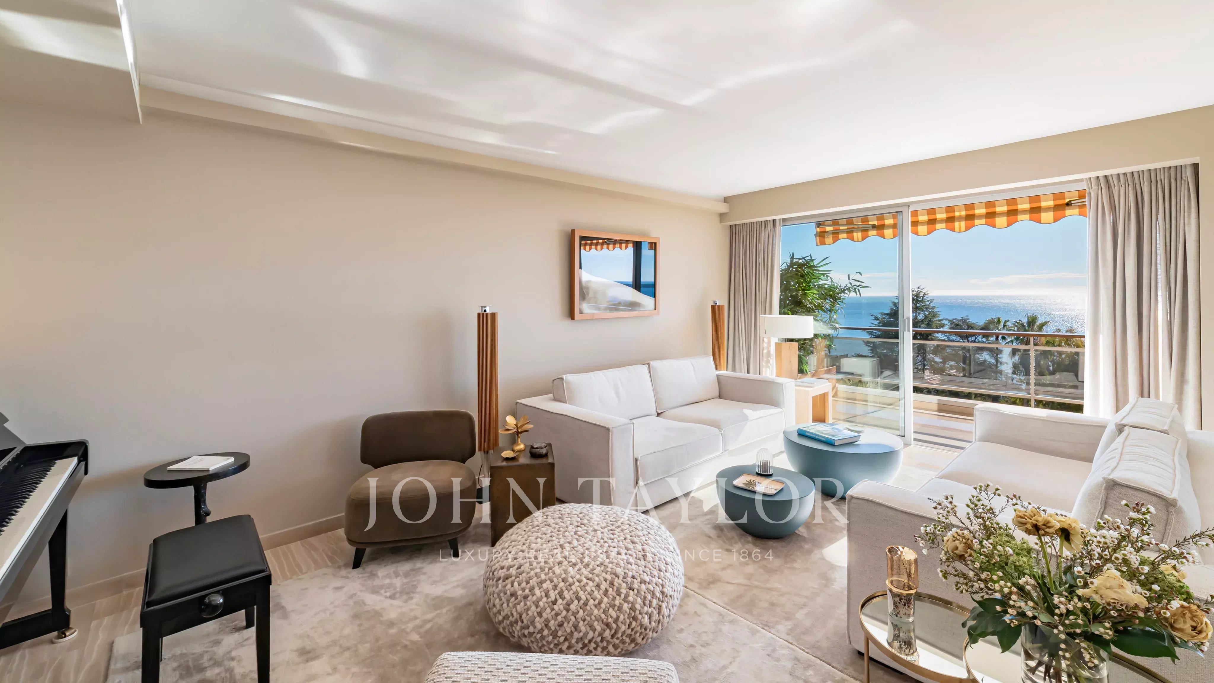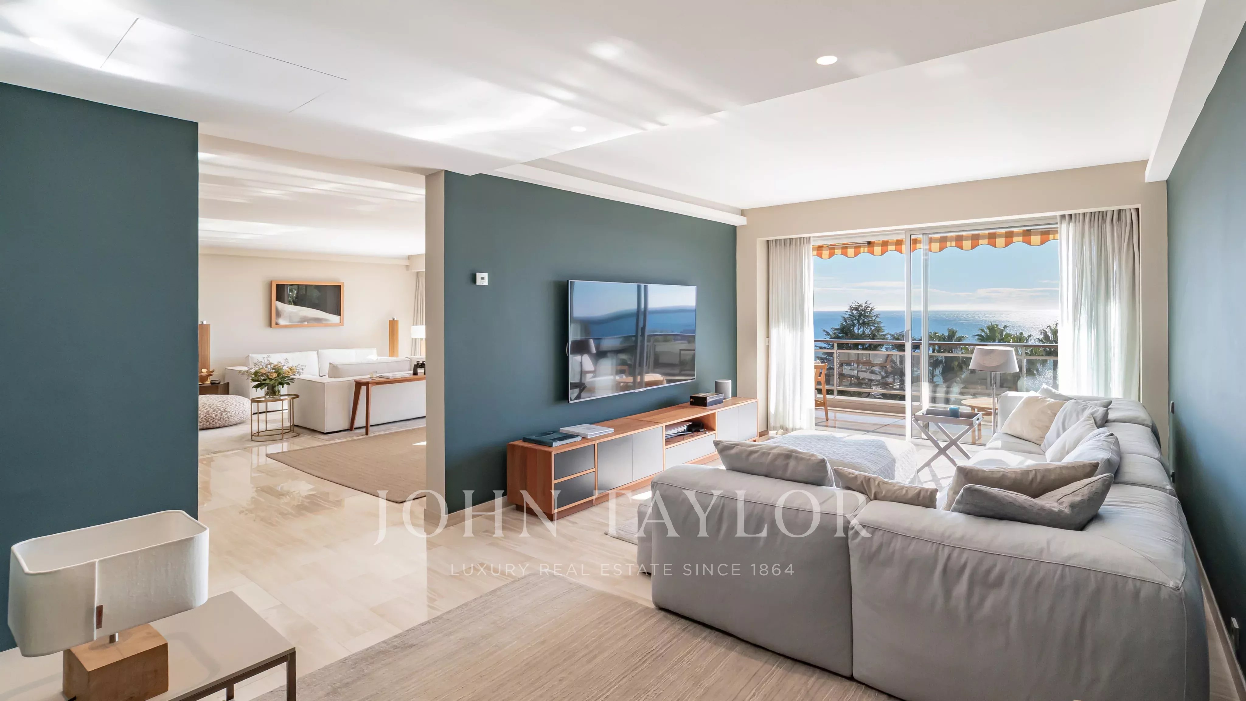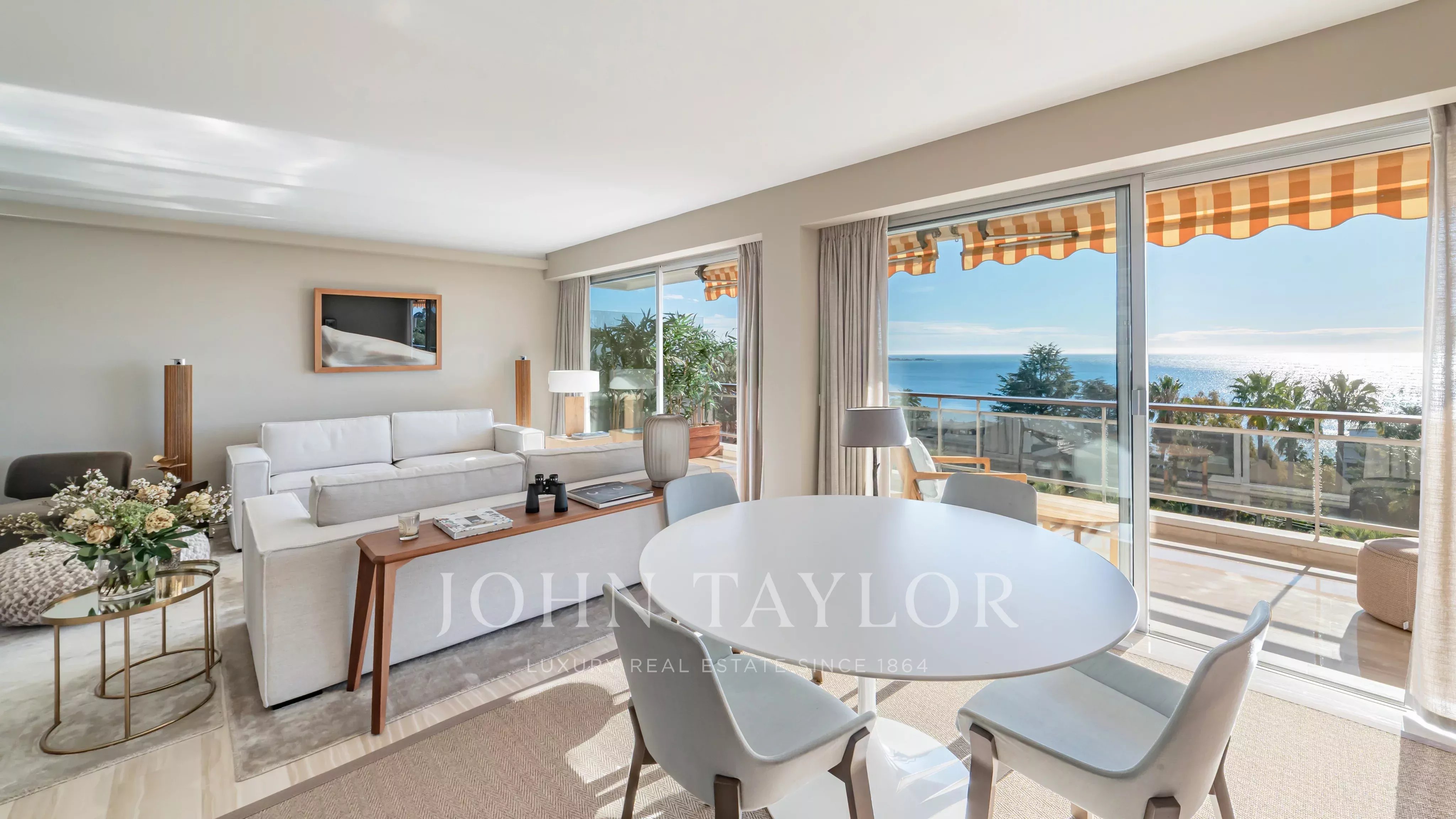 The apartment comprises a living room, a master bedroom with en suite shower room and dressing room, all opening onto a 32 m2 terrace with panoramic views of the sea and the Lérins islands, a fully equipped kitchen, two further bedrooms, each with its own shower room, and a laundry room.