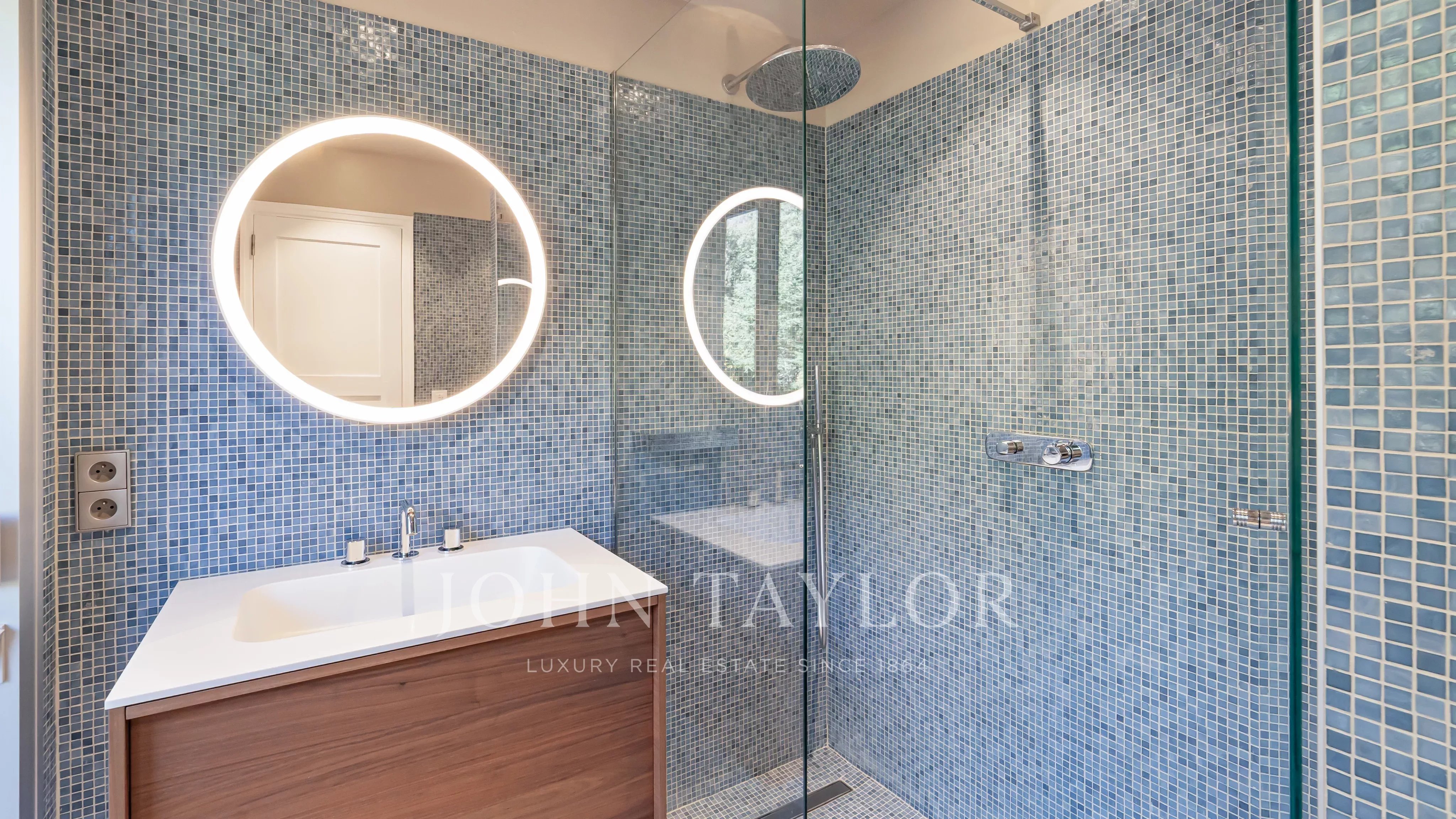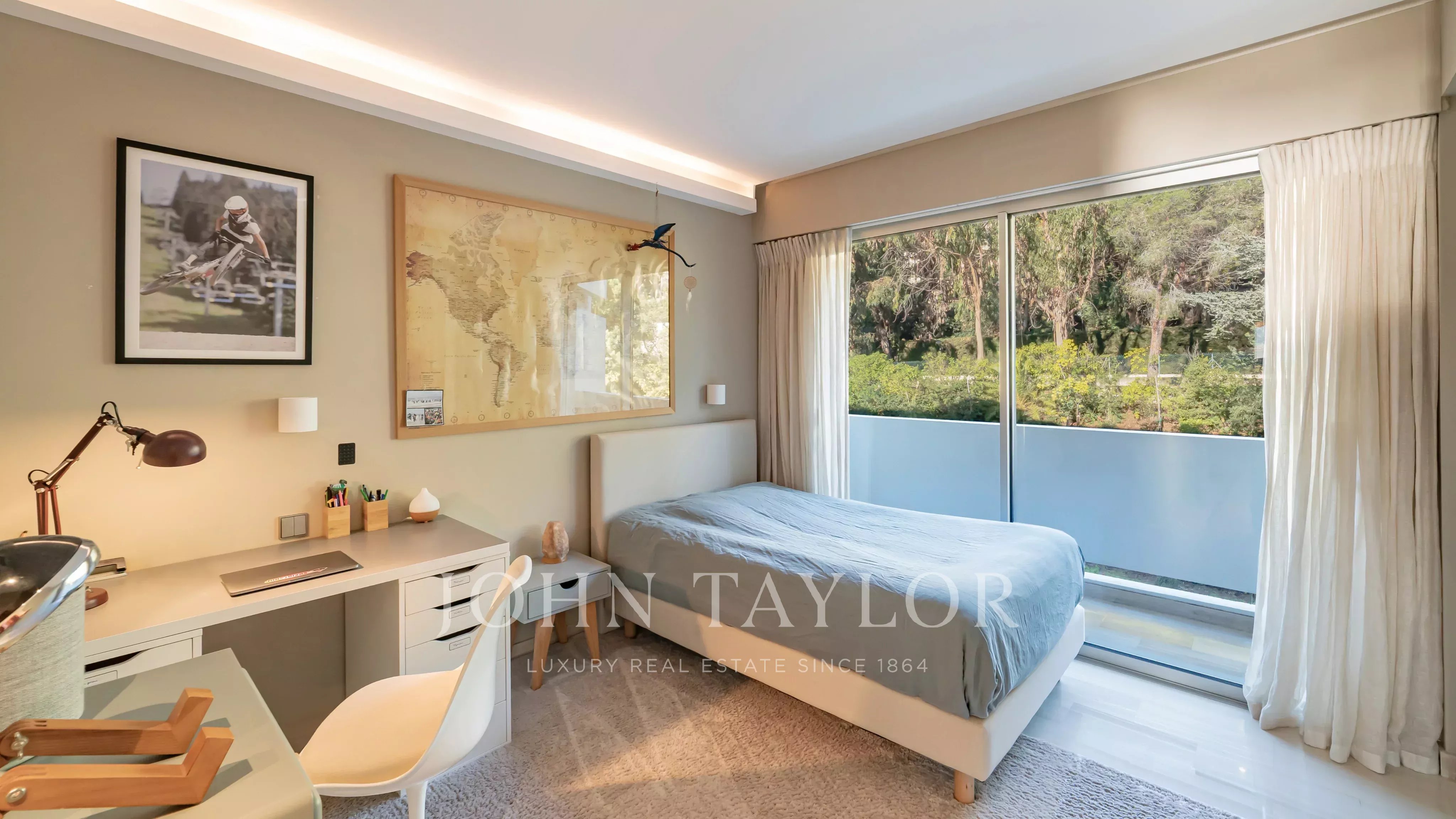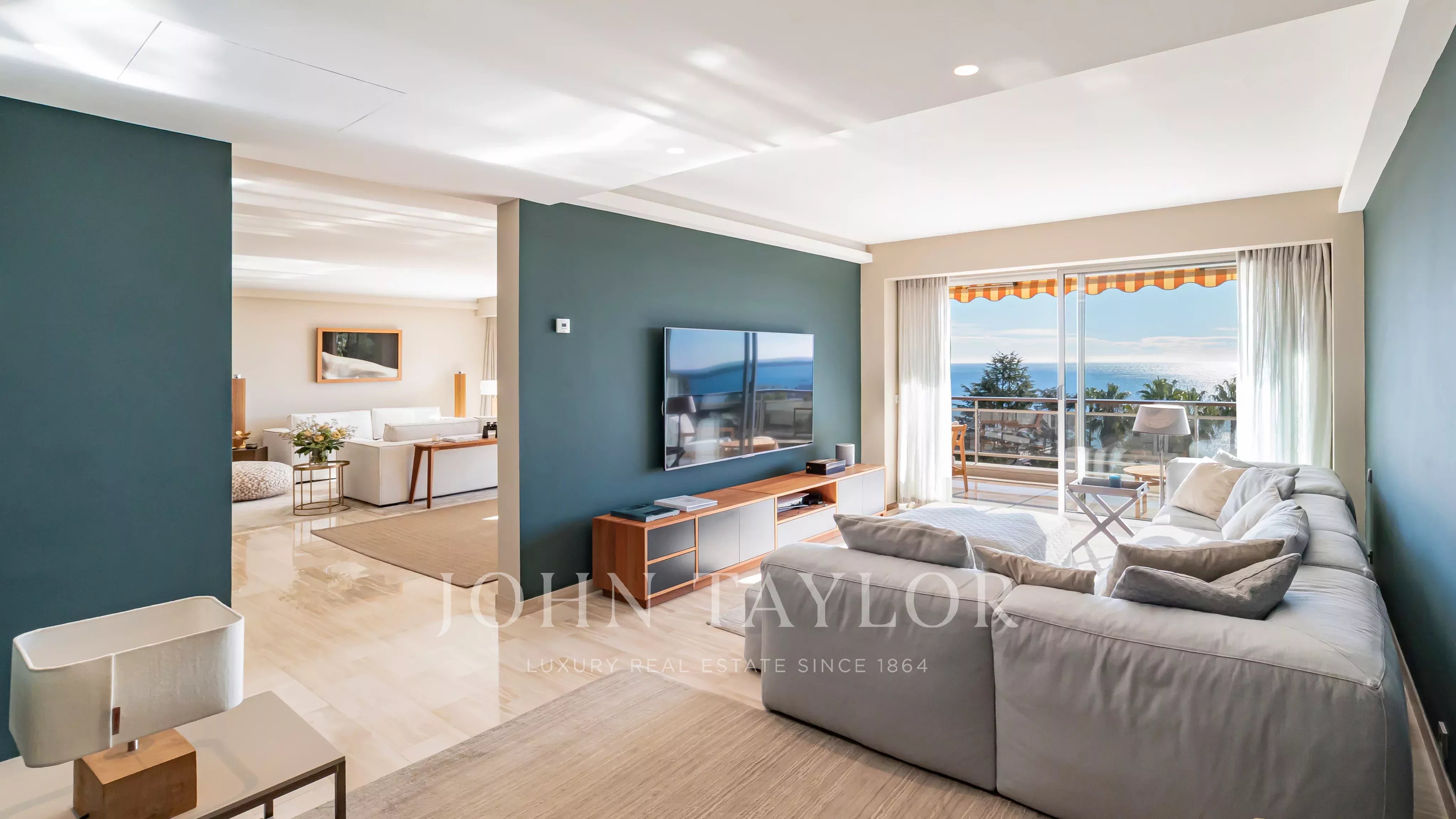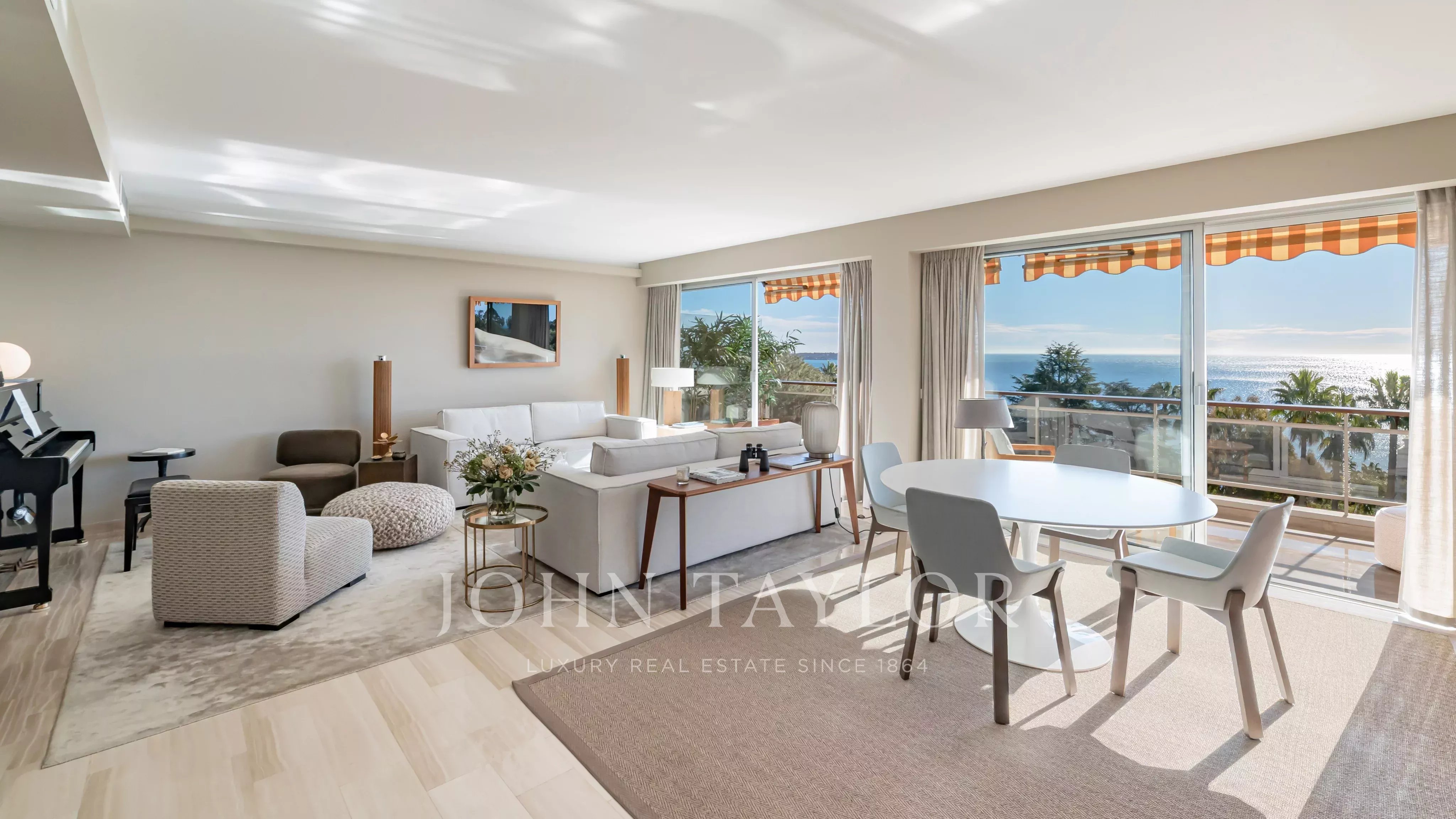 The apartment comprises a living room, a master bedroom with en suite shower room and dressing room, all opening onto a 32 m2 terrace with panoramic views of the sea and the Lérins islands, a fully equipped kitchen, two further bedrooms, each with its own shower room, and a laundry room.
