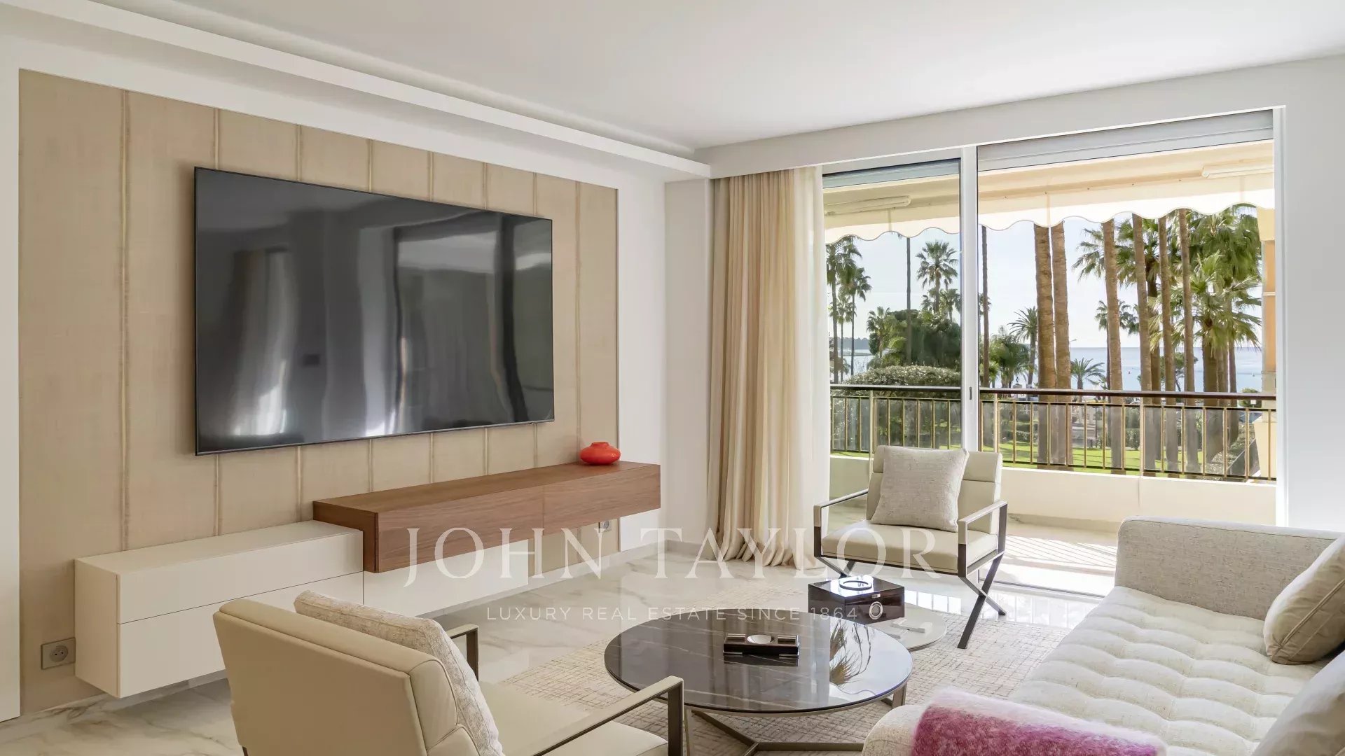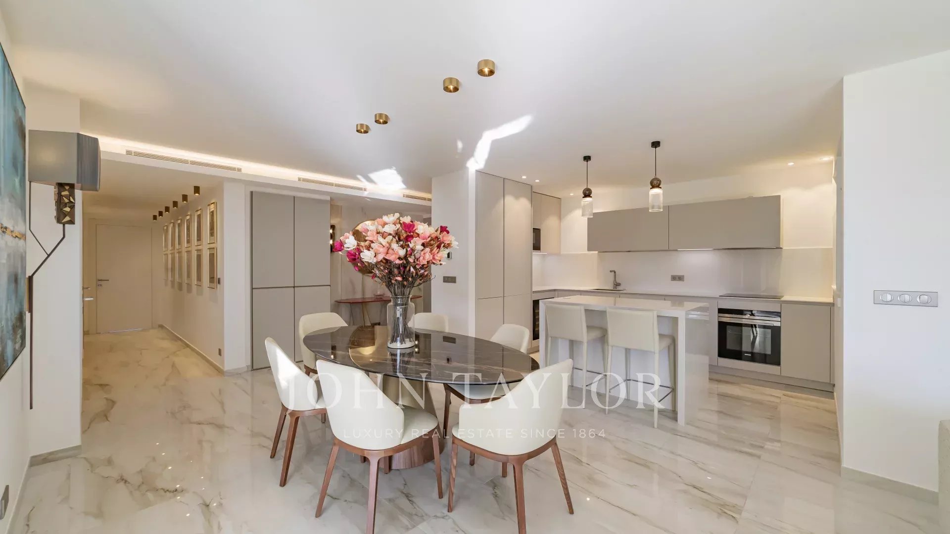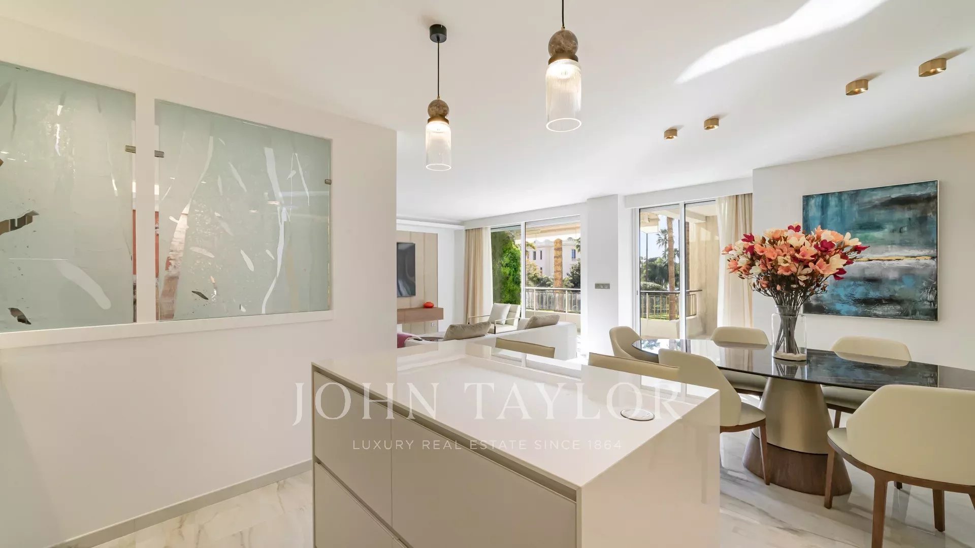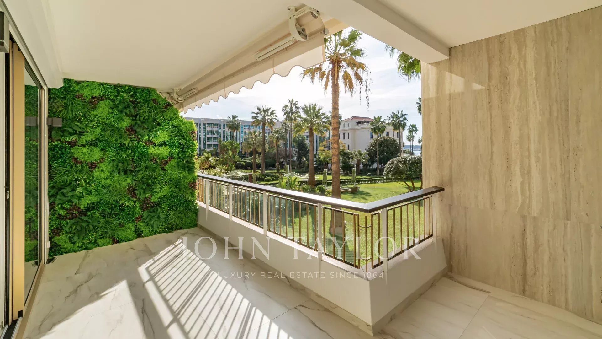In the heart of the Croisette, overlooking the sea and a garden, this sumptuous three-room apartment of 127 m² 'loi Carrez', plus 29 m² of terraces, has recently benefited from a complete, top-of-the-range renovation. It comprises an entrance hall, 56 m² living room/kitchen, two spacious bedrooms with en suite bathrooms, and a laundry room. Basement cellar. Double garage available as an optional extra.