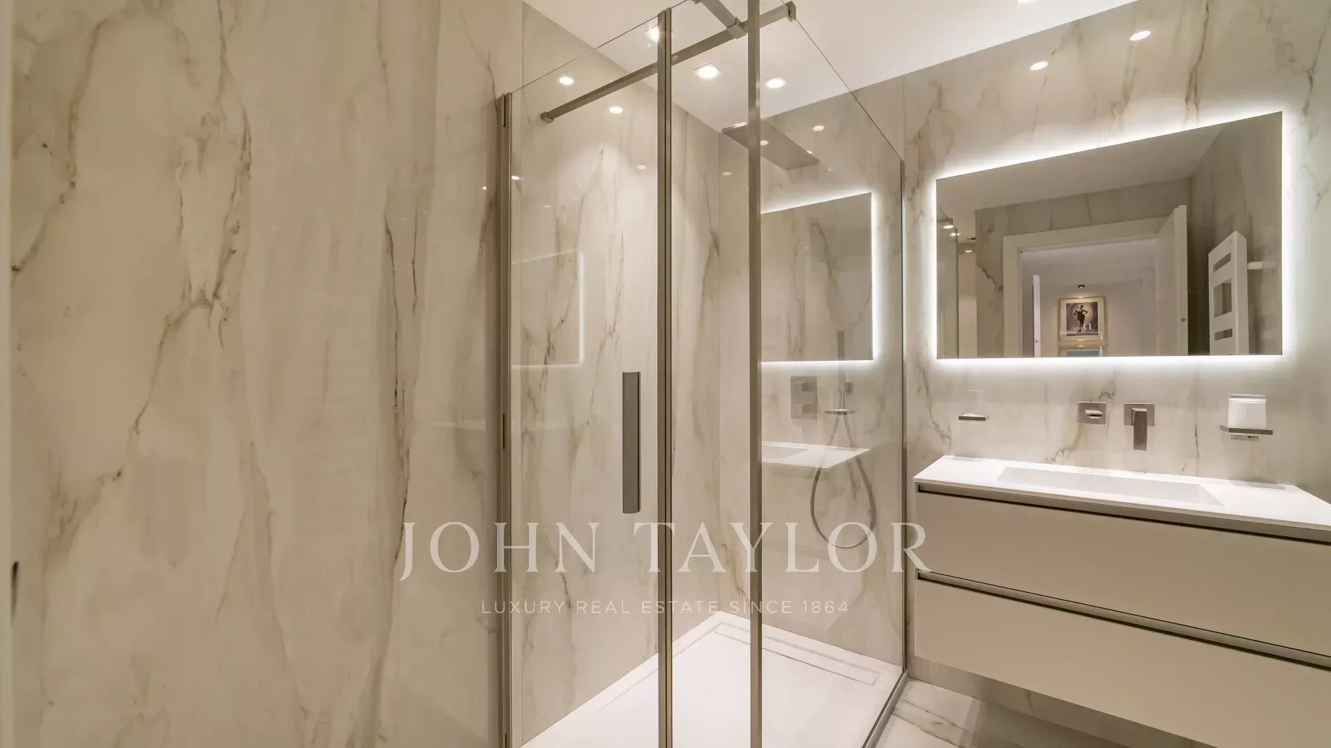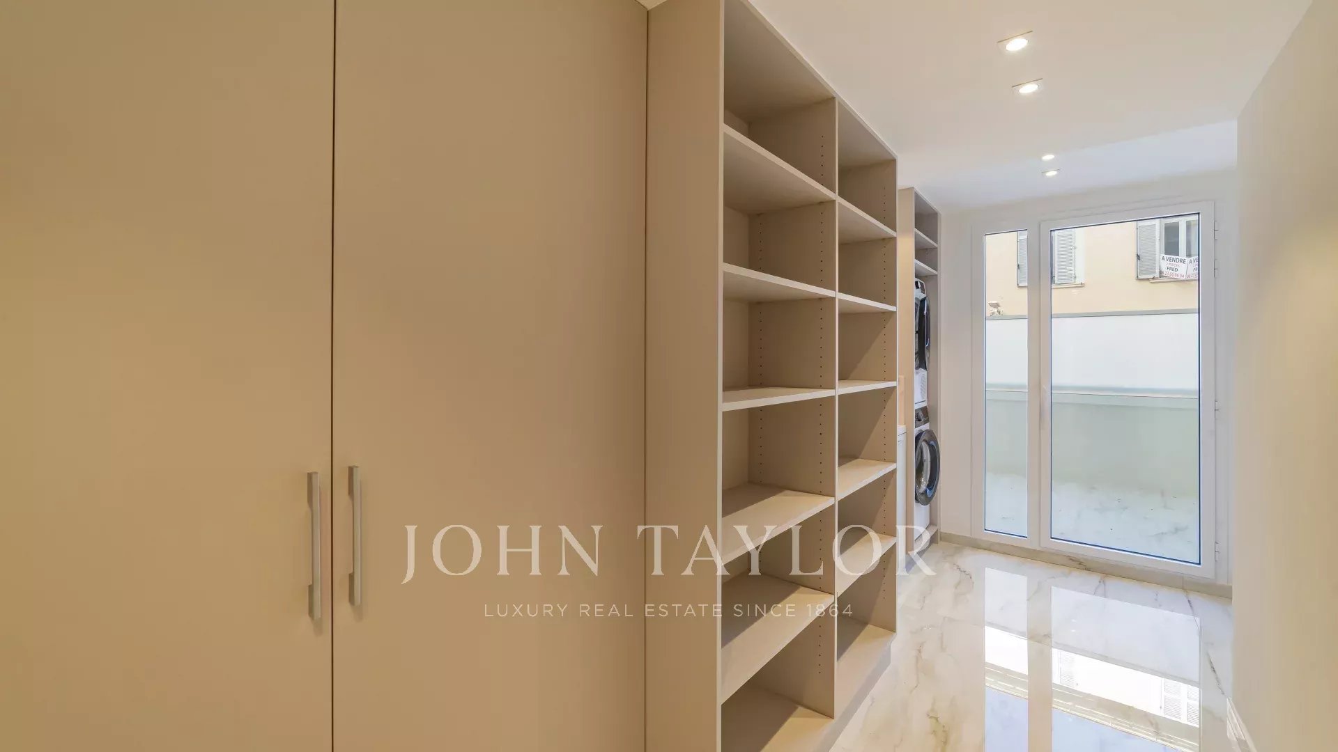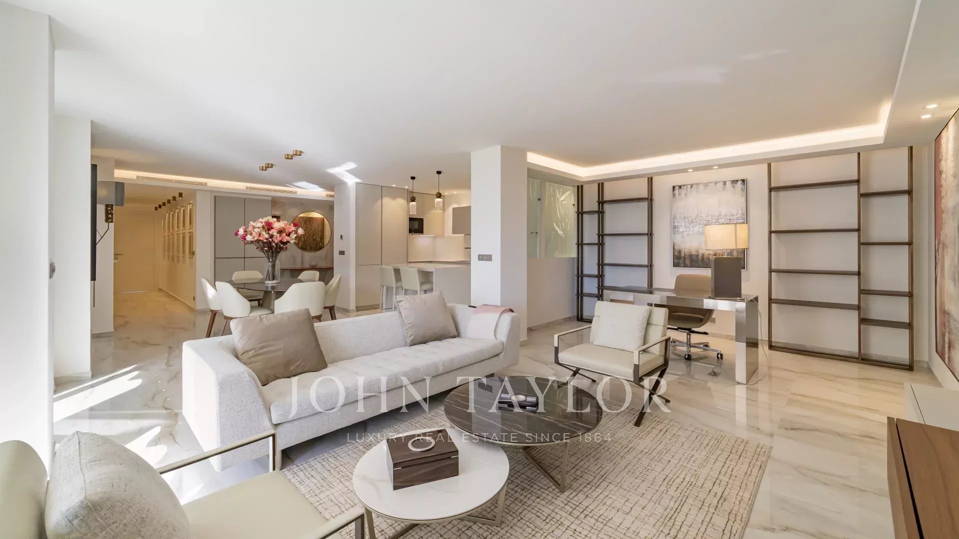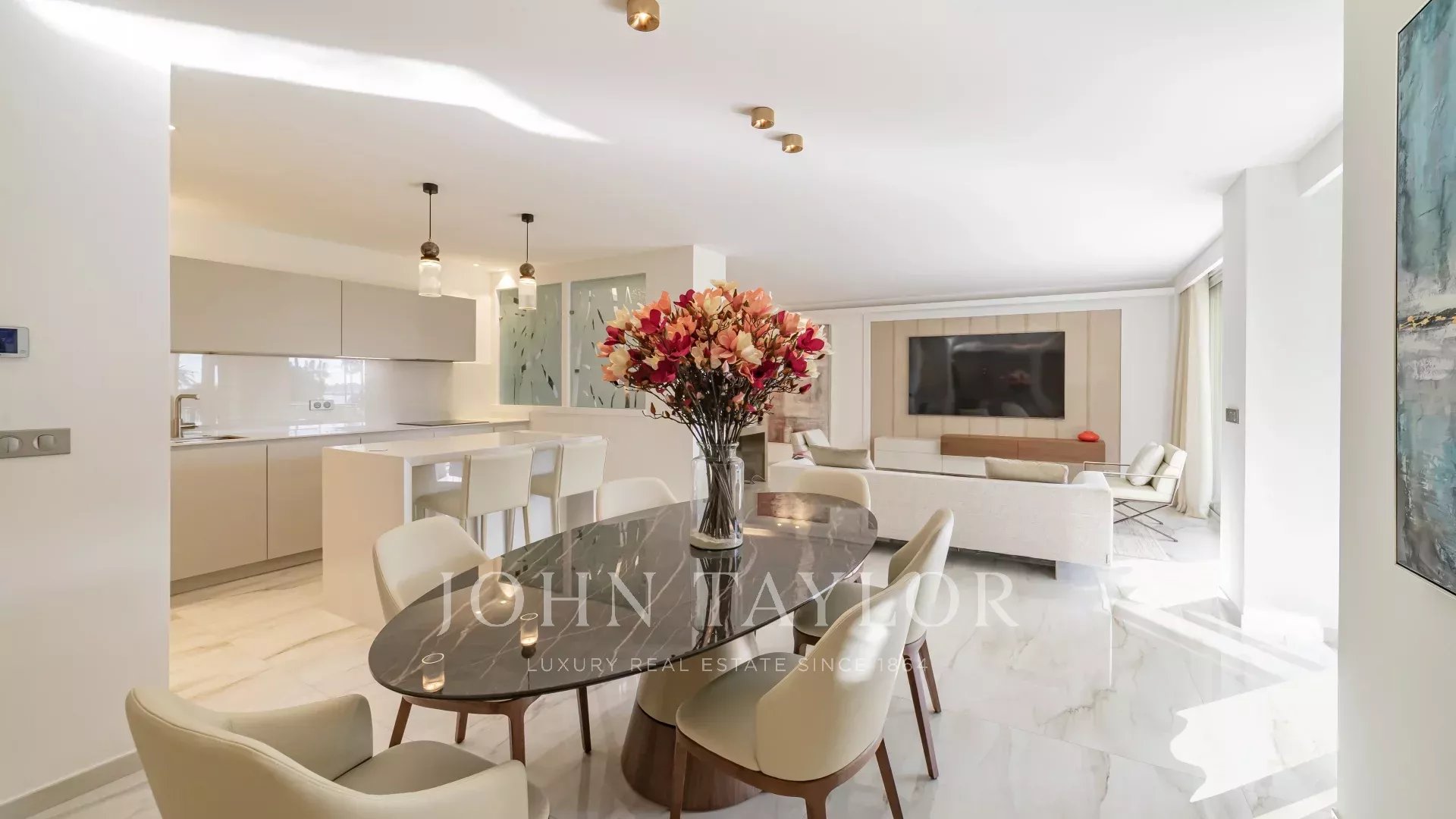 In the heart of the Croisette, overlooking the sea and a garden, this sumptuous three-room apartment of 127 m² 'loi Carrez', plus 29 m² of terraces, has recently benefited from a complete, top-of-the-range renovation. It comprises an entrance hall, 56 m² living room/kitchen, two spacious bedrooms with en suite bathrooms, and a laundry room. Basement cellar. Double garage available as an optional extra.