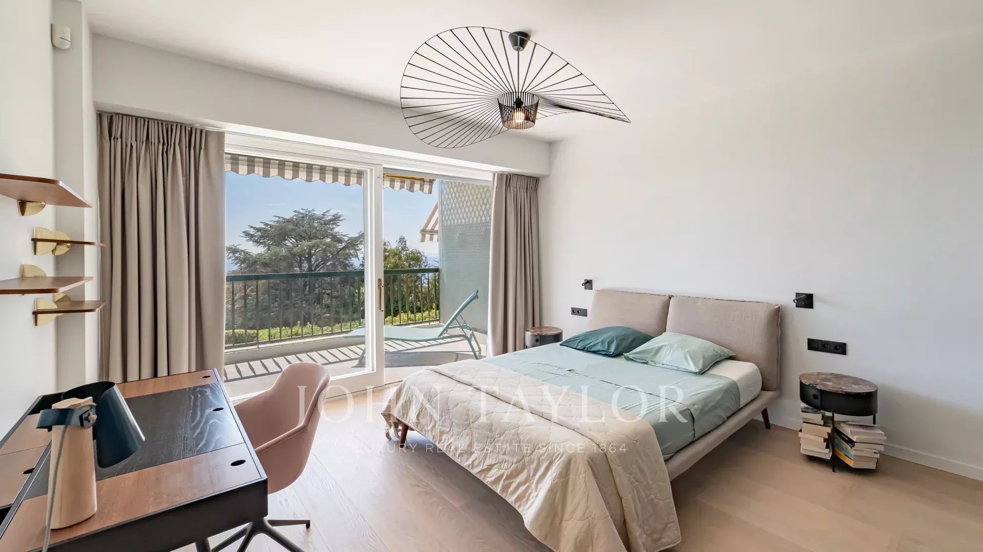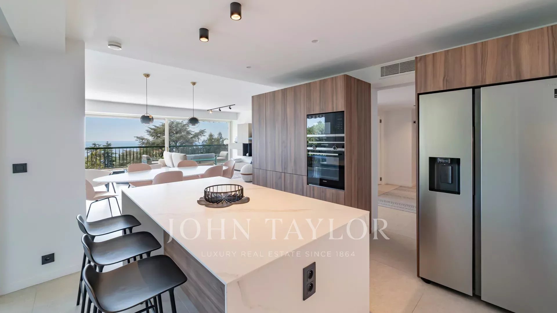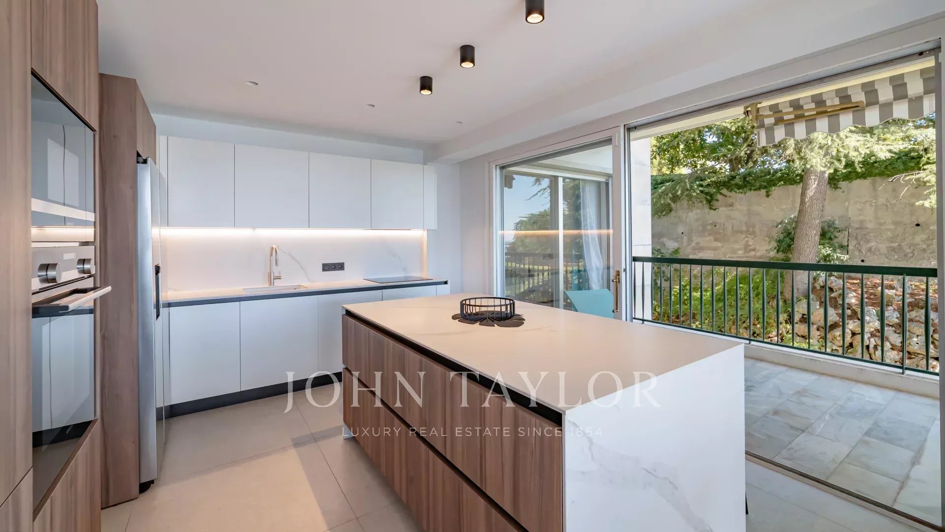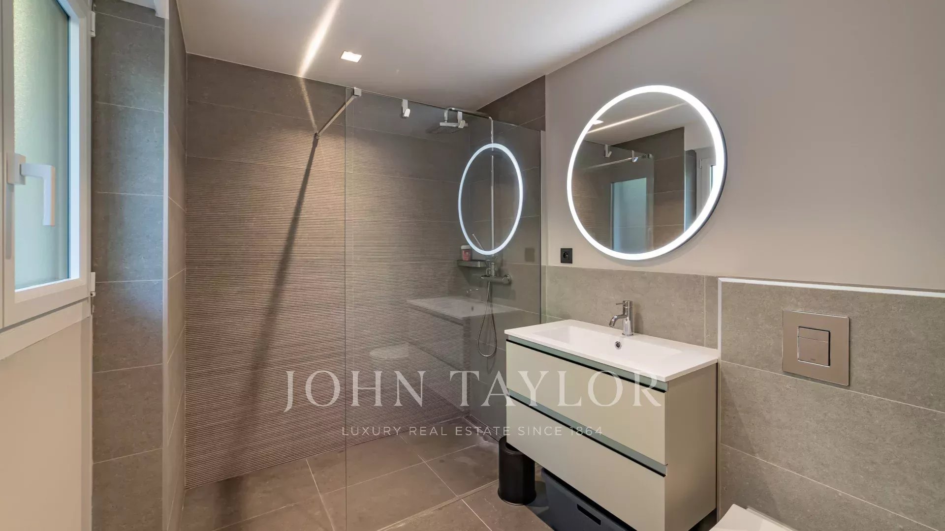 Entirely renovated recently in a contemporary style, it comprises an entrance hall, a living room with open-plan fitted kitchen, a master suite with shower room, dressing room and terrace access, and two further bedrooms, each with storage space and its own shower room.