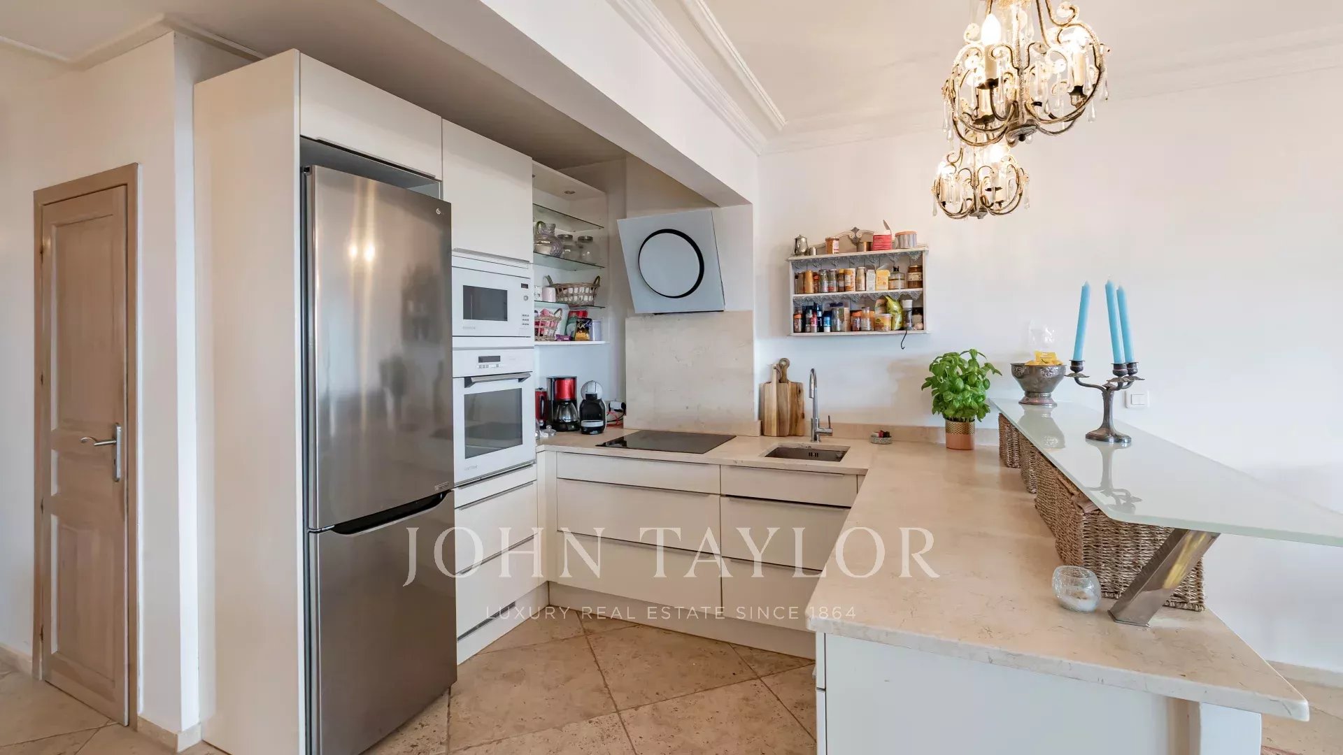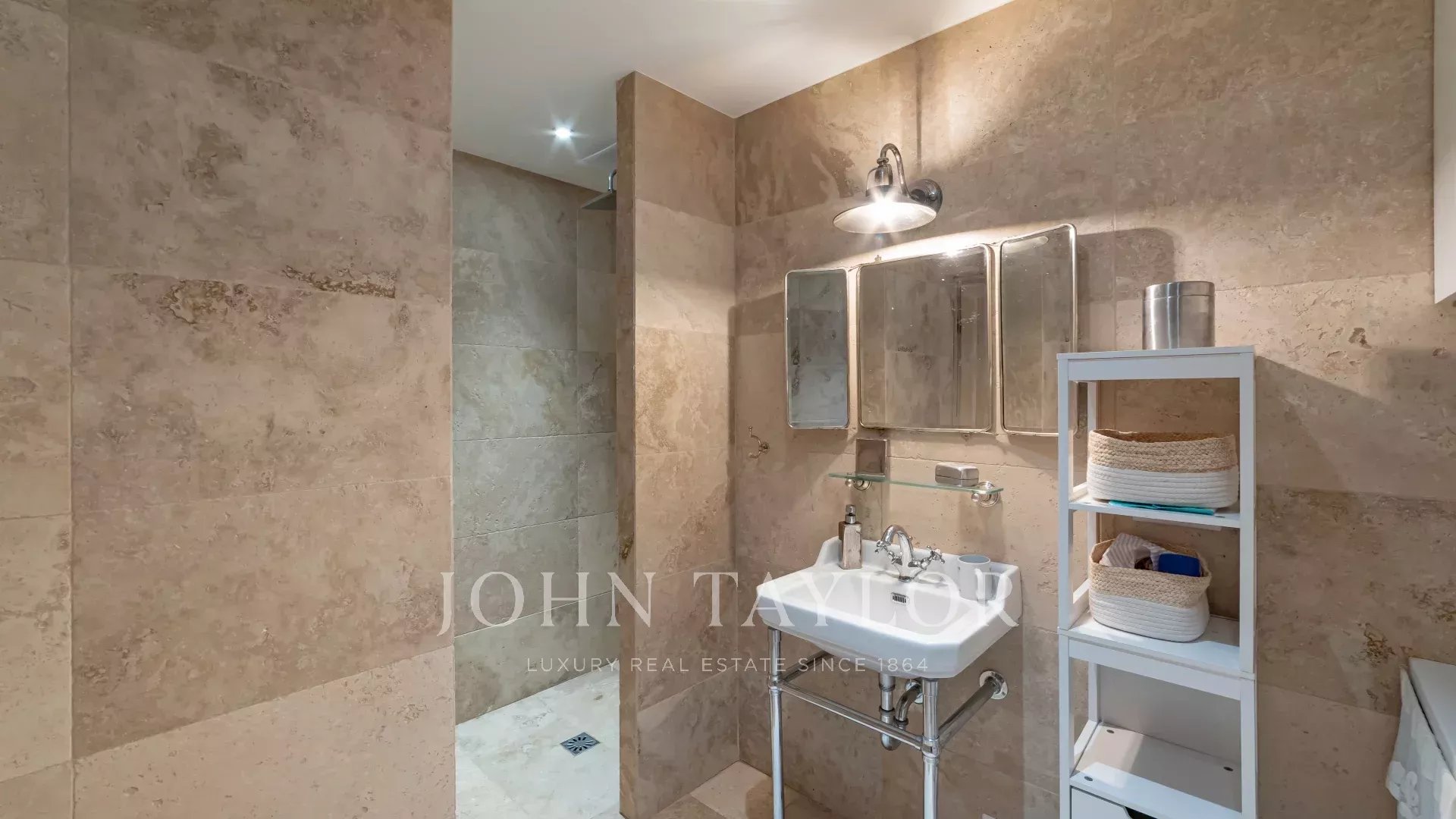 The apartment comprises an entrance hall, a vast living room with open-plan fitted kitchen, three bedrooms with en suite shower rooms, and a guest toilet.
