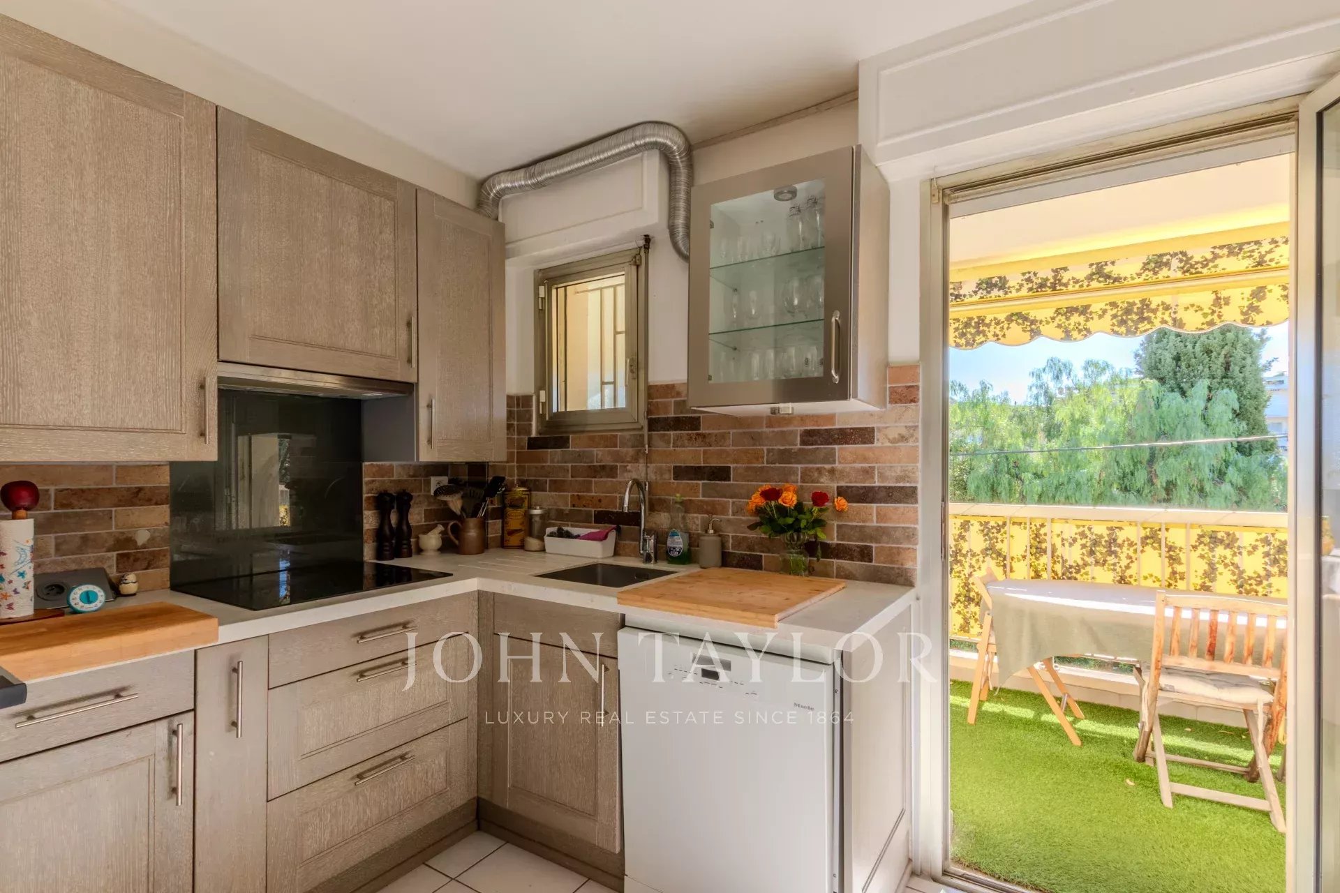 The apartment comprises a large entrance hall with cupboards, an equipped kitchen, a living room with dining area, all opening onto an east and south facing terrace.