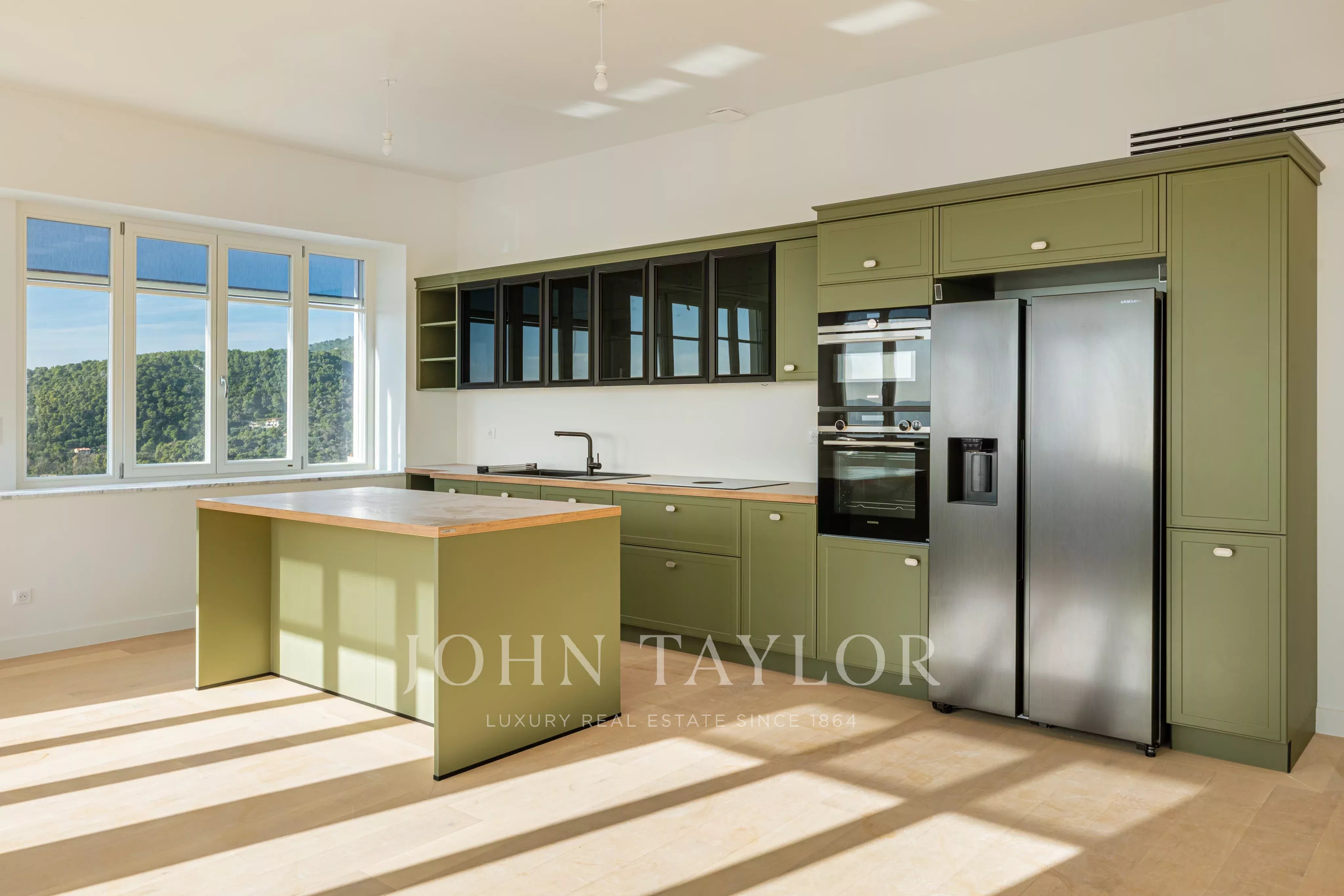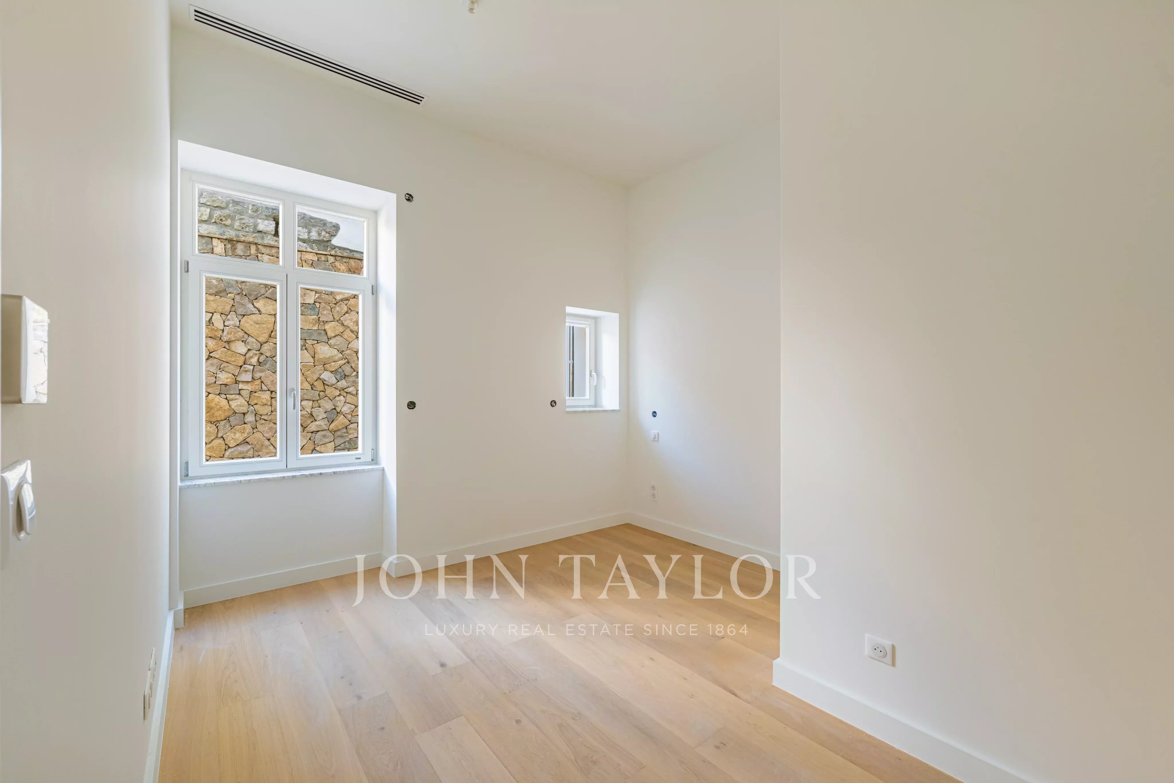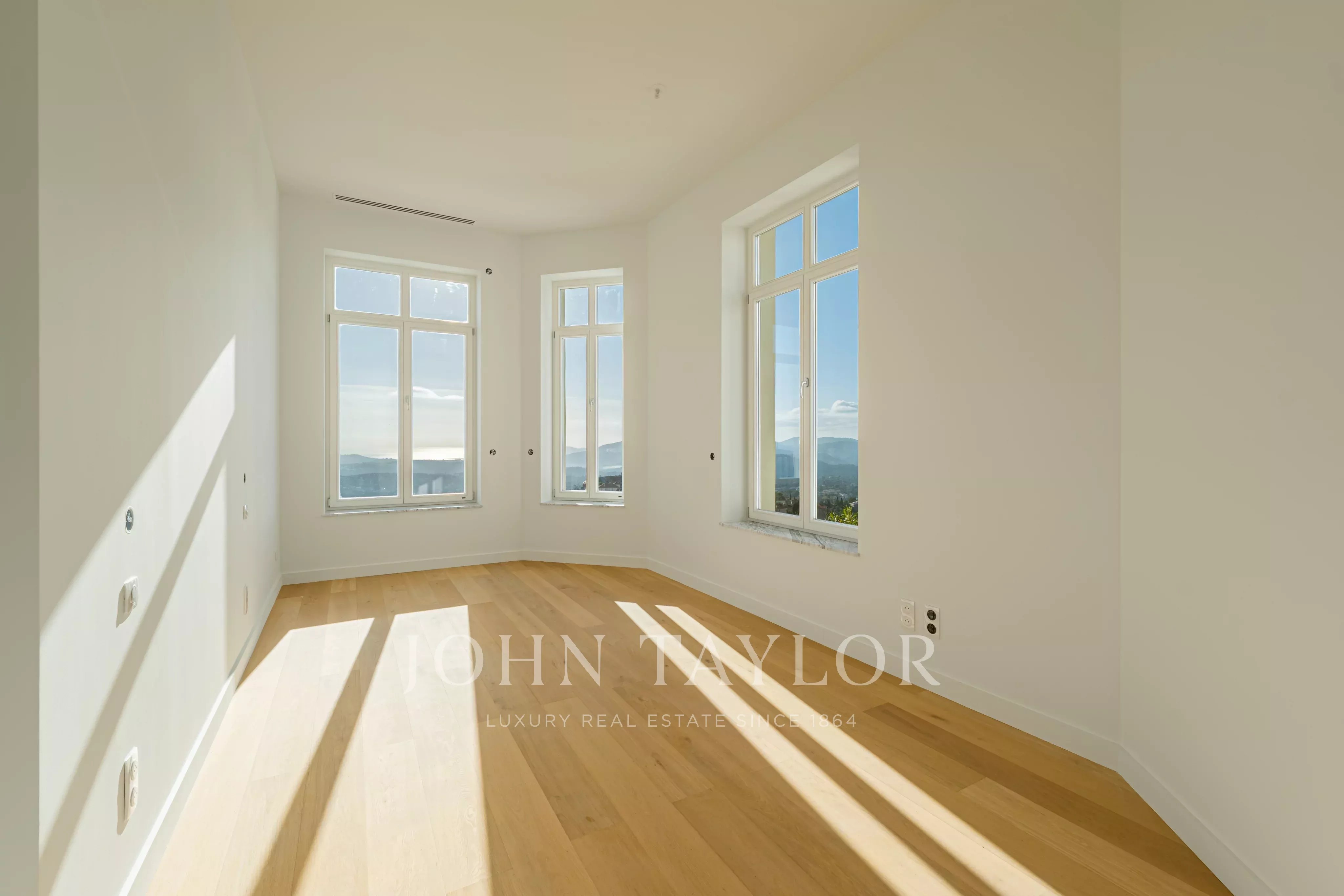 In an elegant residence of beautifully renovated apartments in a historic building in the hills of Grasse, offering unobstructed views of the town, hills and sea.