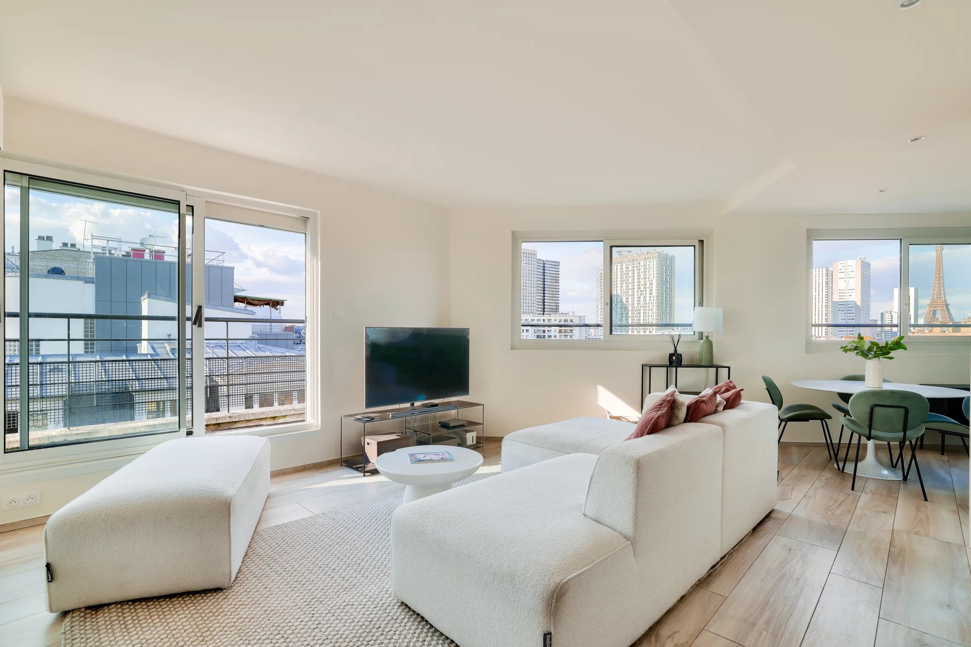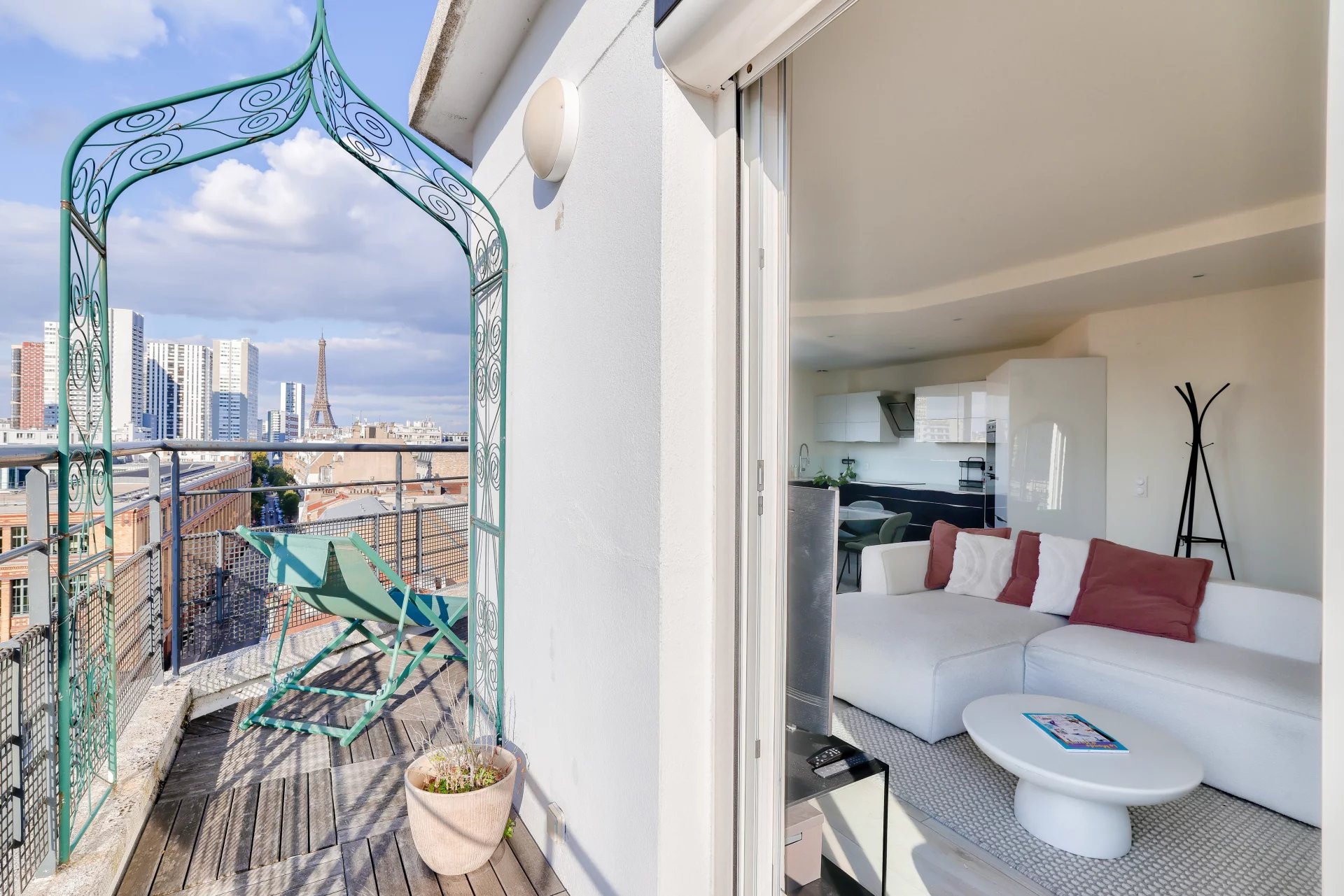 - A living room with large window opening onto a 15m² balcony with panoramic views and views of the Eiffel Tower;