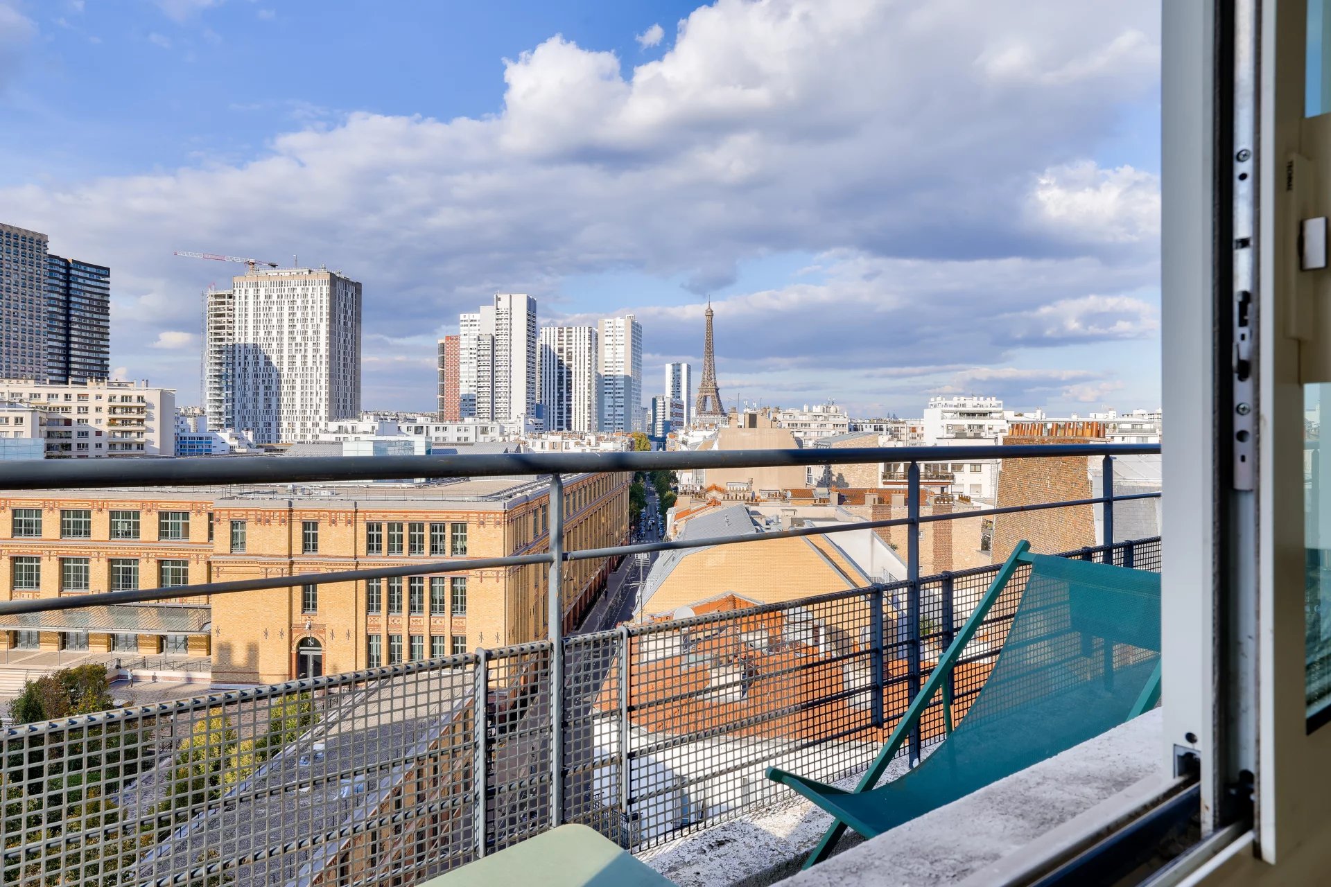 In a corner building constructed in the mid 1950s, this perfect 43m² apartment is on the 8th floor with lift and benefits from a large balcony/terrace with panoramic views of Paris and the Eiffel Tower.