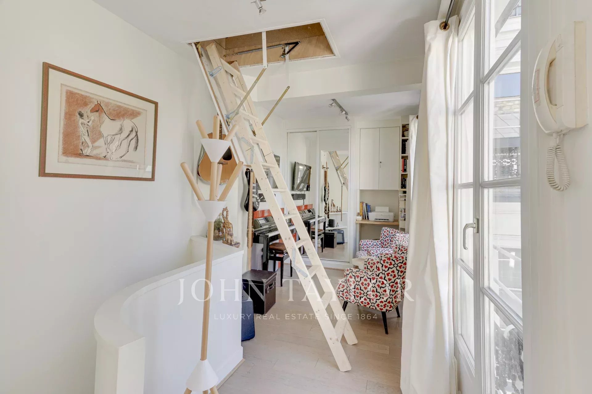 A retractable staircase provides exclusive access to a large attic. Although not convertible into living space, it is ideal for storing everyday items without cluttering the apartment.