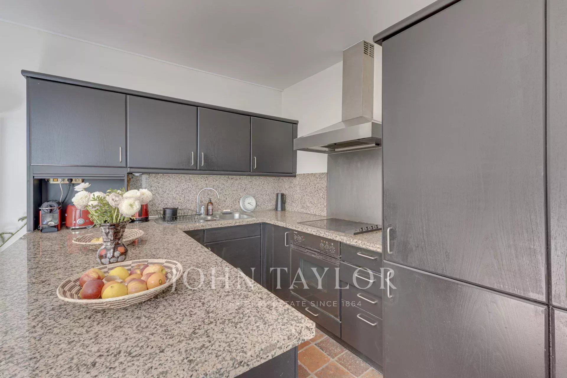 - A pleasant living space with an open kitchen and two French doors opening onto a long south-facing balcony.
