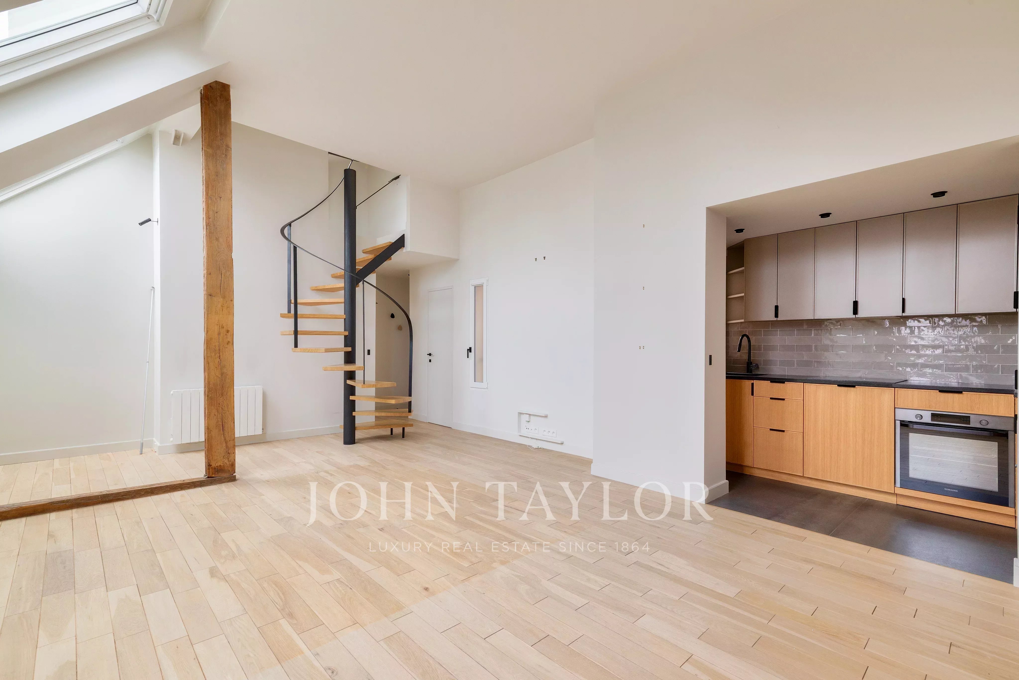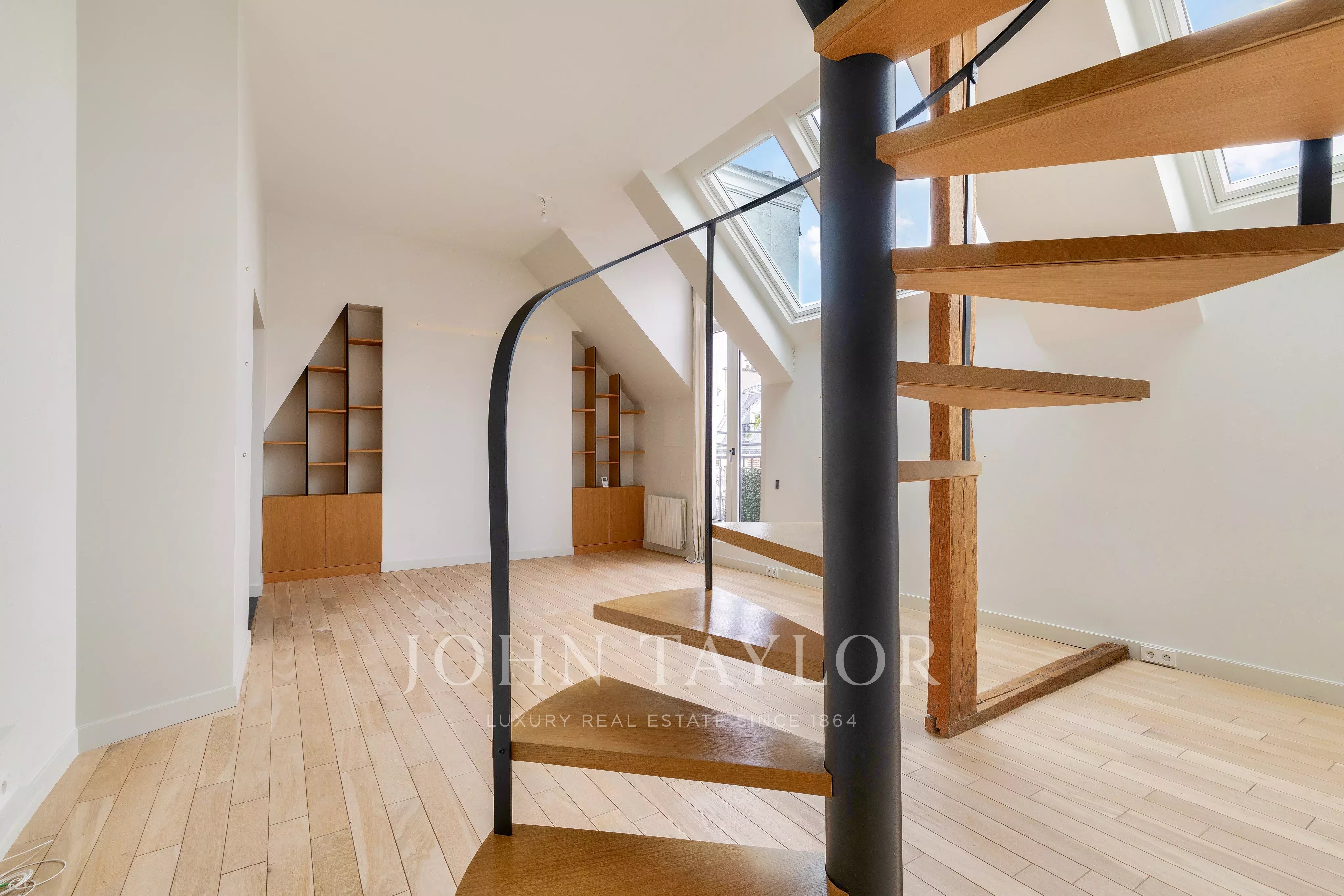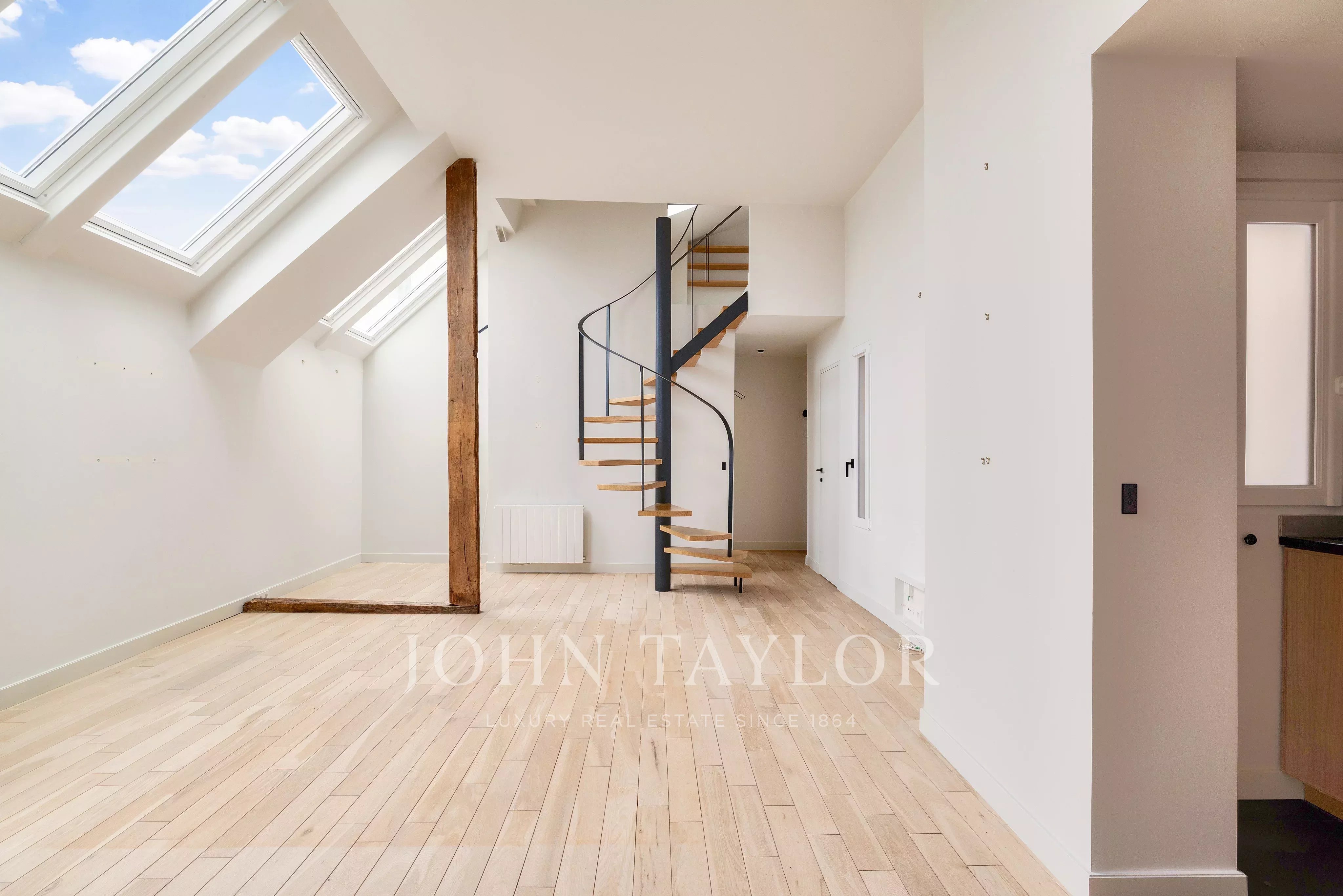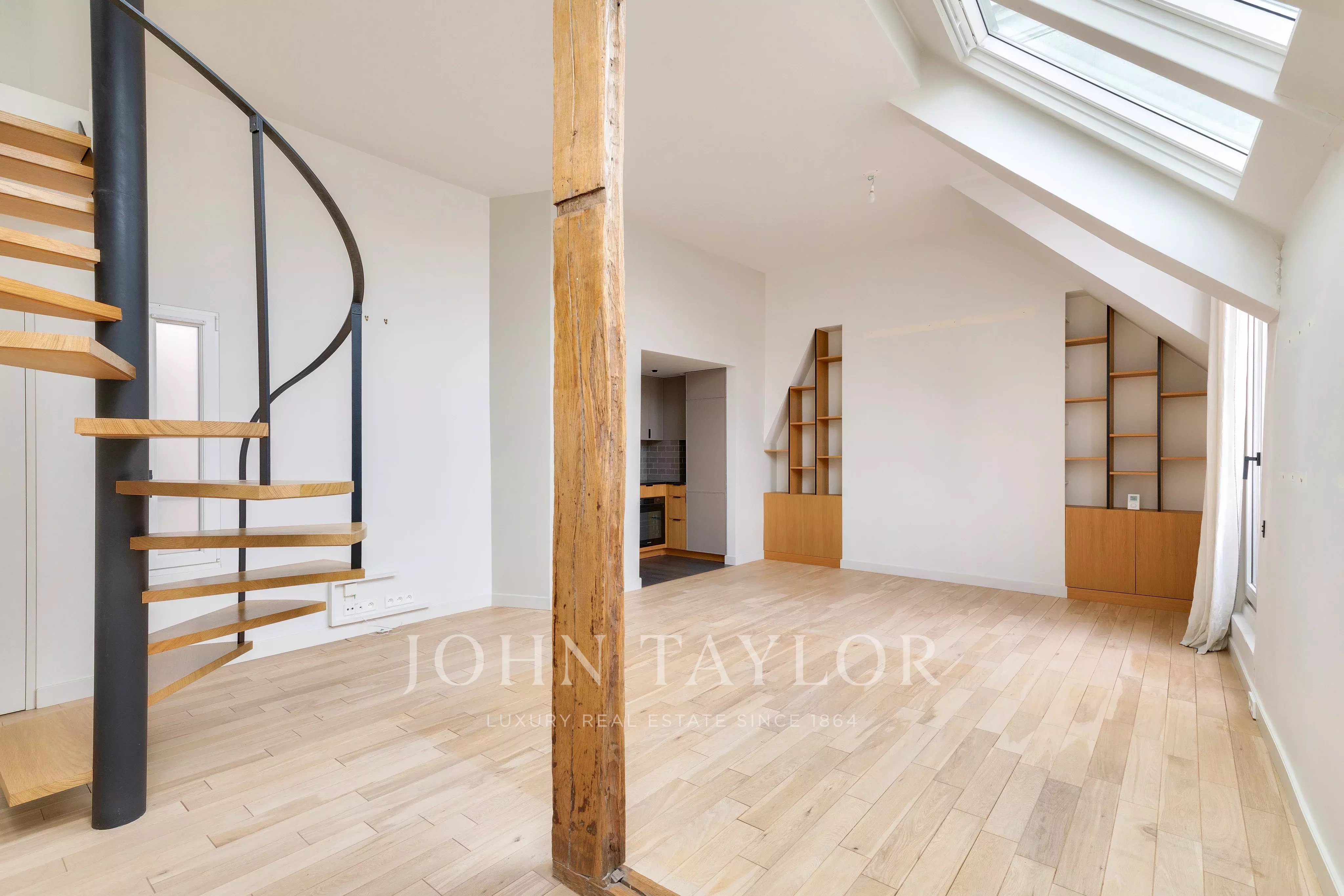 In a fully renovated historic building, charming duplex loft apartment on the top floor with elevator access.