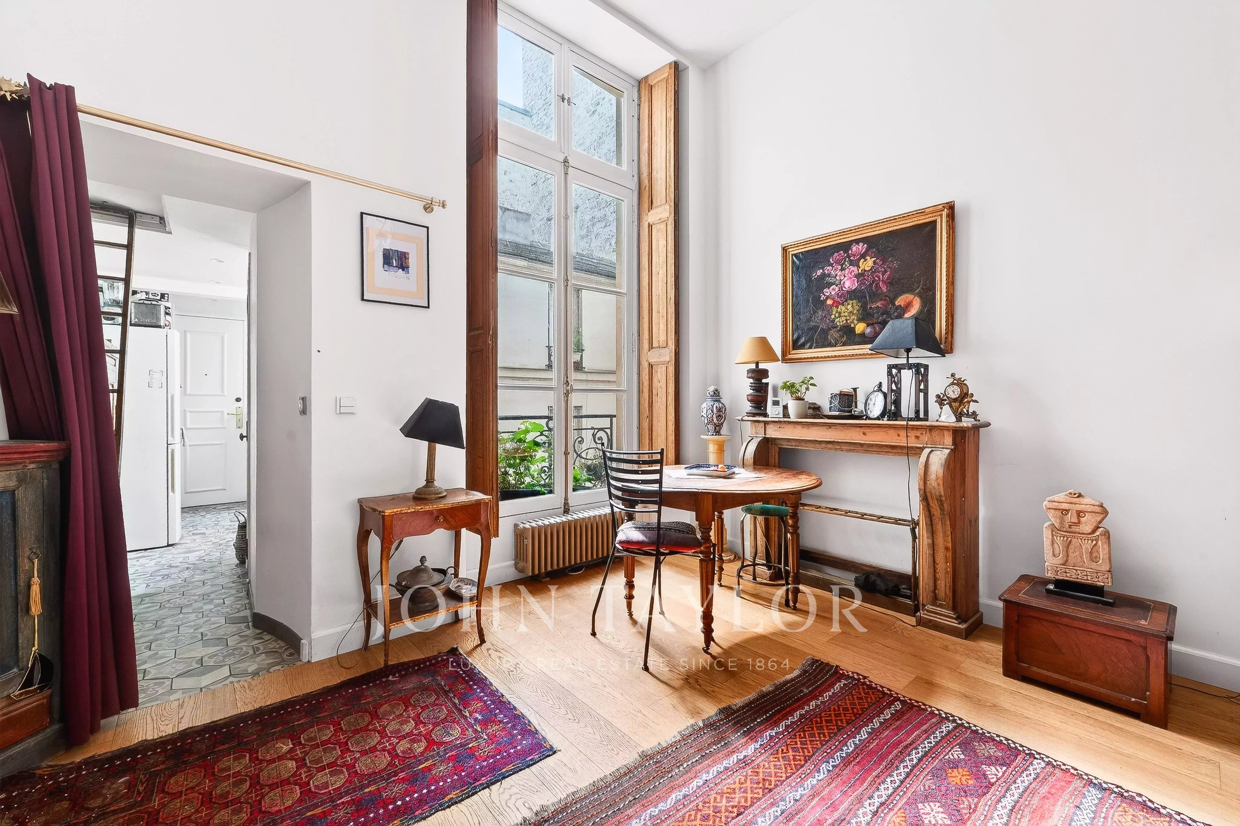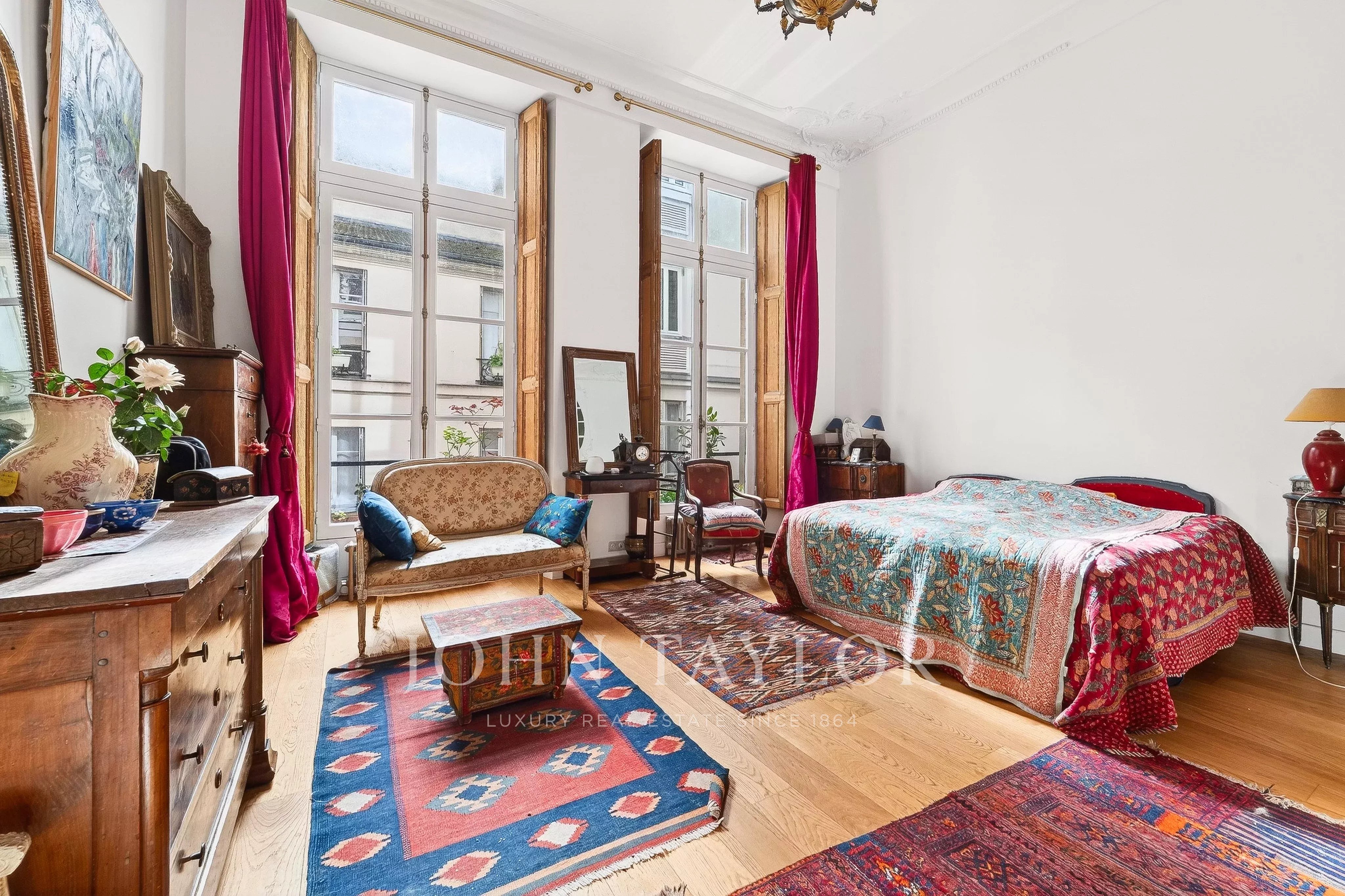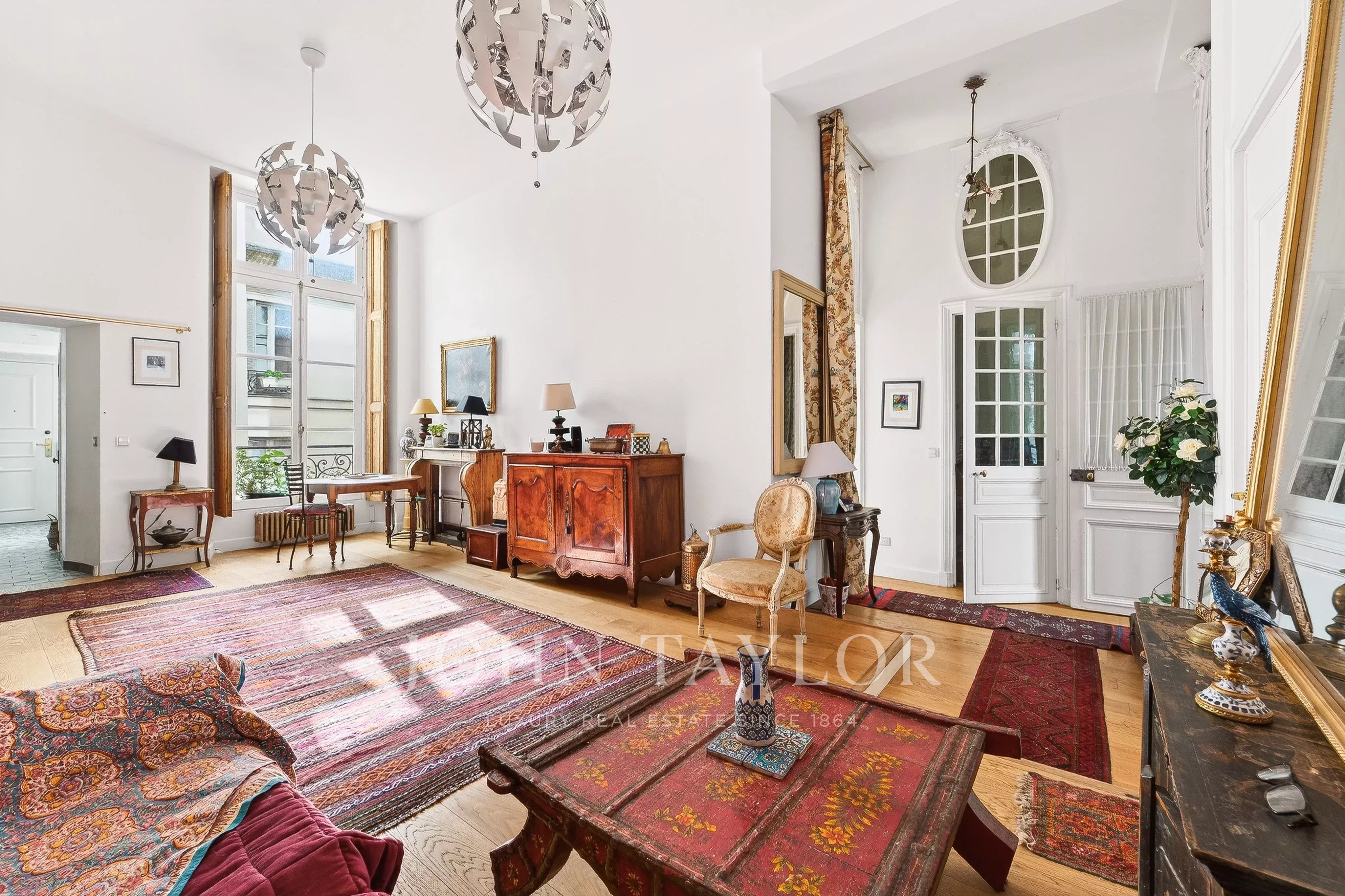 Located in the heart of the highly sought-after Odéon district, on a quiet street, this charming apartment of 100.65 sq. m (Carrez law) is situated on the first floor of a beautiful 18th-century building, accessible via a grand staircase (located above the mezzanine floor).