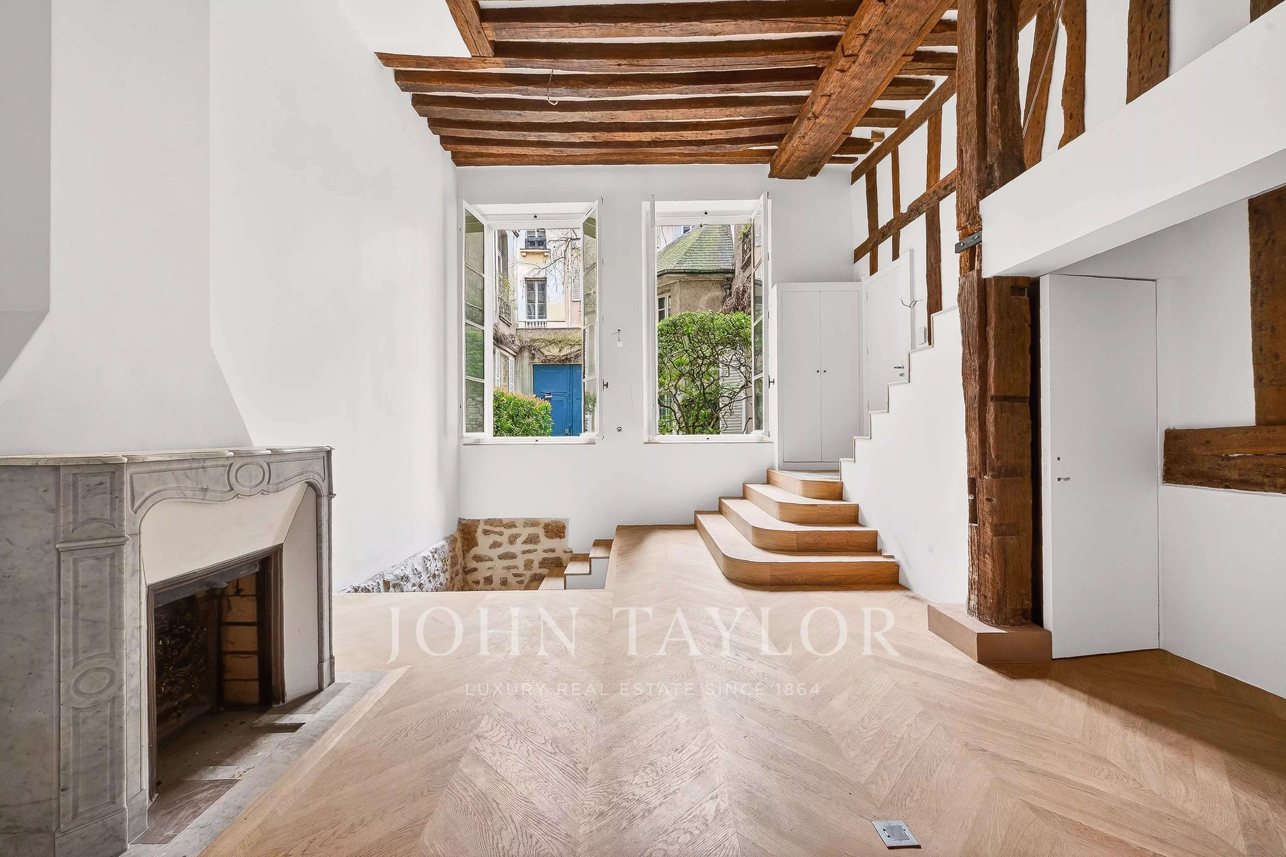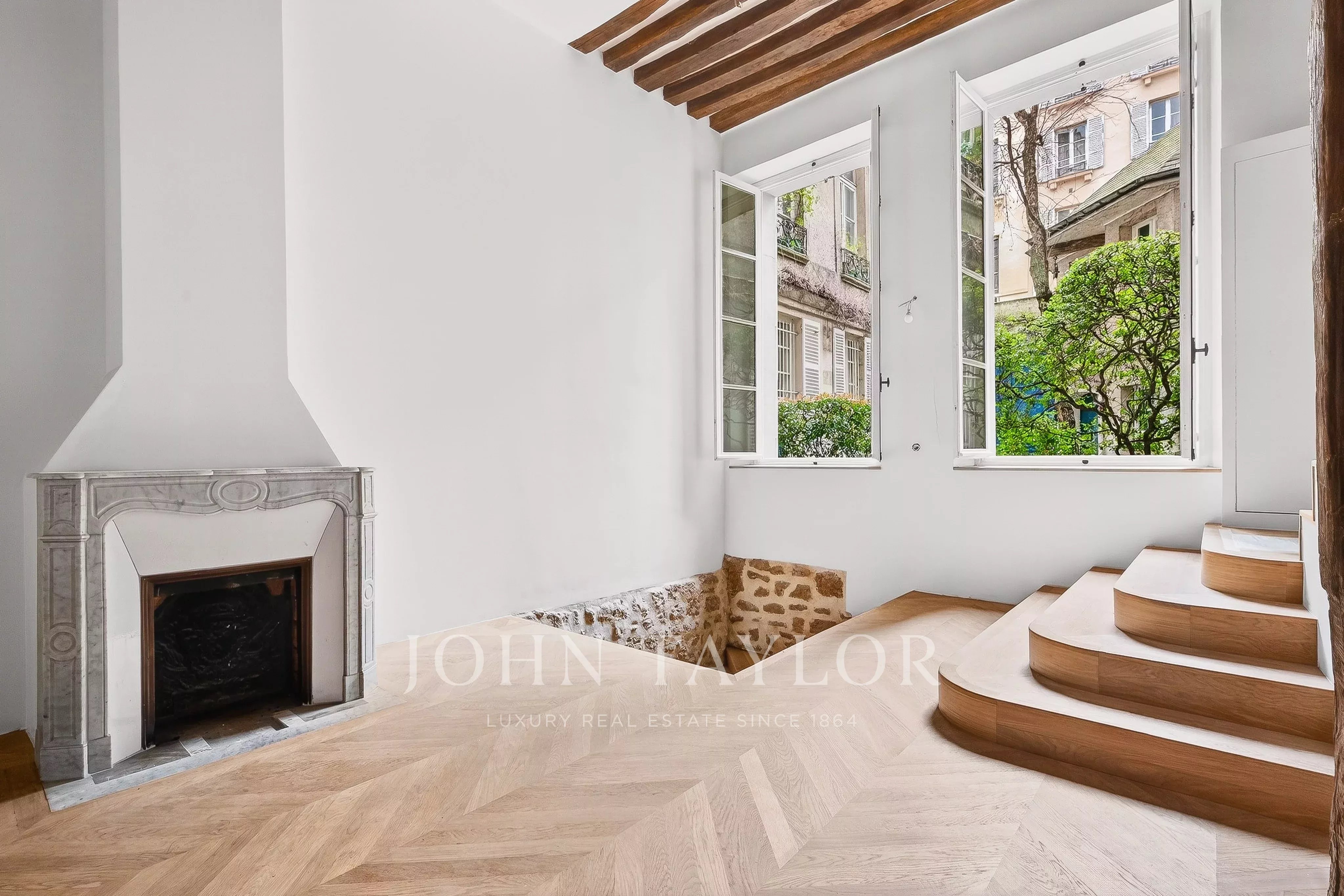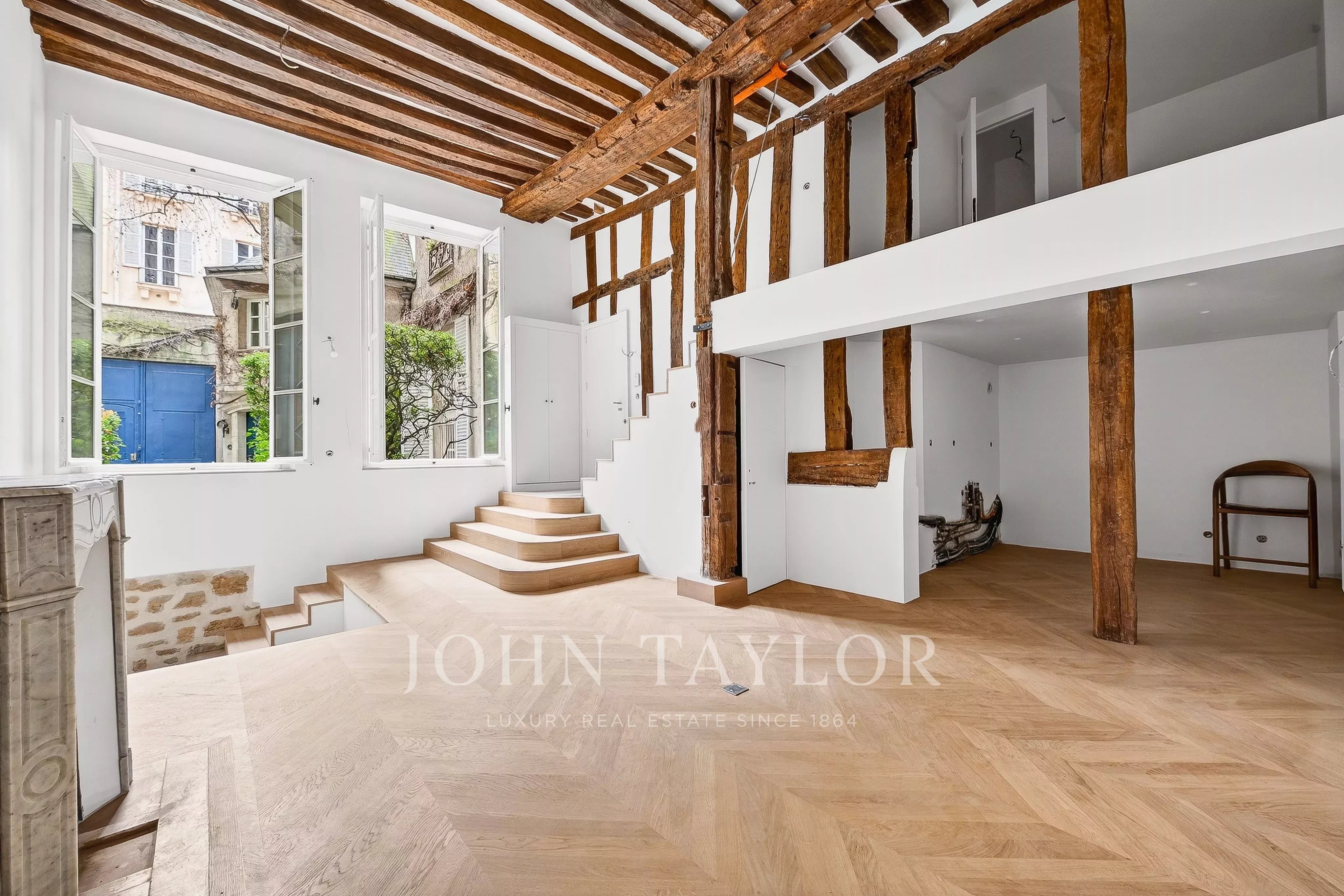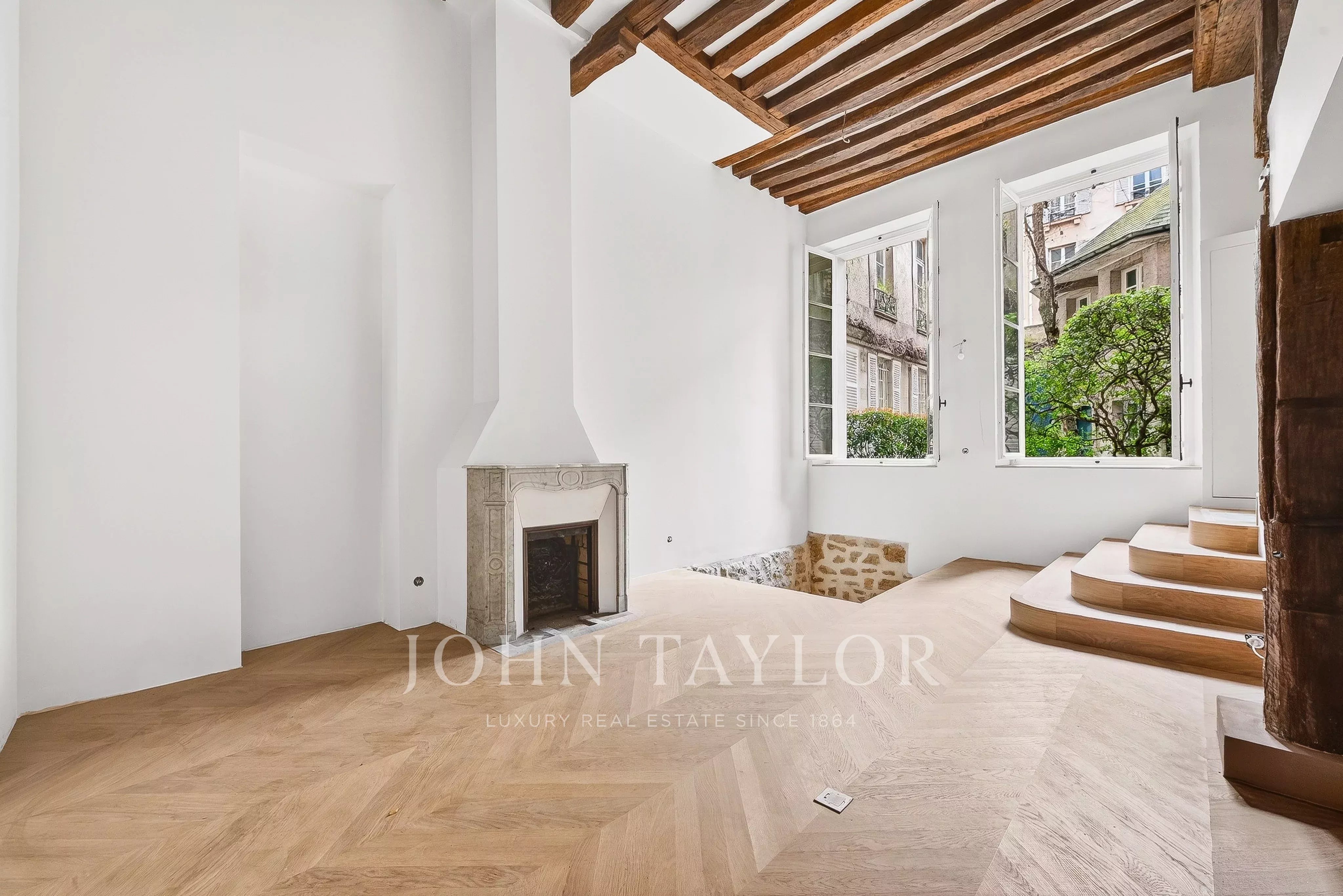 Fully air-conditioned and renovated to the highest standards with quality materials, the property preserves its historic character with exposed beams, a fireplace, and chevron (point de Hongrie) parquet flooring. It boasts exceptional volumes (4.20m ceiling height) and is arranged as follows: