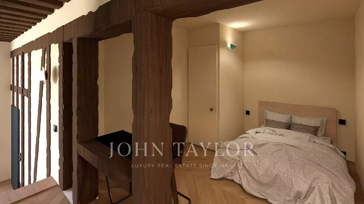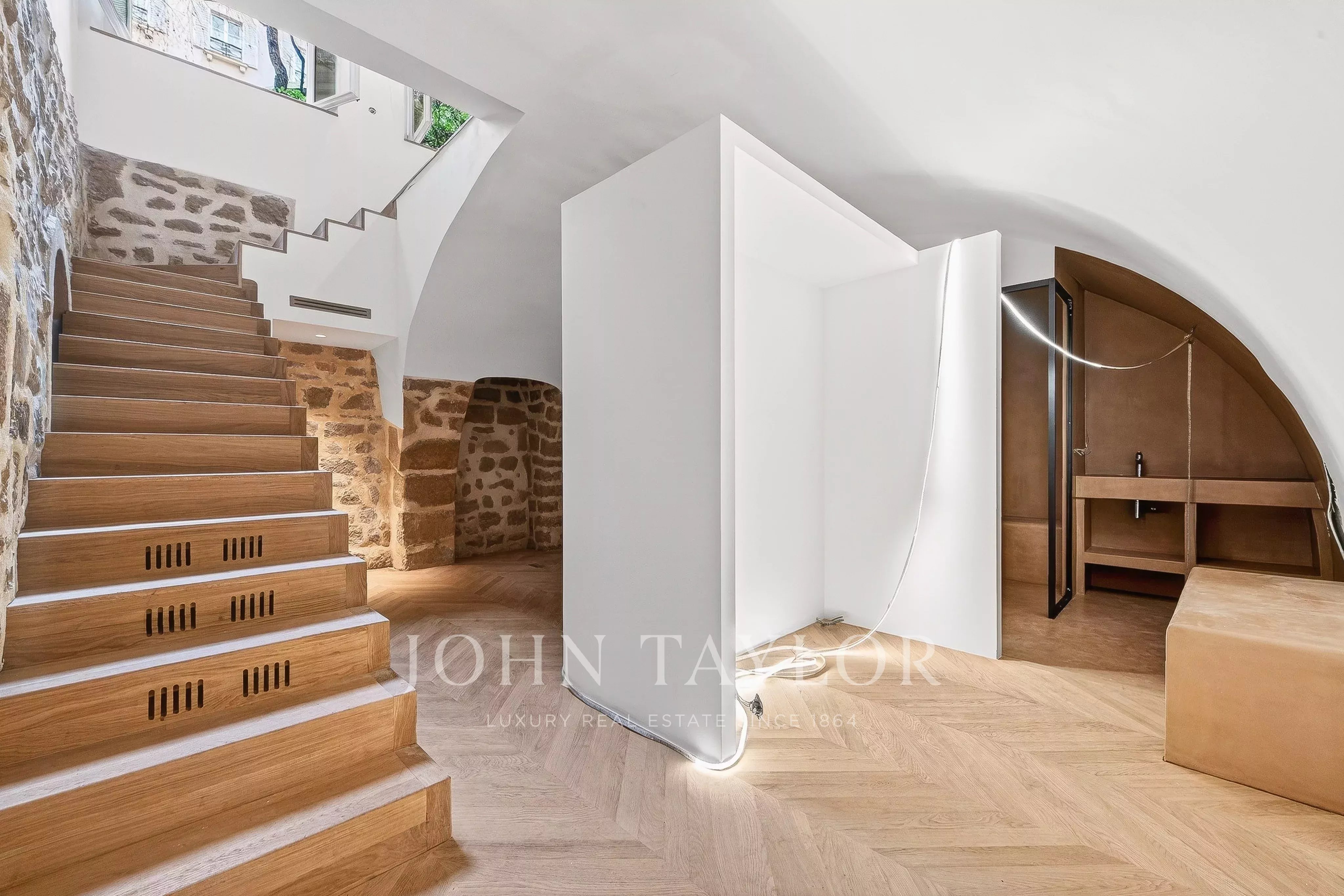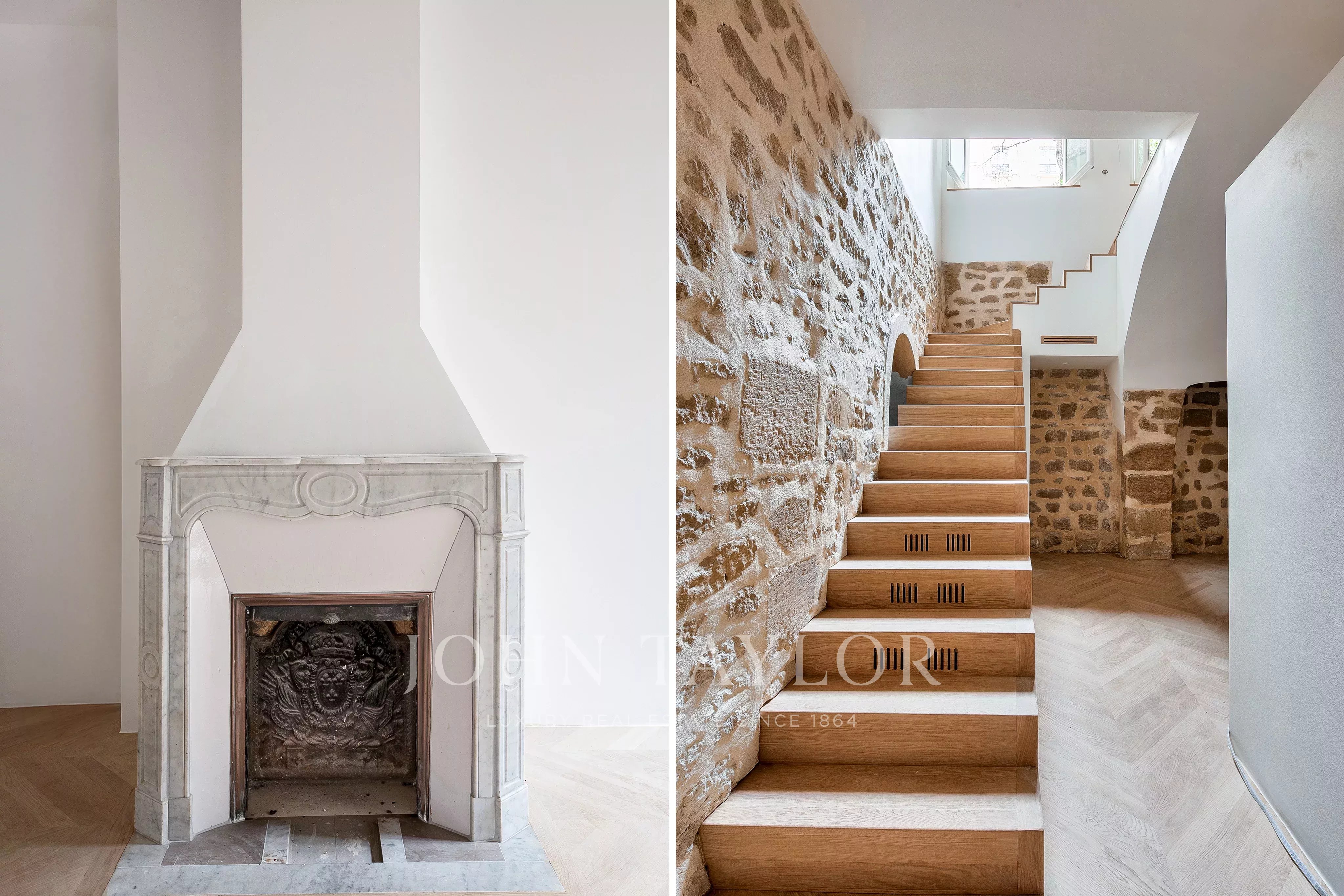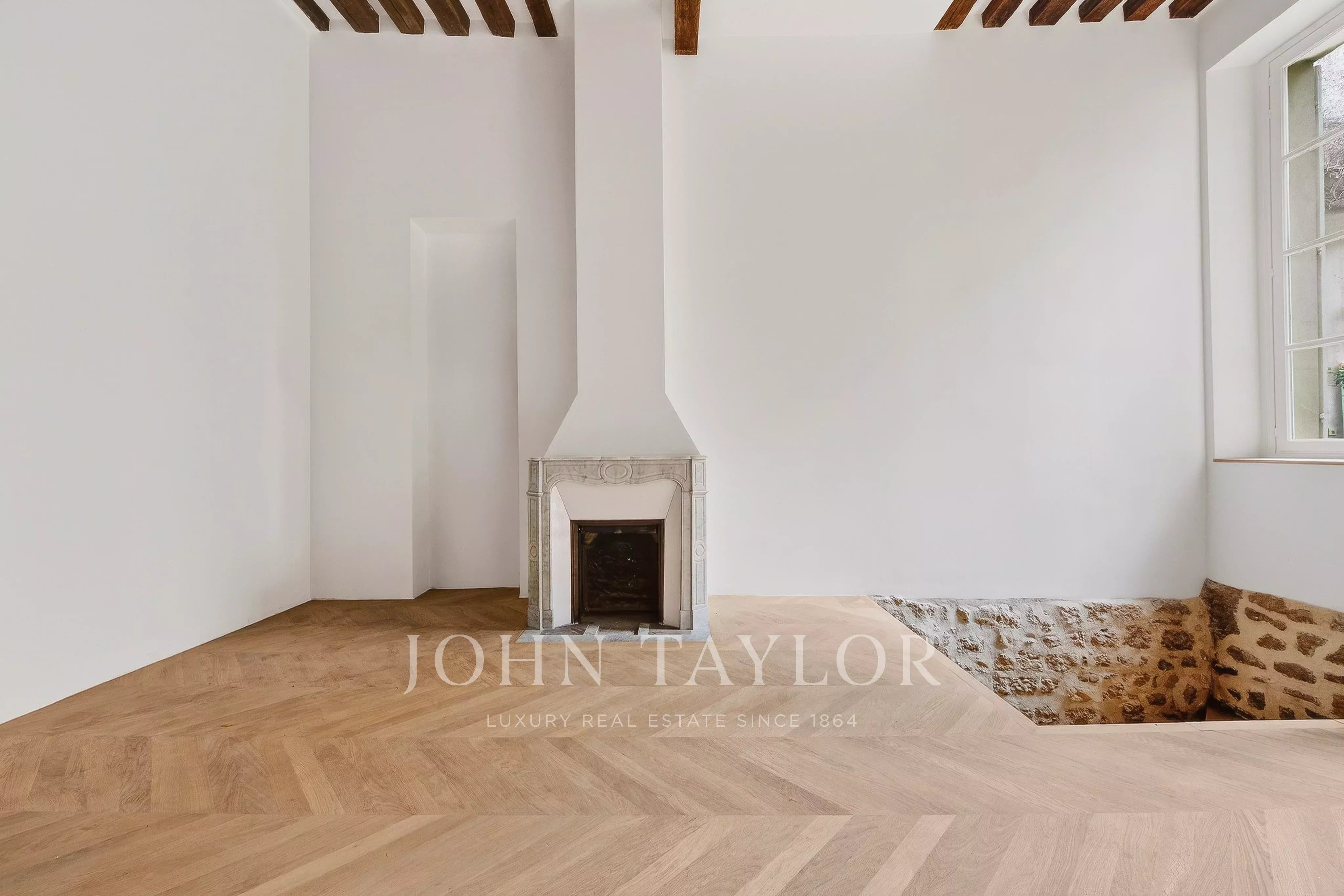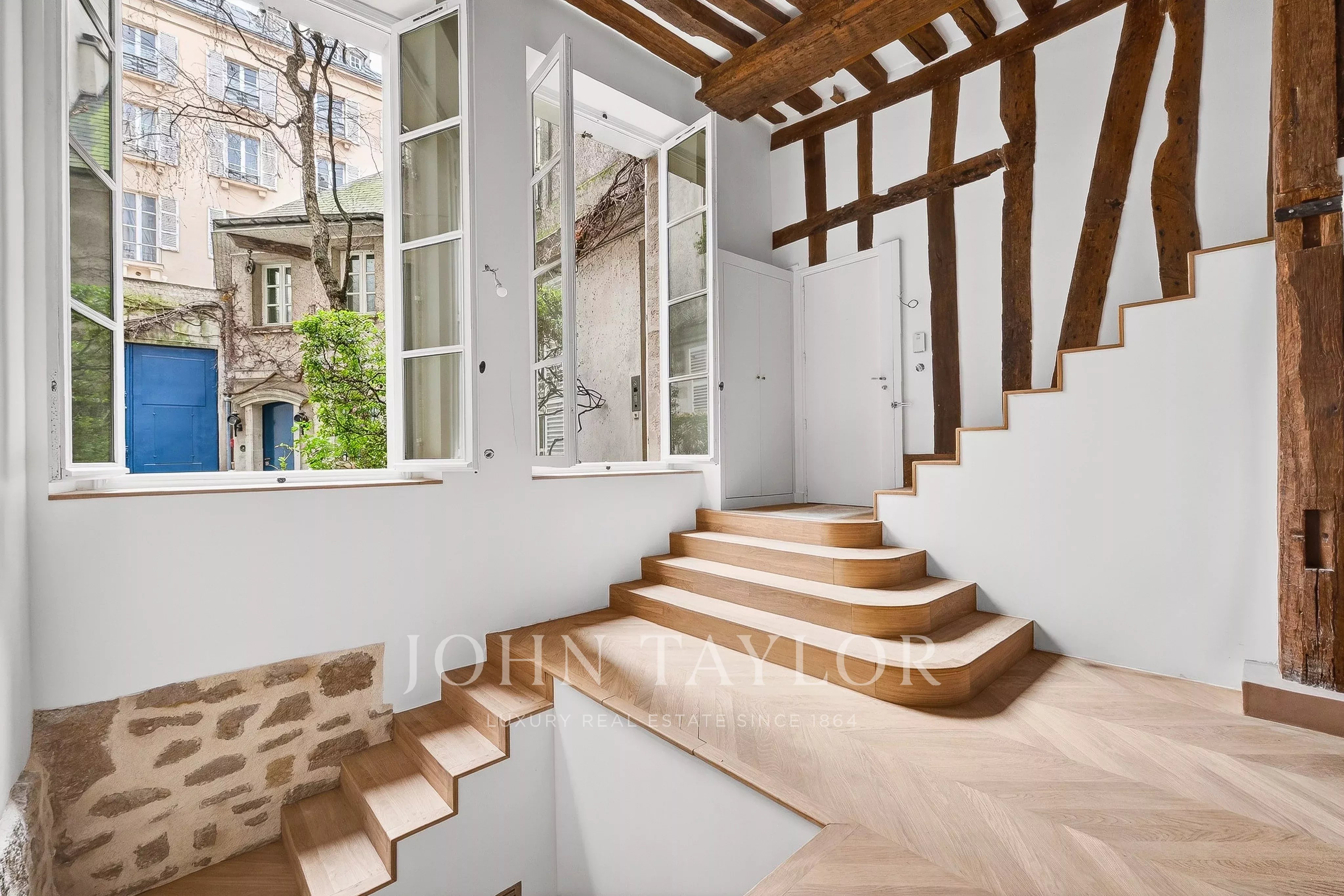 Fully air-conditioned and renovated to the highest standards with quality materials, the property preserves its historic character with exposed beams, a fireplace, and chevron (point de Hongrie) parquet flooring. It boasts exceptional volumes (4.20m ceiling height) and is arranged as follows: