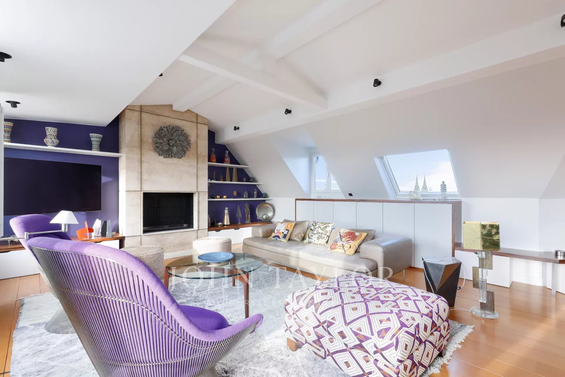 - large, open-plan living room with fireplace and high ceilings