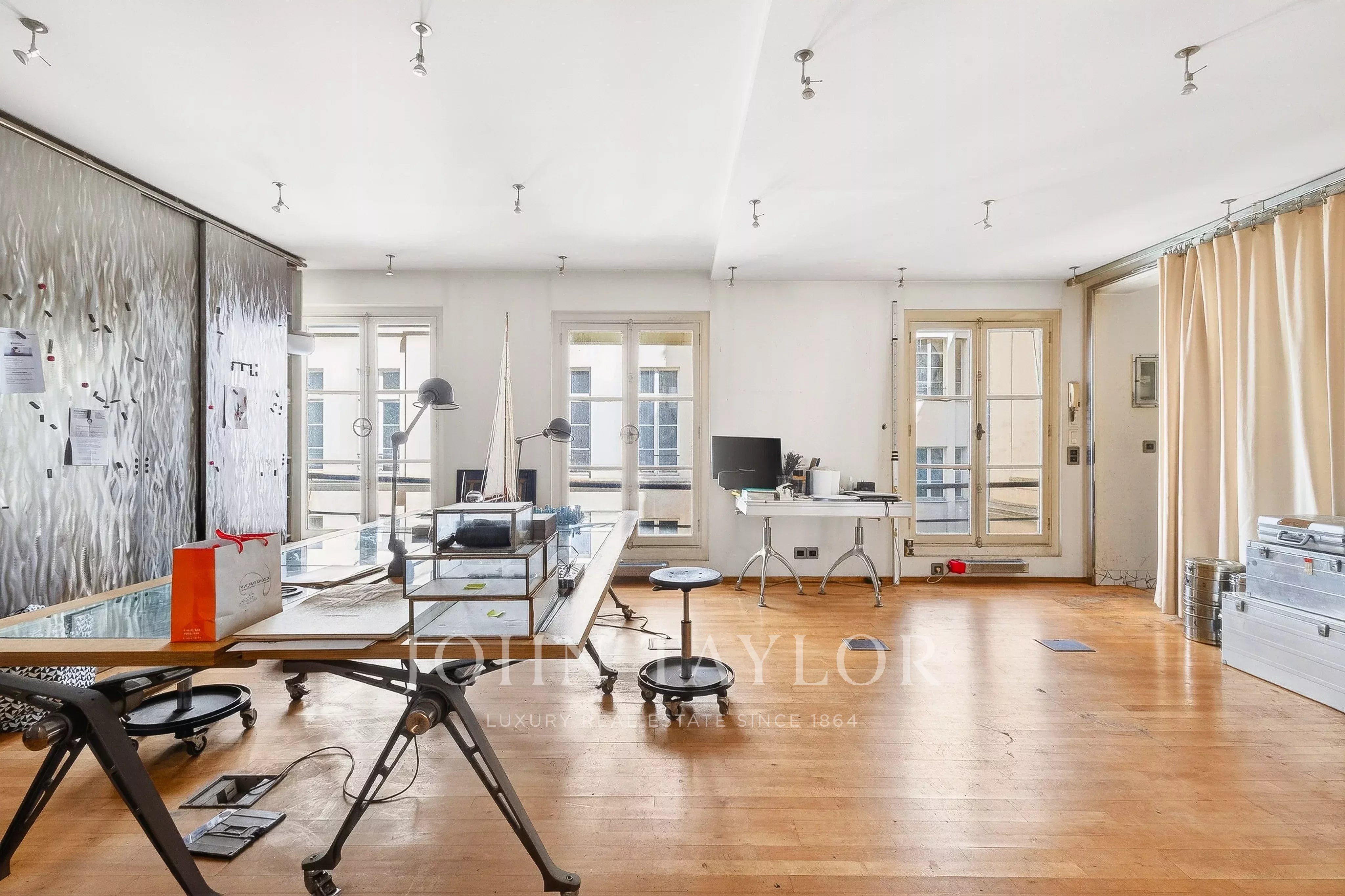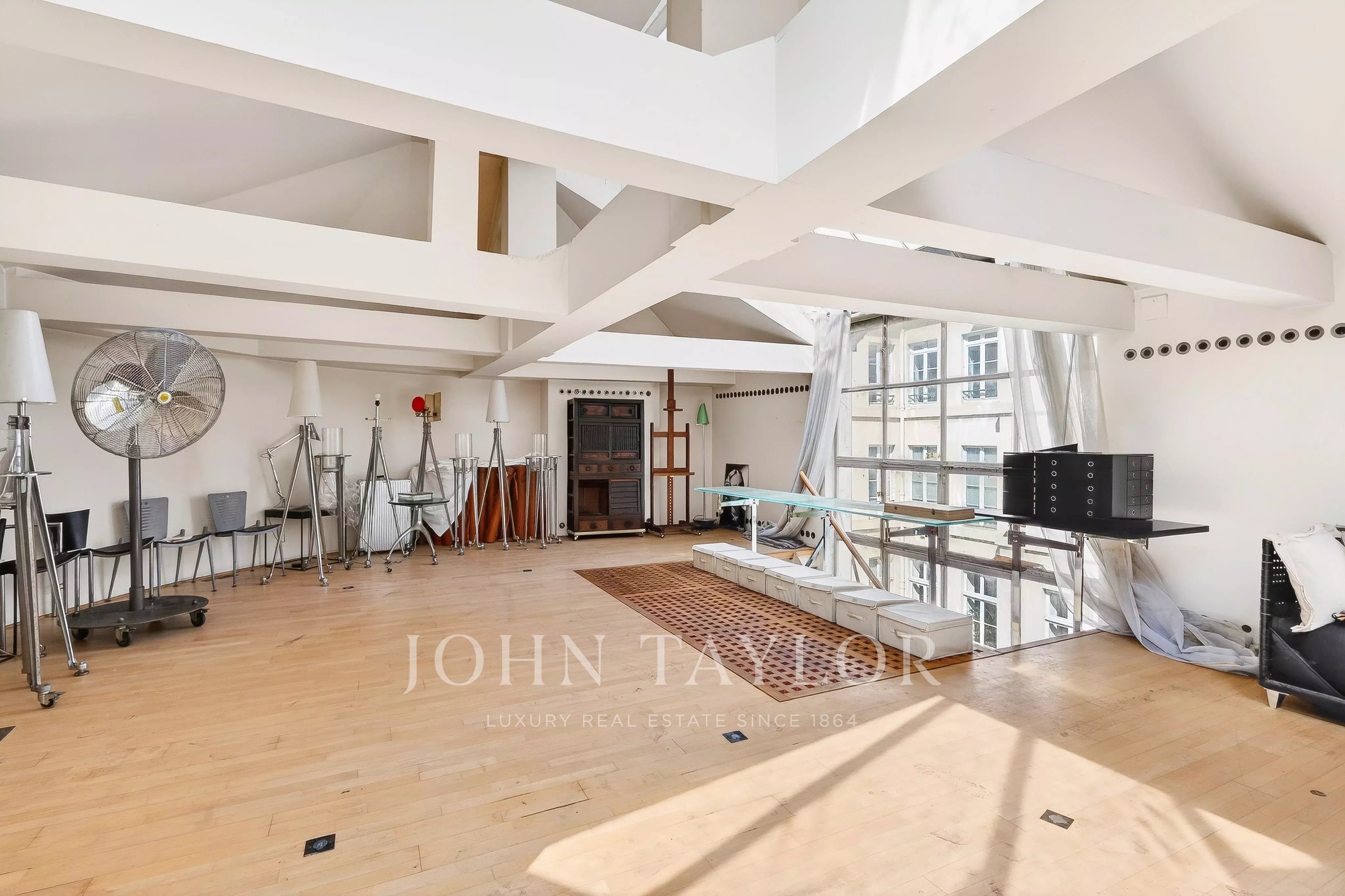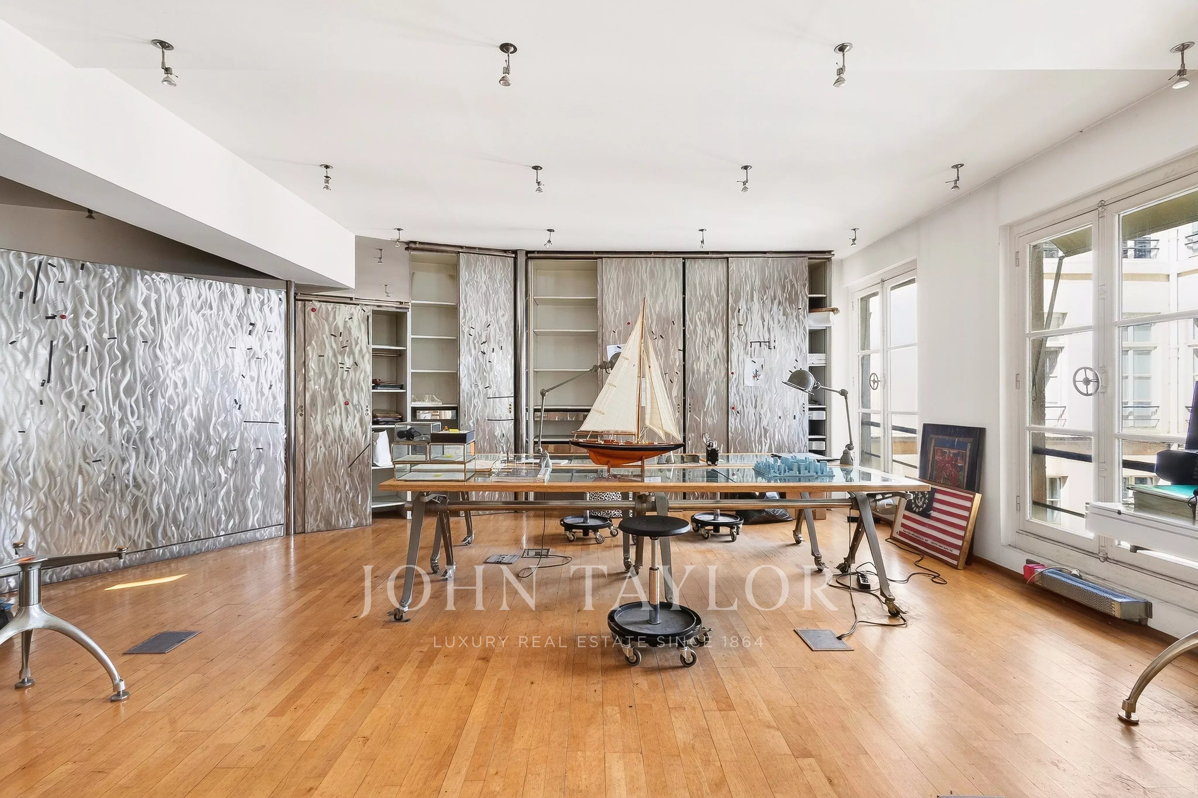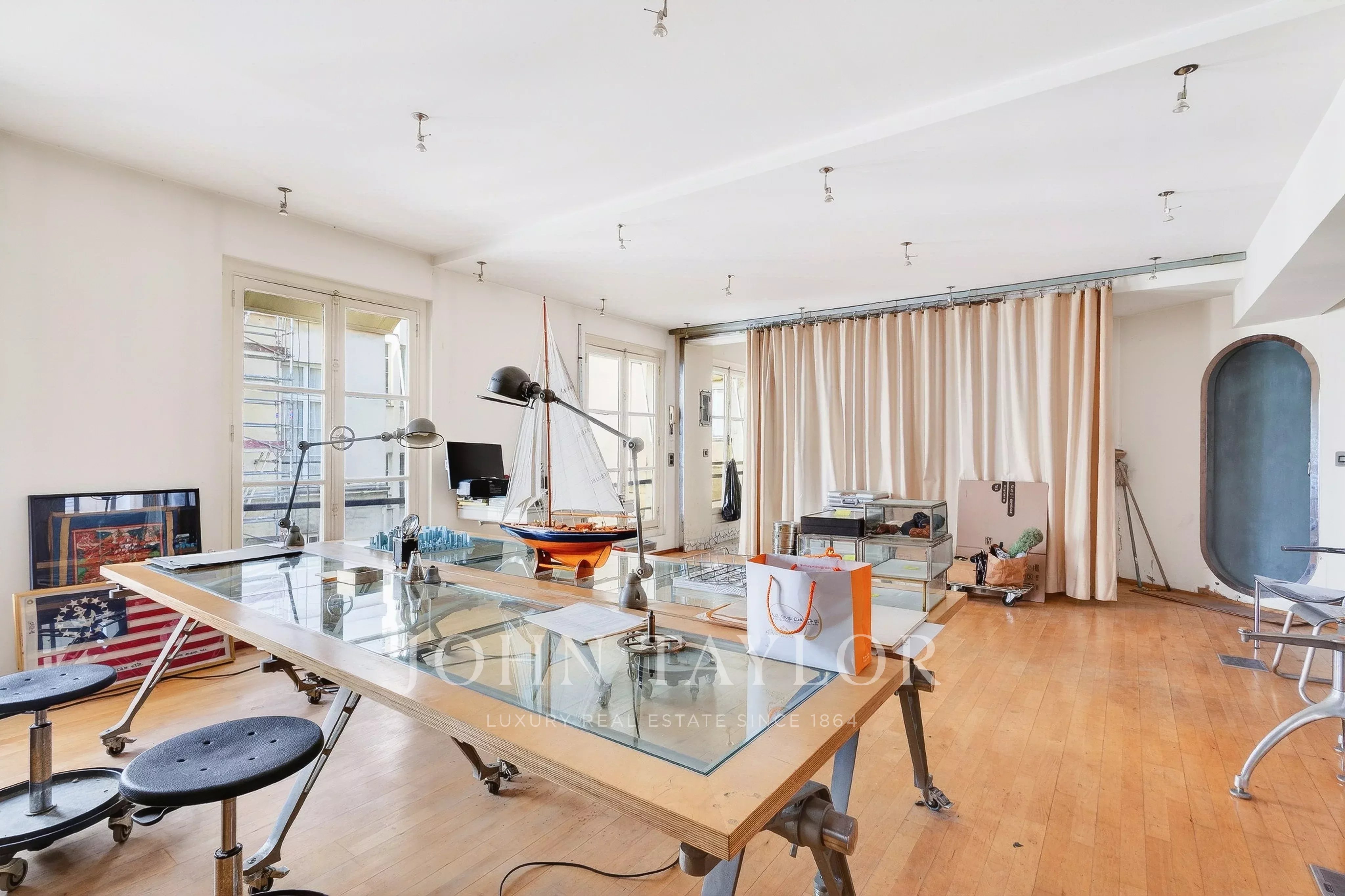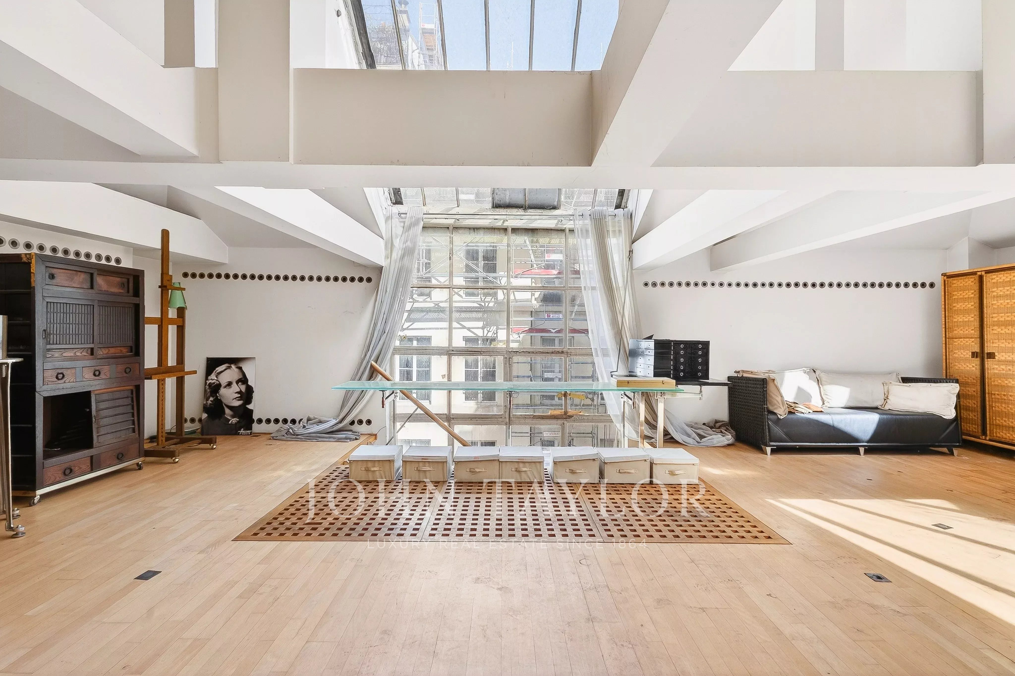 In the quiet of Quai Voltaire, opposite the Louvre, this 202 m² artist’s studio captivates with its history and unique volumes.