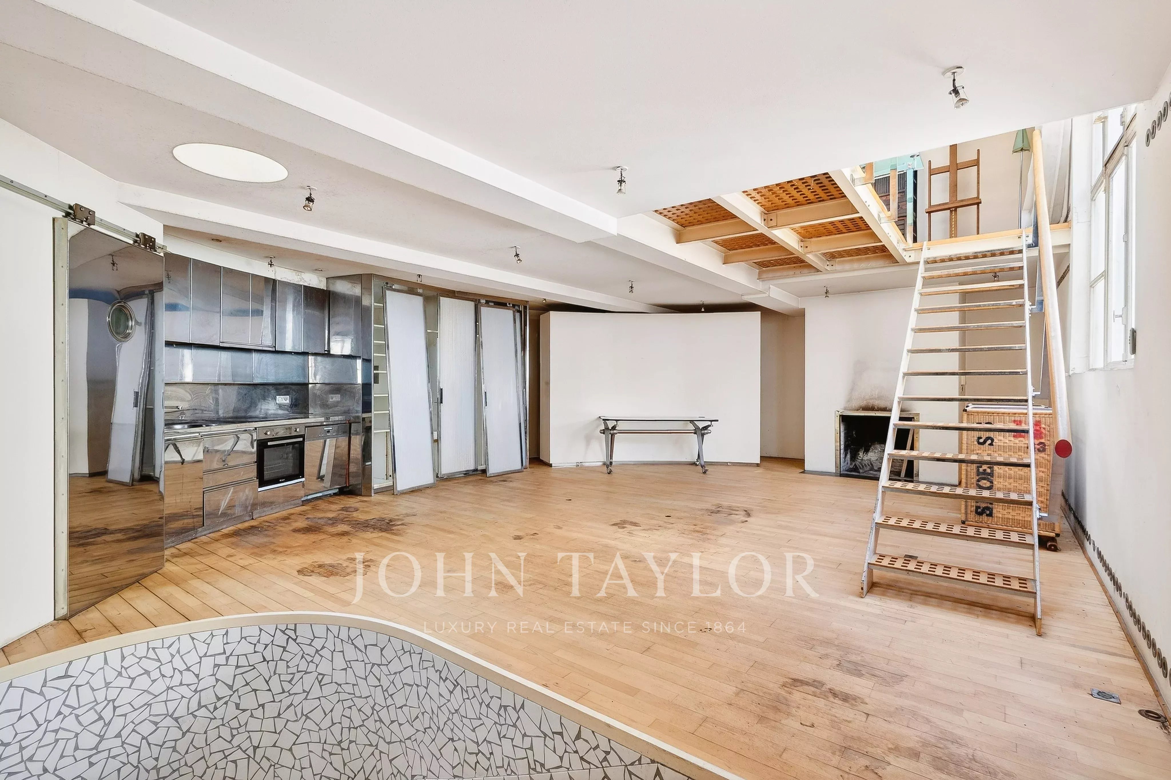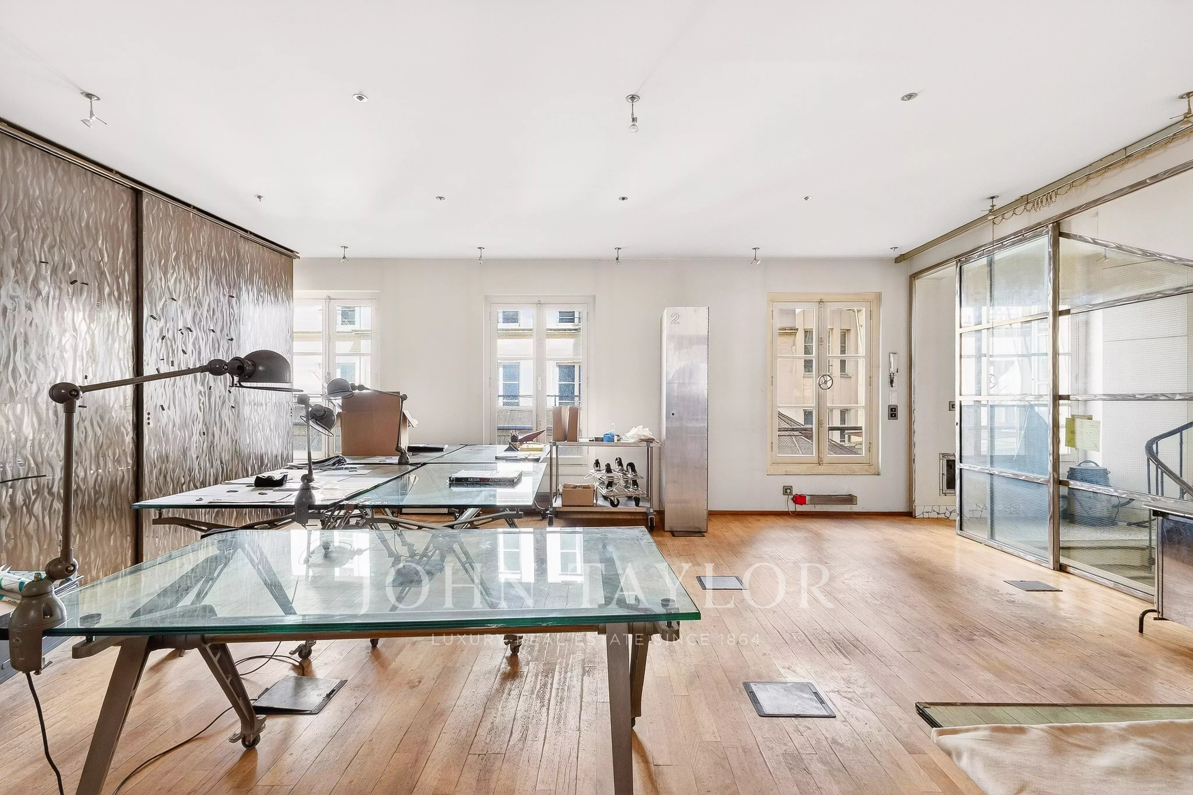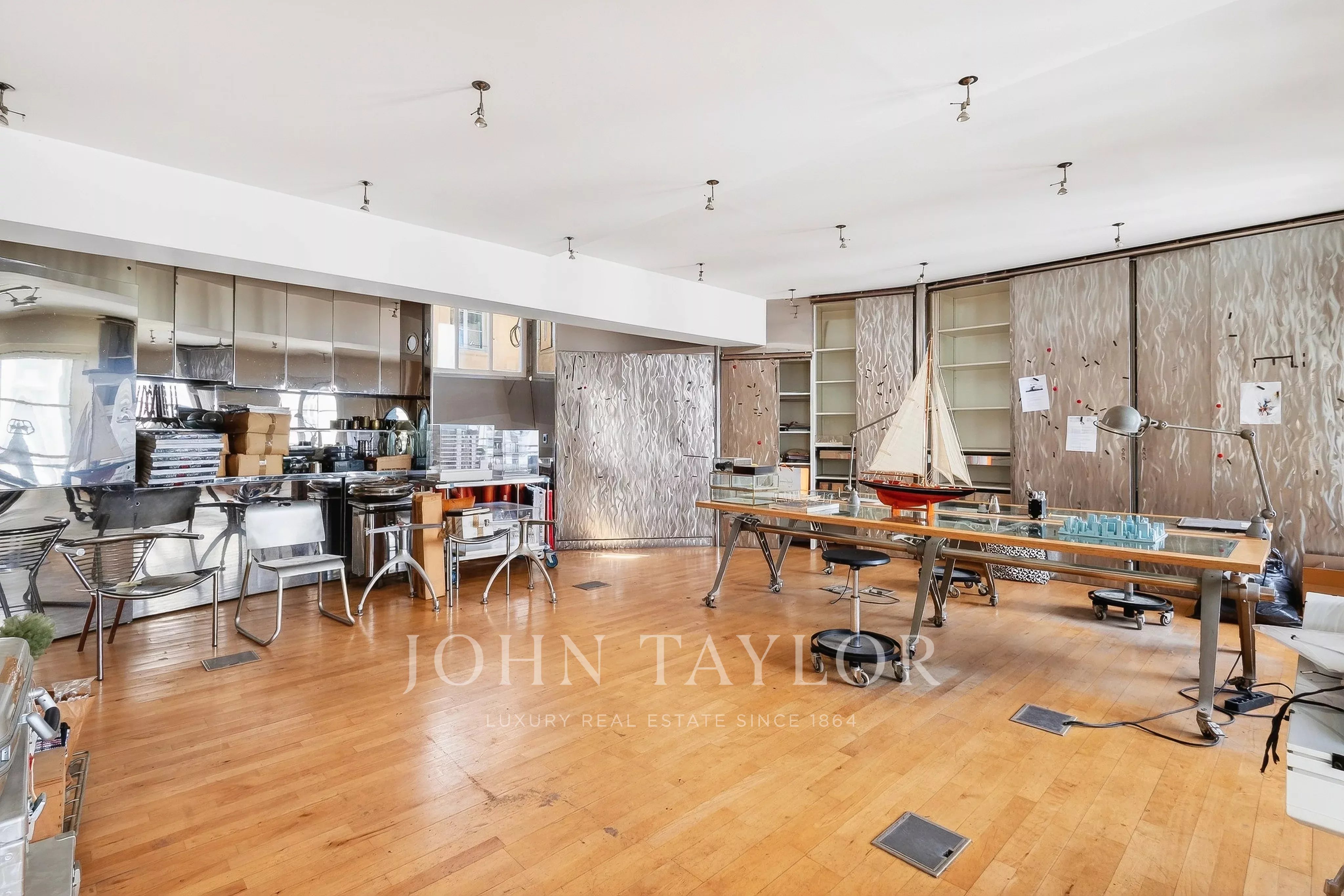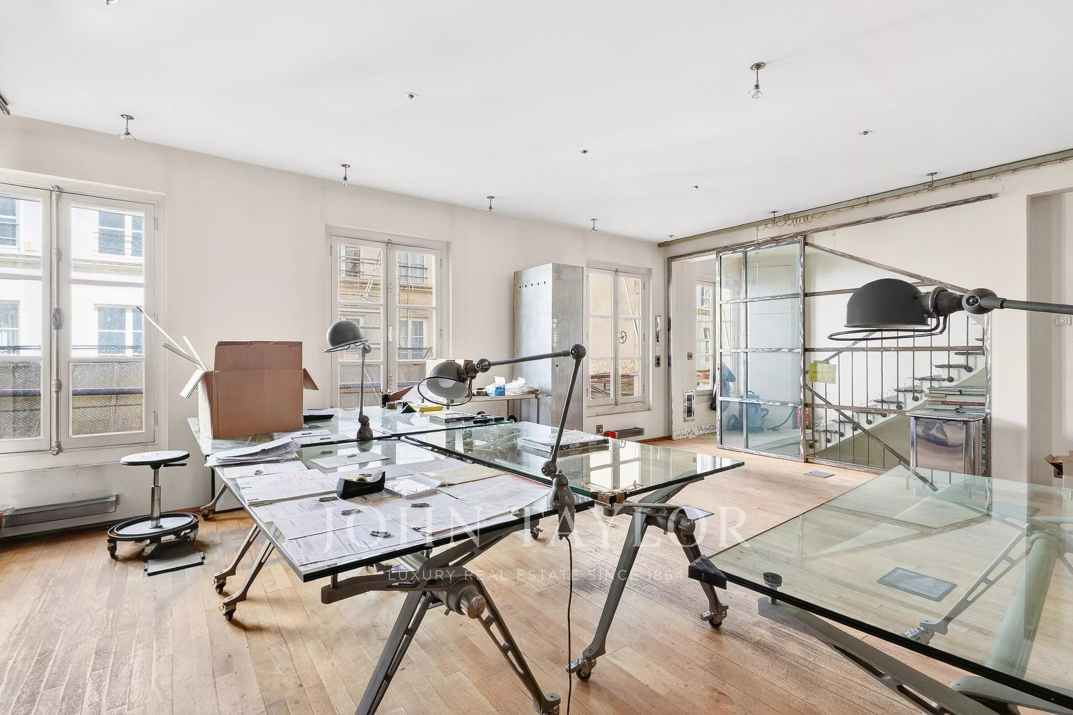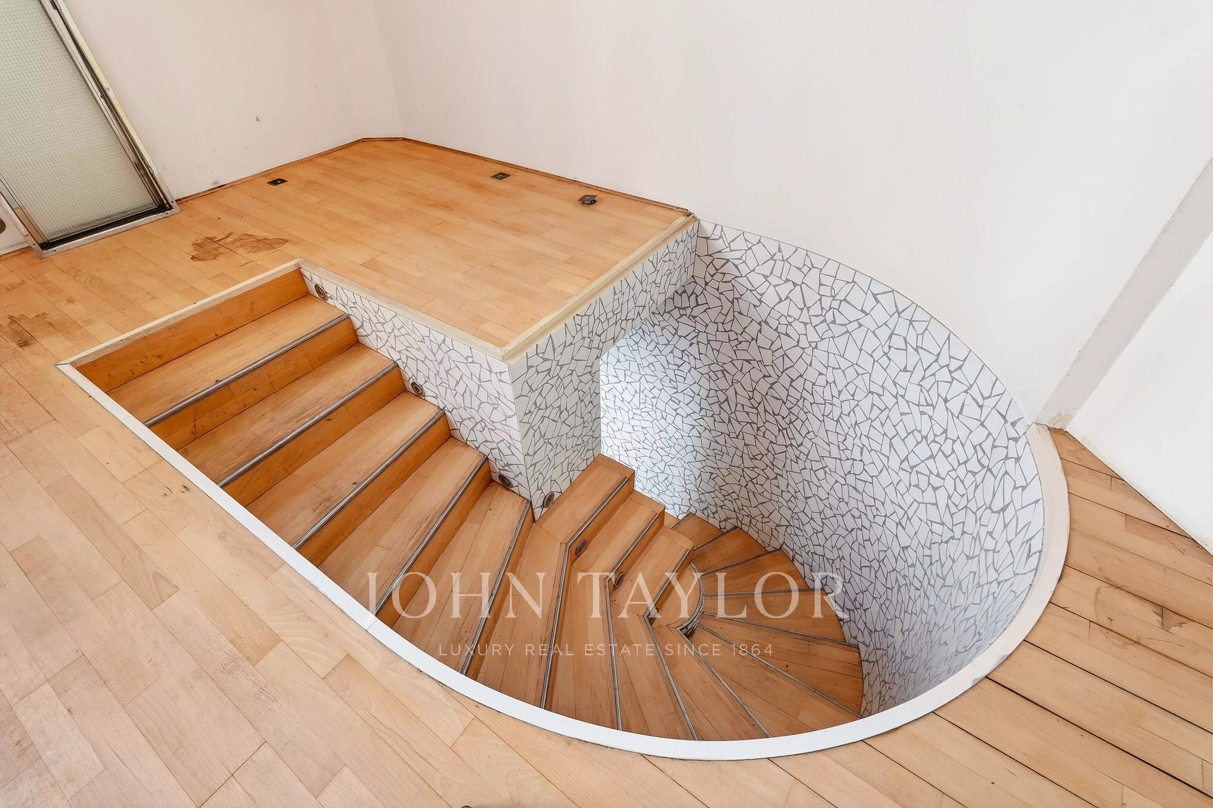 On the quiet Quai Voltaire, facing the Louvre Museum, this artist’s studio of approximately 202 m², spread over four levels, captivates with its history and unique volumes.