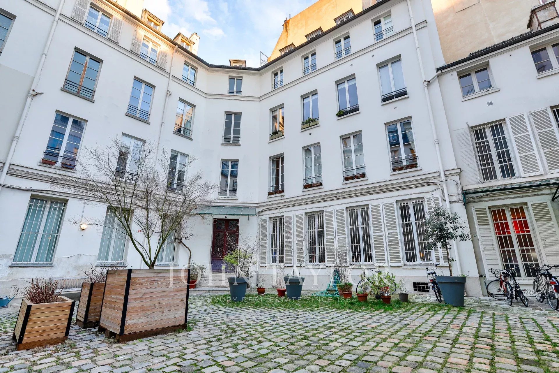 On the second floor (no lift) of a 19th-century condominium benefiting from a large paved courtyard, very attractive 130m² North-South through-plan reception apartment.