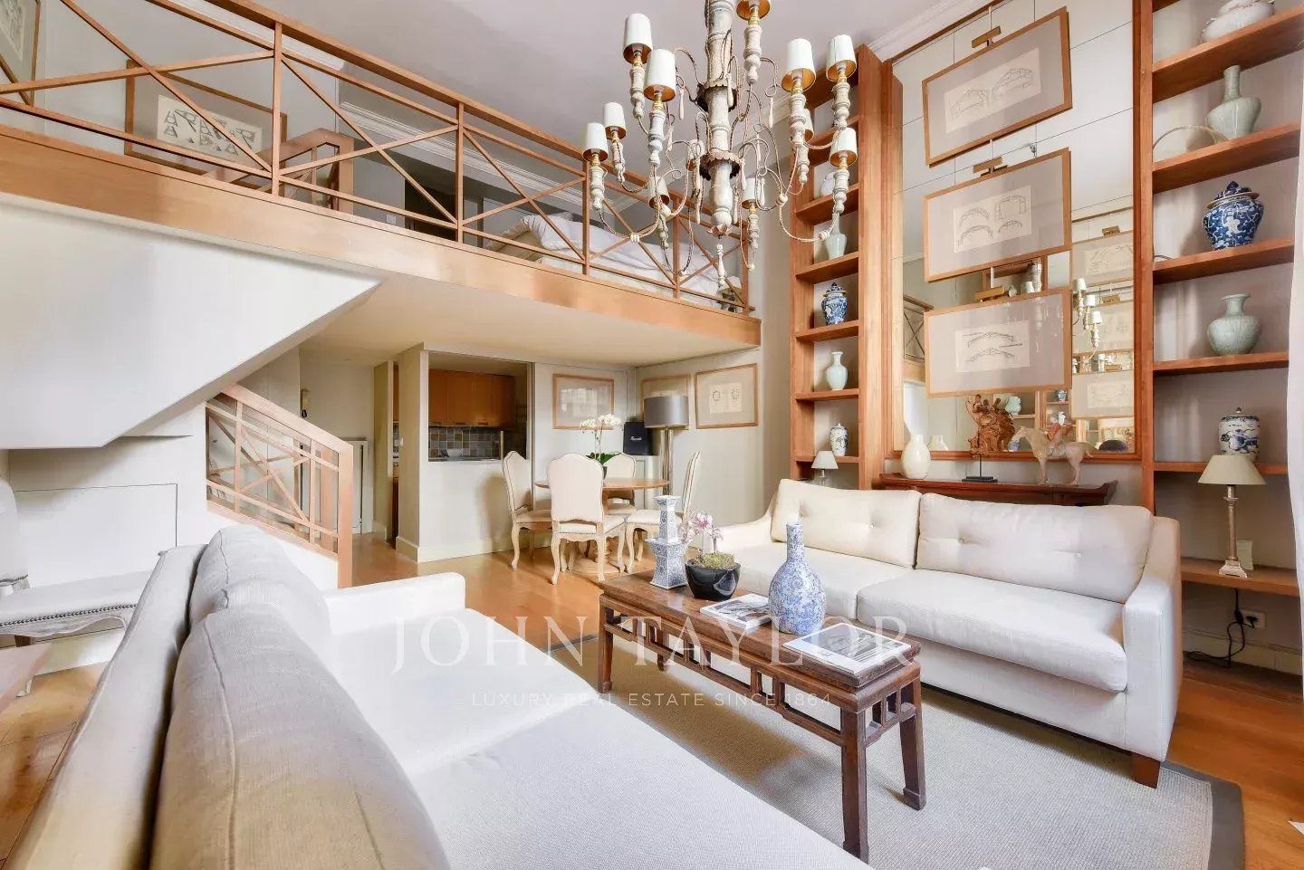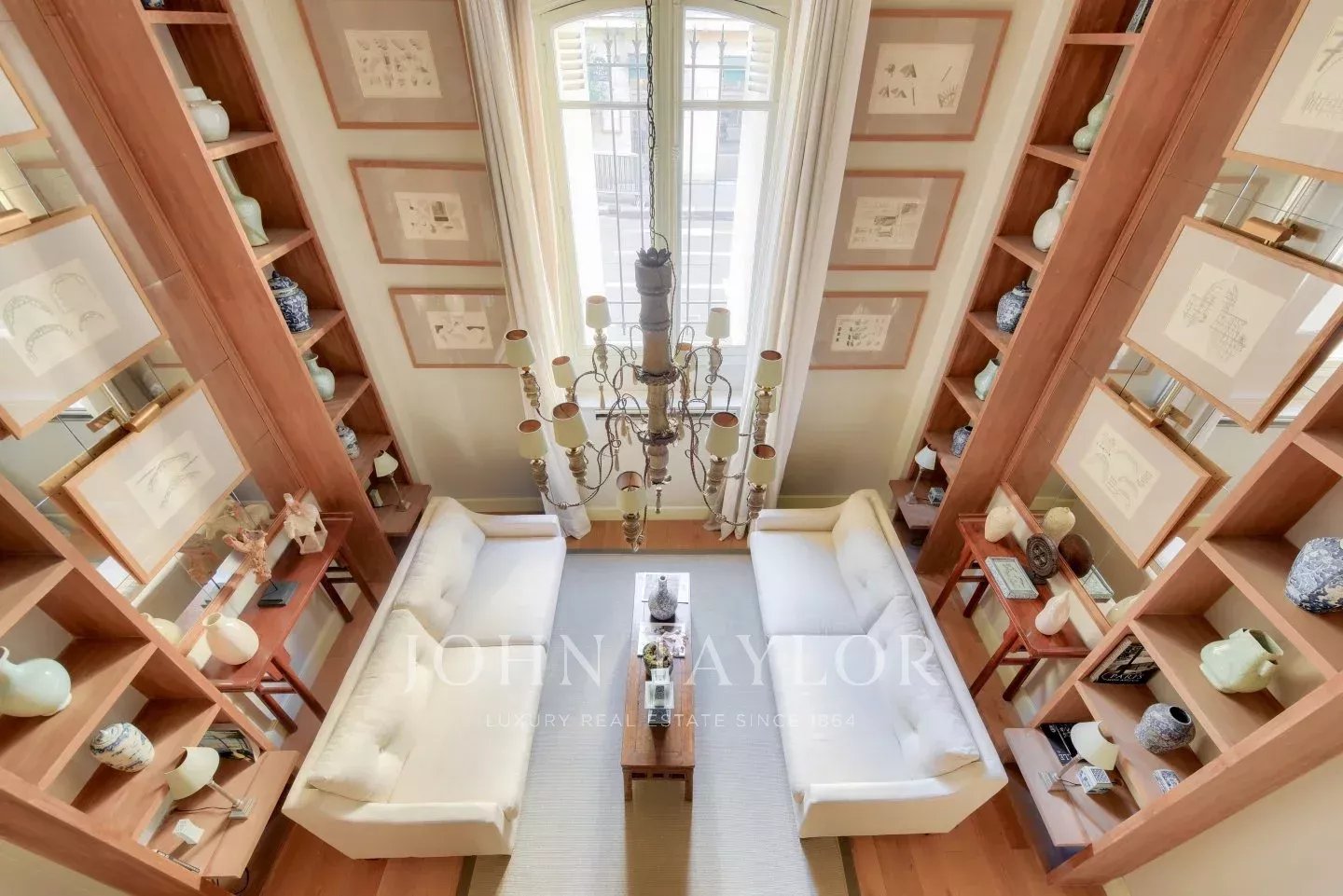 - a spacious living room with approximately 4 meters high ceilings, adorned with large illuminated bookshelves,