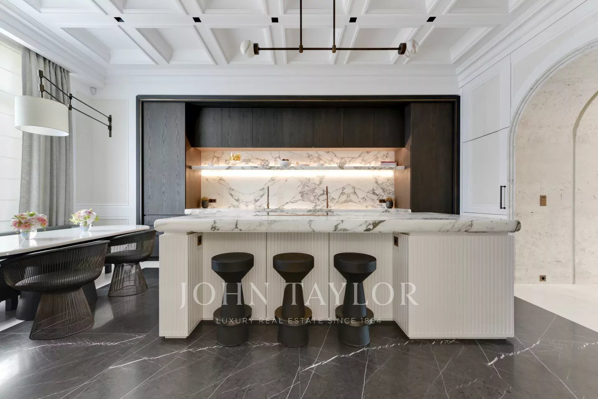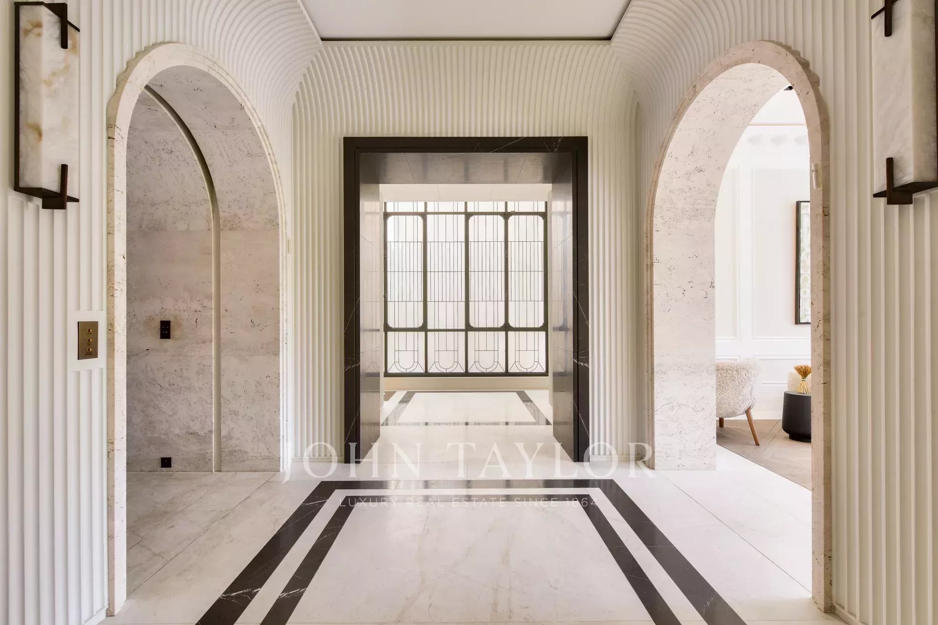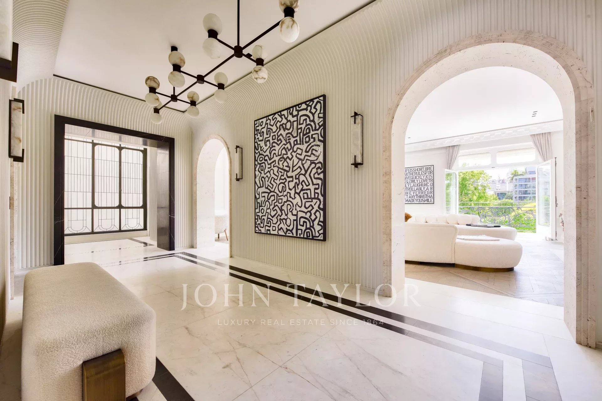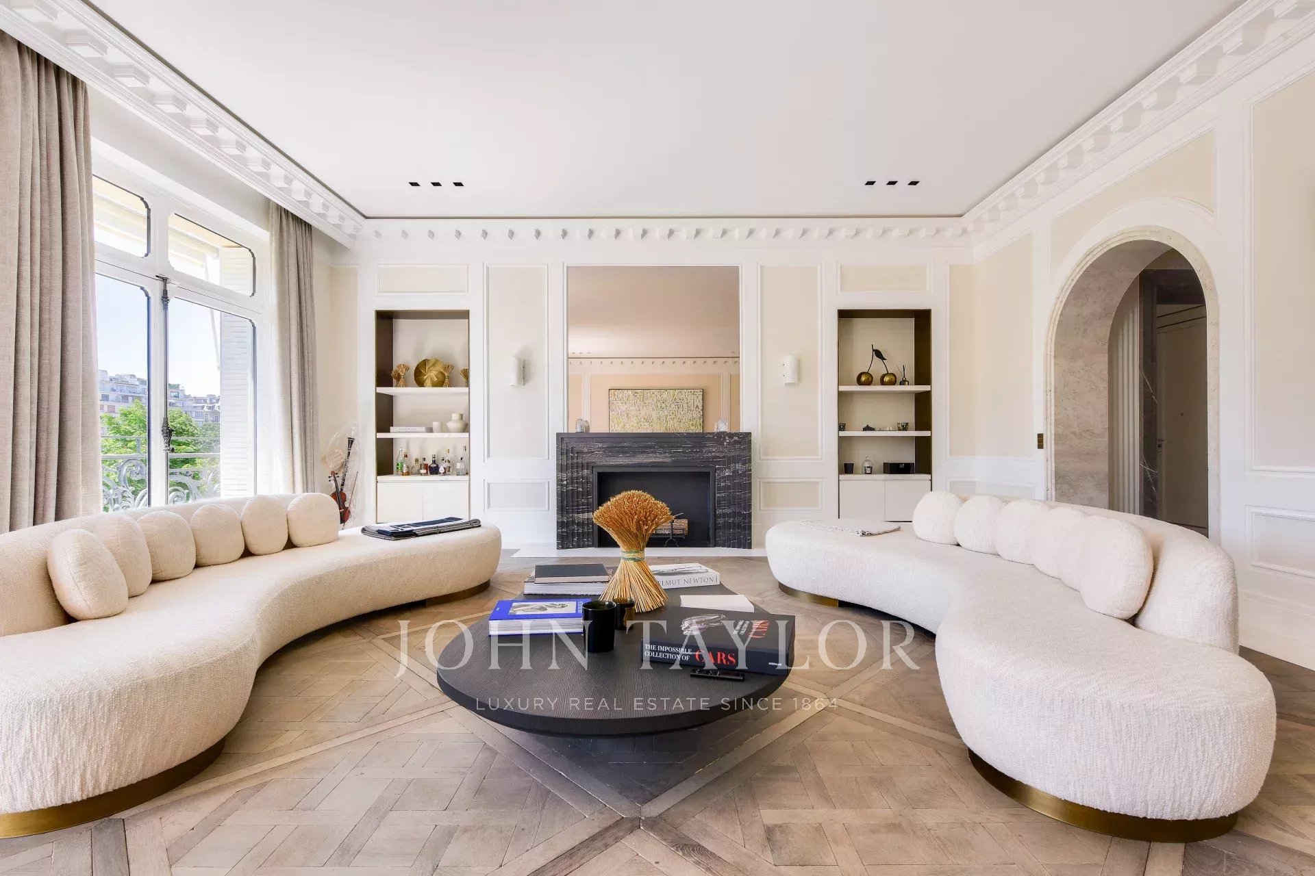 You'll be impressed by the blend of Versailles parquet flooring, travertine arches and the notched detail of the marble fireplace.