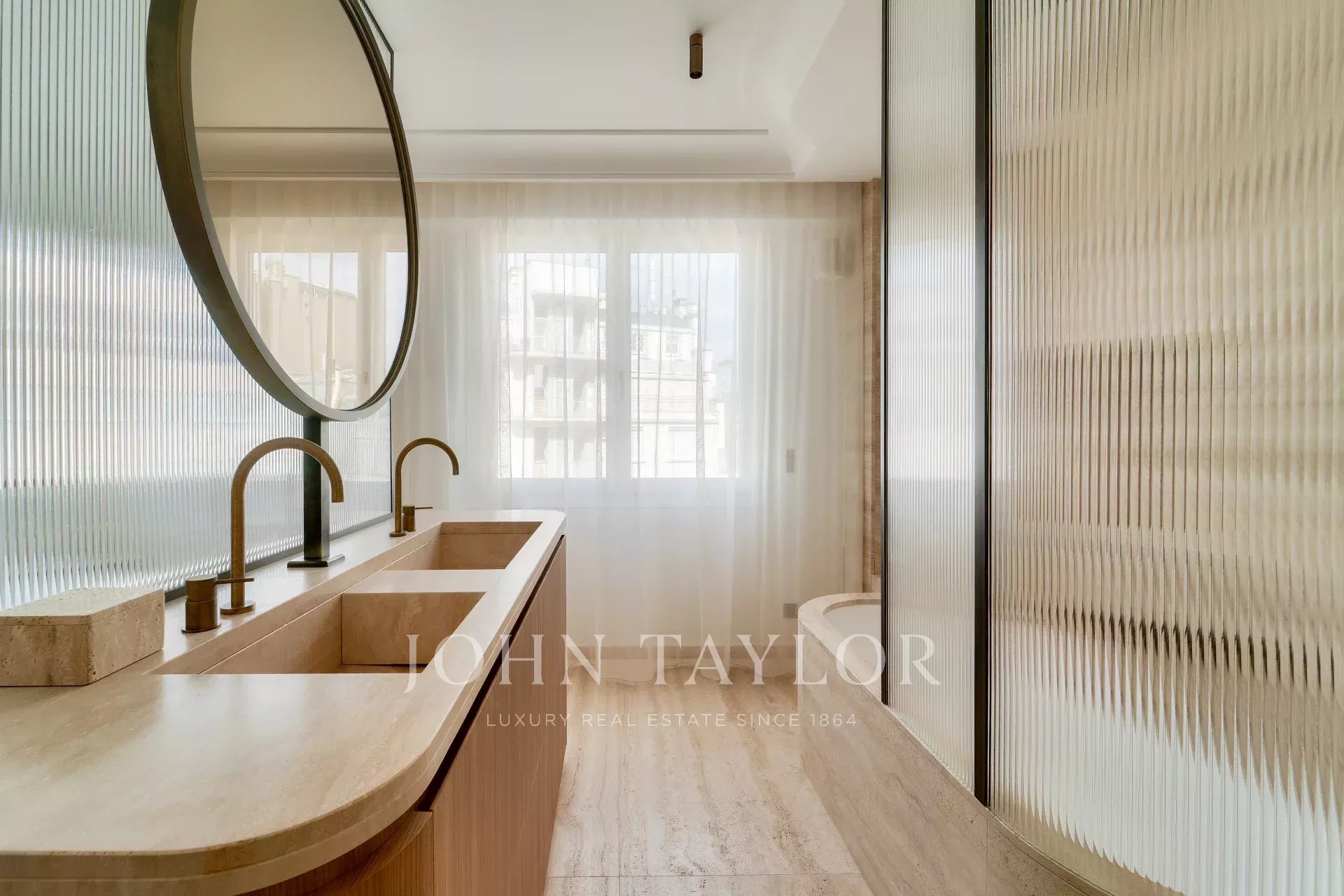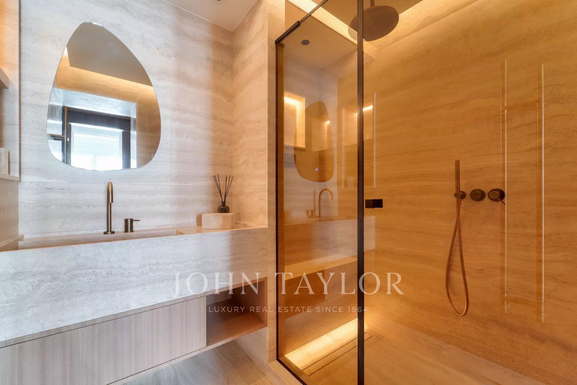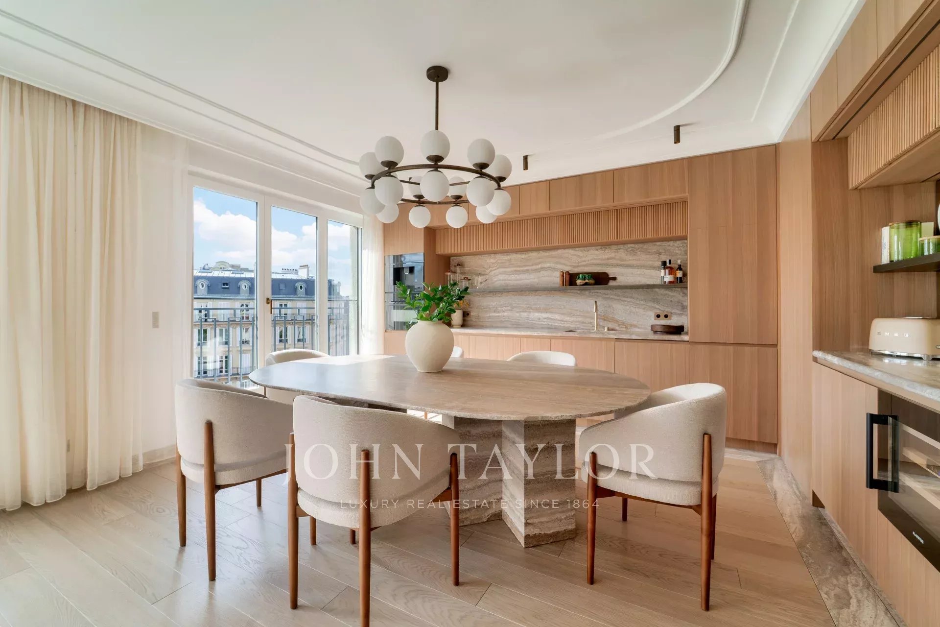 The refined décor, enhanced by exceptional materials—including travertine, solid oak parquet, marble, and Meljac switches—gives the property its unique character and sophisticated ambiance. All windows have been replaced, and the shutters are automated.