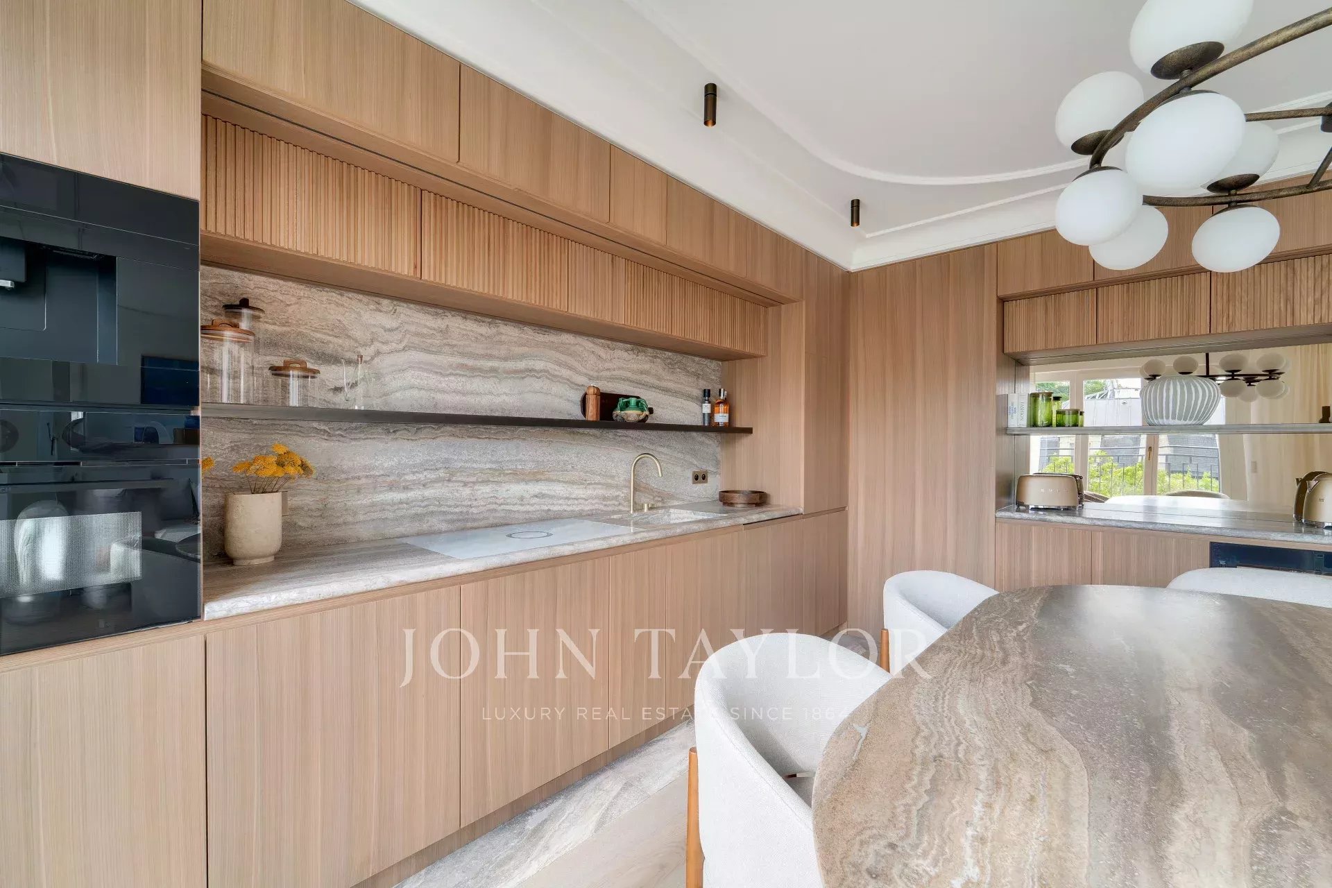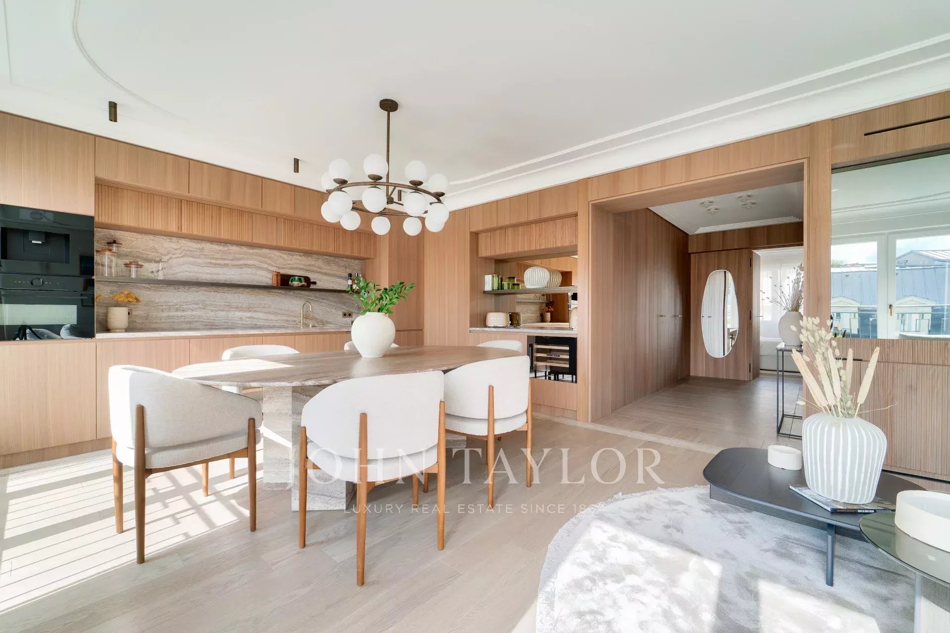 - A bright, beautifully appointed living space with large windows, comprising a TV lounge (featuring a hidden screen concealed behind a mirror), a welcoming dining area perfect for entertaining, and a high-end open-plan kitchen with generous work surfaces and premium appliances.