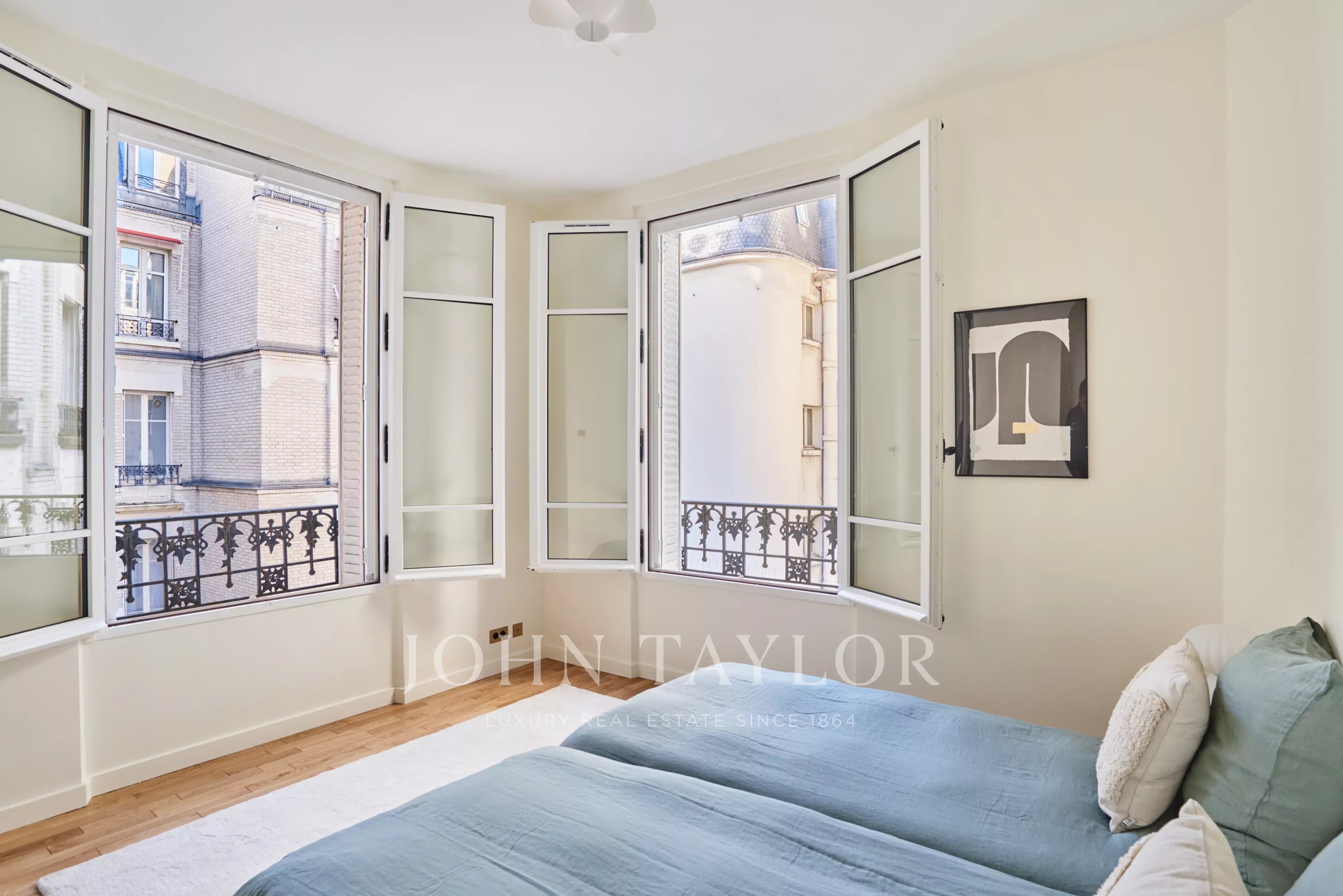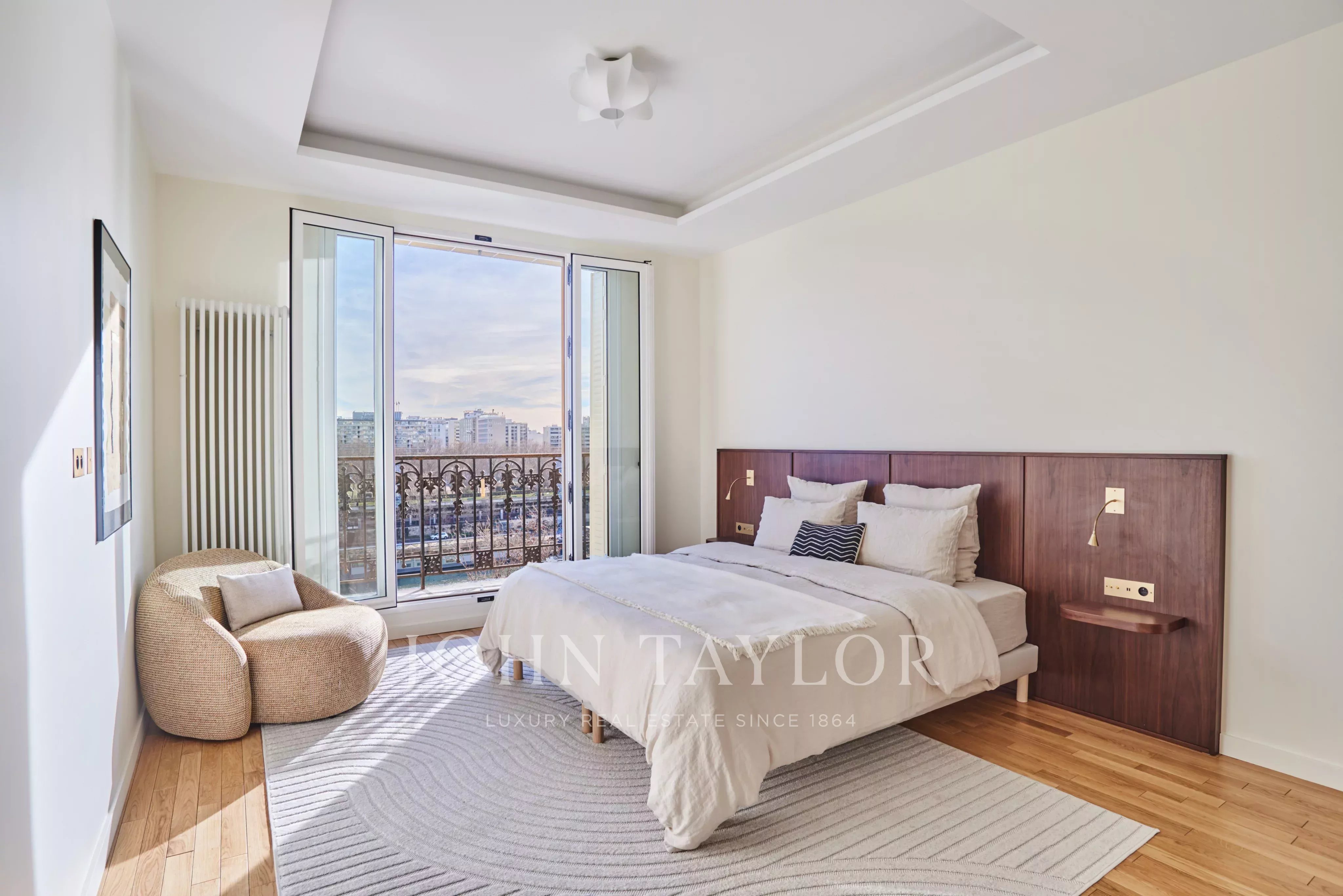 A spacious master suite with balcony, also facing the river and Eiffel Tower, with built-in dressing room, bathroom with double shower and Japanese toilet,
