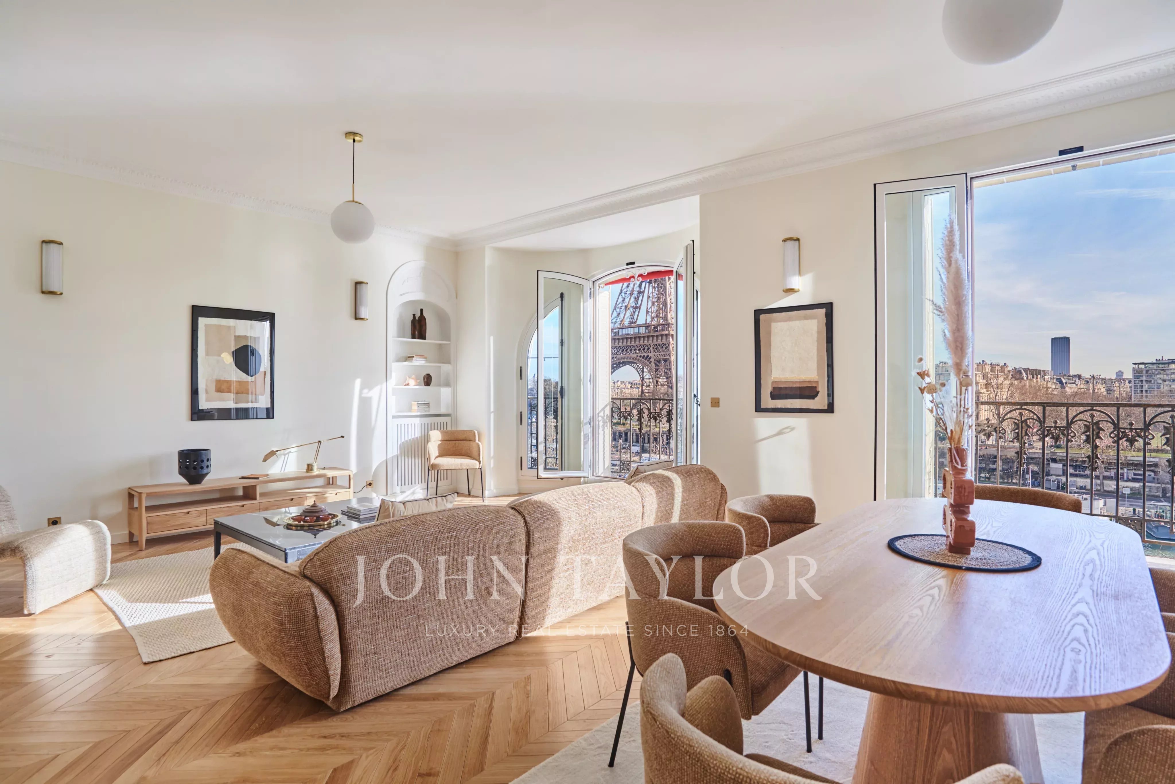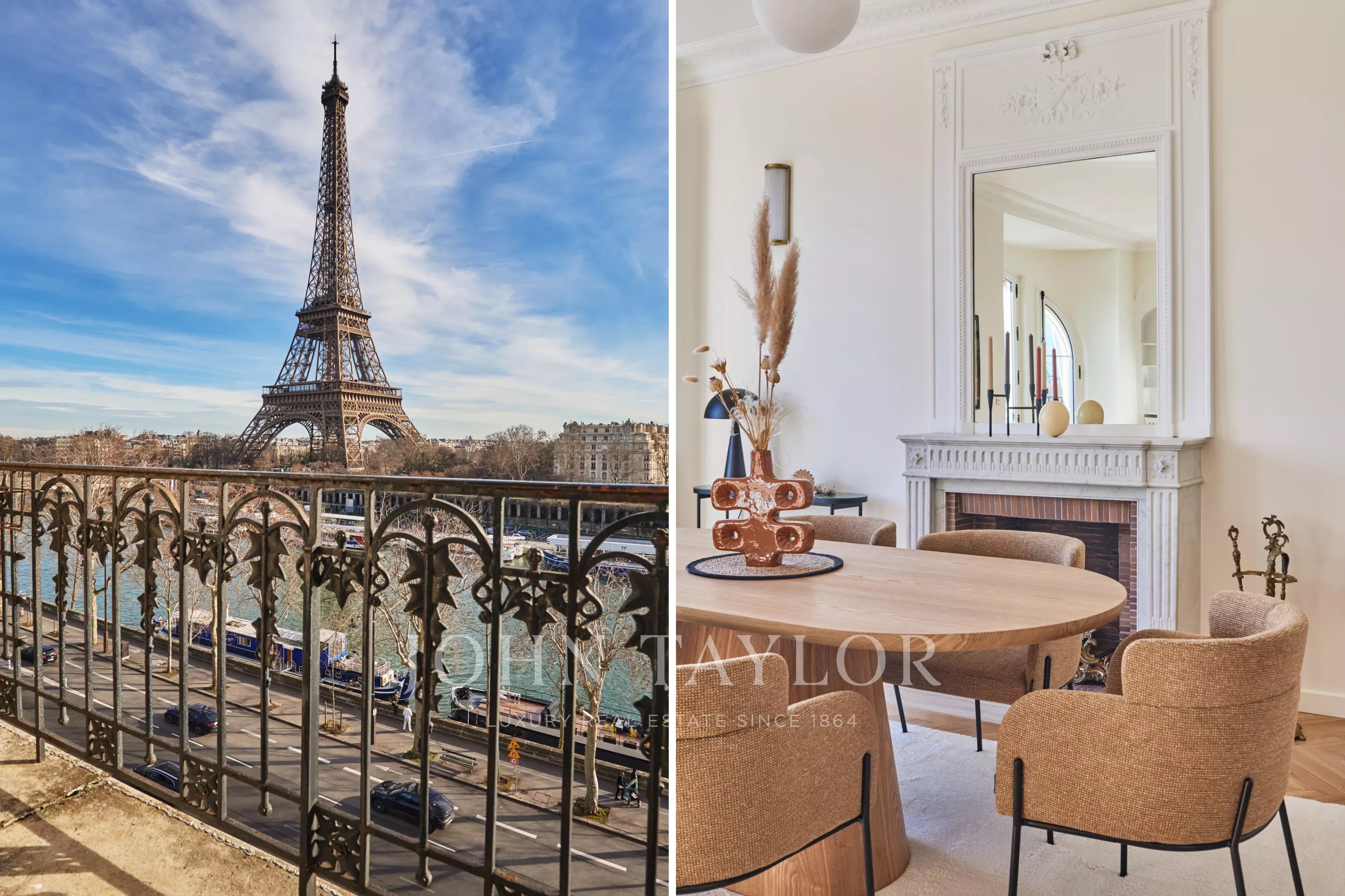 A large living/dining room facing the river Seine and the Eiffel Tower,