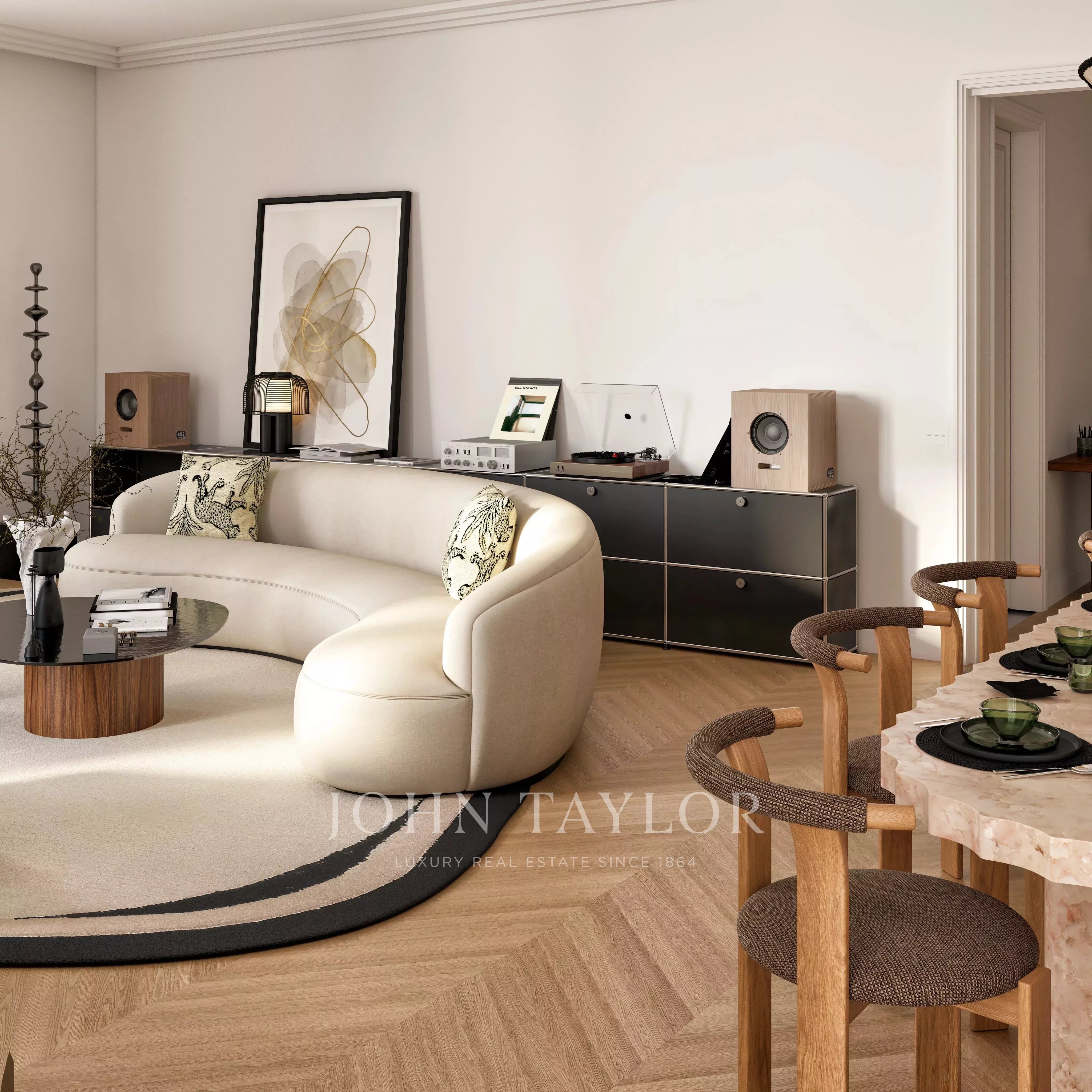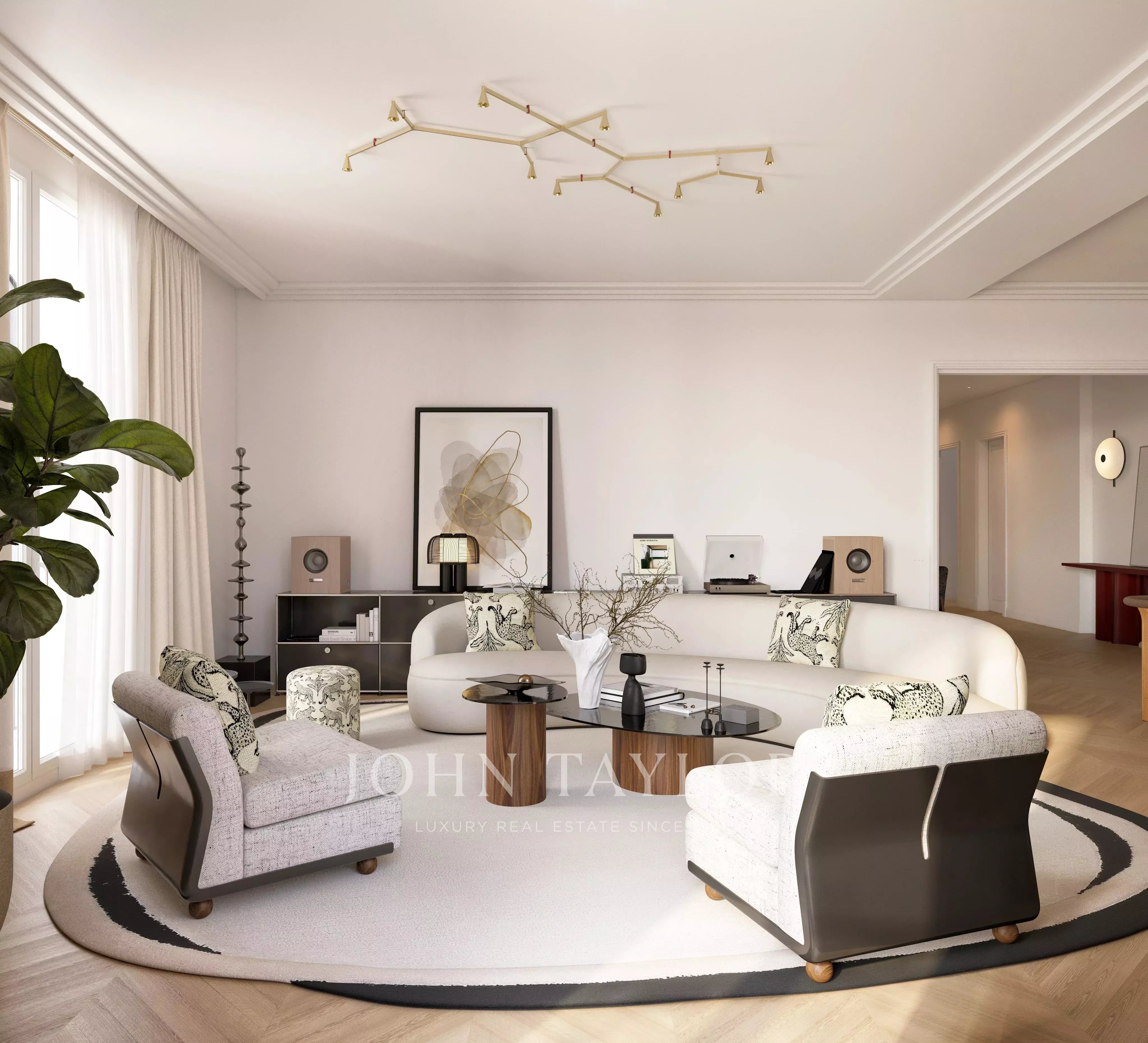 Air-conditionned, benefiting from a "Grand Luxe" renovation, a corner living room with double exposure South-East/North-East, and generous volumes (3.2m ceiling height), it is laid out as follows: