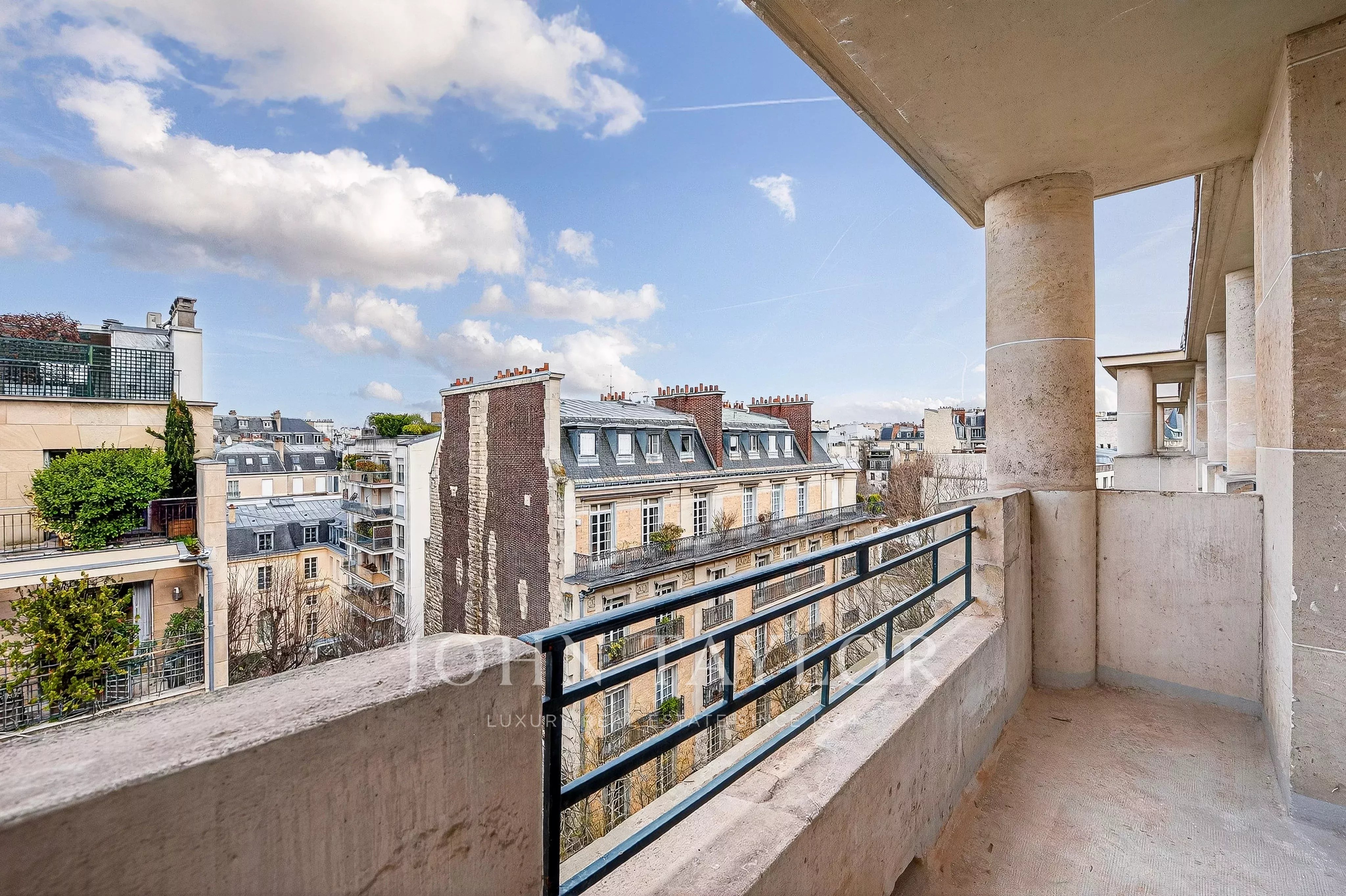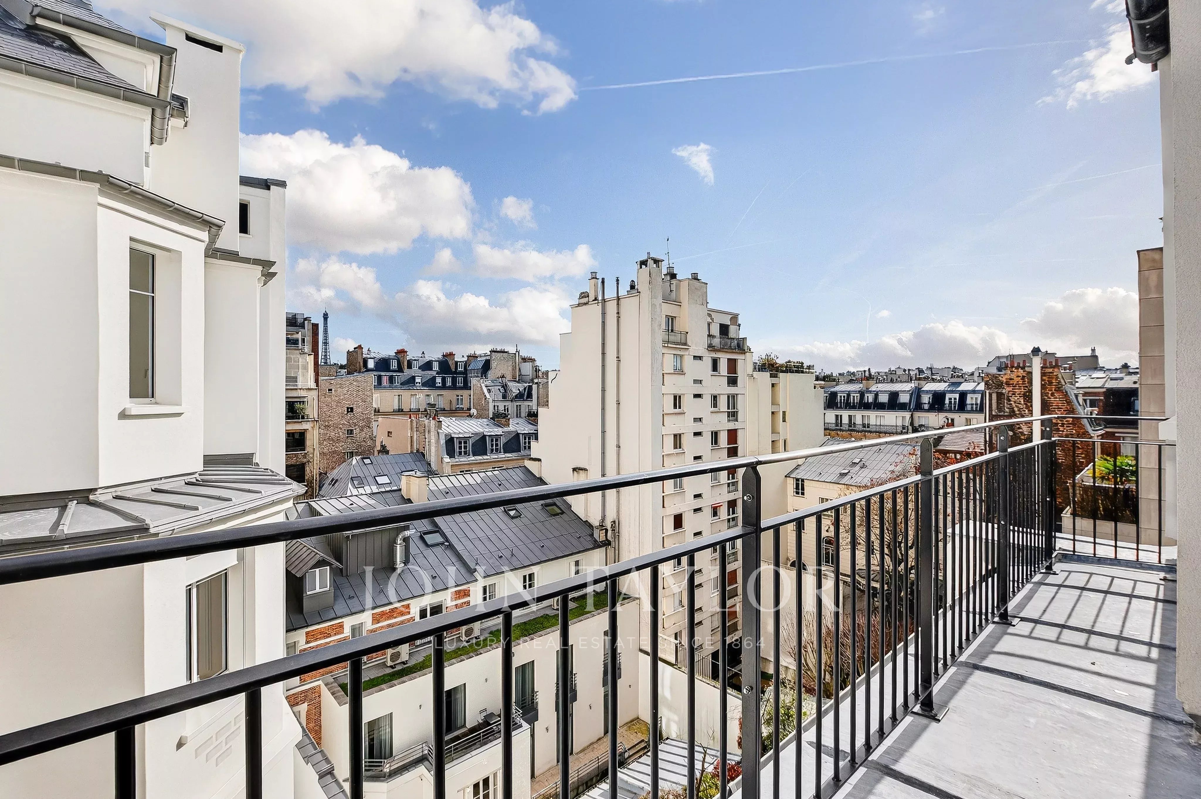 The property features several balconies totaling 17.2 sqm and offers a stunning view of the Eiffel Tower from the living room.