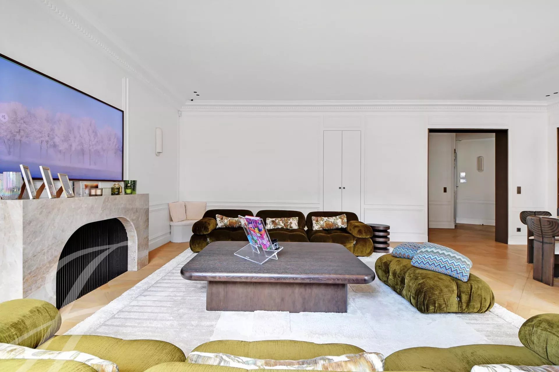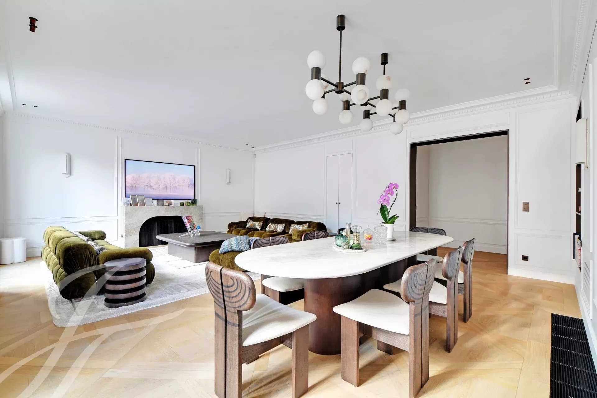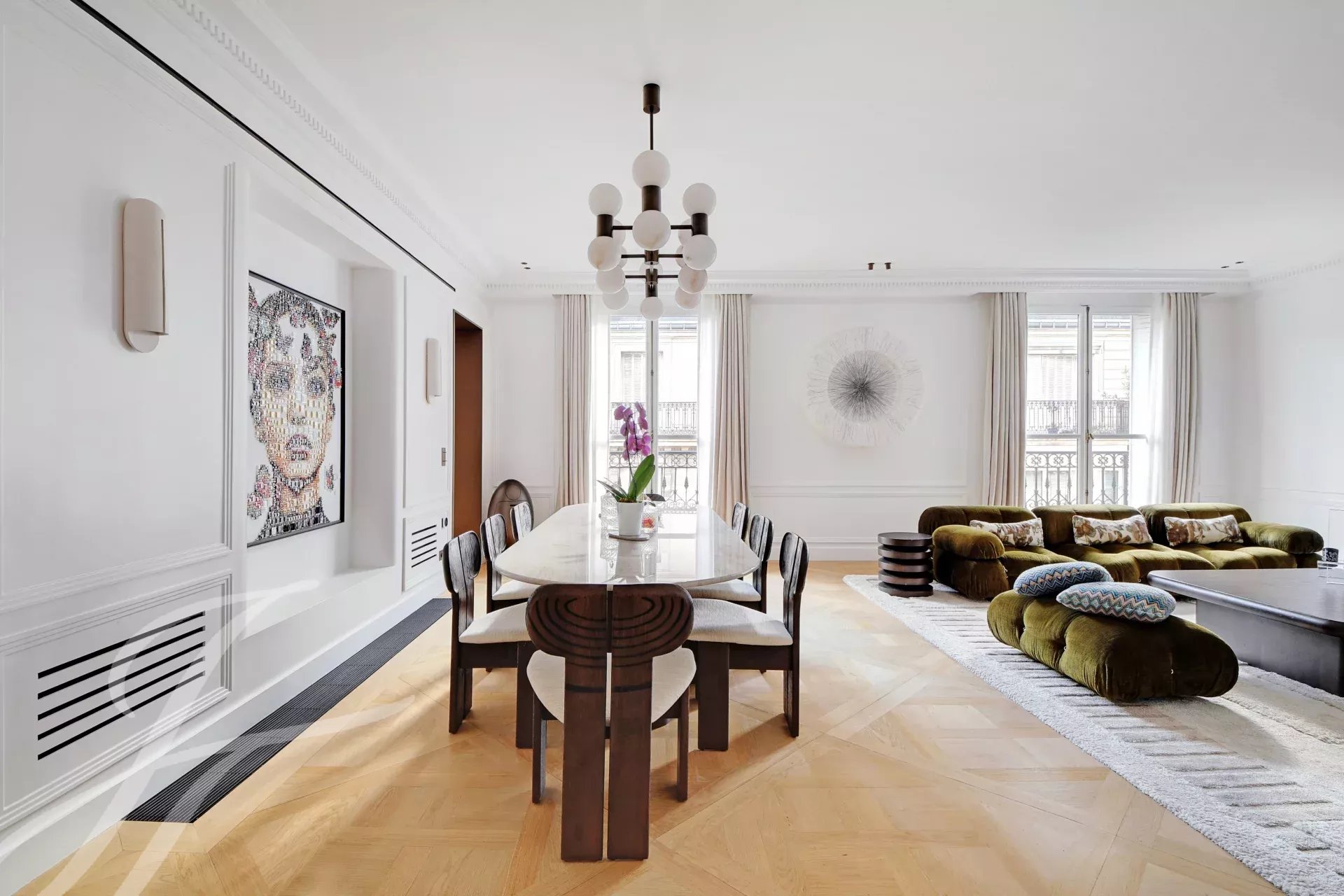 Period charm throughout — herringbone parquet floors, ornate moldings, high ceilings — combined with generous volumes and absolute tranquillity.
