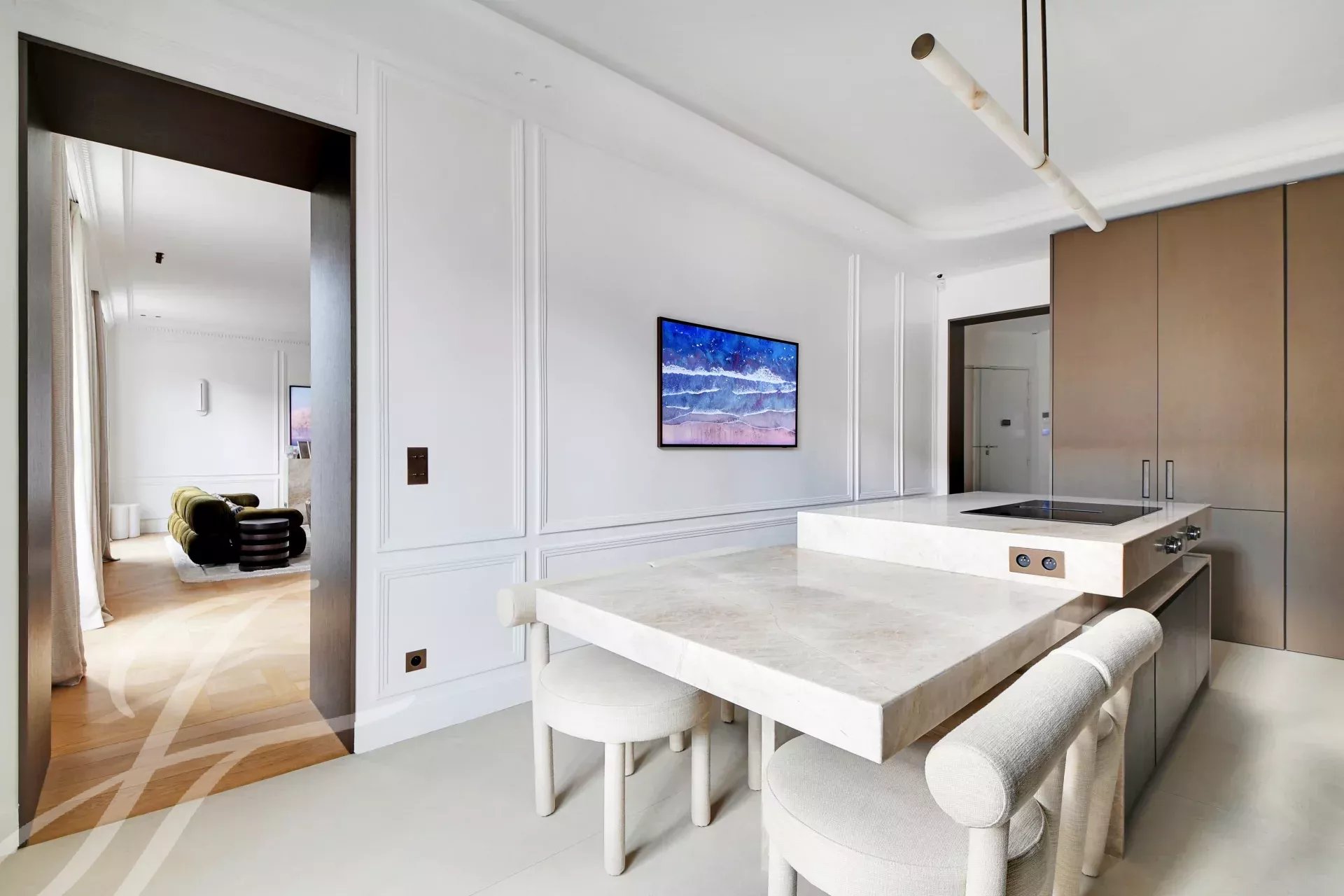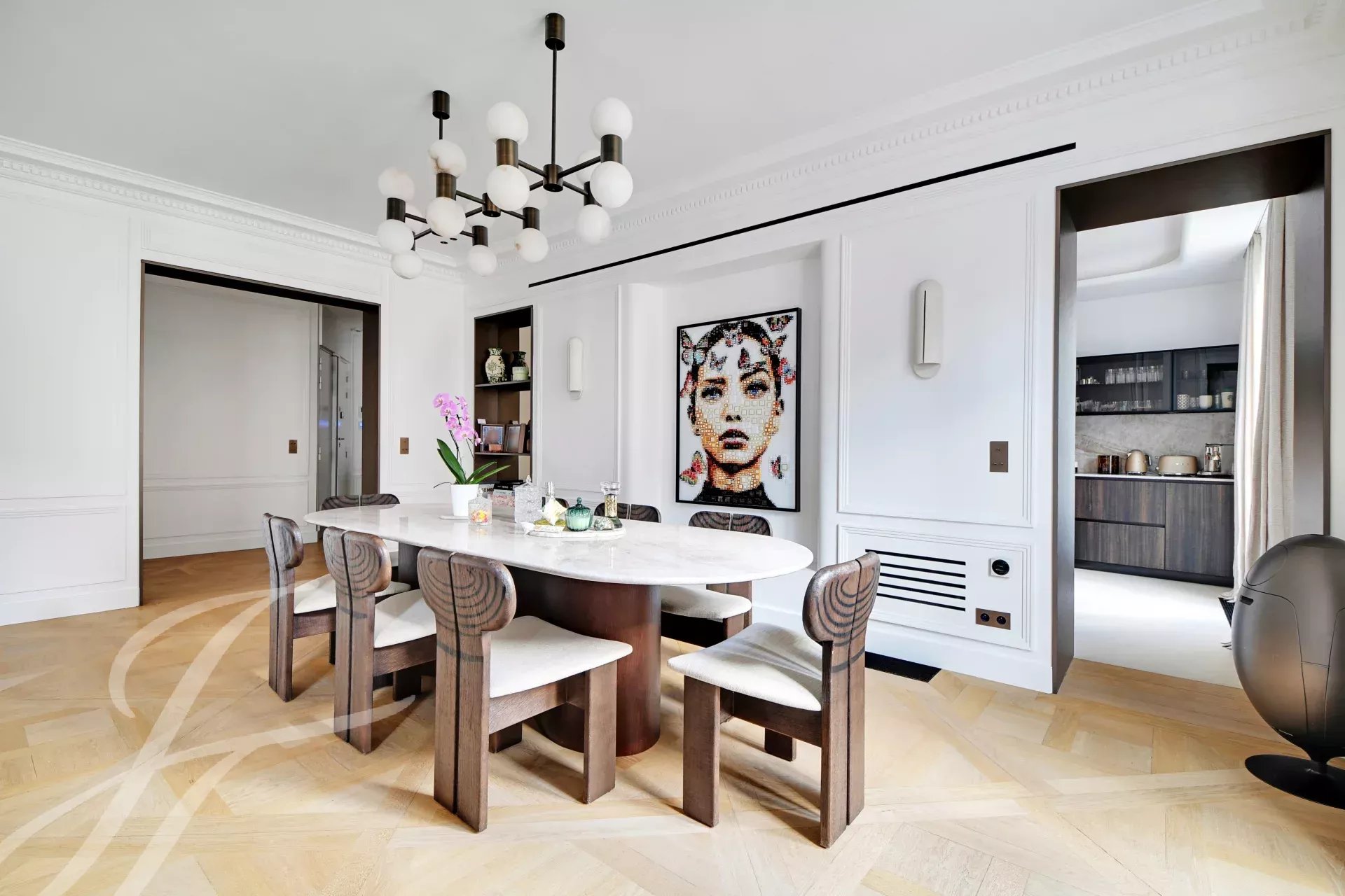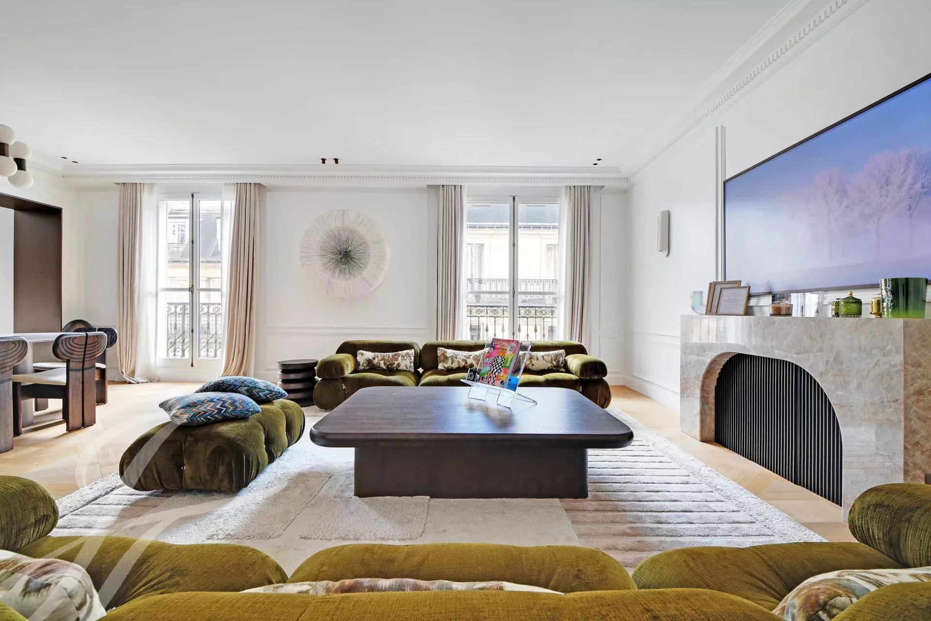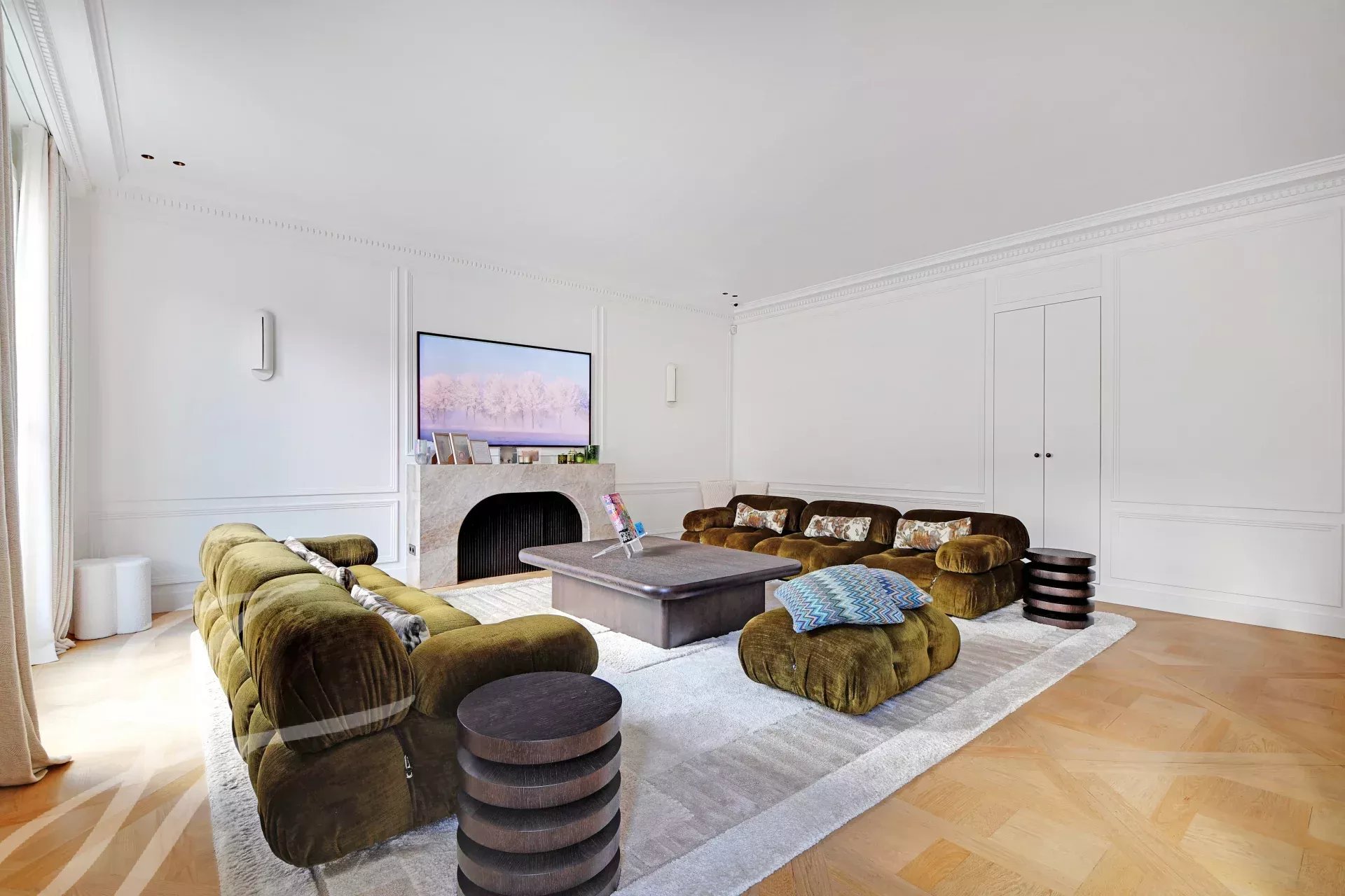 Period charm throughout — herringbone parquet floors, ornate moldings, high ceilings — combined with generous volumes and absolute tranquillity.