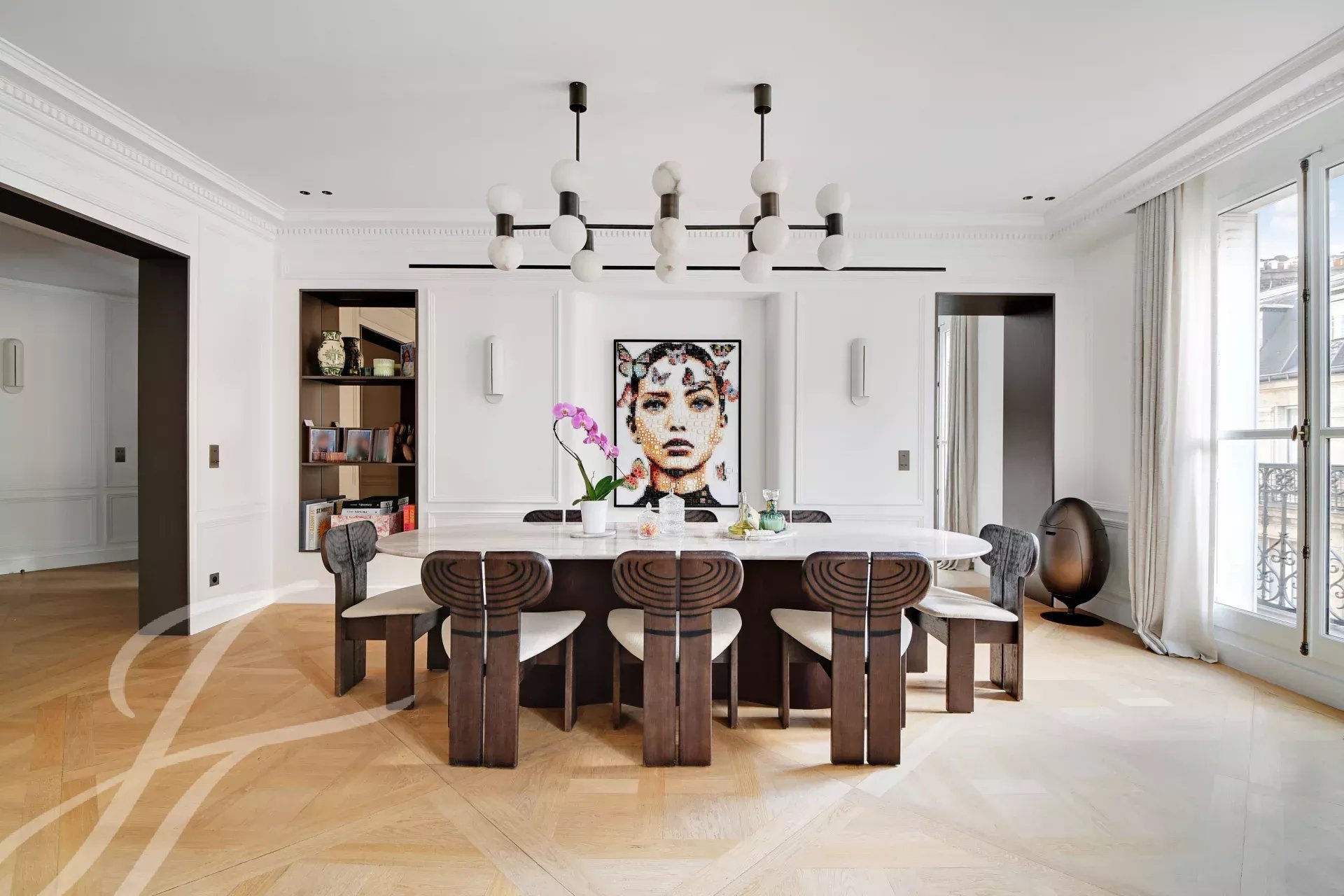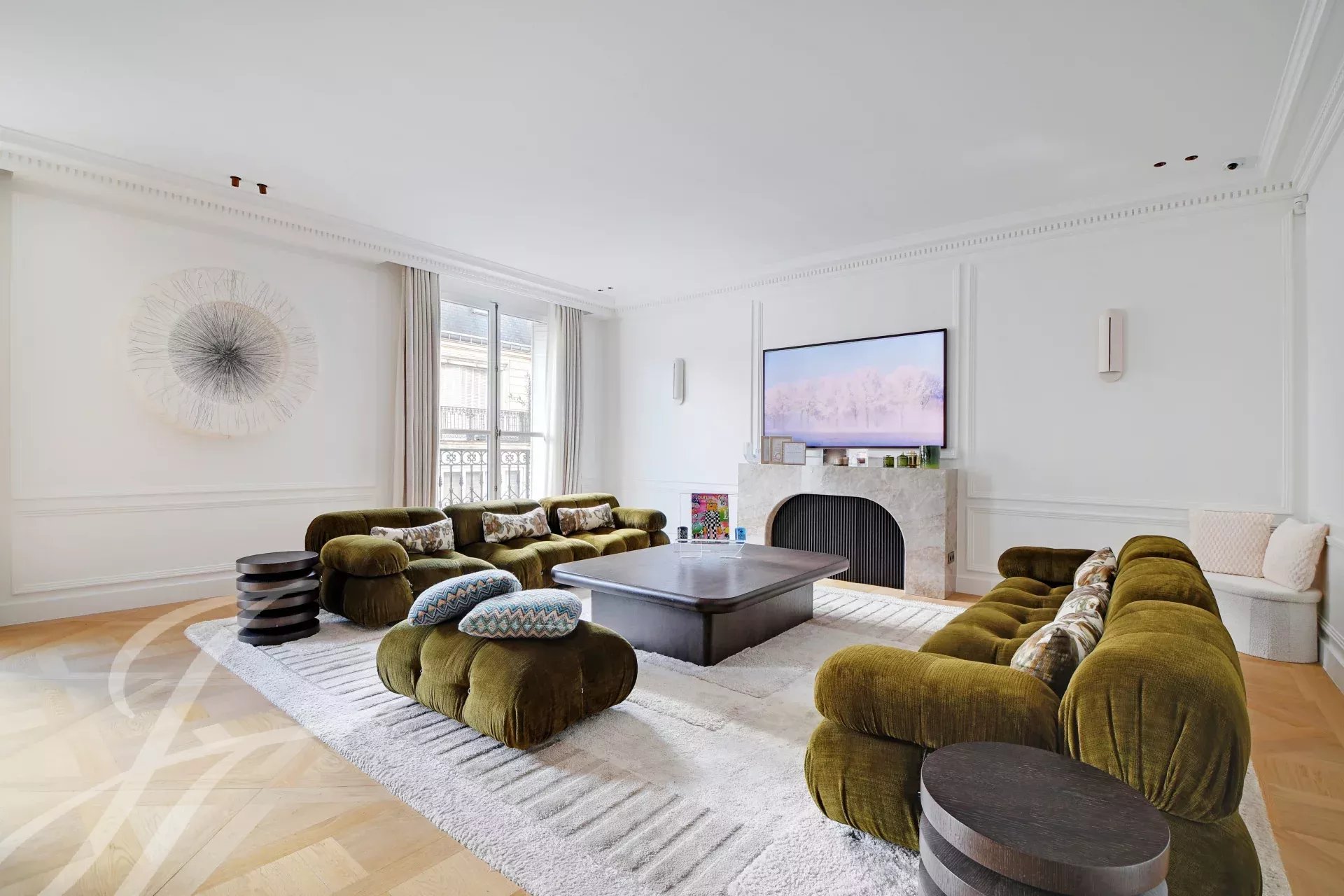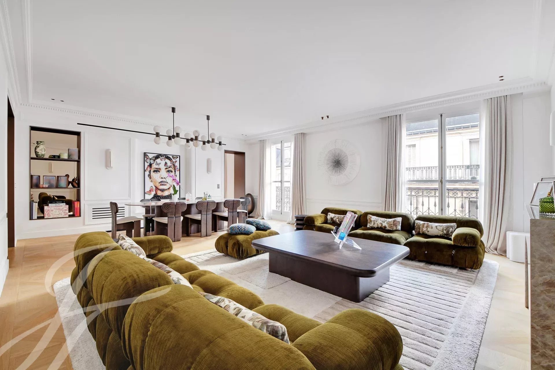 On the 5th floor of a prestigious Haussmann-style building with elevator, this superb 152 sqm (Carrez law) family and reception apartment offers a long balcony and beautiful dual-aspect natural light.
