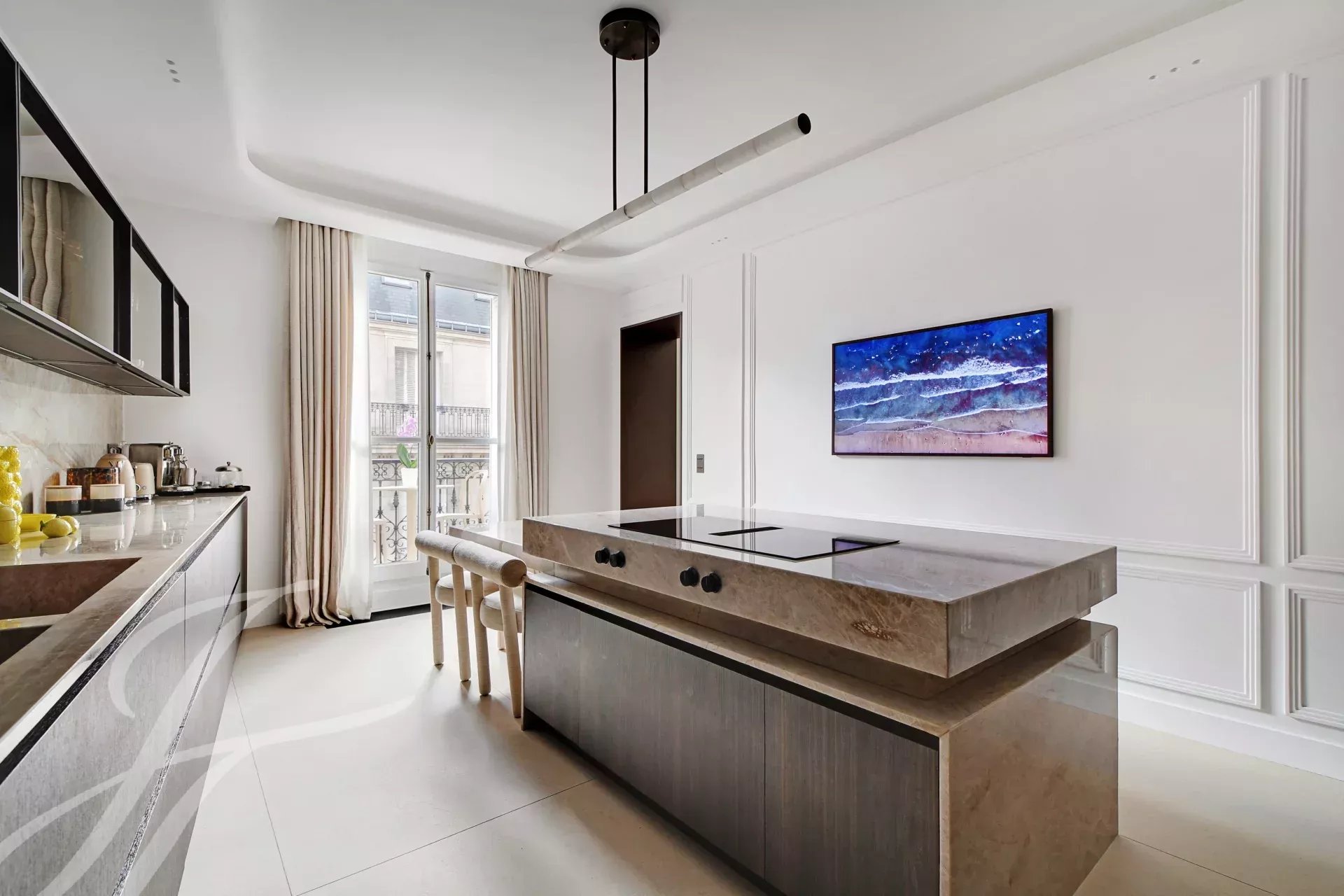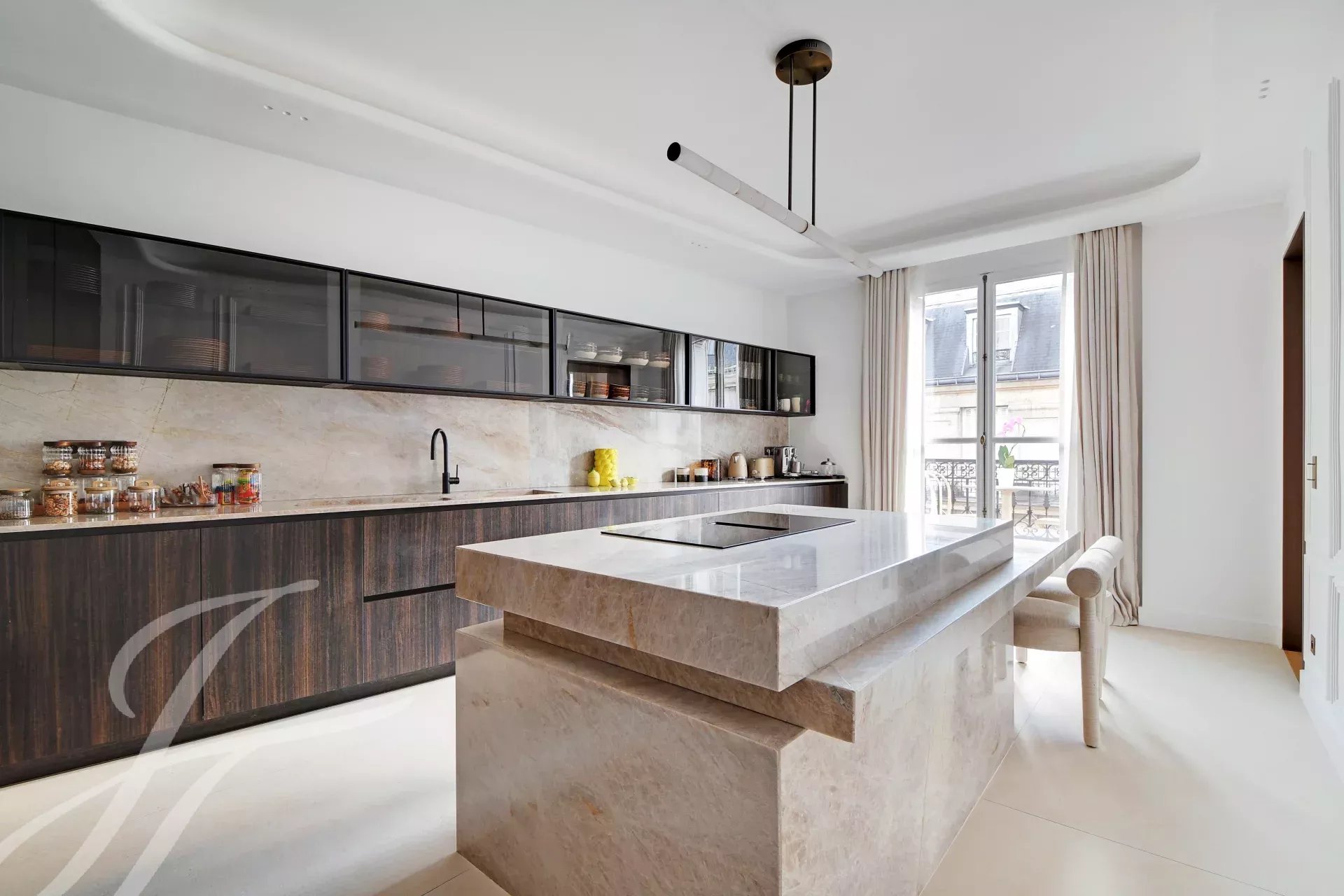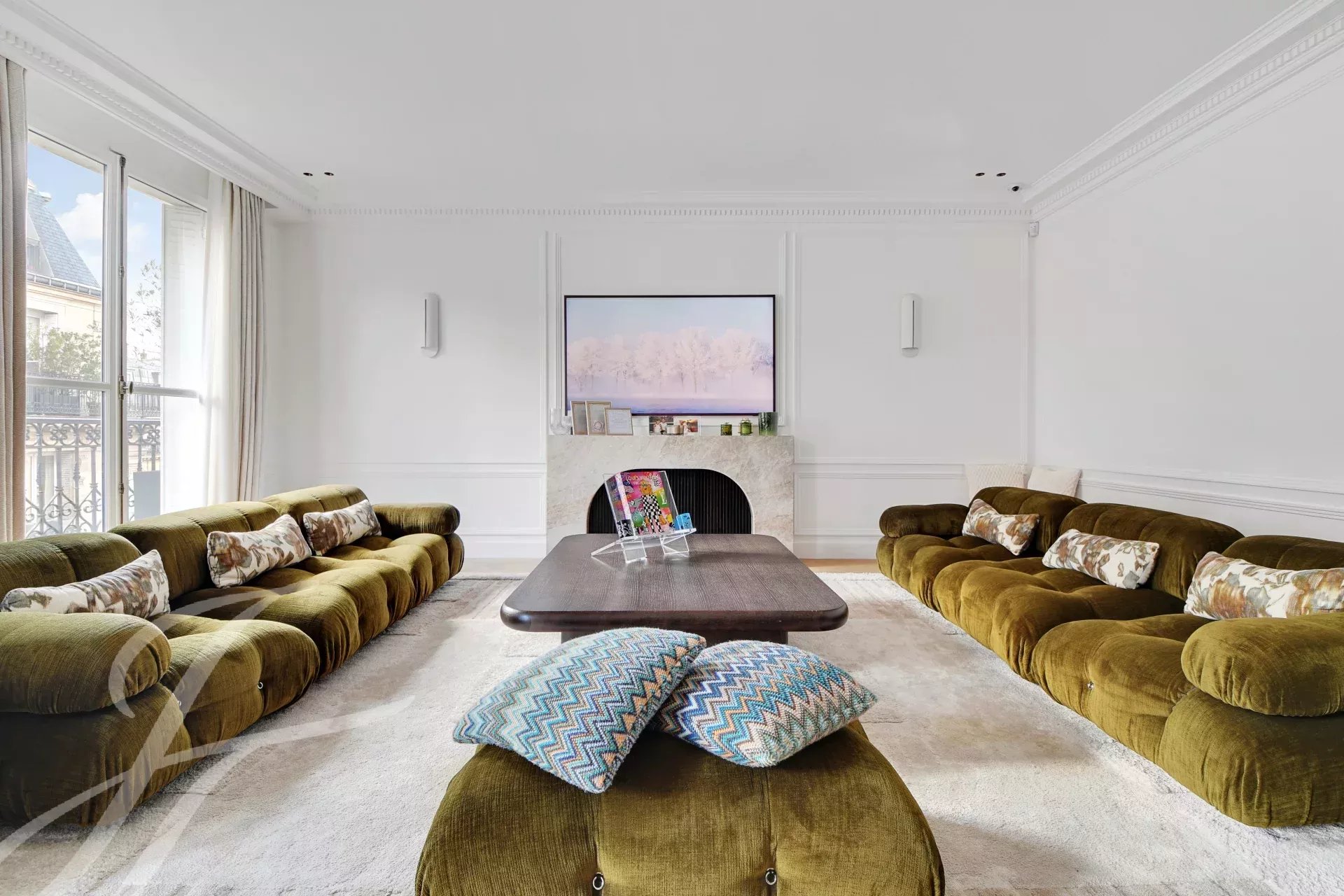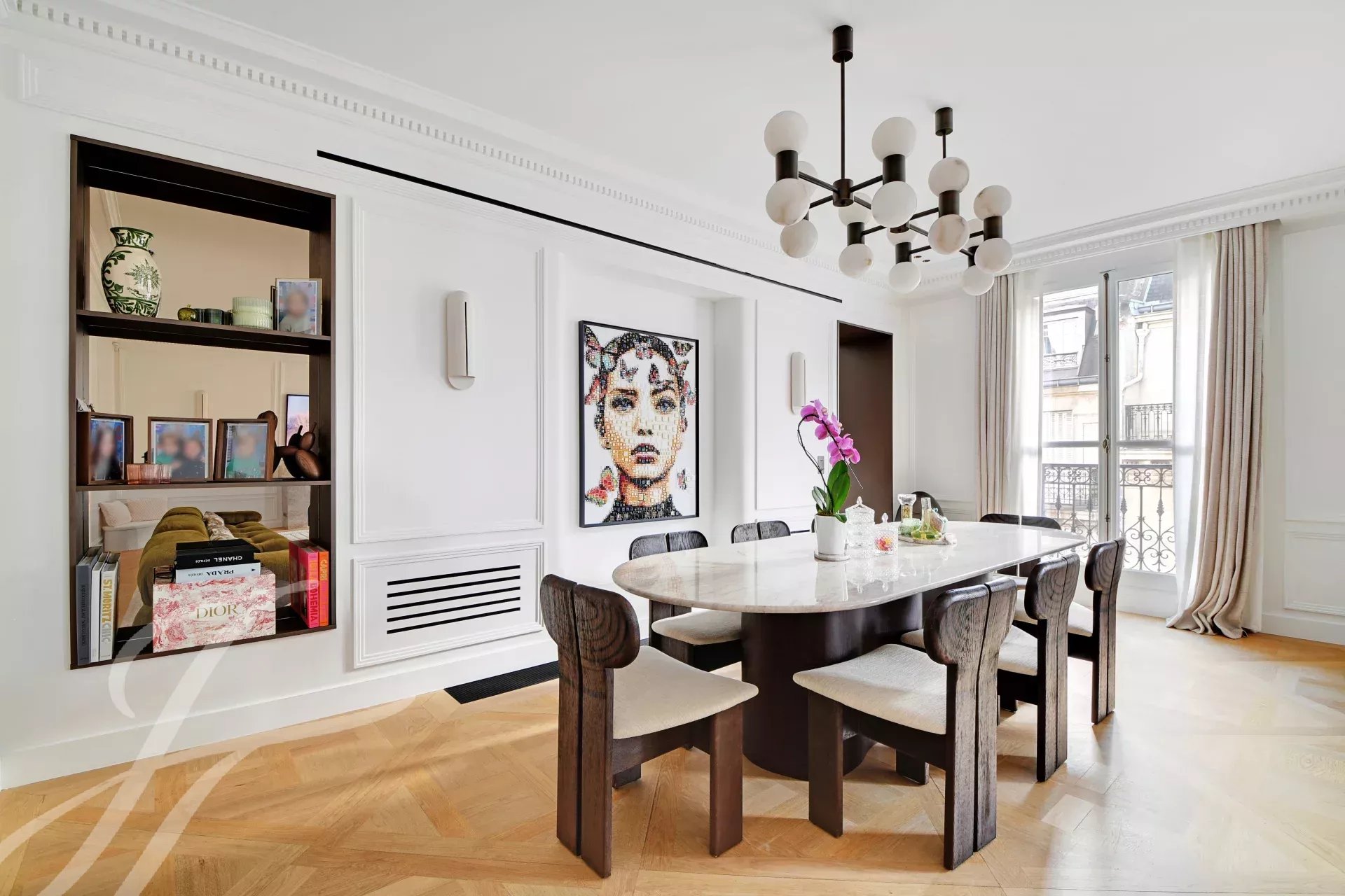 On the 5th floor of a prestigious Haussmann-style building with elevator, this superb 152 sqm (Carrez law) family and reception apartment offers a long balcony and beautiful dual-aspect natural light.