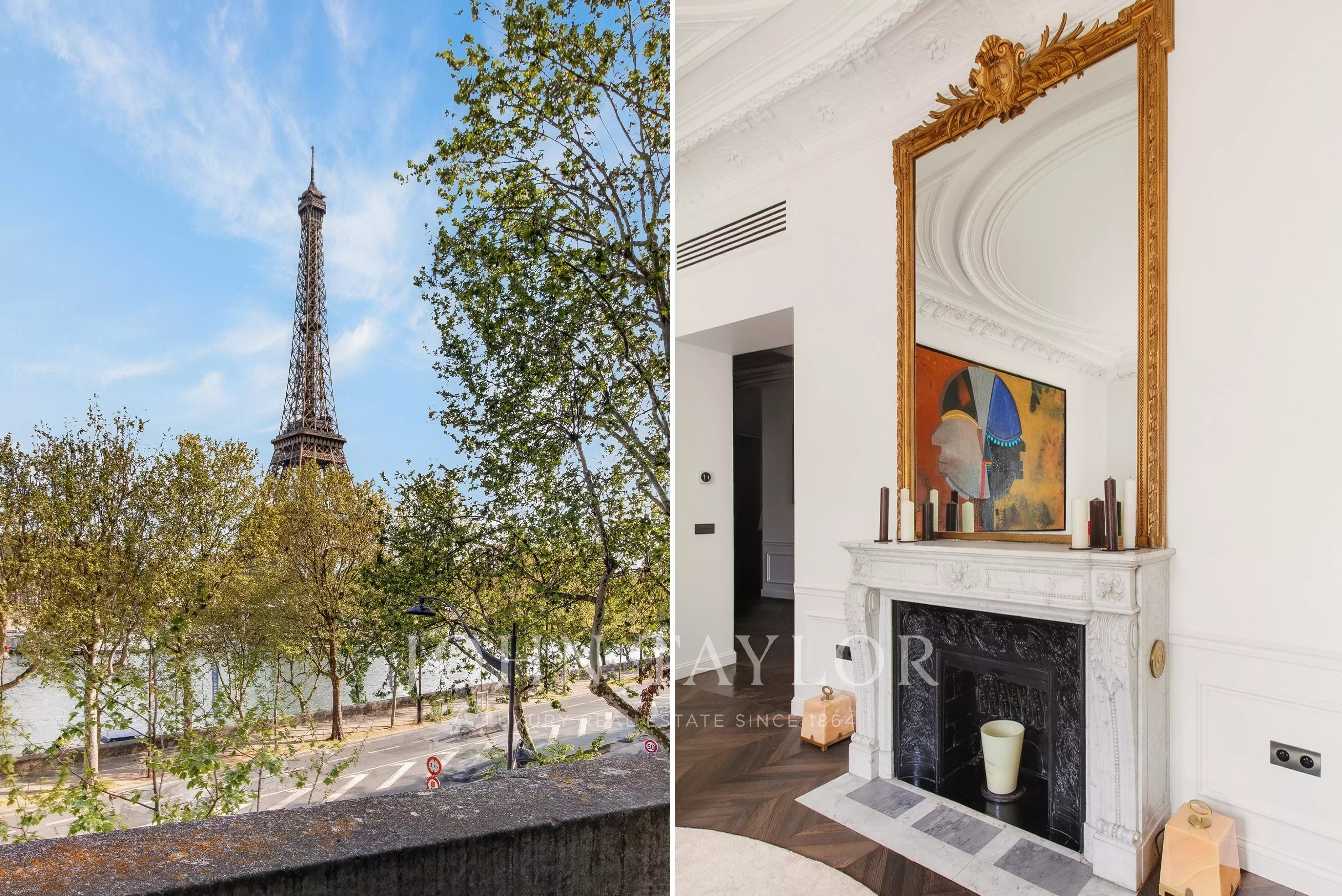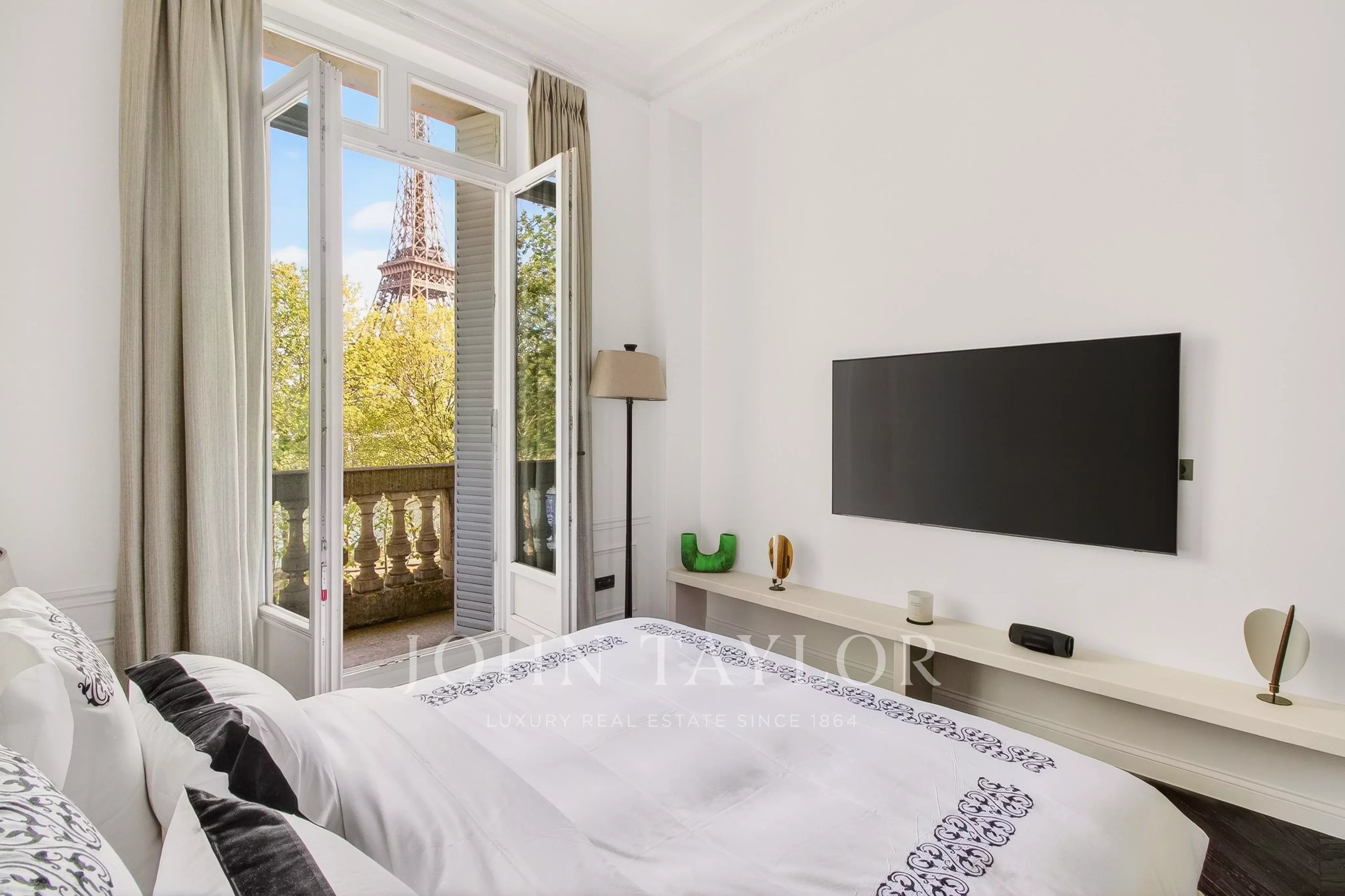 It comprises an entrance hall with fitted cupboards, a large living room with a balcony overlooking the Eiffel Tower, a fully-equipped kitchen, two bedrooms, a shower room with toilet, a large dressing room and a guest toilet.