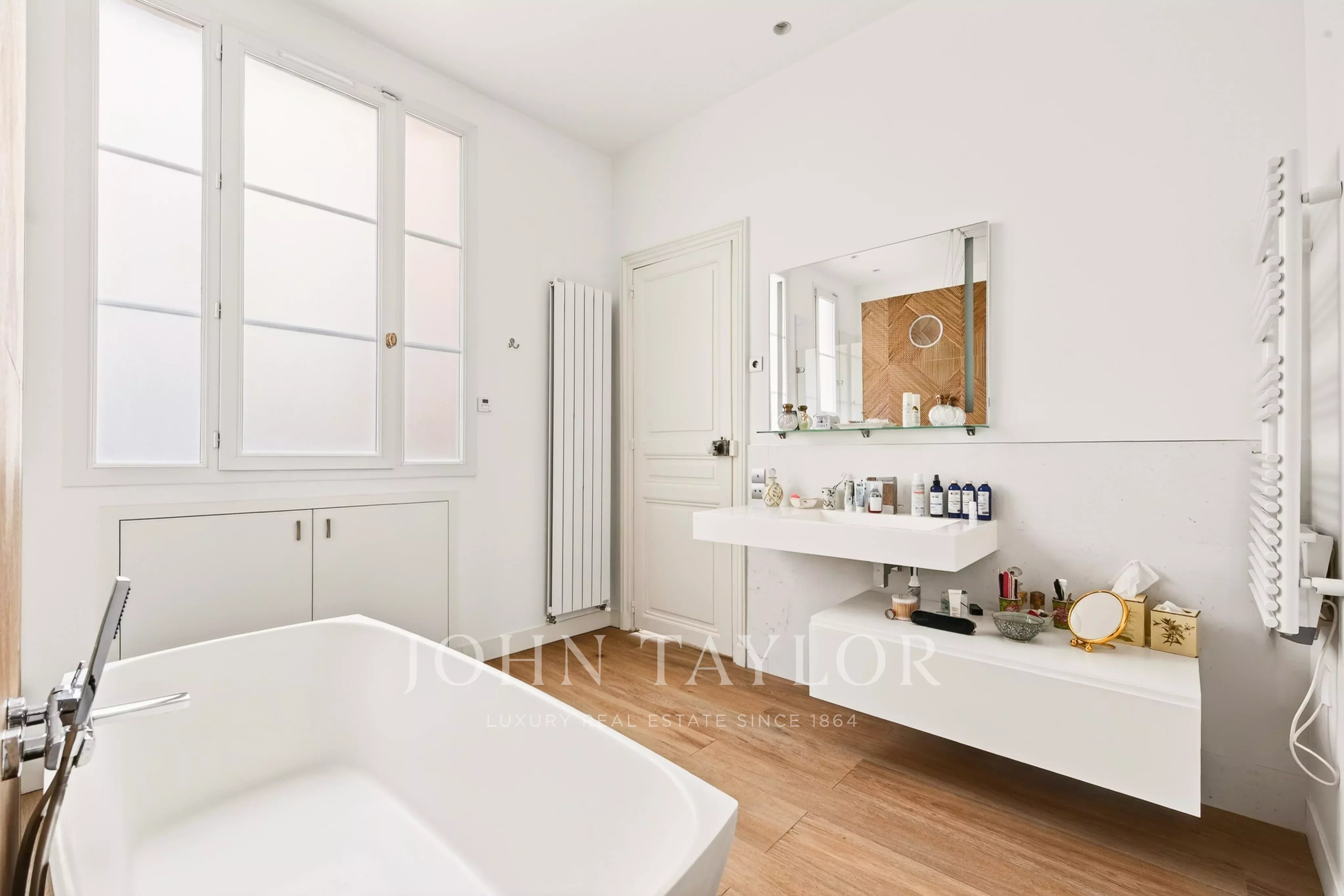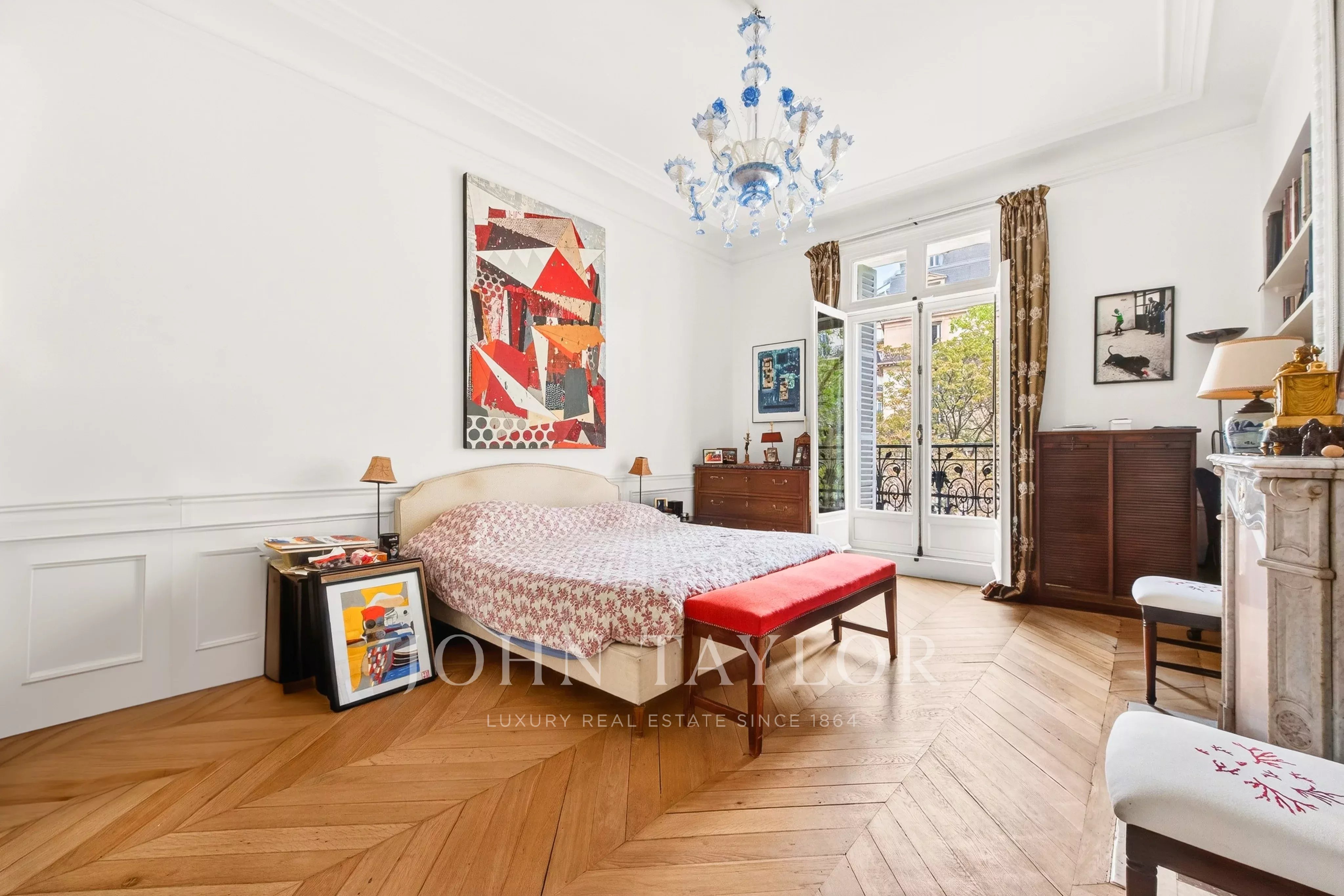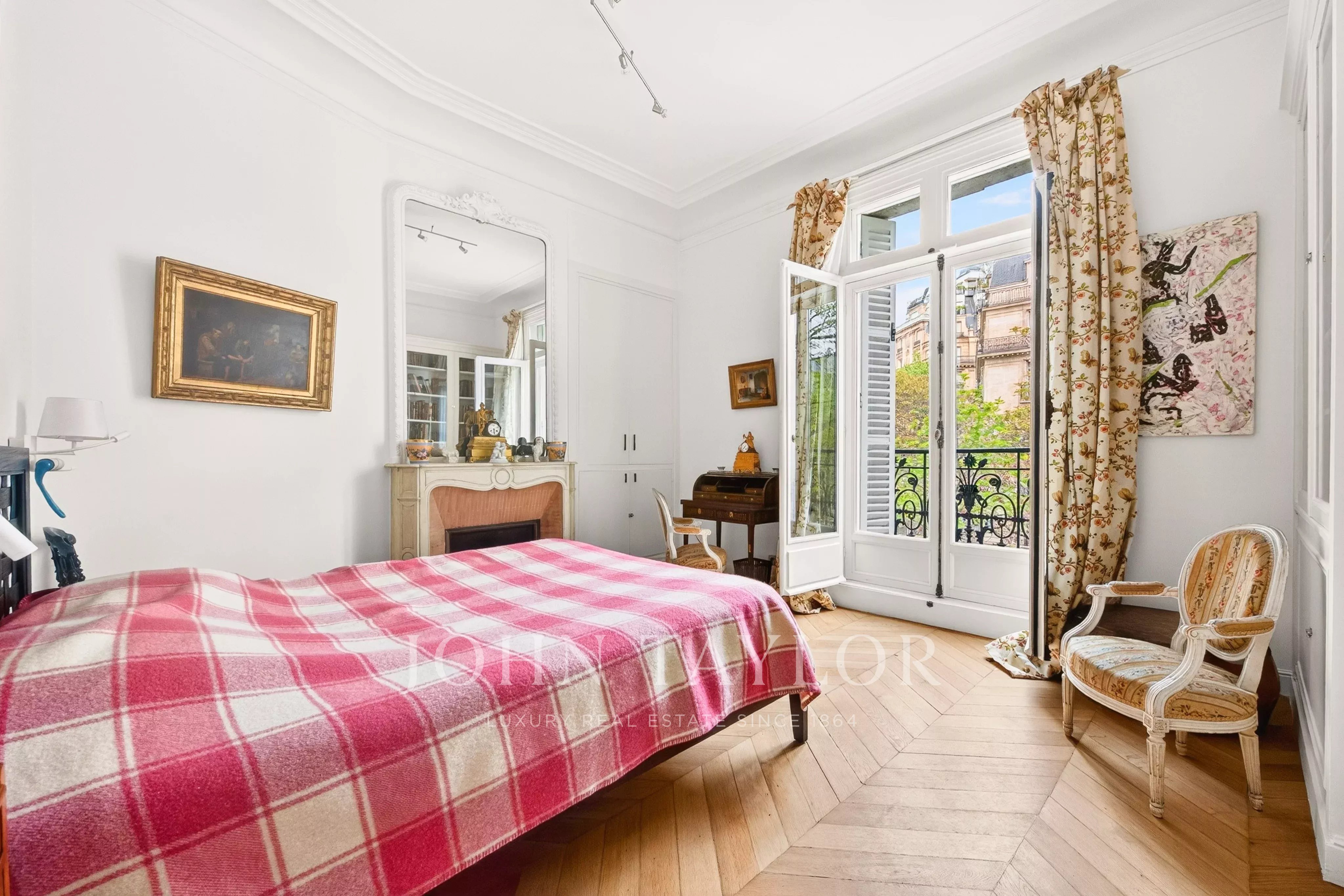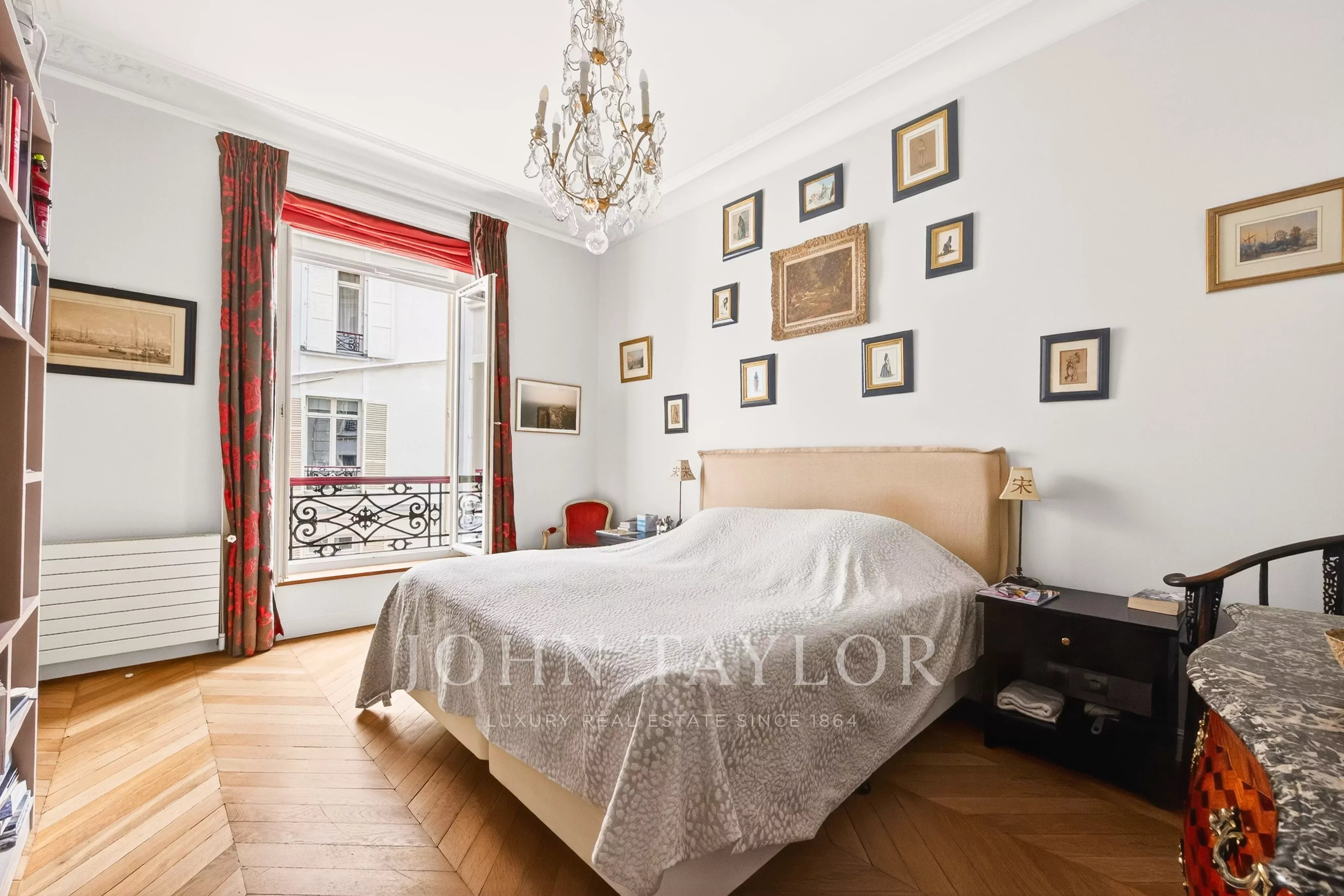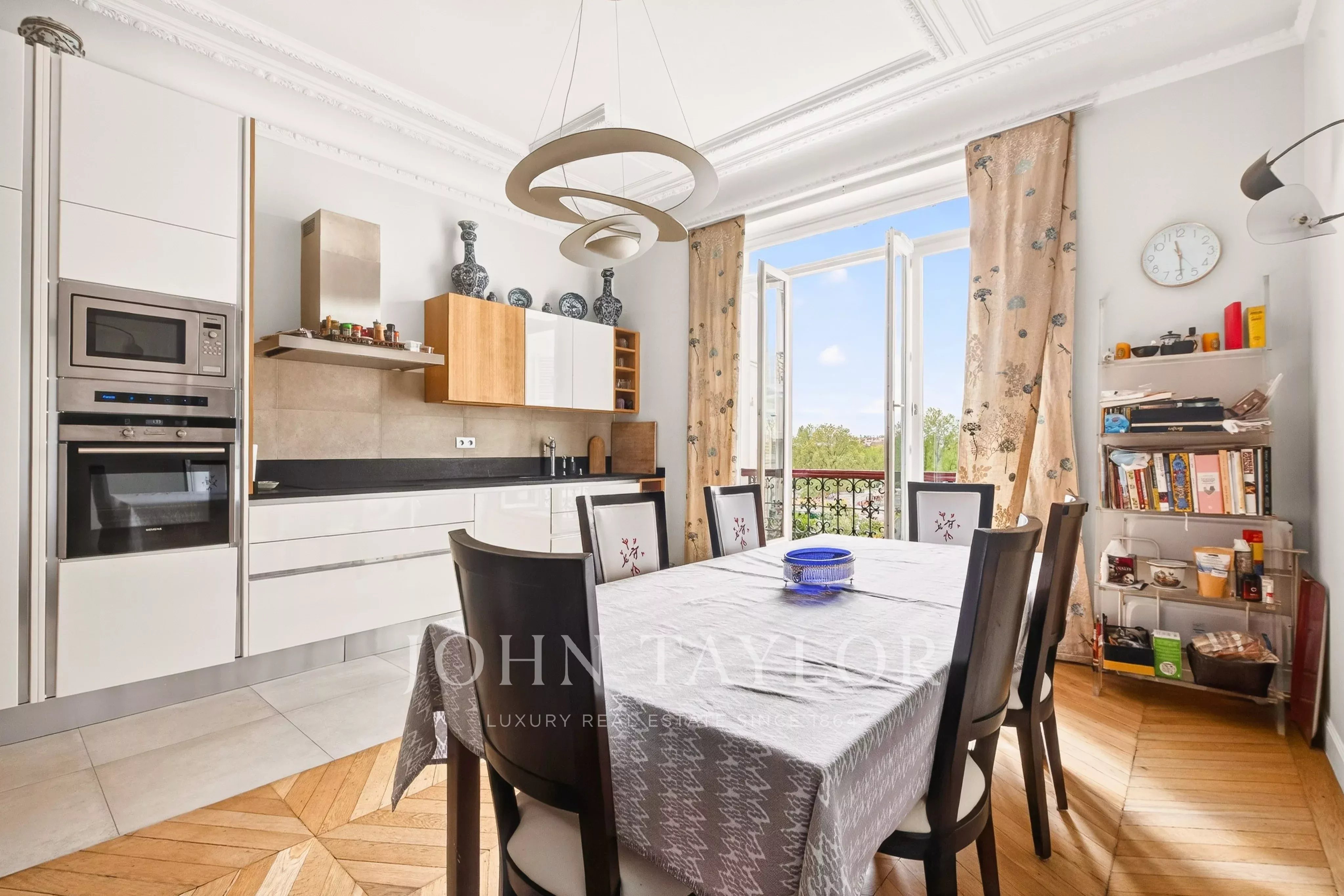 The entryway opens onto a spacious double living area, extended by a long balcony offering views of Place d’Iéna and the Galliera Museum. The fully fitted and equipped kitchen-dining area enjoys plenty of natural light thanks to its southwest exposure and unobstructed views.