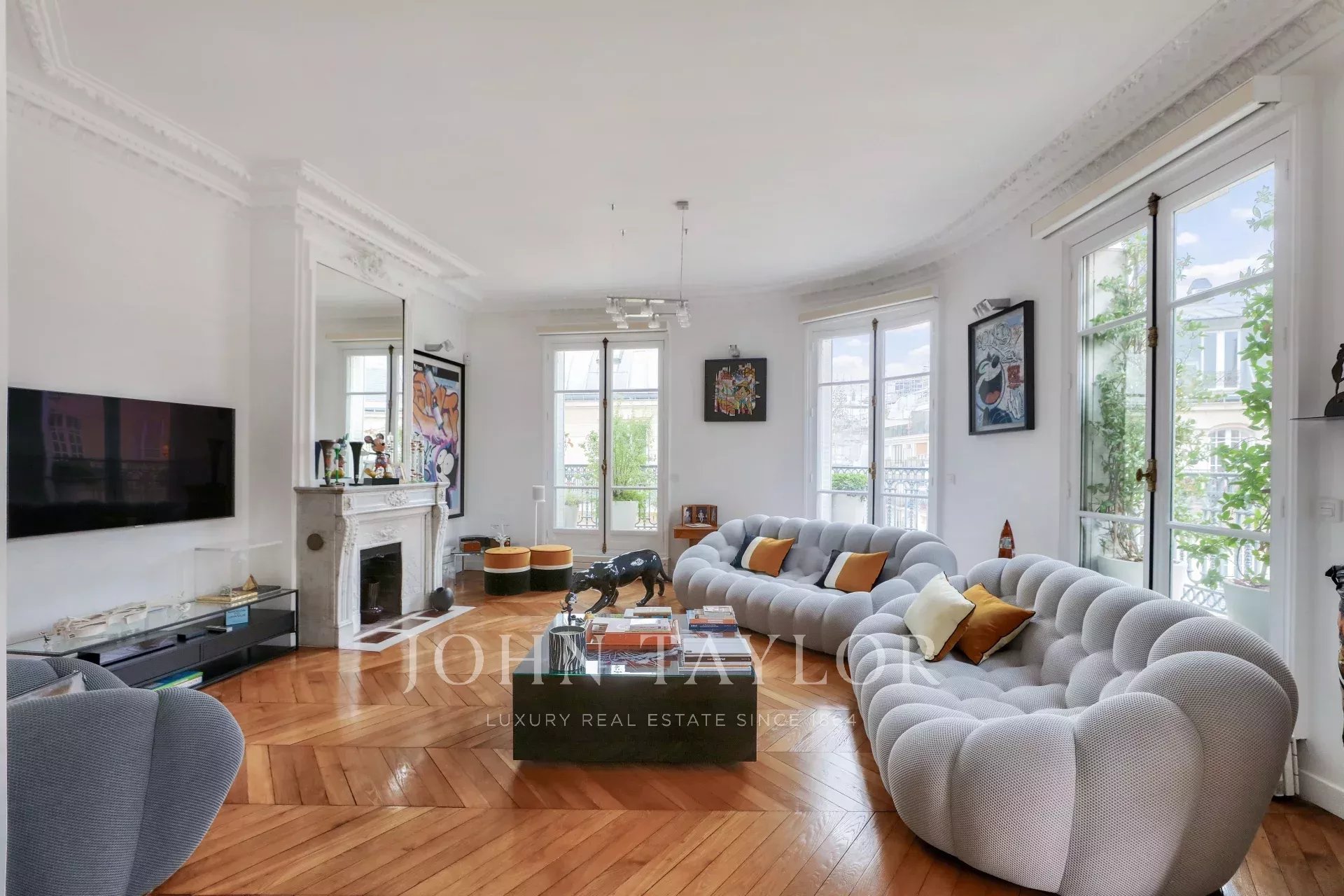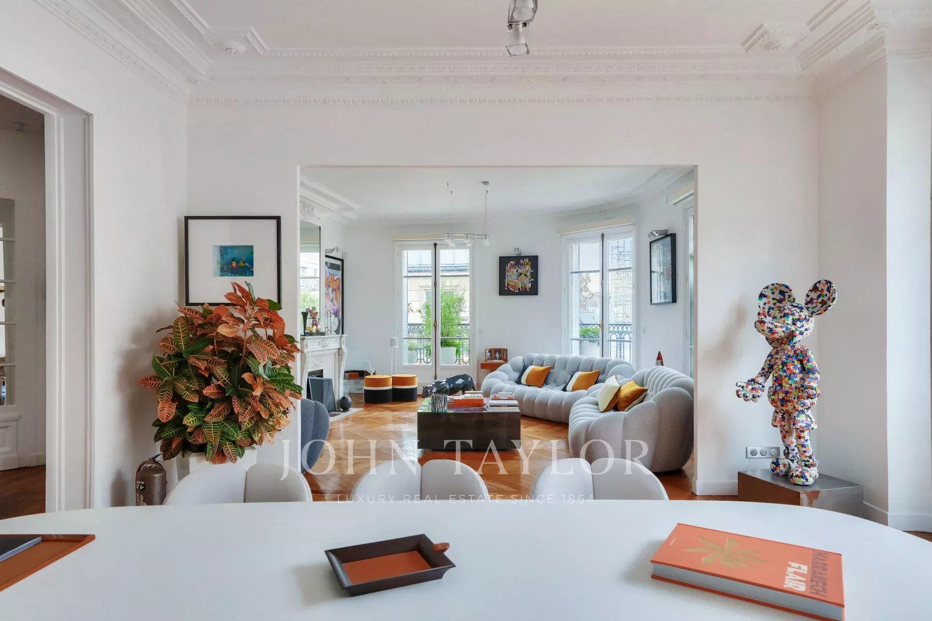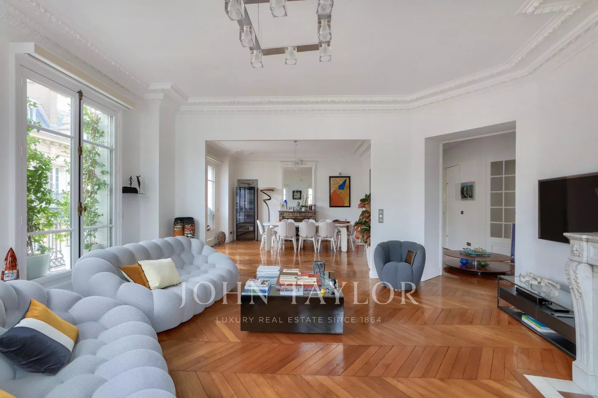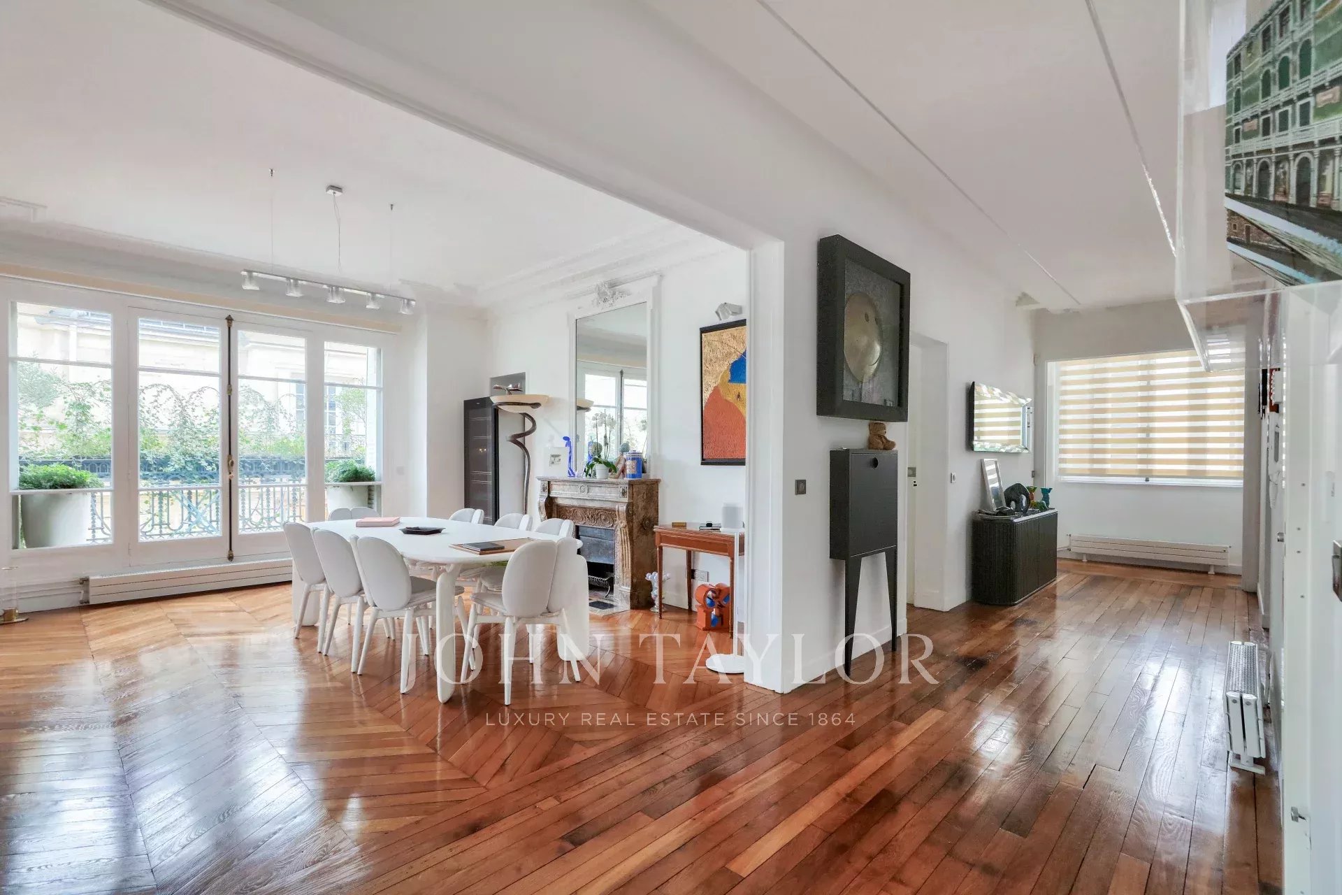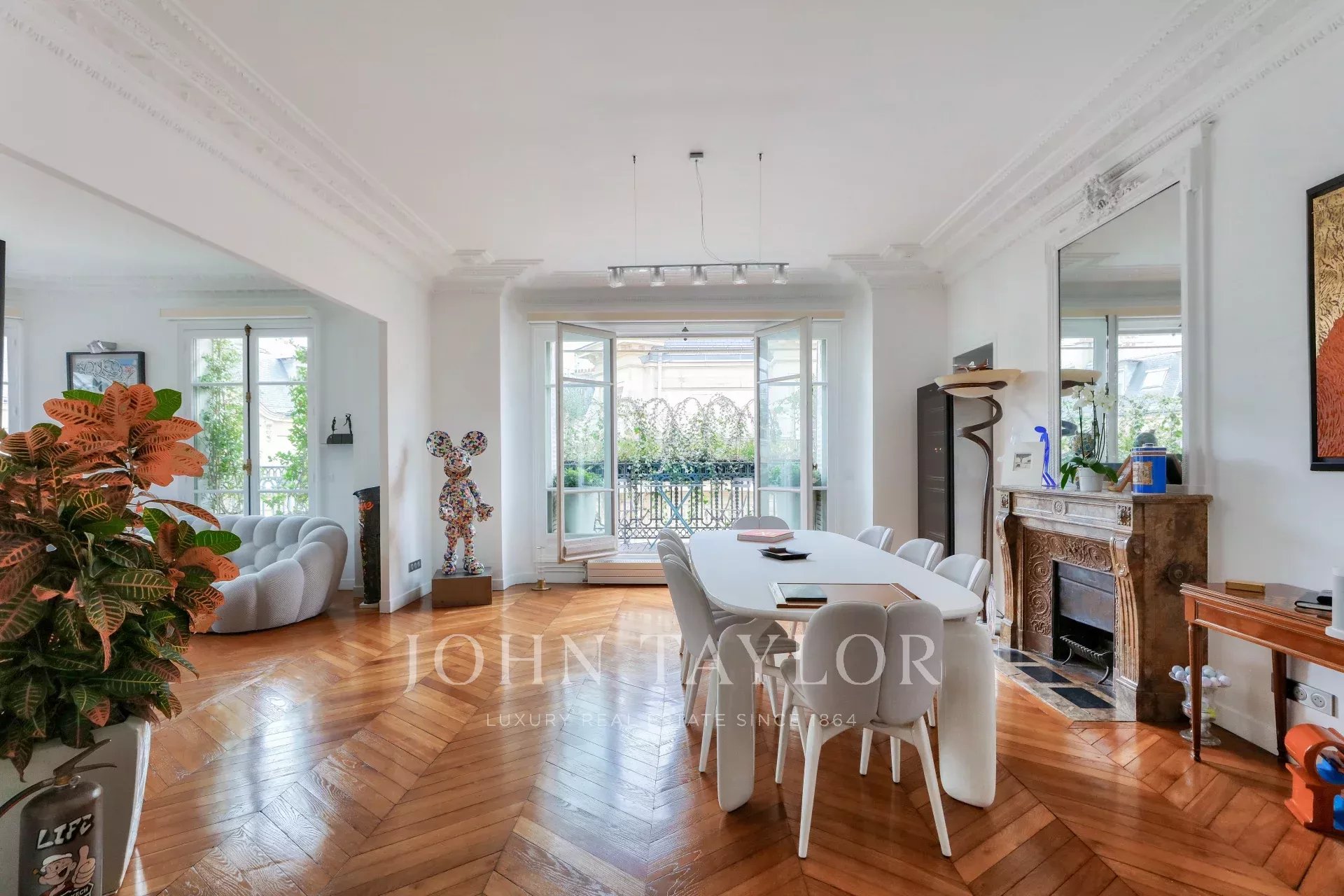 Located on the fifth and top floor of a prestigious period building with renovated common areas, elevator, and caretaker, we offer this beautiful 140 m² (Carrez law) apartment, fully renovated, featuring a stunning 23 m² continuous balcony.