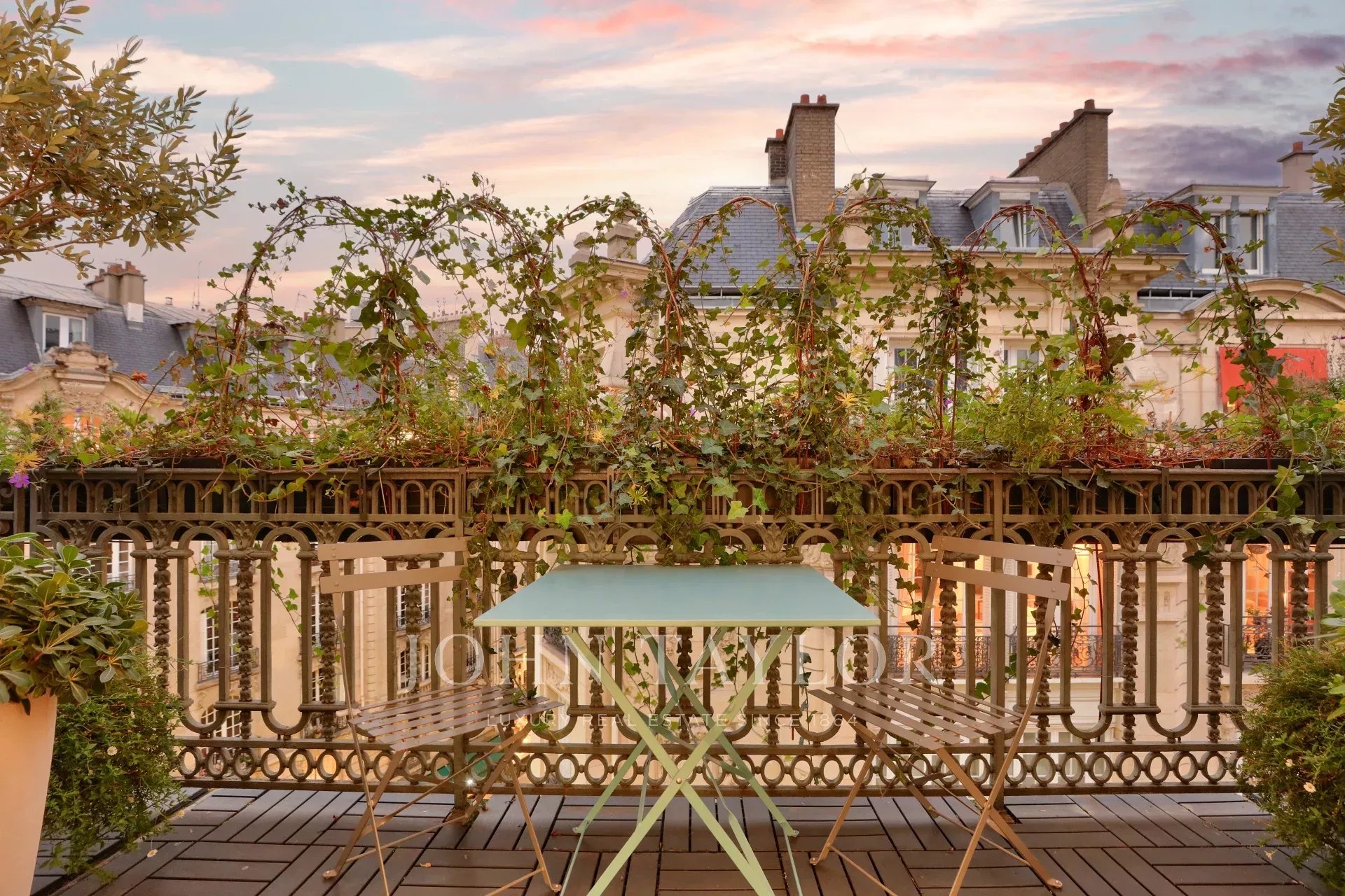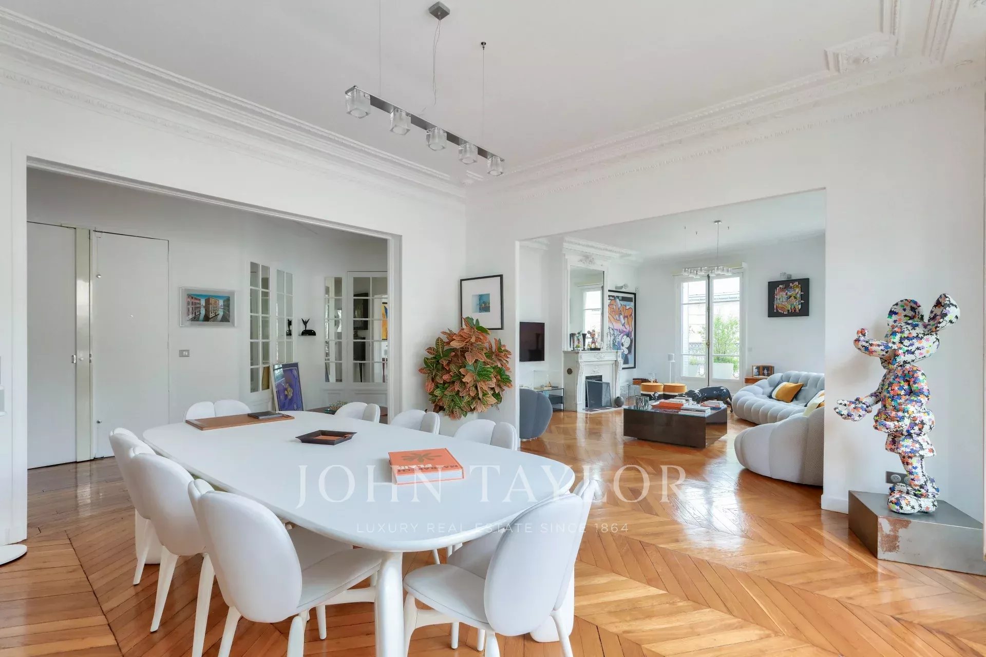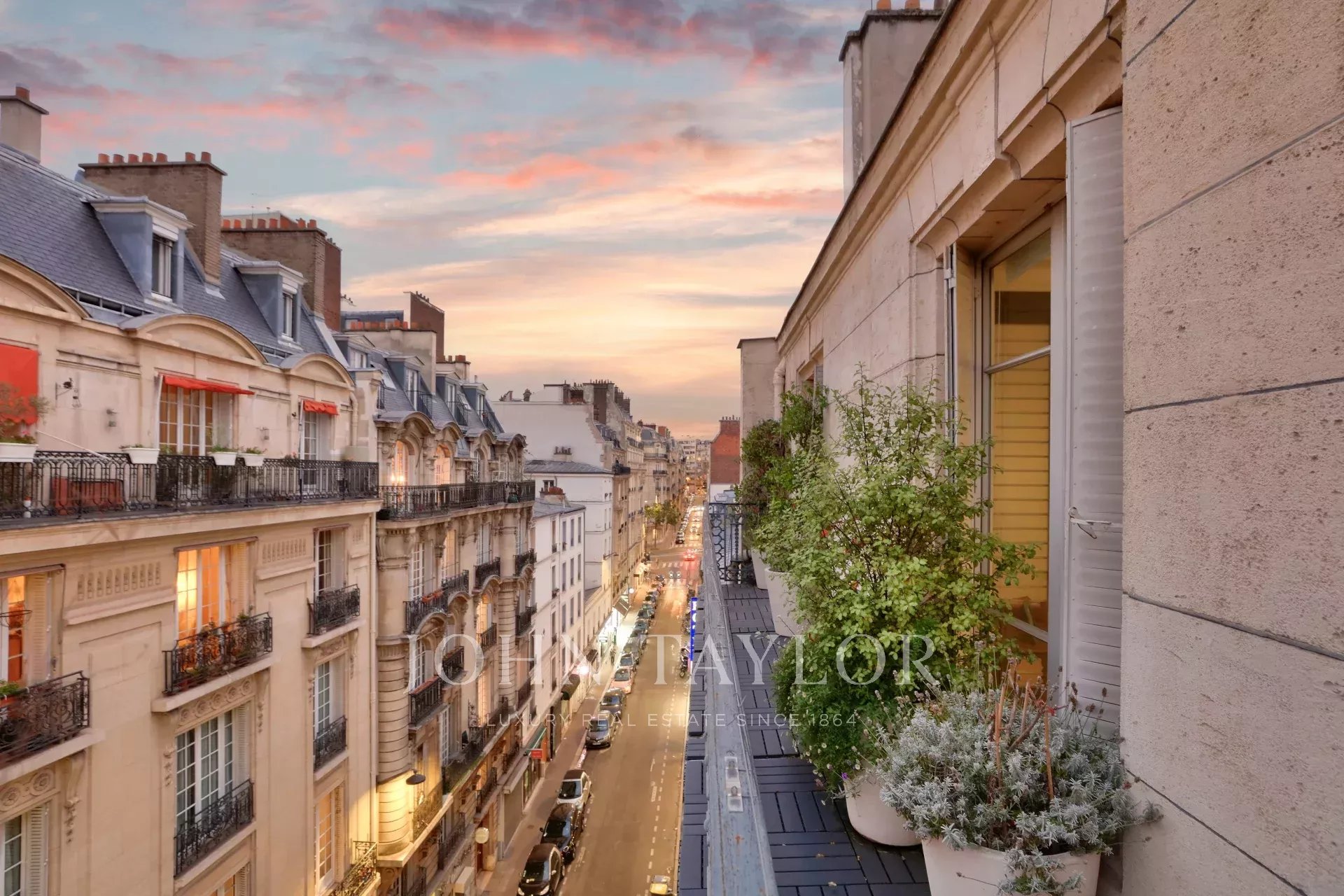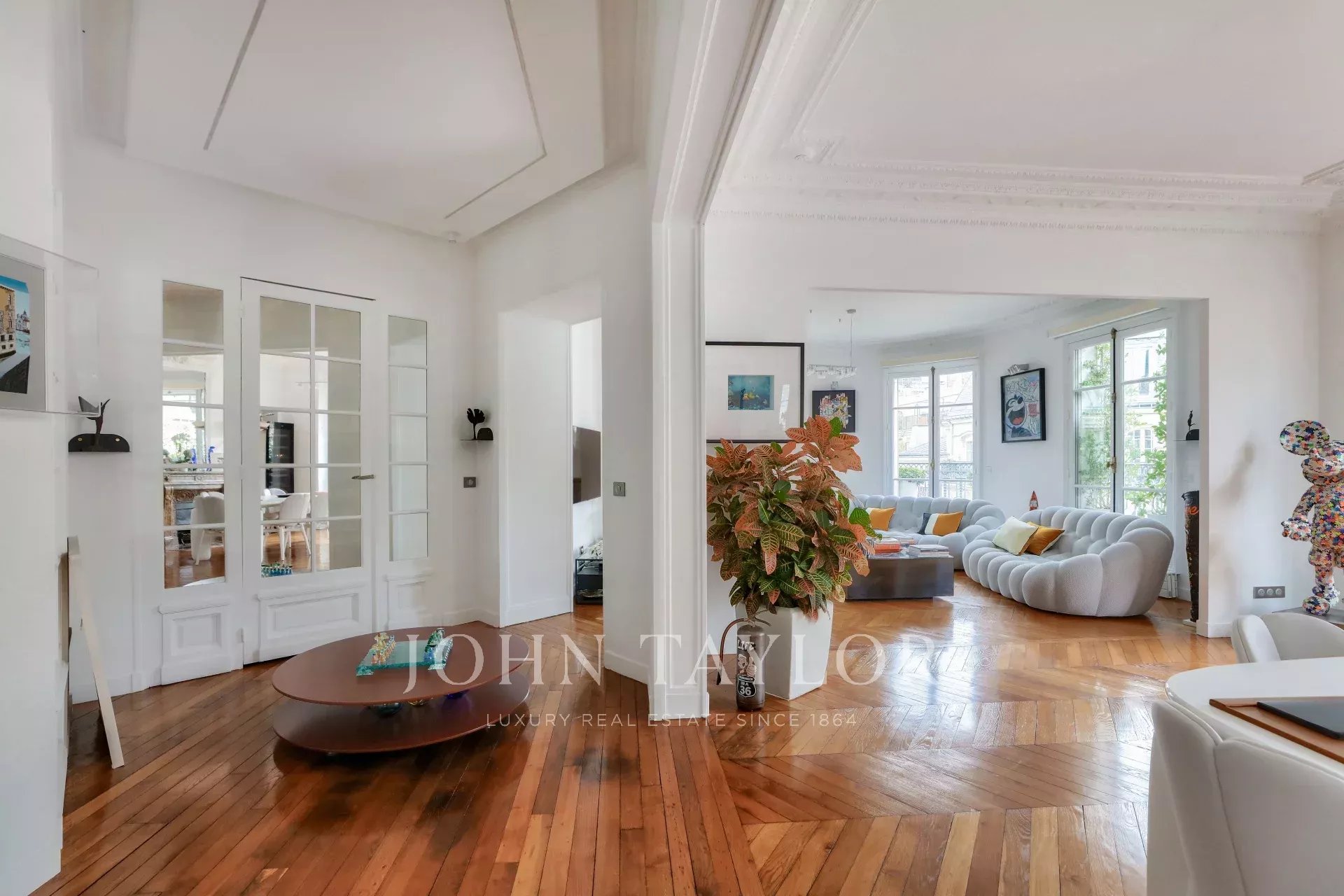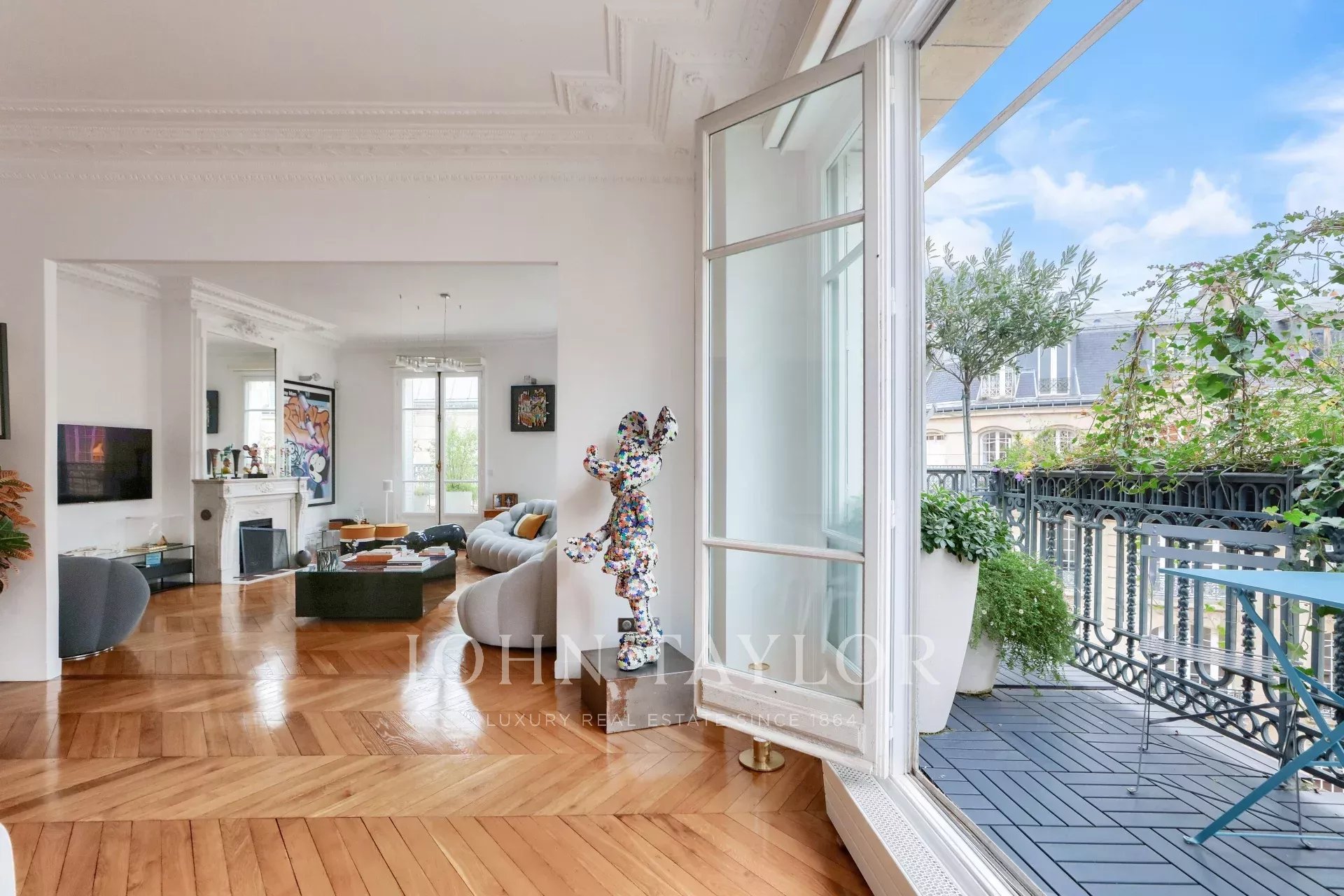 Located on the fifth and top floor of a prestigious period building with renovated common areas, elevator, and caretaker, we offer this beautiful 140 m² (Carrez law) apartment, fully renovated, featuring a stunning 23 m² continuous balcony.