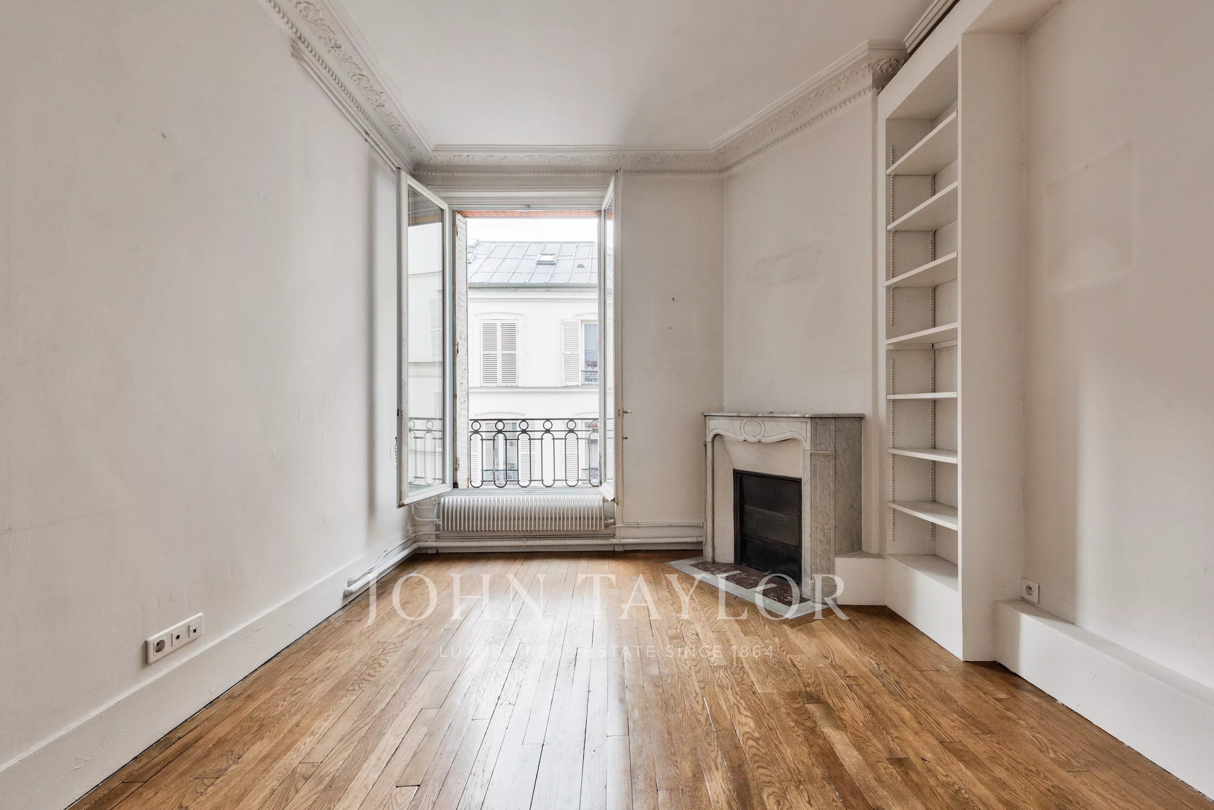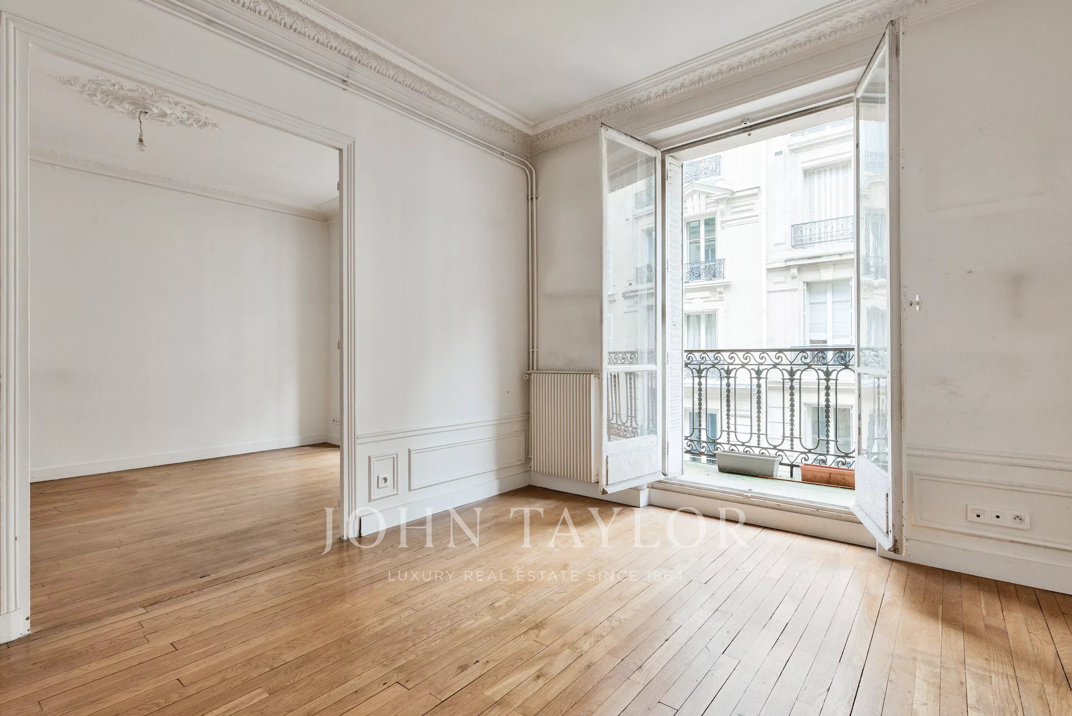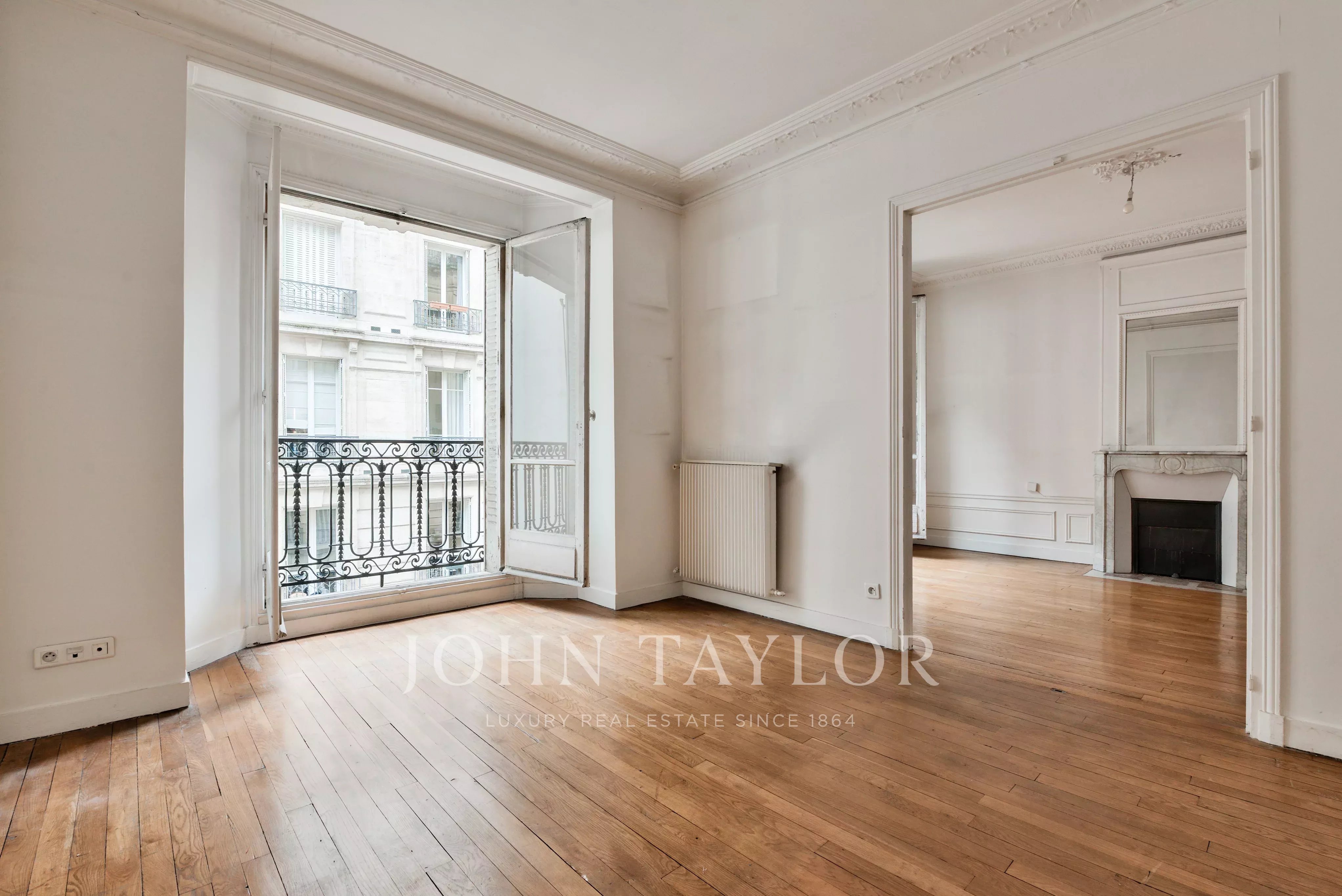 The apartment, to be renovated, benefits from an open-plan layout and 3-meter high ceilings, adding volume and brightness.