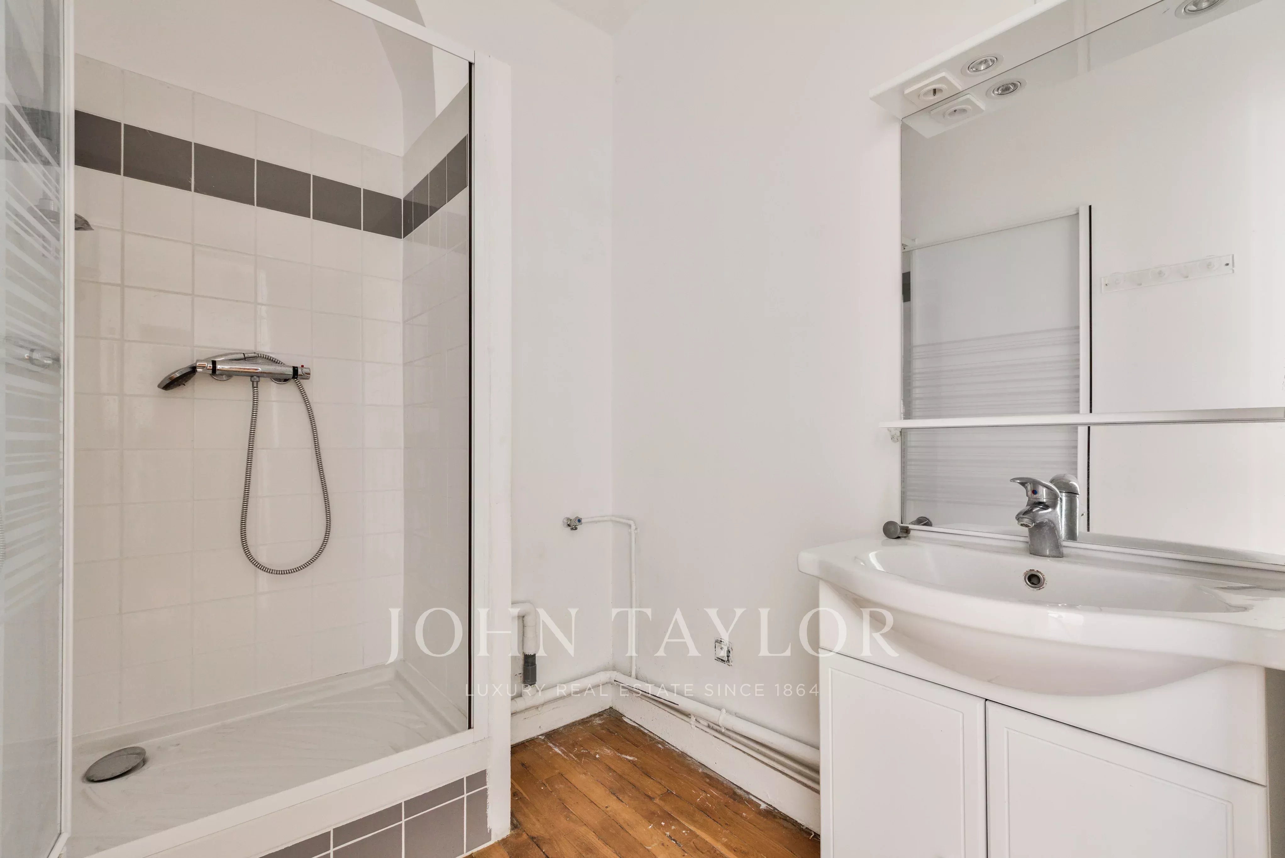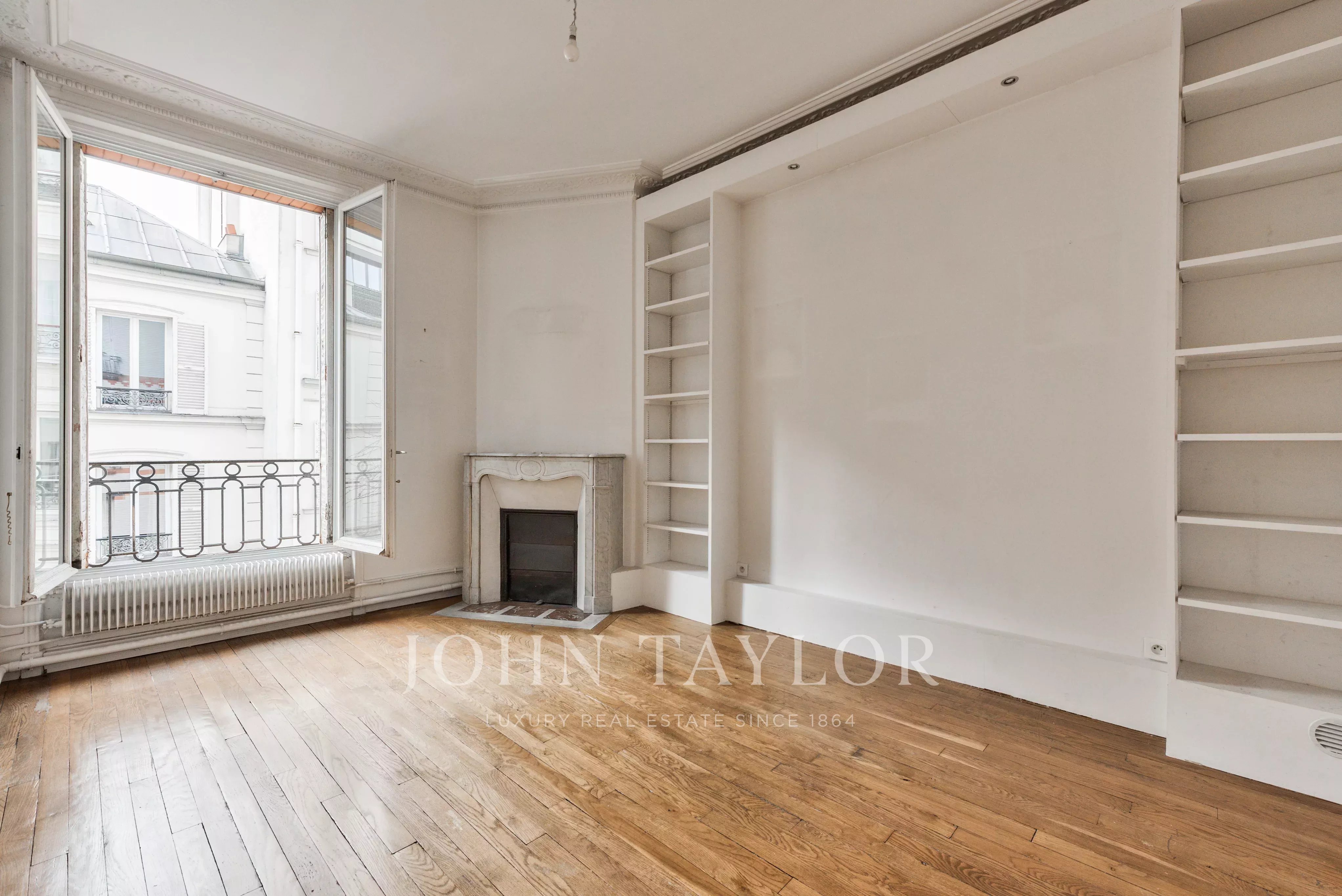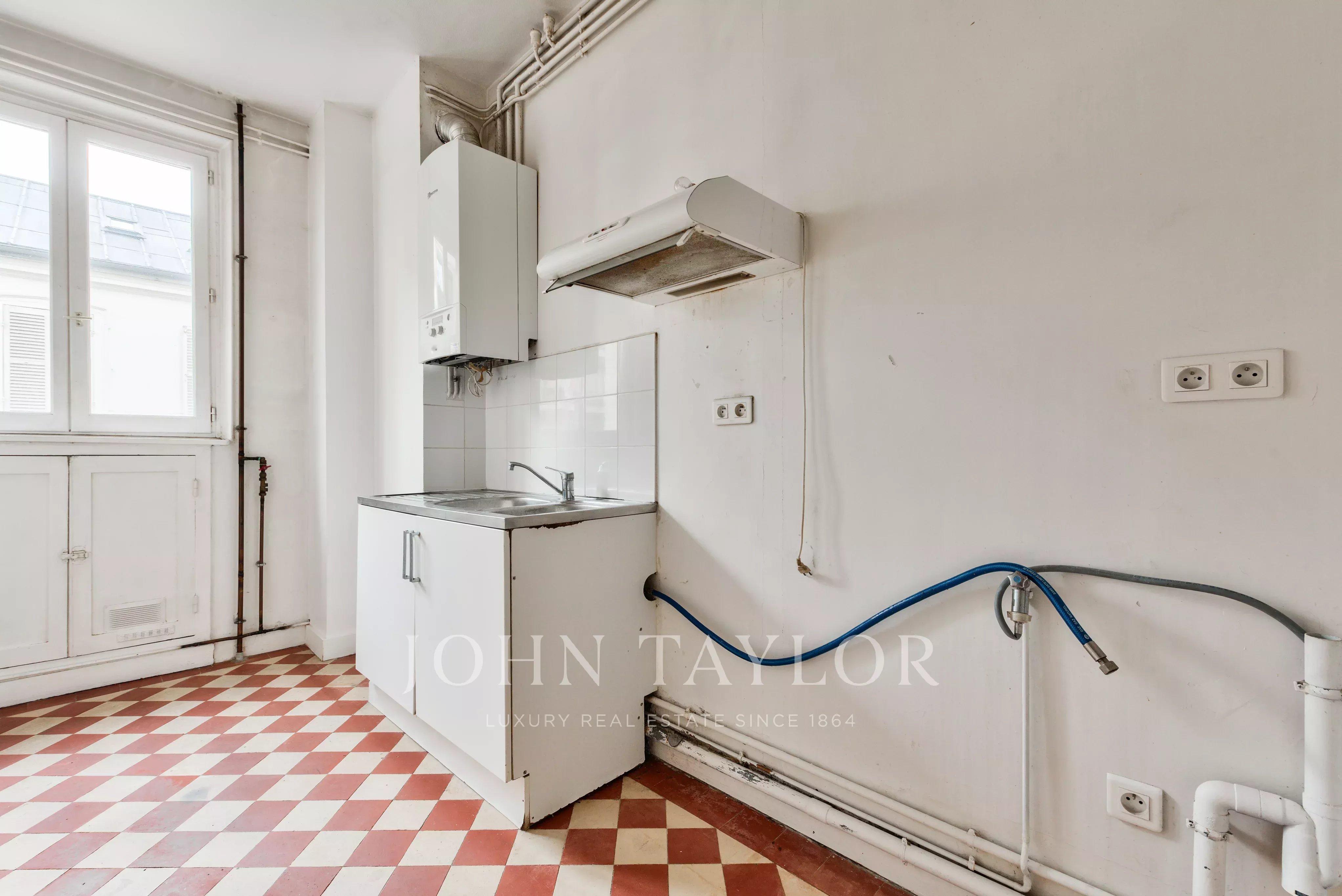 The apartment, to be renovated, benefits from an open-plan layout and 3-meter high ceilings, adding volume and brightness.
