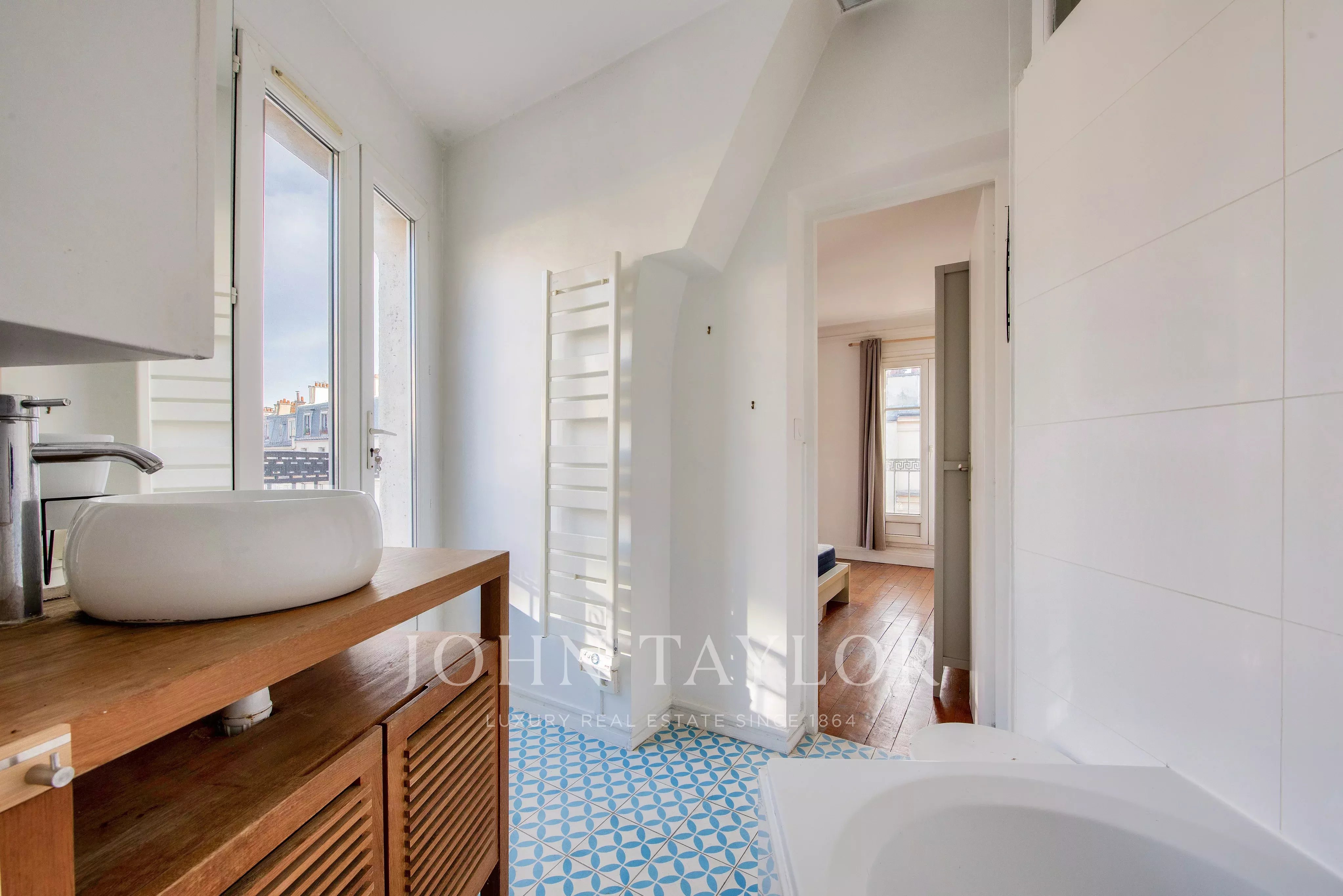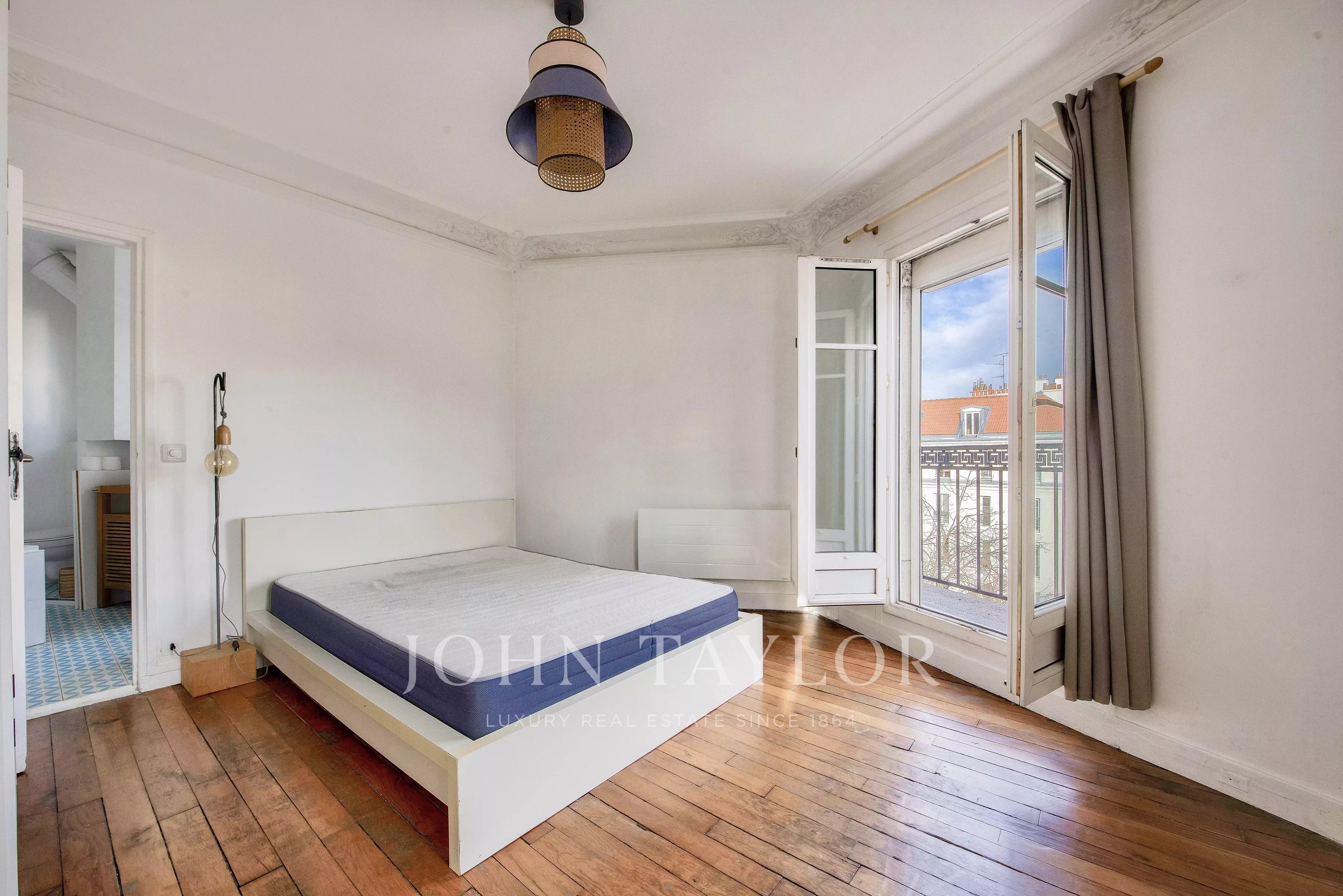 Just a few steps from the 18th arrondissement Town Hall and close to shops, on the 5th floor (walk-up) of a beautiful 19th-century corner building, we offer a 39.5 sqm (Carrez law) apartment with a 10 sqm continuous balcony.