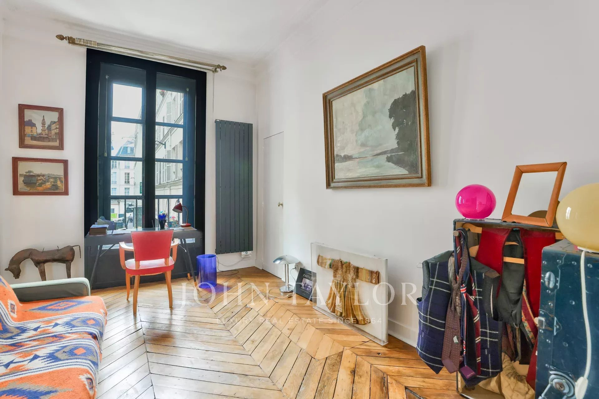 - Large living room with Directoire style fireplace and two large windows overlooking rue Saint-Hyacinthe,