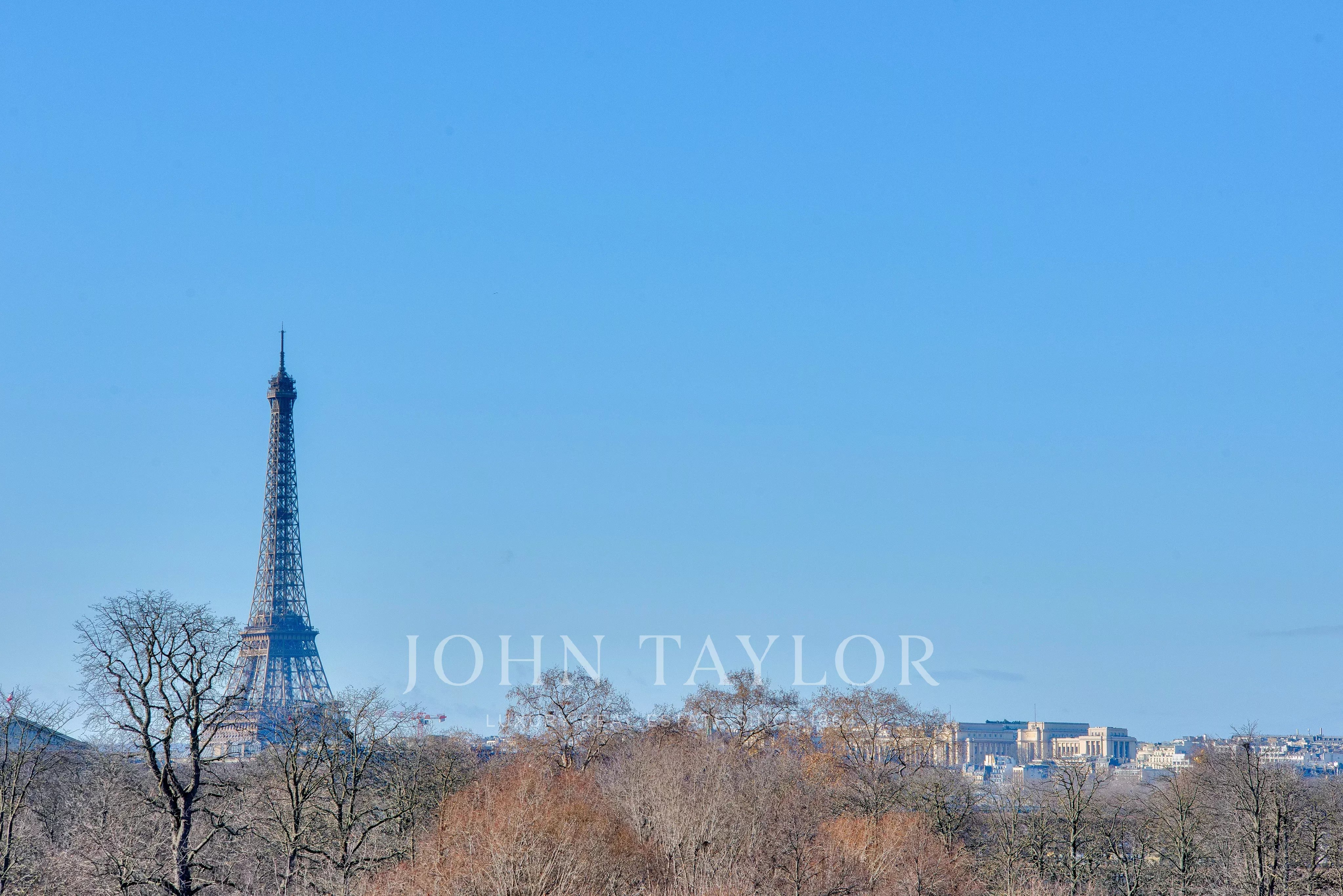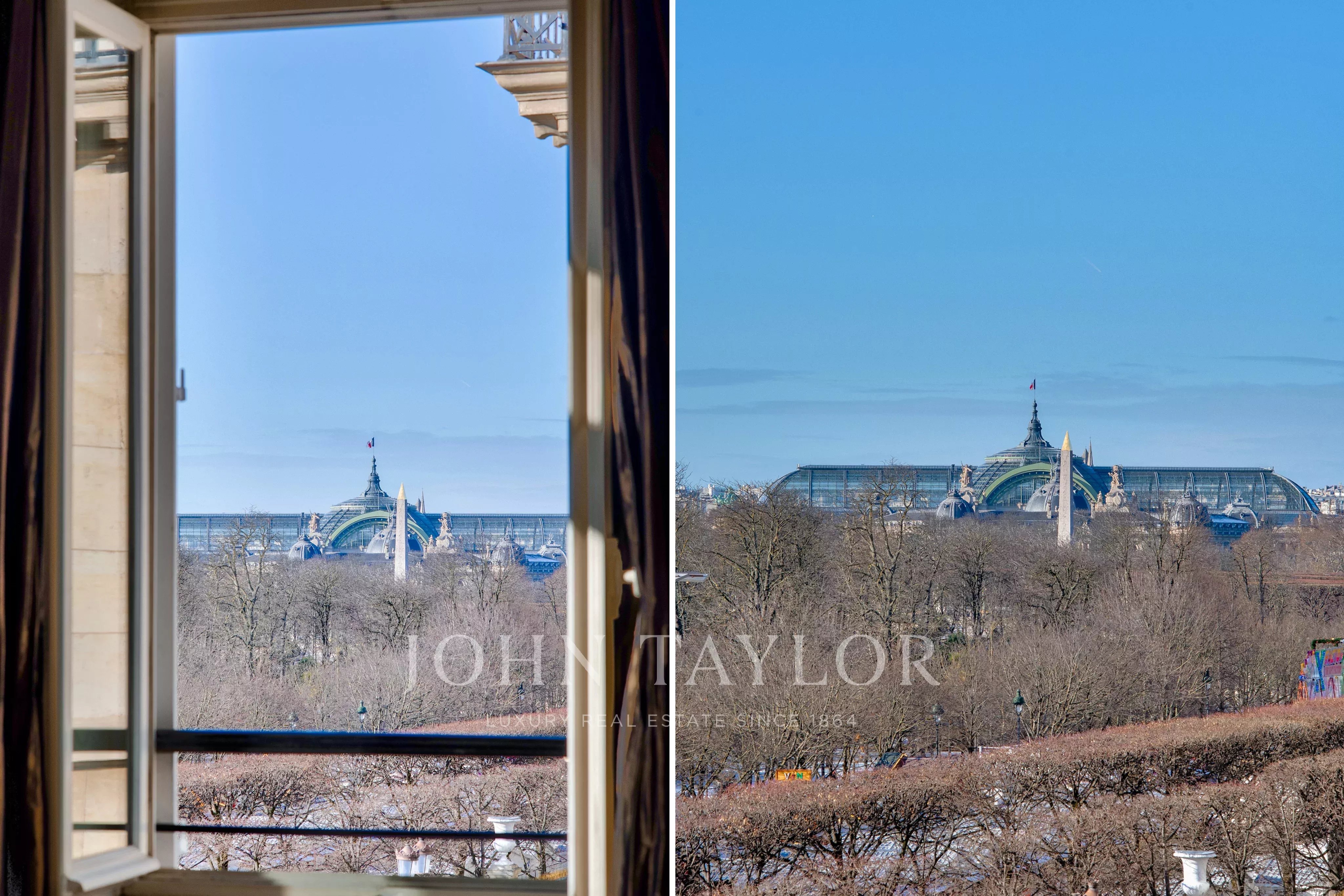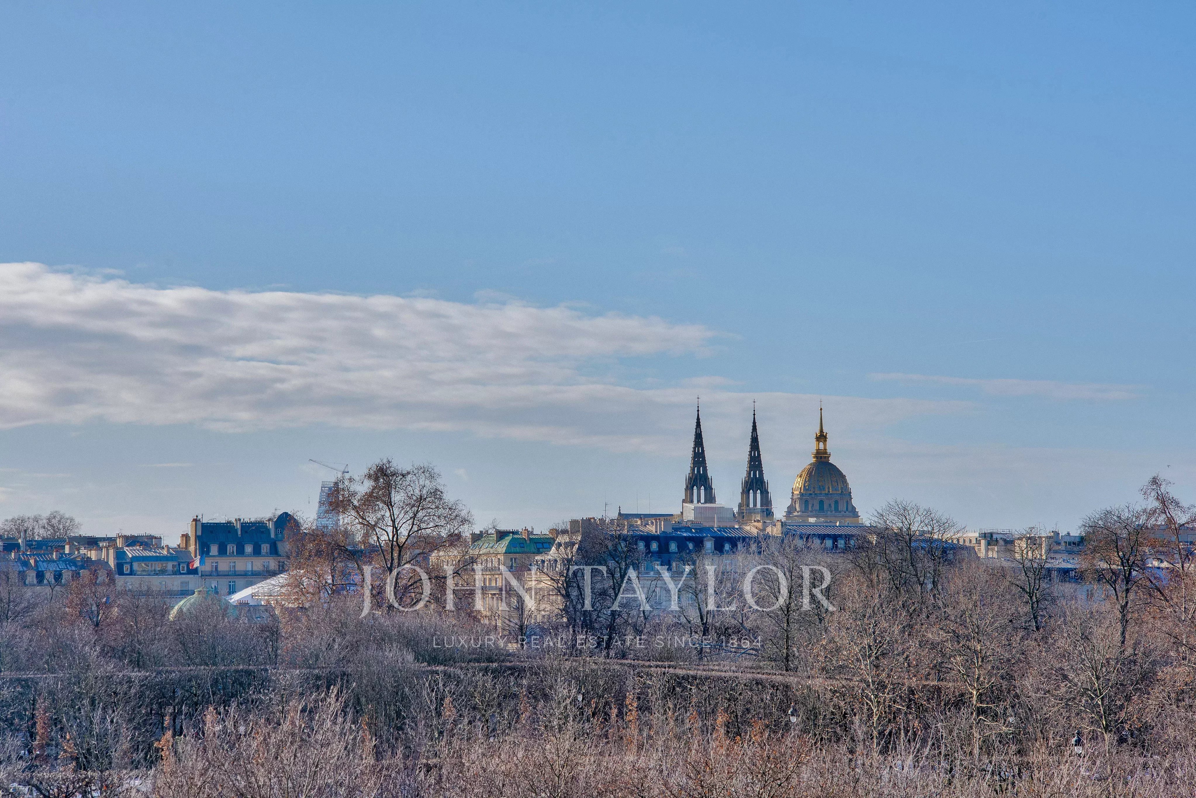 - Exceptional suite of 3 rooms (two large living rooms and dining room) overlooking the Tuileries Garden. These rooms offer over 120 m² of space with 7 south-facing windows with no opposite buildings, opening onto unique views: the Eiffel Tower, the Grand Palais, the Louvre Museum, the Orsay Museum, and the Obelisk at the Place de la Concorde