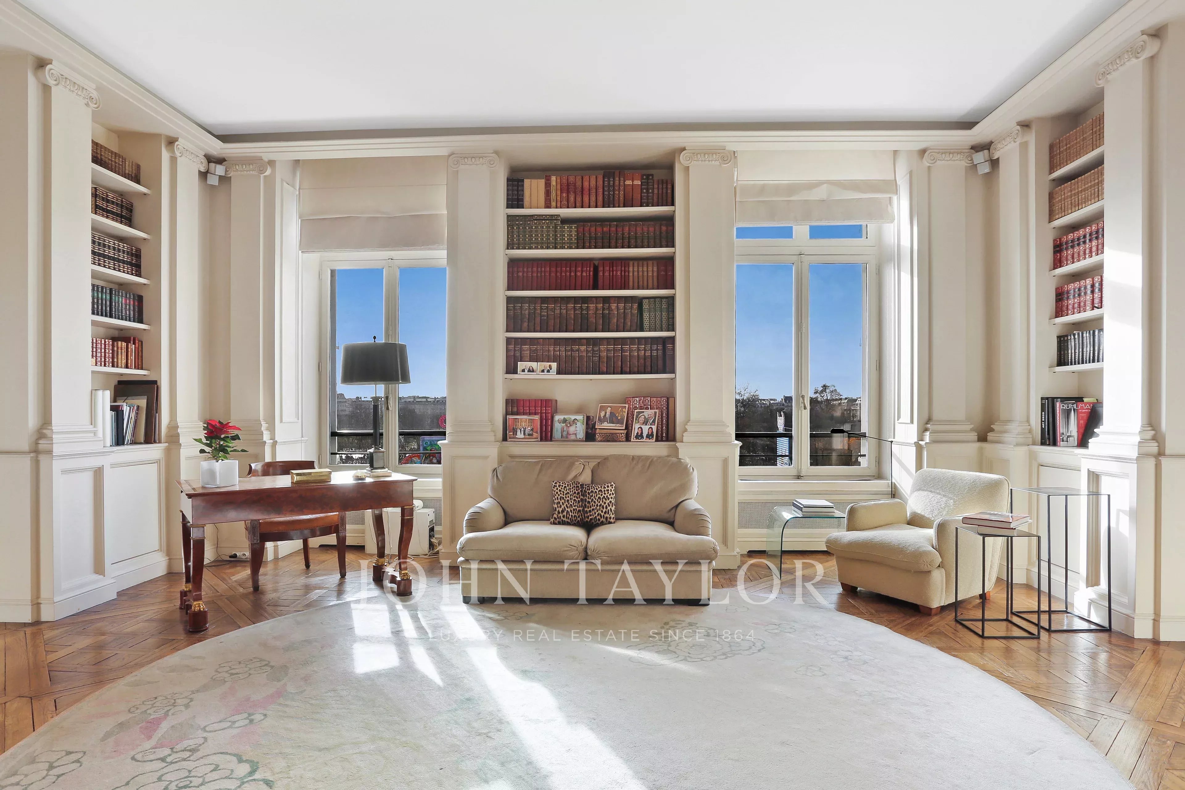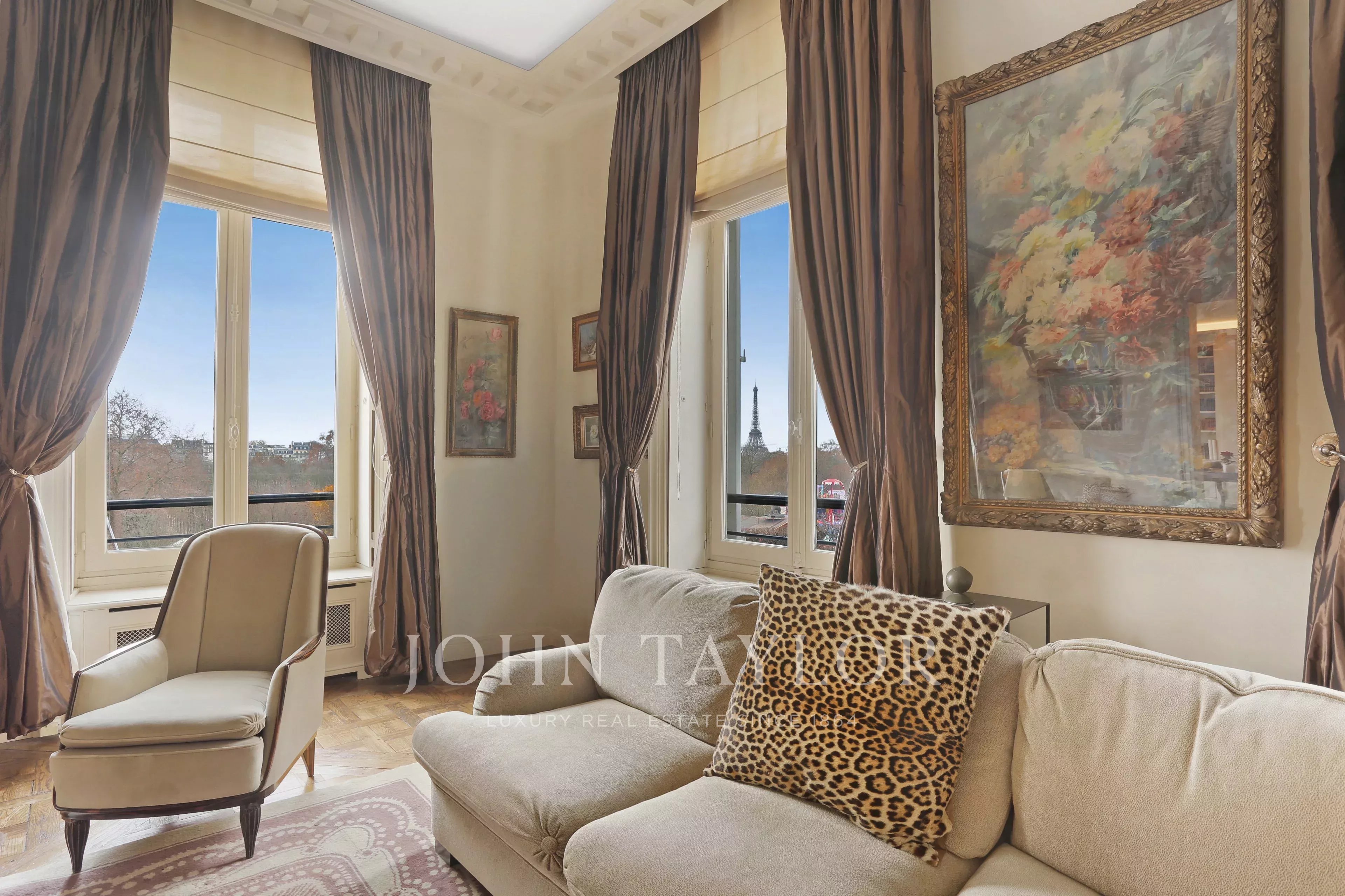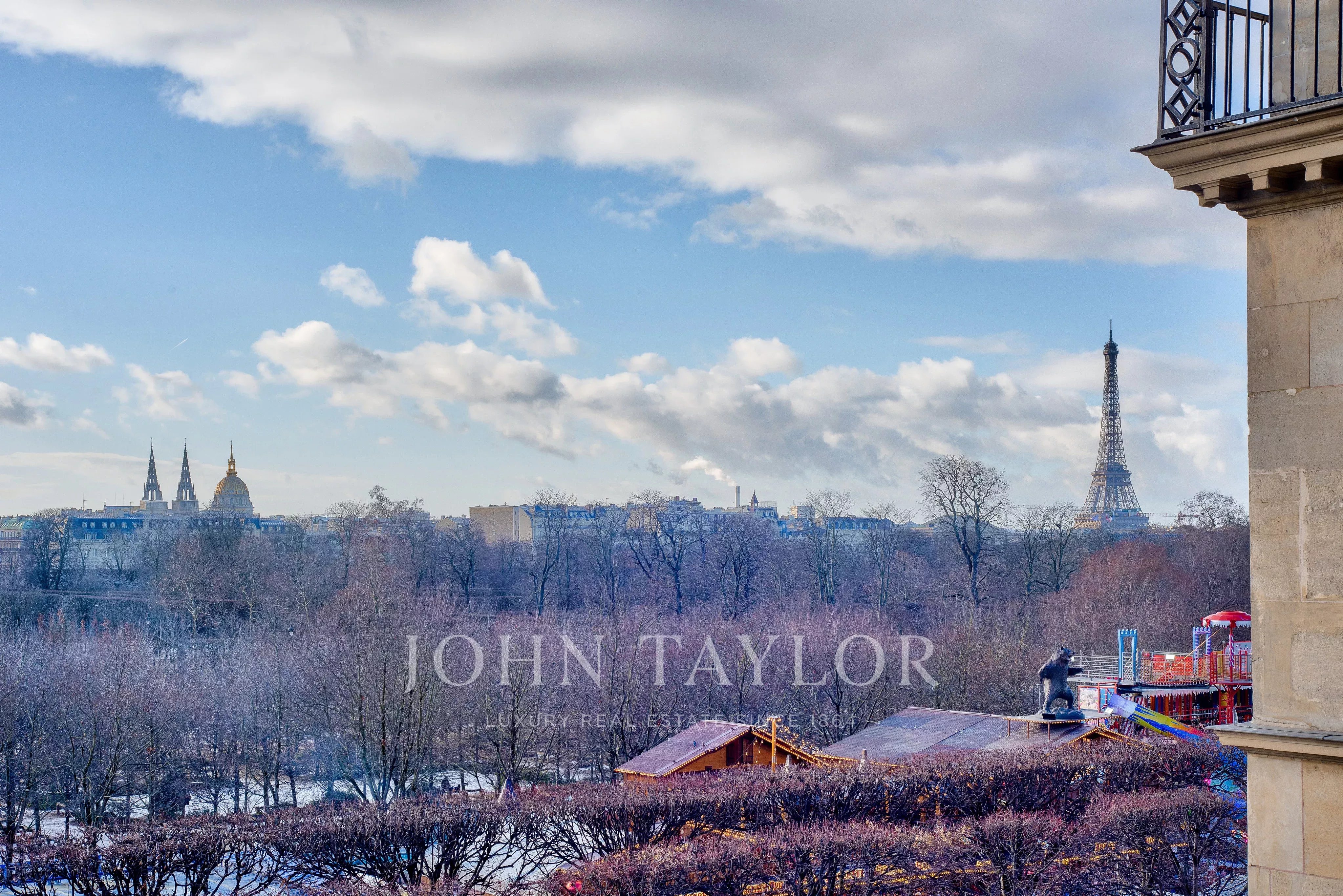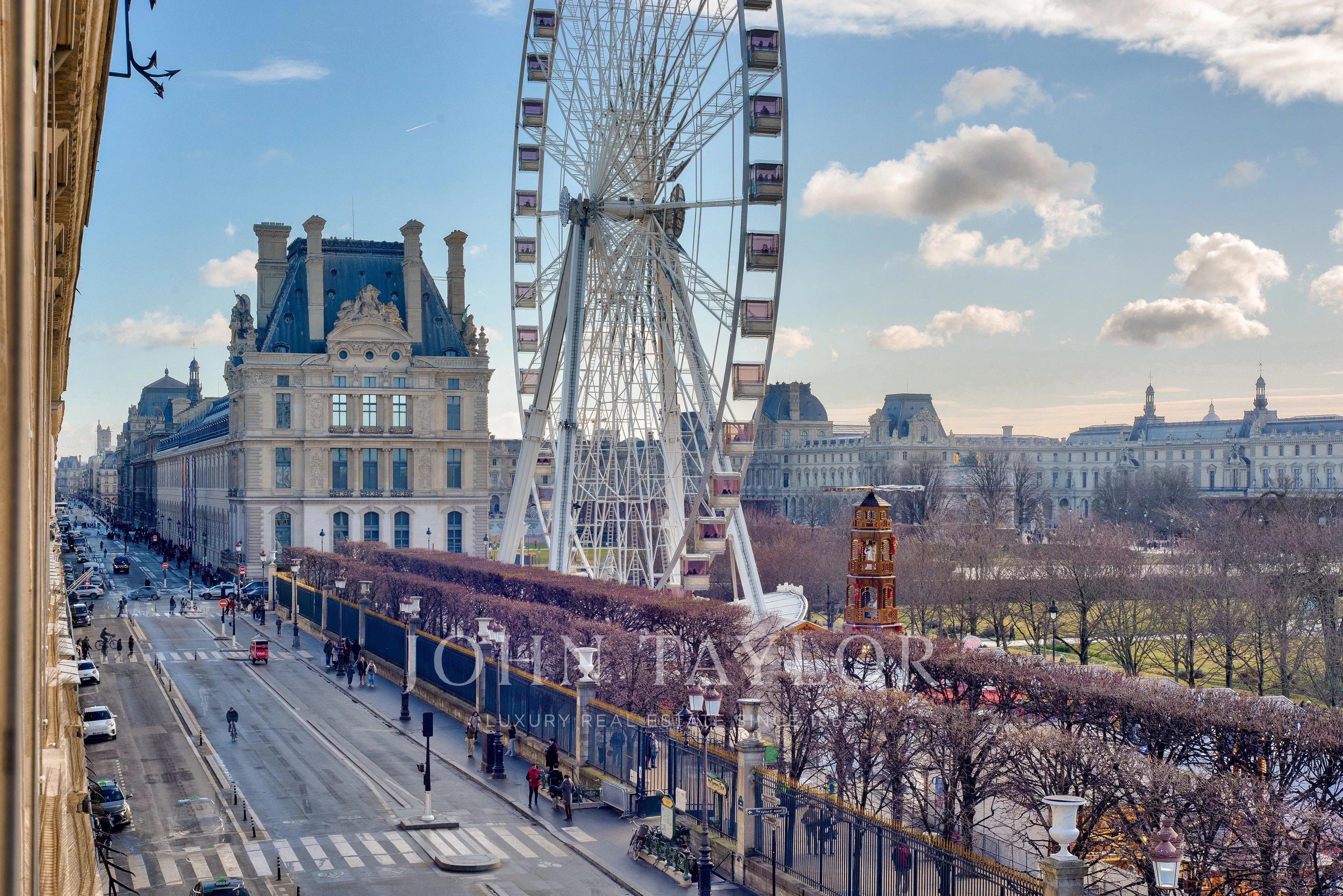 - Exceptional suite of 3 rooms (two large living rooms and dining room) overlooking the Tuileries Garden. These rooms offer over 120 m² of space with 7 south-facing windows with no opposite buildings, opening onto unique views: the Eiffel Tower, the Grand Palais, the Louvre Museum, the Orsay Museum, and the Obelisk at the Place de la Concorde