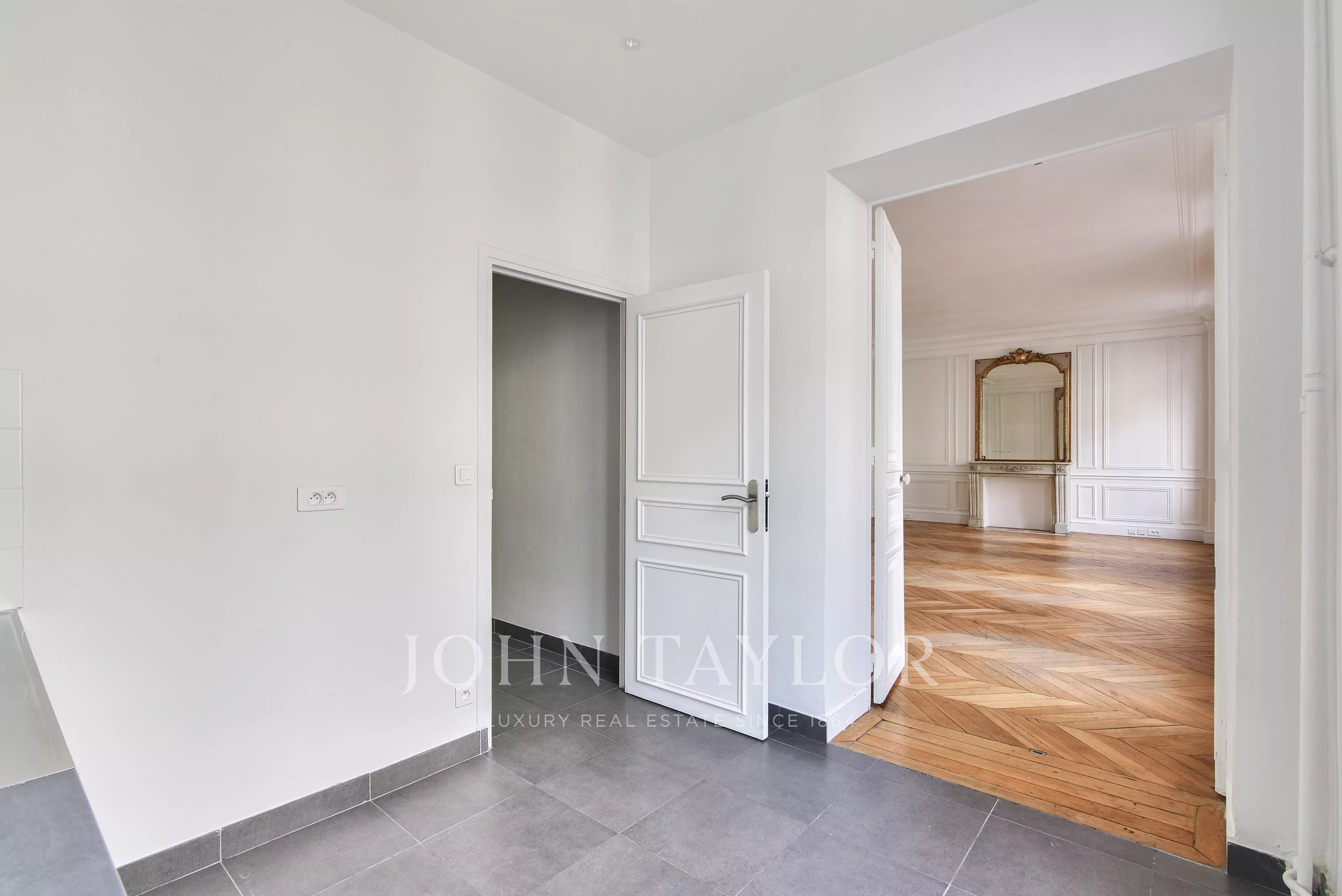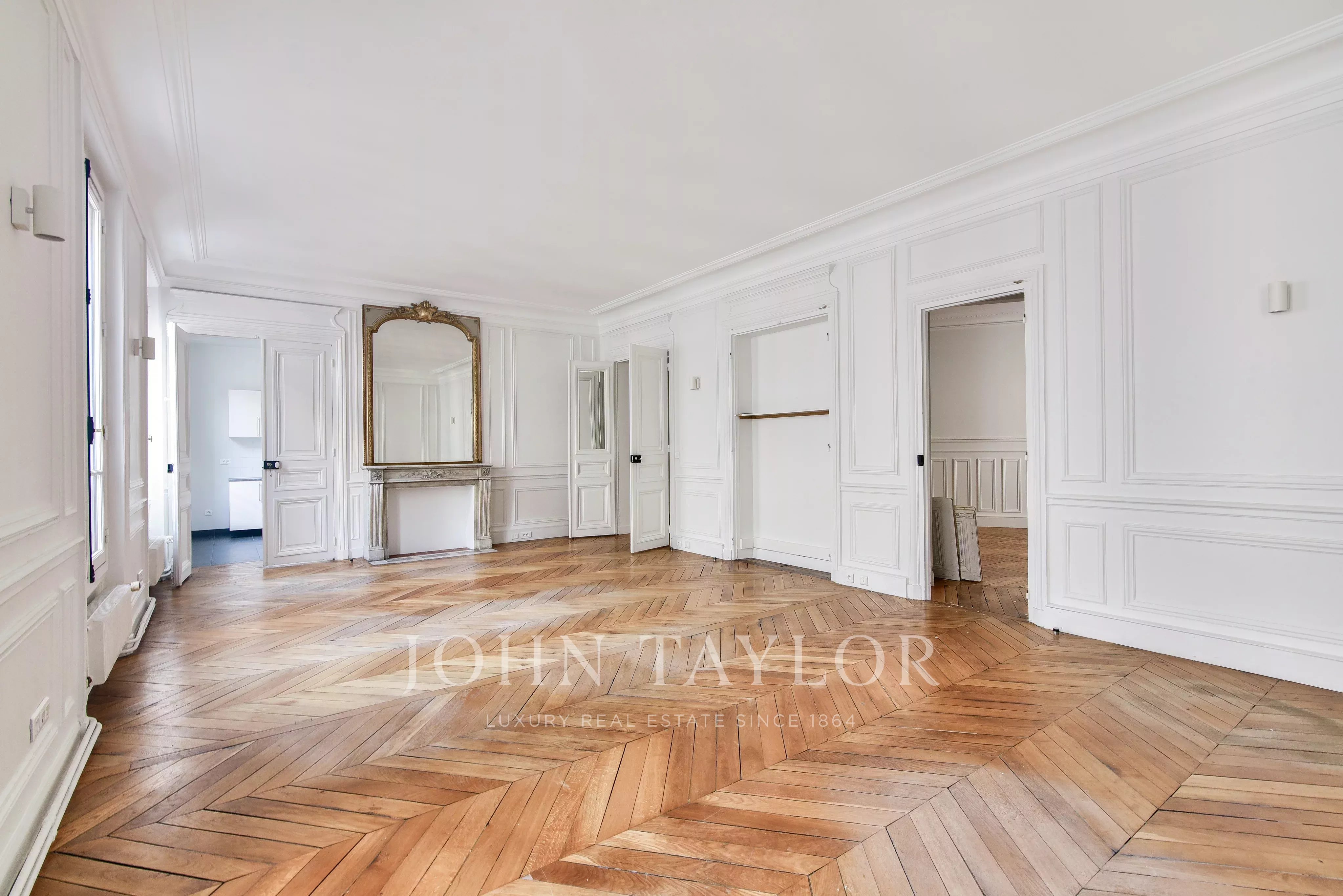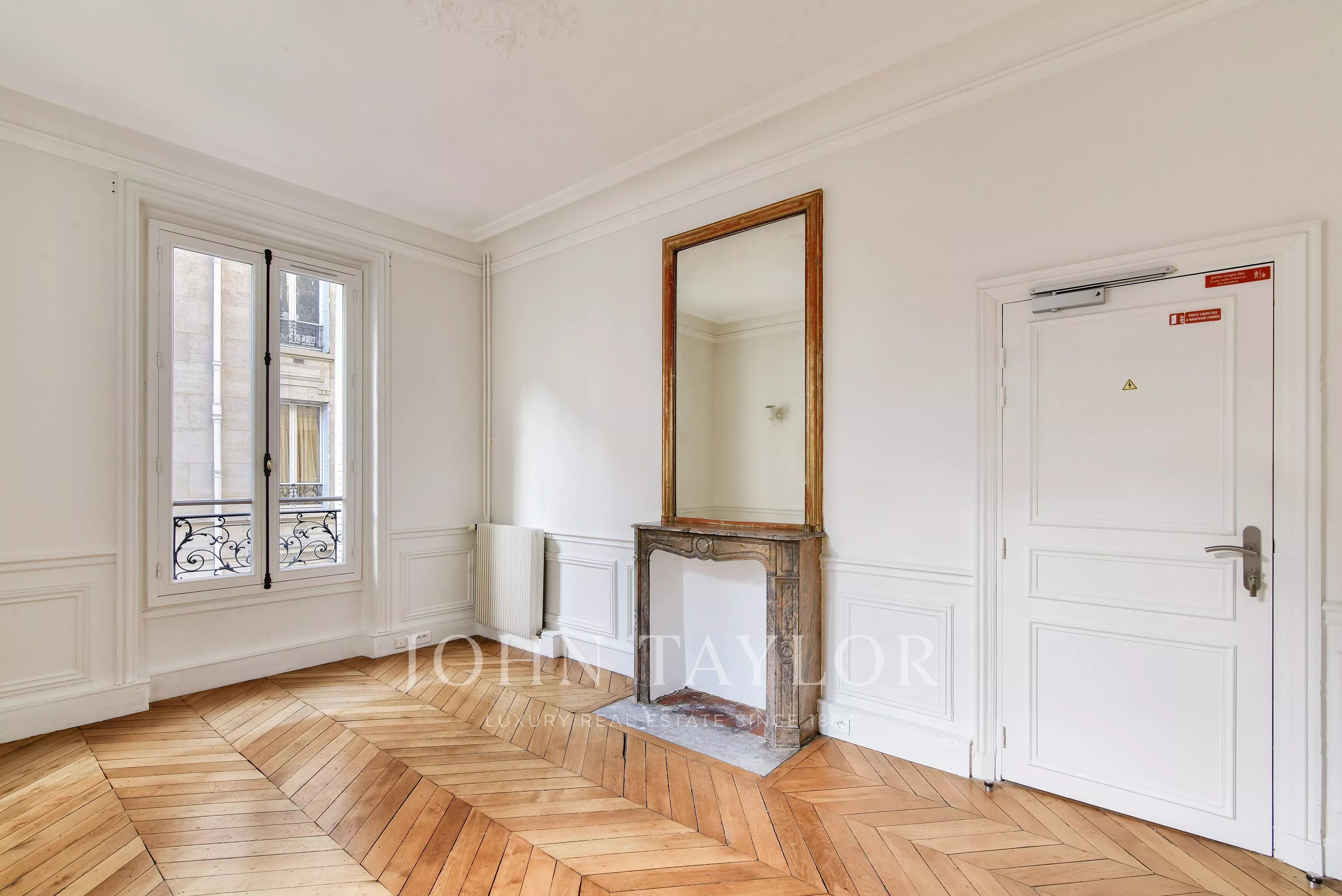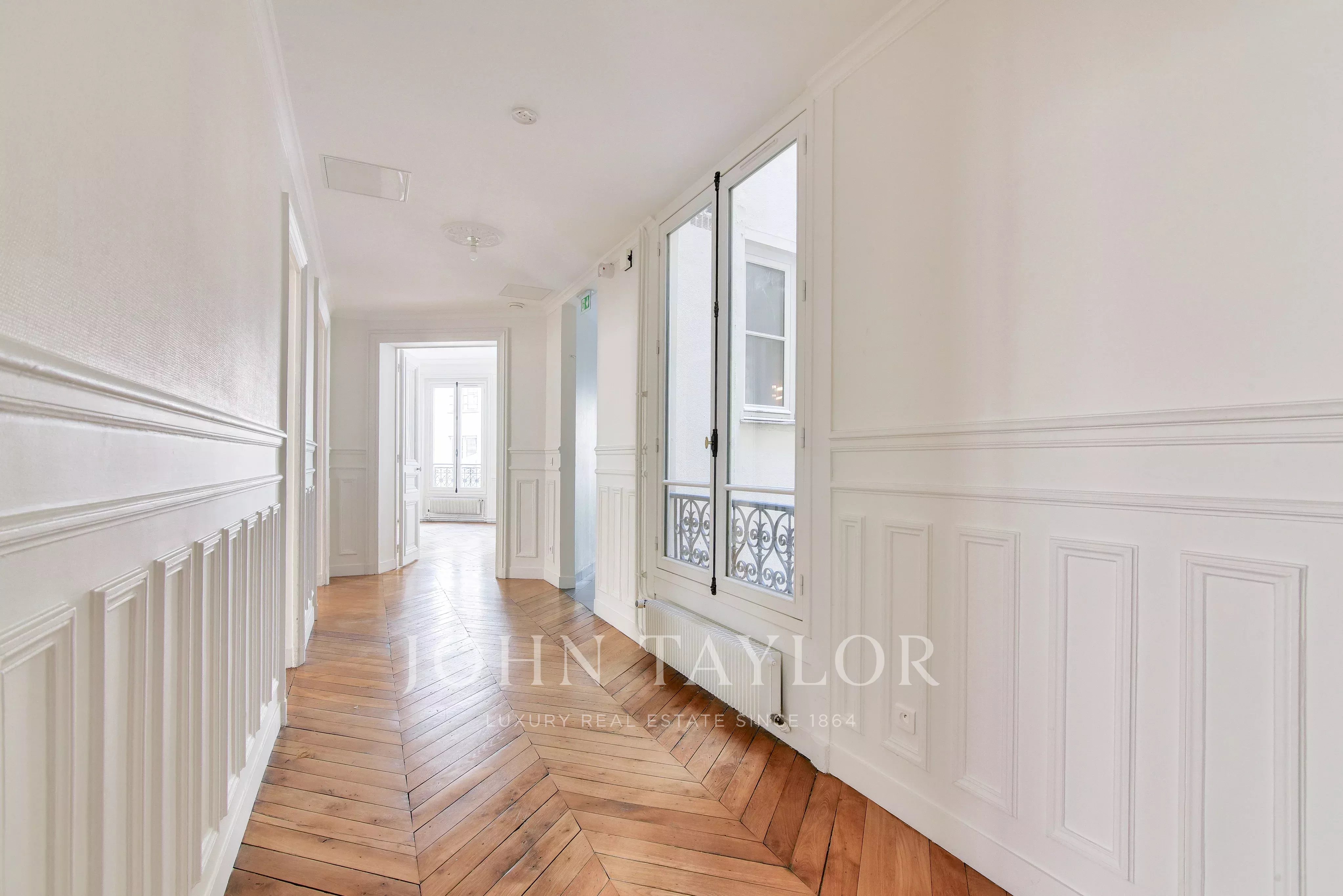 Compact layout, preserved old-world charm (oak parquet flooring, moldings, marble fireplaces, trumeaux) and very spacious rooms with 3.16-meter-high ceilings.